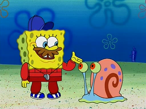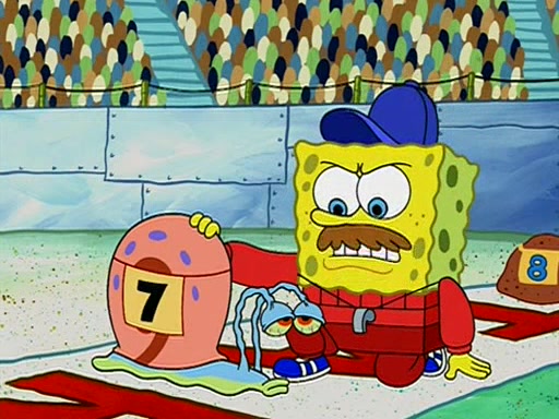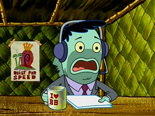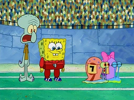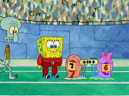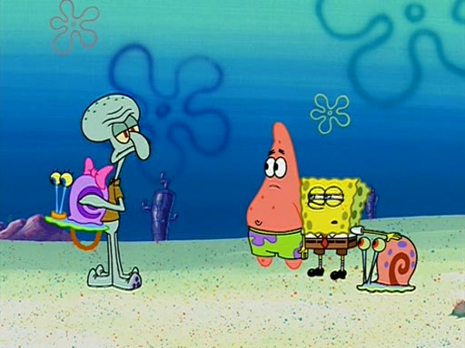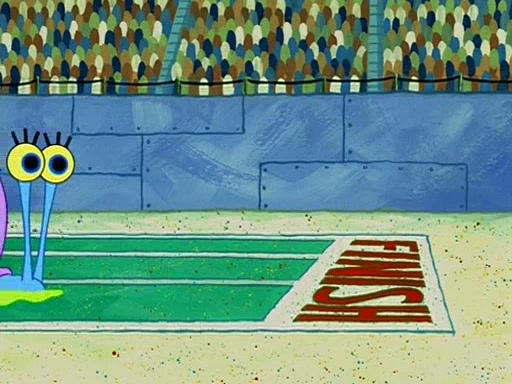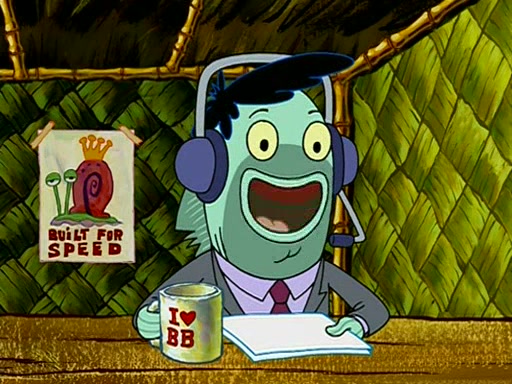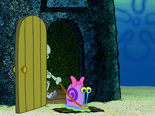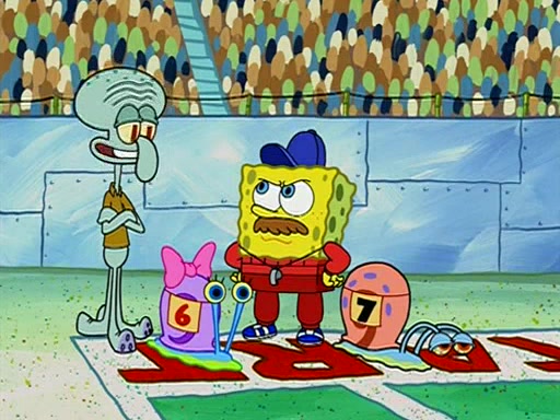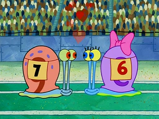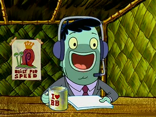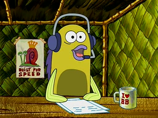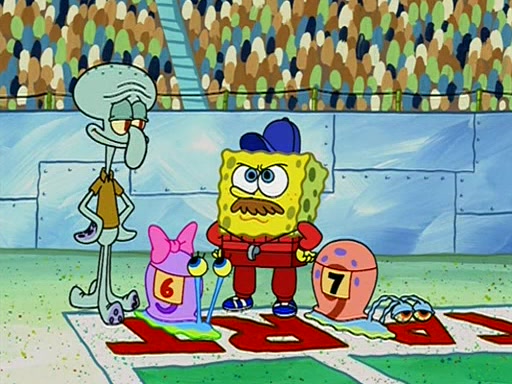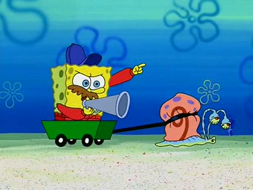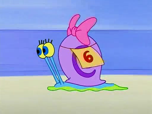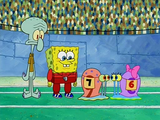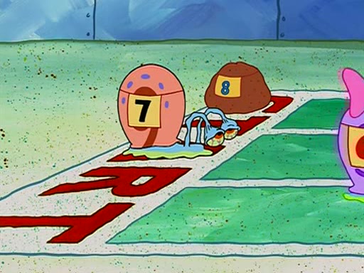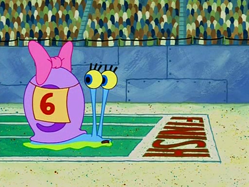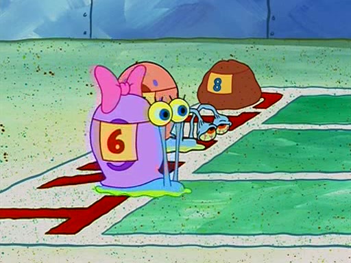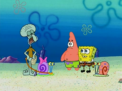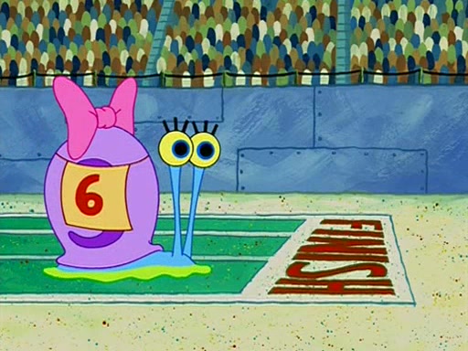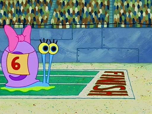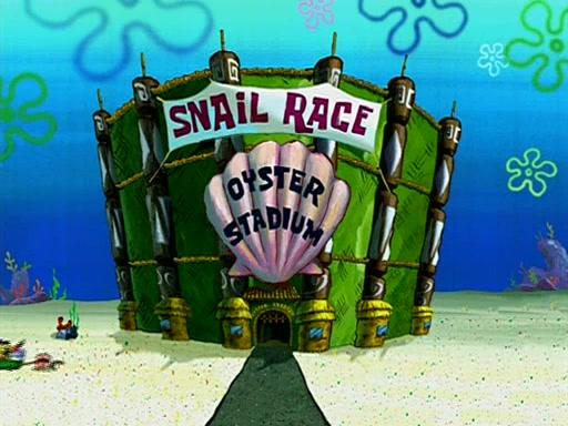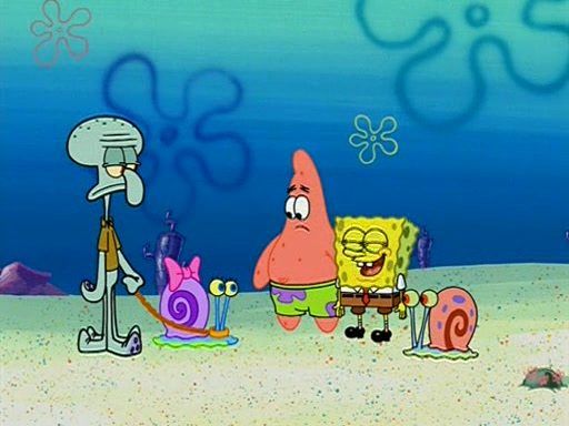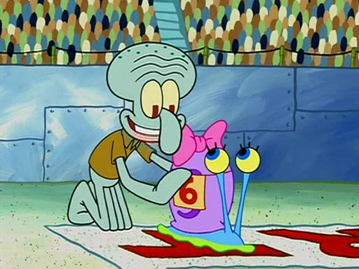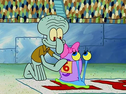 SpongeBob wakes up, as well as waking up Gary. He tells the world he is ready. He sees Squidward getting a package in the mail, with the mailfish erroneously pronouncing his last name as "Tennisballs." SpongeBob questions that Squidward's last name is "Tentacles," and Patrick says poor guy. He opens the cage, which contains a snail named Snellie. Patrick checks out Squidward's new snail. SpongeBob sees this and tells Gary that he has a new little playmate. However, Squidward immediately protests and explains that Snellie is a purebred of the highest pedigree, and that she is going to be entered in the Bikini Bottom Snail Race on Sunday and she will win it. SpongeBob says that he can't enter Gary because Sunday is laundry day. Squidward then tells SpongeBob that he can't enter Gary because Gary is a "mutt," which offends SpongeBob. He asks what makes Squidward think Gary couldn't win. Squidward says the paper. Patrick reads Snellie's pedigree certificate and misreads Squidward's name as "Tentpoles," which makes Squidward angry, yet again. SpongeBob decides to enter Gary into the race. Patrick also decides to enter into the competition. SpongeBob (wearing a play mustache and a coach's outfit) tells Gary to start training now. Sandy is walking and decides to kick SpongeBob's butt tomorrow, but she doesn't know why.