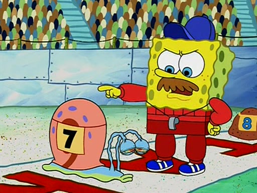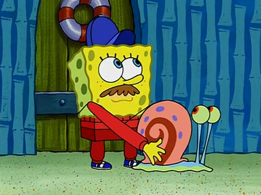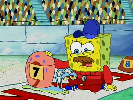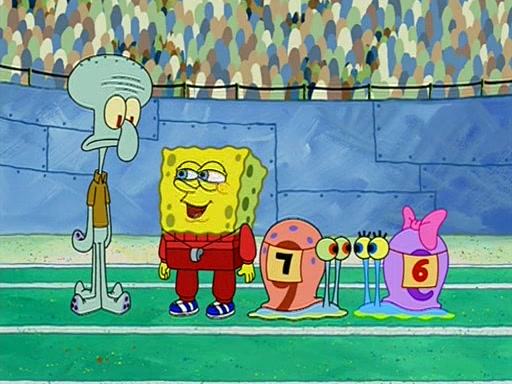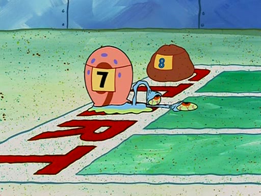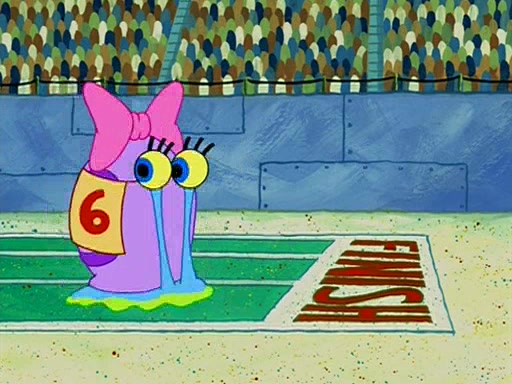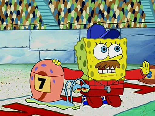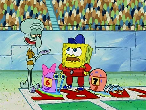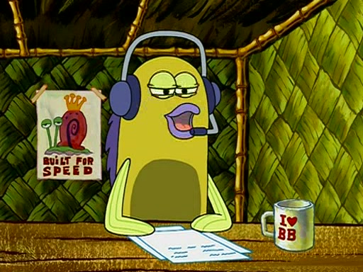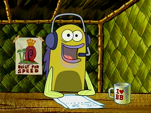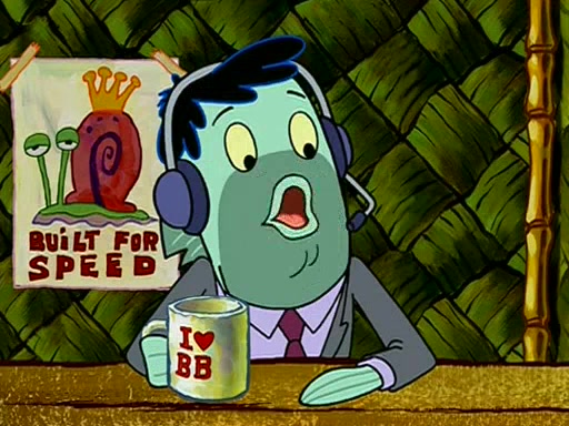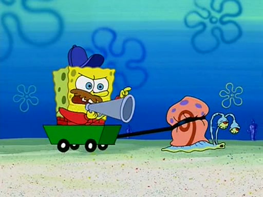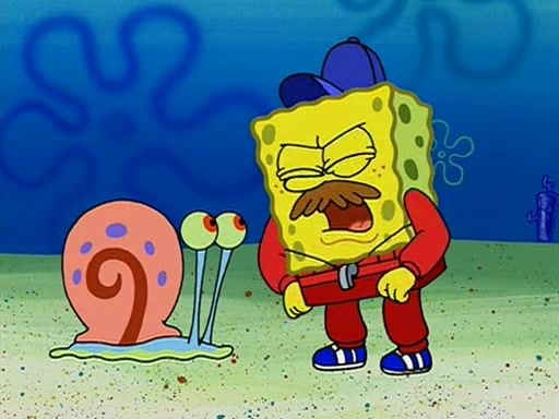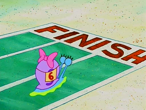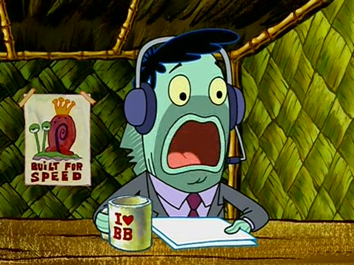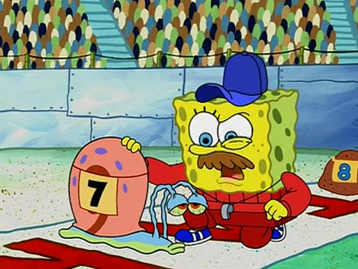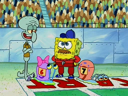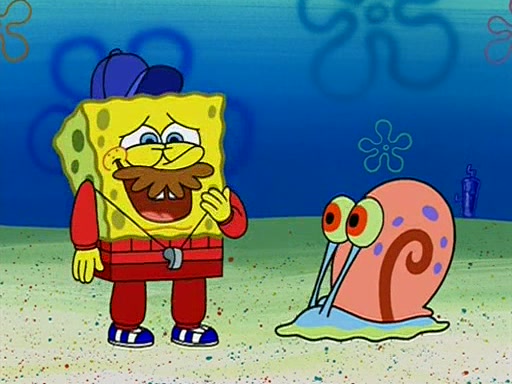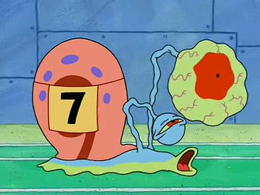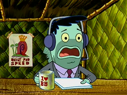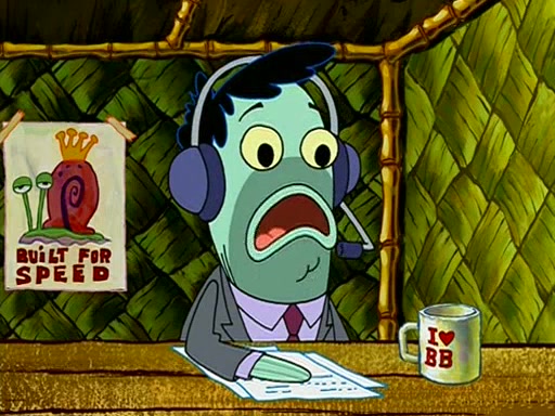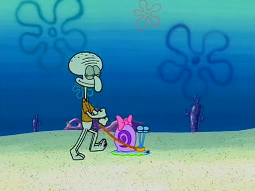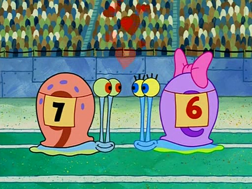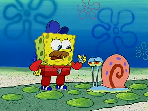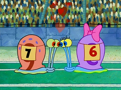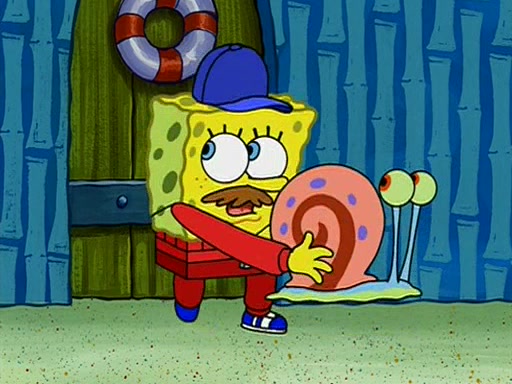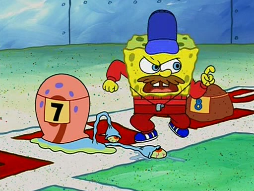SpongeBob wakes up, as well as waking up Gary. He tells the world he is ready. He sees Squidward getting a package in the mail, with the mailfish erroneously pronouncing his last name as "Tennisballs." SpongeBob questions that Squidward's last name is "Tentacles," and Patrick says poor guy. He opens the cage, which contains a snail named Snellie. Patrick checks out Squidward's new snail. SpongeBob sees this and tells Gary that he has a new little playmate. However, Squidward immediately protests and explains that Snellie is a purebred of the highest pedigree, and that she is going to be entered in the Bikini Bottom Snail Race on Sunday and she will win it. SpongeBob says that he can't enter Gary because Sunday is laundry day. Squidward then tells SpongeBob that he can't enter Gary because Gary is a "mutt," which offends SpongeBob. He asks what makes Squidward think Gary couldn't win. Squidward says the paper. Patrick reads Snellie's pedigree certificate and misreads Squidward's name as "Tentpoles," which makes Squidward angry, yet again. SpongeBob decides to enter Gary into the race. Patrick also decides to enter into the competition. SpongeBob (wearing a play mustache and a coach's outfit) tells Gary to start training now. Sandy is walking and decides to kick SpongeBob's butt tomorrow, but she doesn't know why.