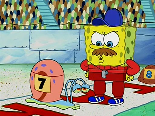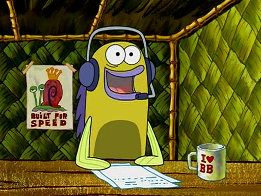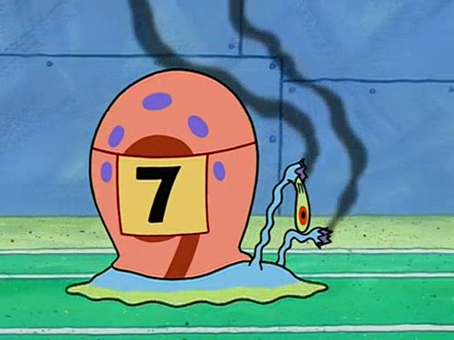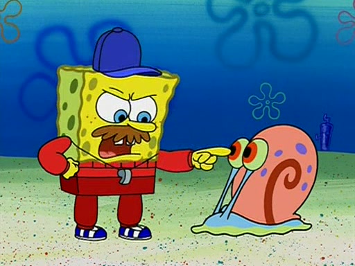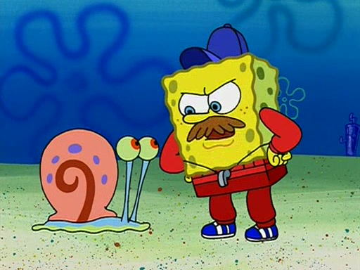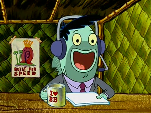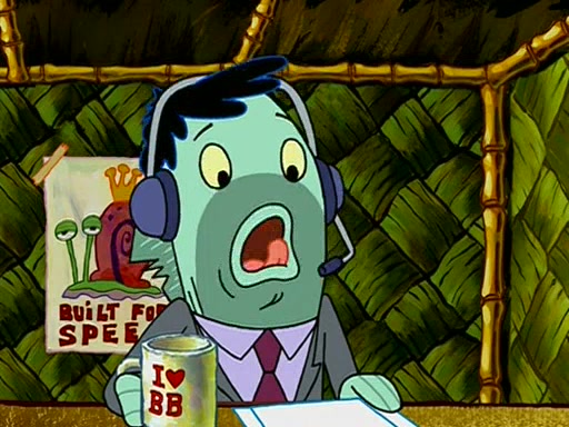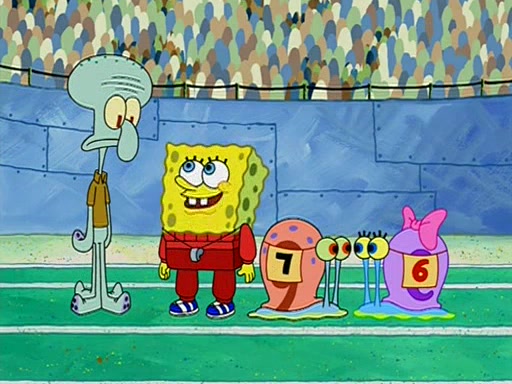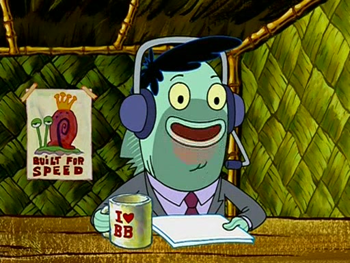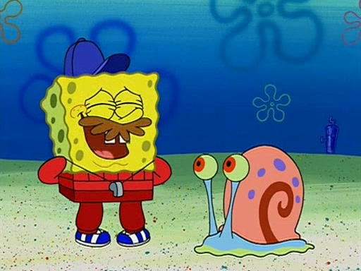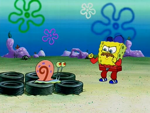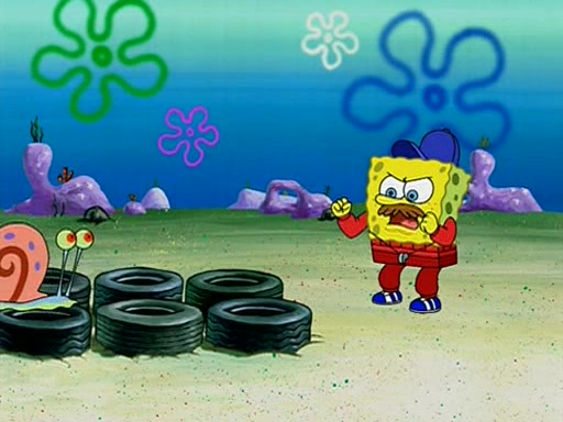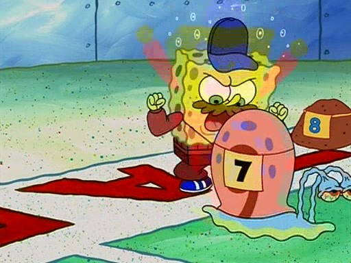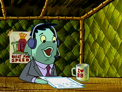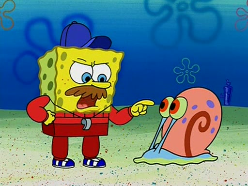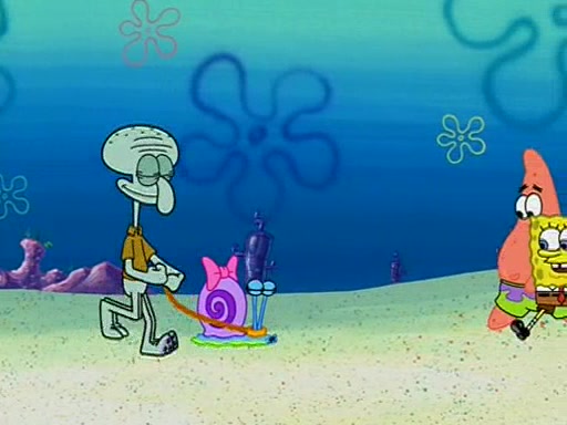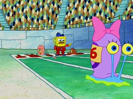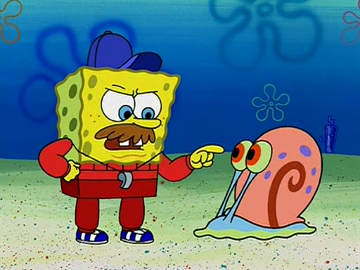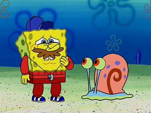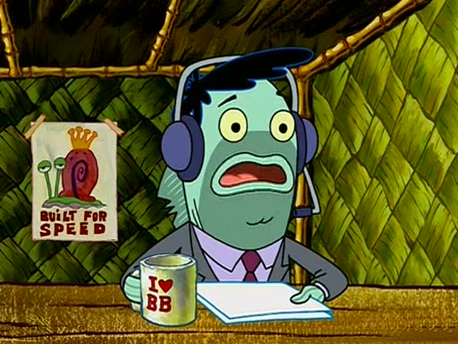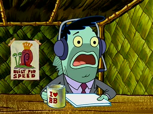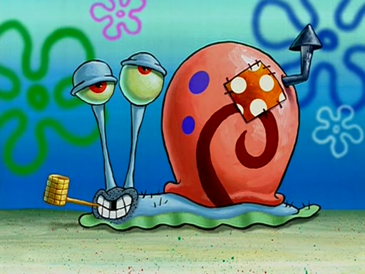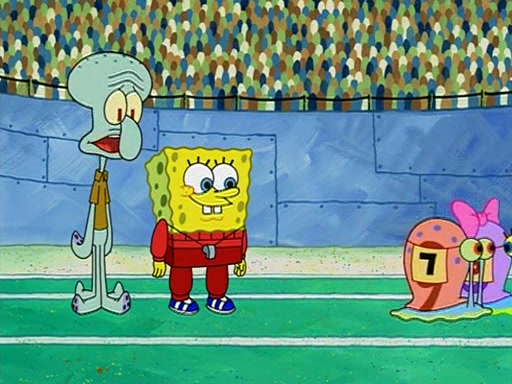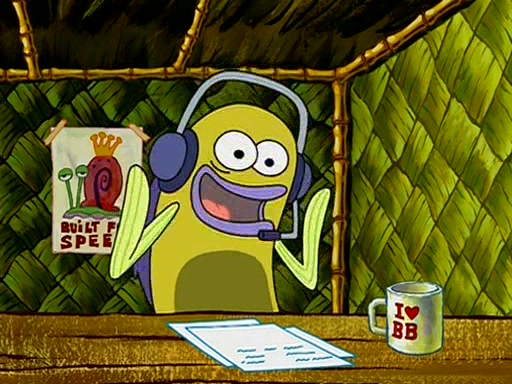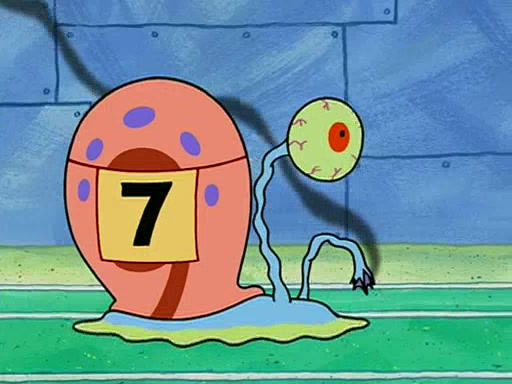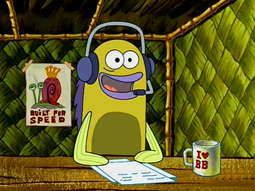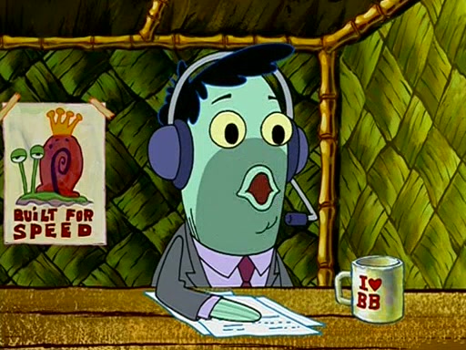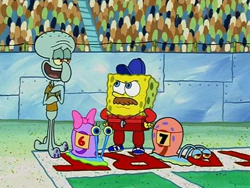 SpongeBob wakes up, as well as waking up Gary. He tells the world he is ready. He sees Squidward getting a package in the mail, with the mailfish erroneously pronouncing his last name as "Tennisballs." SpongeBob questions that Squidward's last name is "Tentacles," and Patrick says poor guy. He opens the cage, which contains a snail named Snellie. Patrick checks out Squidward's new snail. SpongeBob sees this and tells Gary that he has a new little playmate. However, Squidward immediately protests and explains that Snellie is a purebred of the highest pedigree, and that she is going to be entered in the Bikini Bottom Snail Race on Sunday and she will win it. SpongeBob says that he can't enter Gary because Sunday is laundry day. Squidward then tells SpongeBob that he can't enter Gary because Gary is a "mutt," which offends SpongeBob. He asks what makes Squidward think Gary couldn't win. Squidward says the paper. Patrick reads Snellie's pedigree certificate and misreads Squidward's name as "Tentpoles," which makes Squidward angry, yet again. SpongeBob decides to enter Gary into the race. Patrick also decides to enter into the competition. SpongeBob (wearing a play mustache and a coach's outfit) tells Gary to start training now. Sandy is walking and decides to kick SpongeBob's butt tomorrow, but she doesn't know why.
