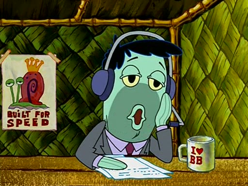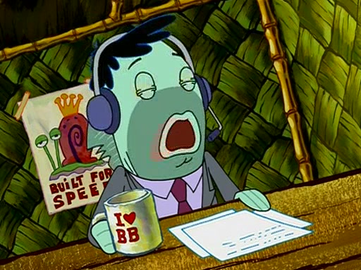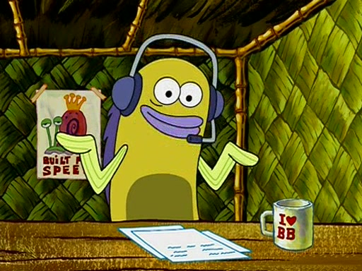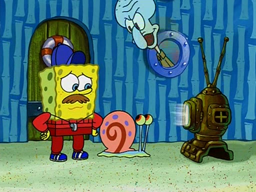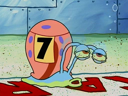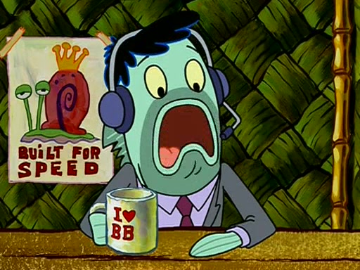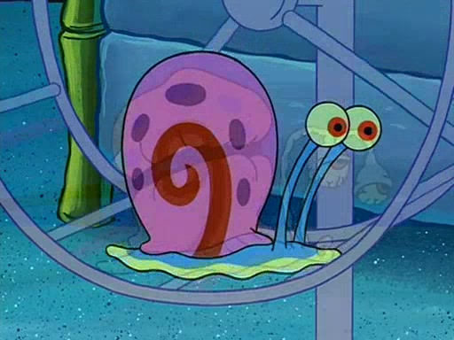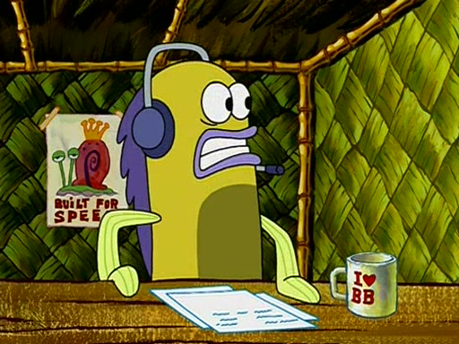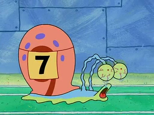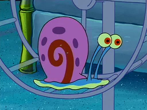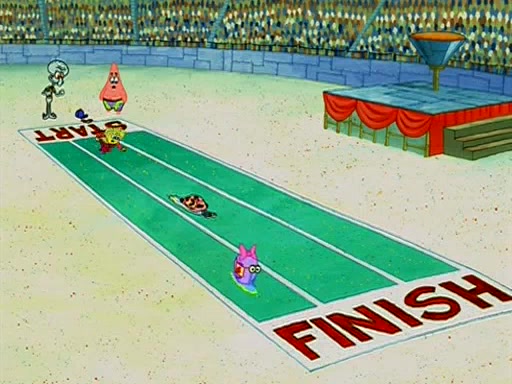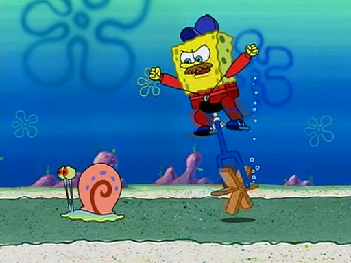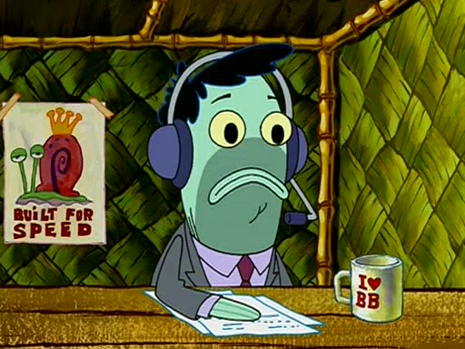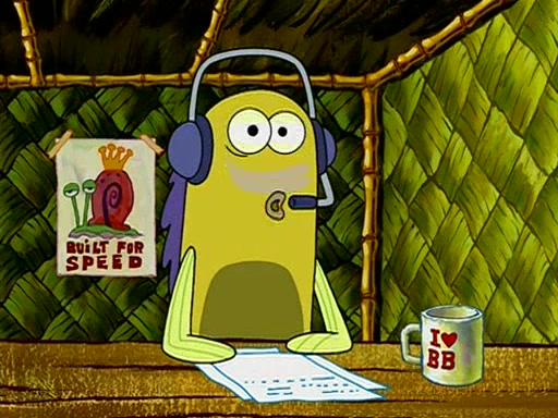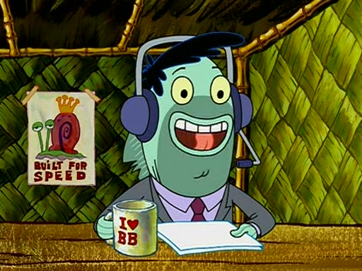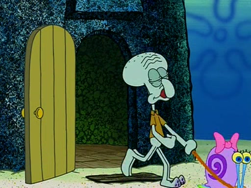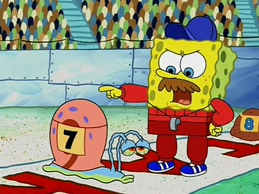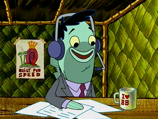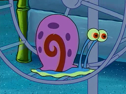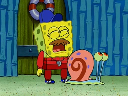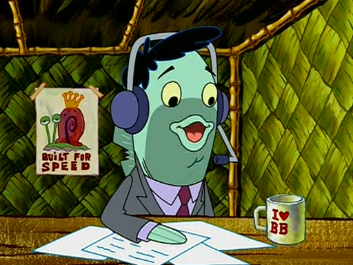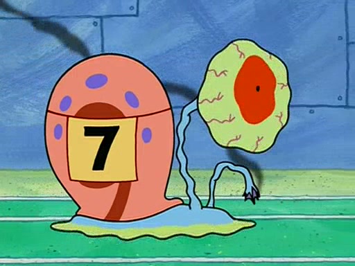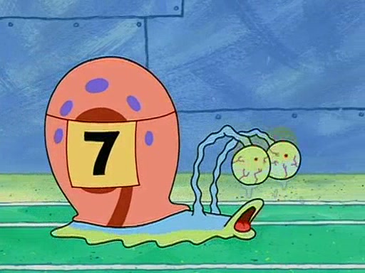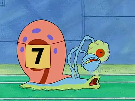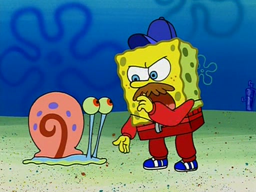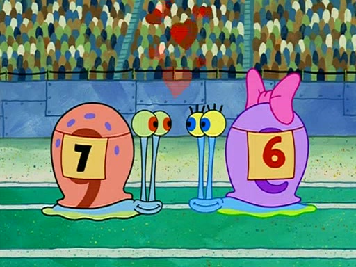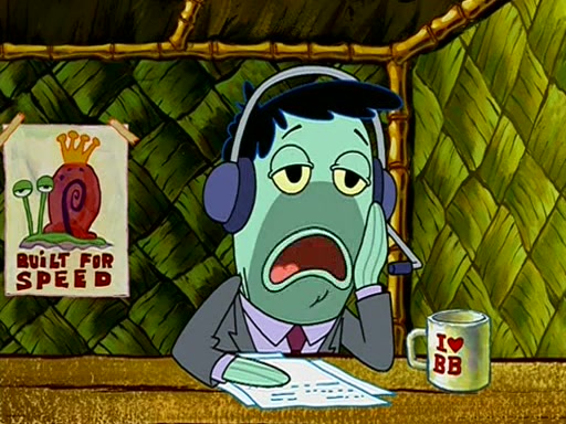 SpongeBob wakes up, as well as waking up Gary. He tells the world he is ready. He sees Squidward getting a package in the mail, with the mailfish erroneously pronouncing his last name as "Tennisballs." SpongeBob questions that Squidward's last name is "Tentacles," and Patrick says poor guy. He opens the cage, which contains a snail named Snellie. Patrick checks out Squidward's new snail. SpongeBob sees this and tells Gary that he has a new little playmate. However, Squidward immediately protests and explains that Snellie is a purebred of the highest pedigree, and that she is going to be entered in the Bikini Bottom Snail Race on Sunday and she will win it. SpongeBob says that he can't enter Gary because Sunday is laundry day. Squidward then tells SpongeBob that he can't enter Gary because Gary is a "mutt," which offends SpongeBob. He asks what makes Squidward think Gary couldn't win. Squidward says the paper. Patrick reads Snellie's pedigree certificate and misreads Squidward's name as "Tentpoles," which makes Squidward angry, yet again. SpongeBob decides to enter Gary into the race. Patrick also decides to enter into the competition. SpongeBob (wearing a play mustache and a coach's outfit) tells Gary to start training now. Sandy is walking and decides to kick SpongeBob's butt tomorrow, but she doesn't know why.