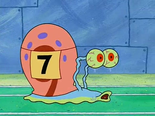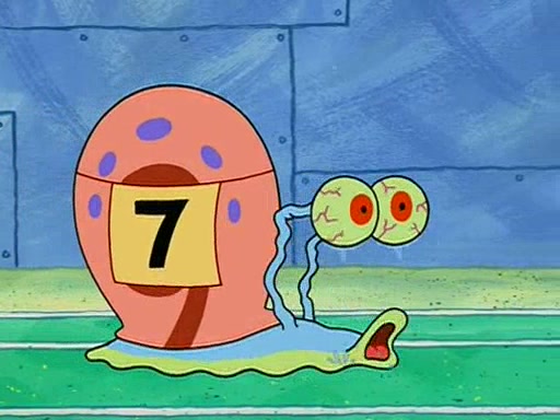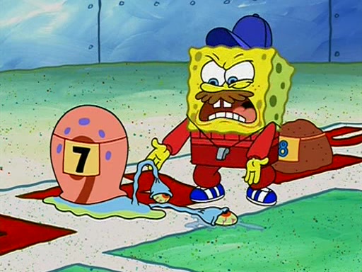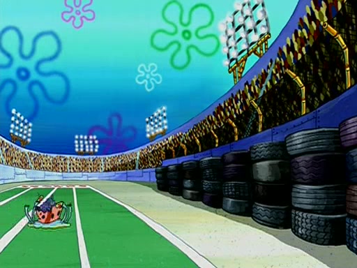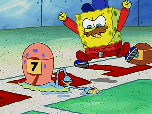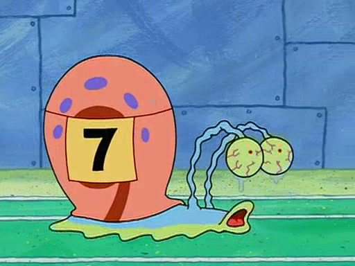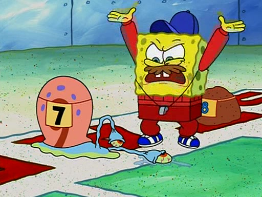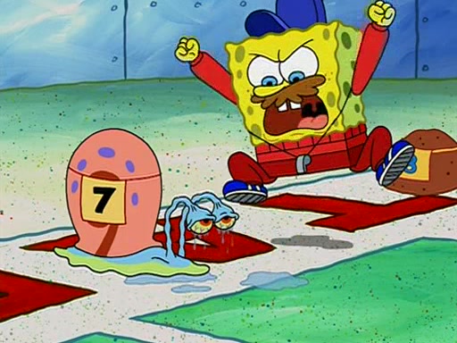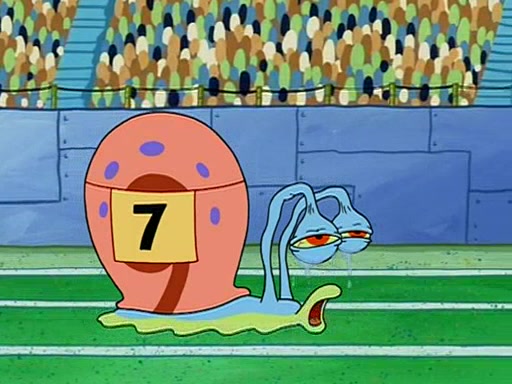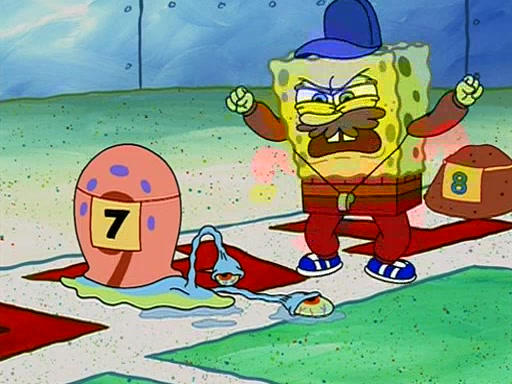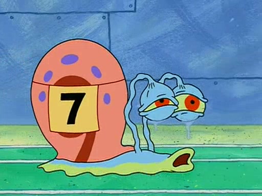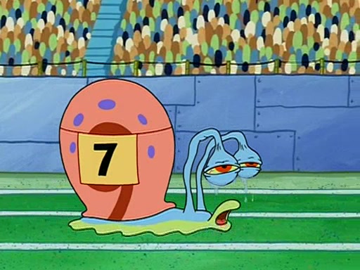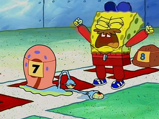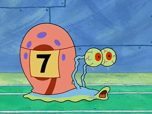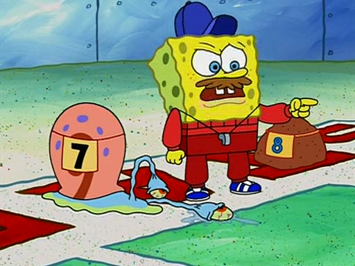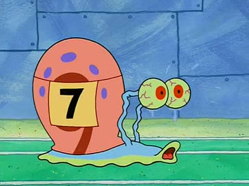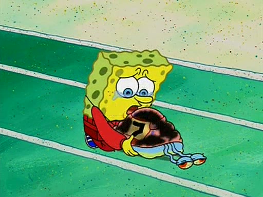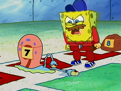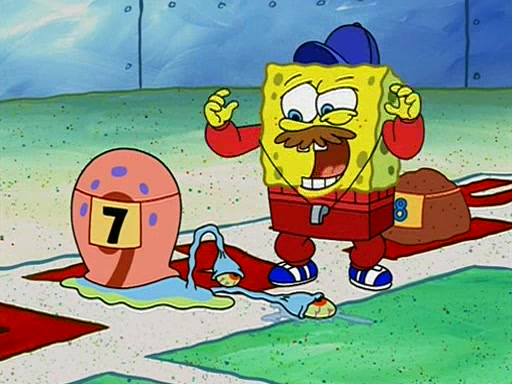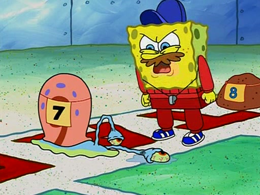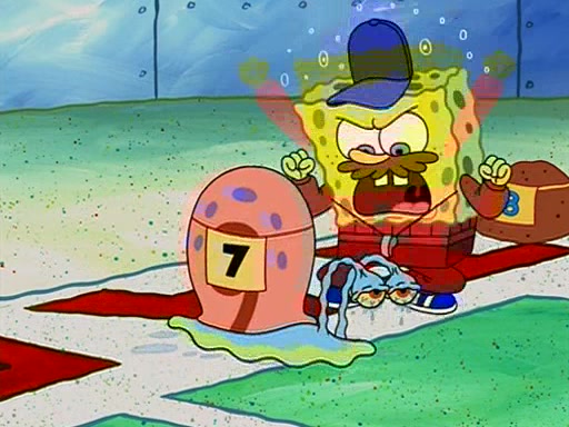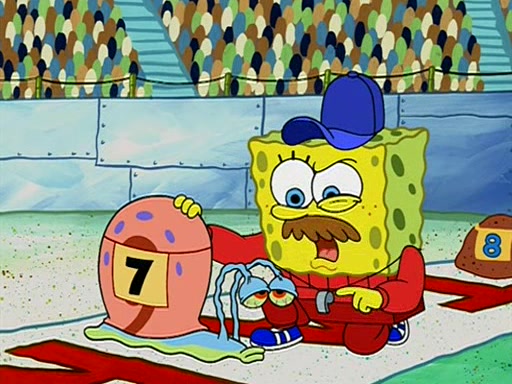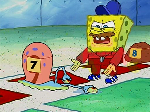 SpongeBob decides to train Gary as hard as he can. On the day of the race, Gary is exhausted from SpongeBob's brutal training. During the race, his eyes and shell explode, revealing a car engine, and he spirals out of control like a race car. SpongeBob, seeing the error of his ways, tells Gary that he can stop now, but Gary keeps on going. SpongeBob runs onto the track, which the announcer says that it's an "automatic disqualification." Gary hits the wall and explodes completely, and then an upset SpongeBob runs up to him and embraces him, crying. Snellie, who is almost at the finish line, turns around to help Gary, and the two instantly fall in love. Squidward is shocked at this and walks onto the track, and SpongeBob says to him, "Looks like you and me are in-laws, eh, Squidward?" Squidward then sees that, much to his surprise, Patrick's rock won the race. It is Unknown how, but this happened. Patrick was then very proud of his rock. Squidward is very upset by this, but Patrick then tells Squidward that he had the trophy engraved to him, and gives it to him, knowing how much Squidward wanted to win. Squidward thanks Patrick, but then reads the trophy, which reads "The 1st place Snail Racing cup presented to Squidward... TORTELLINI?!" He groans and says "Will I ever win?," and they all start laughing and then Sandy appears onscreen kicking SpongeBob yelling "That's for yesterday, SquarePants!"