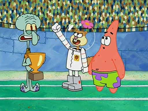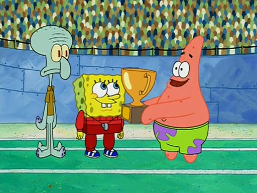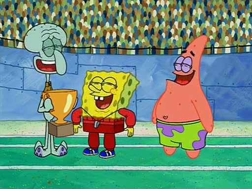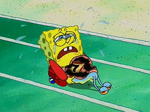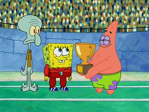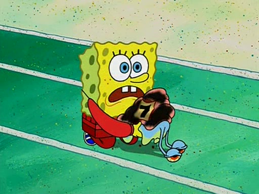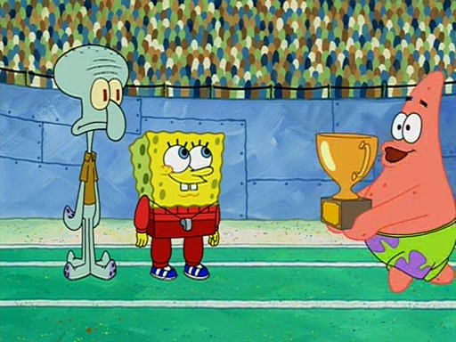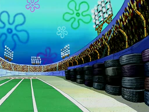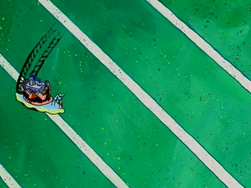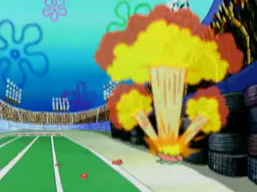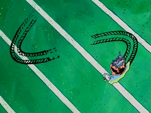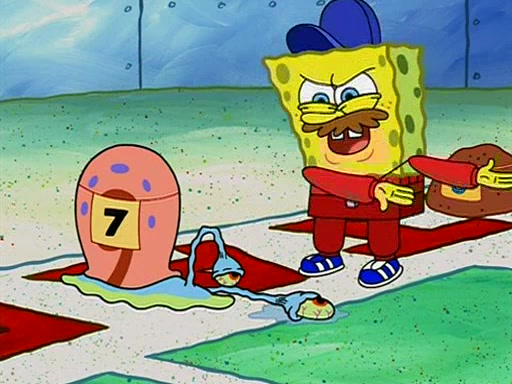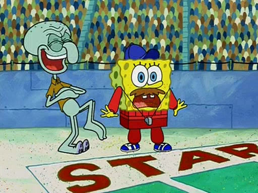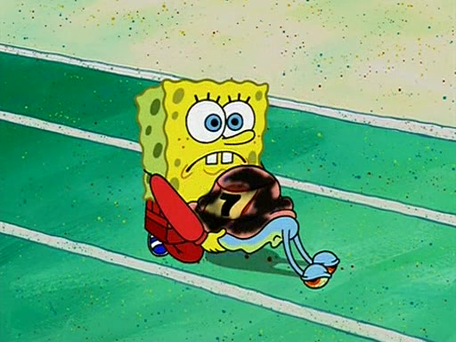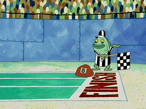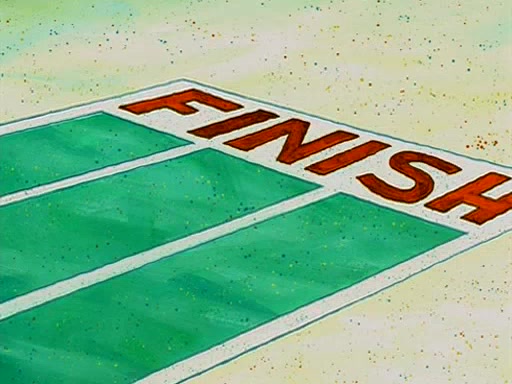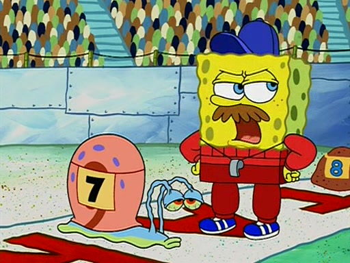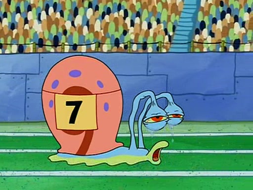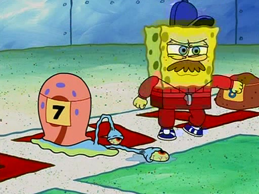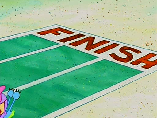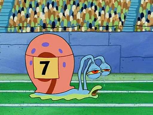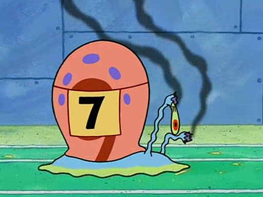 SpongeBob decides to train Gary as hard as he can. On the day of the race, Gary is exhausted from SpongeBob's brutal training. During the race, his eyes and shell explode, revealing a car engine, and he spirals out of control like a race car. SpongeBob, seeing the error of his ways, tells Gary that he can stop now, but Gary keeps on going. SpongeBob runs onto the track, which the announcer says that it's an "automatic disqualification." Gary hits the wall and explodes completely, and then an upset SpongeBob runs up to him and embraces him, crying. Snellie, who is almost at the finish line, turns around to help Gary, and the two instantly fall in love. Squidward is shocked at this and walks onto the track, and SpongeBob says to him, "Looks like you and me are in-laws, eh, Squidward?" Squidward then sees that, much to his surprise, Patrick's rock won the race. It is Unknown how, but this happened. Patrick was then very proud of his rock. Squidward is very upset by this, but Patrick then tells Squidward that he had the trophy engraved to him, and gives it to him, knowing how much Squidward wanted to win. Squidward thanks Patrick, but then reads the trophy, which reads "The 1st place Snail Racing cup presented to Squidward... TORTELLINI?!" He groans and says "Will I ever win?," and they all start laughing and then Sandy appears onscreen kicking SpongeBob yelling "That's for yesterday, SquarePants!"