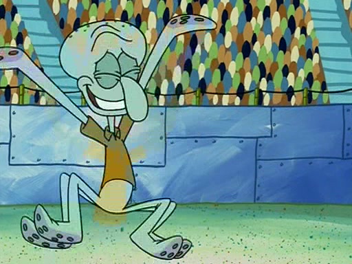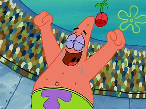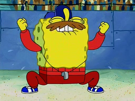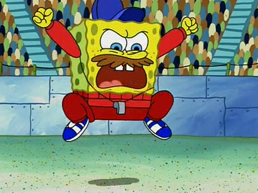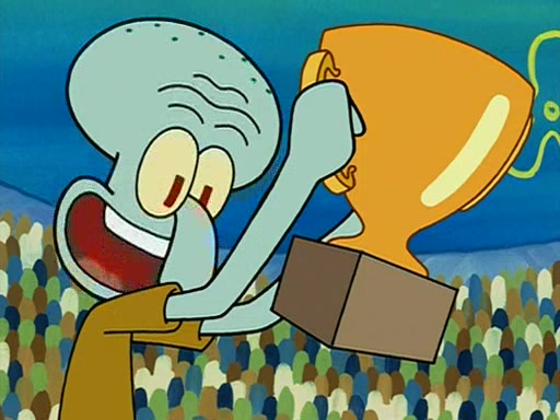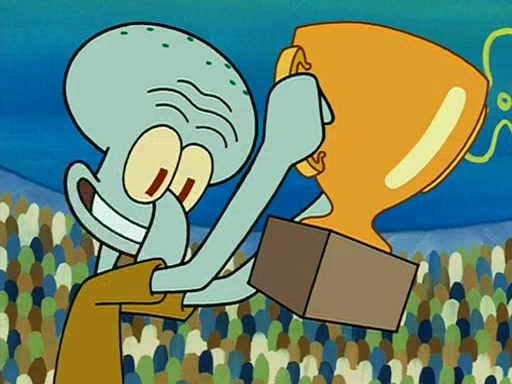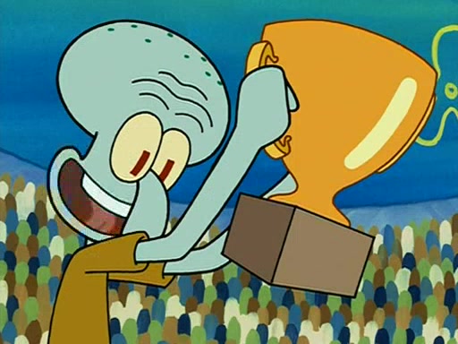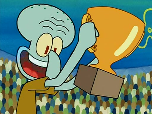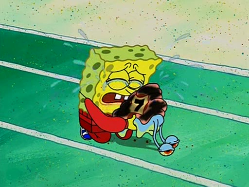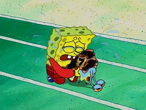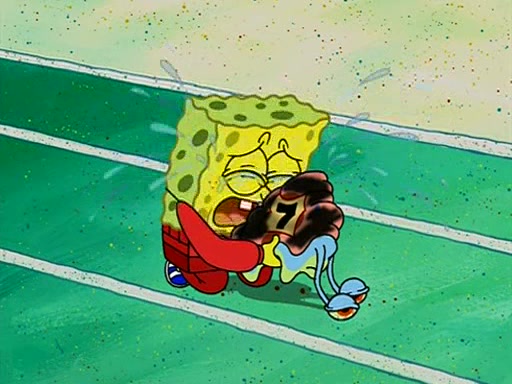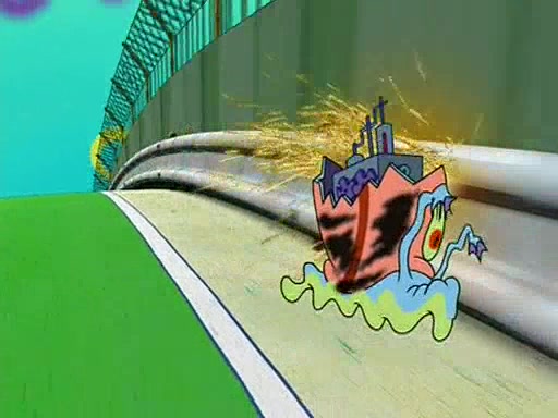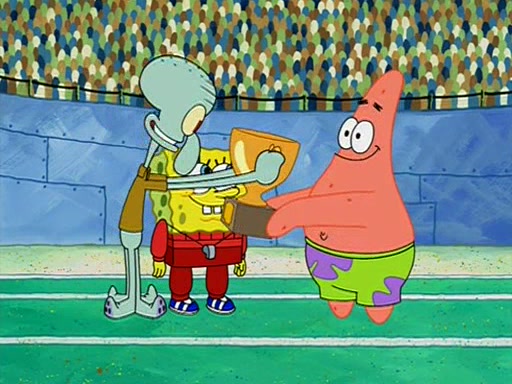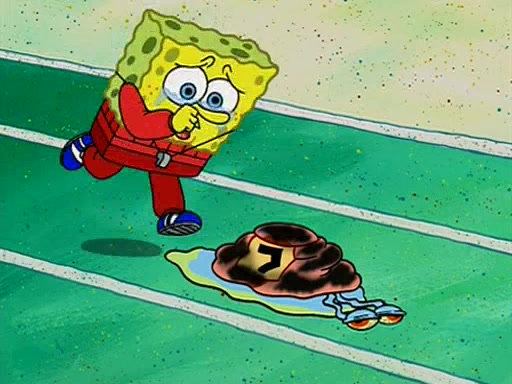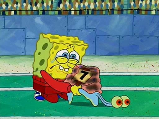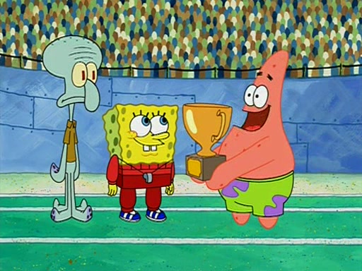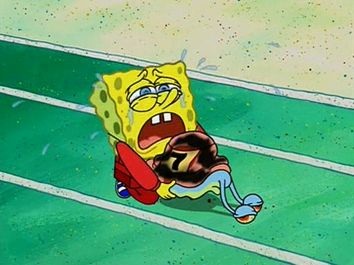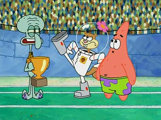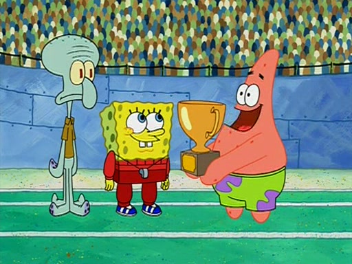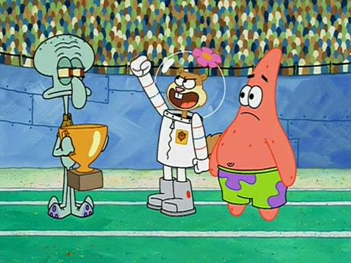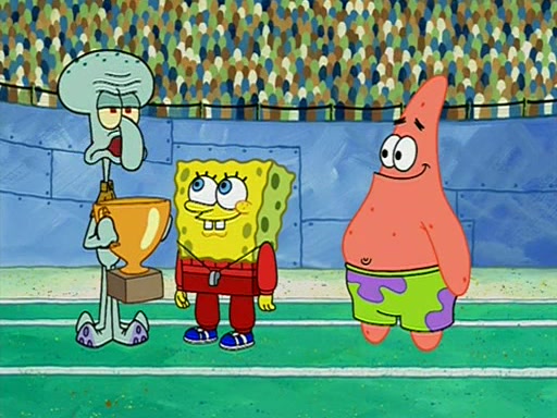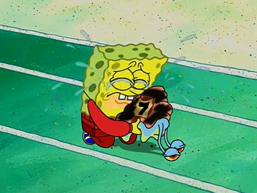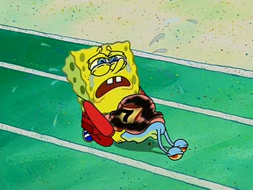 SpongeBob decides to train Gary as hard as he can. On the day of the race, Gary is exhausted from SpongeBob's brutal training. During the race, his eyes and shell explode, revealing a car engine, and he spirals out of control like a race car. SpongeBob, seeing the error of his ways, tells Gary that he can stop now, but Gary keeps on going. SpongeBob runs onto the track, which the announcer says that it's an "automatic disqualification." Gary hits the wall and explodes completely, and then an upset SpongeBob runs up to him and embraces him, crying. Snellie, who is almost at the finish line, turns around to help Gary, and the two instantly fall in love. Squidward is shocked at this and walks onto the track, and SpongeBob says to him, "Looks like you and me are in-laws, eh, Squidward?" Squidward then sees that, much to his surprise, Patrick's rock won the race. It is Unknown how, but this happened. Patrick was then very proud of his rock. Squidward is very upset by this, but Patrick then tells Squidward that he had the trophy engraved to him, and gives it to him, knowing how much Squidward wanted to win. Squidward thanks Patrick, but then reads the trophy, which reads "The 1st place Snail Racing cup presented to Squidward... TORTELLINI?!" He groans and says "Will I ever win?," and they all start laughing and then Sandy appears onscreen kicking SpongeBob yelling "That's for yesterday, SquarePants!"