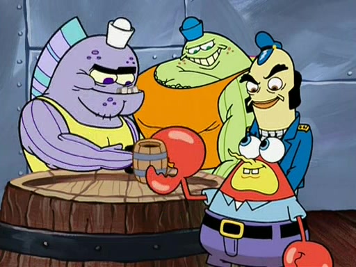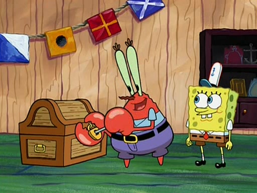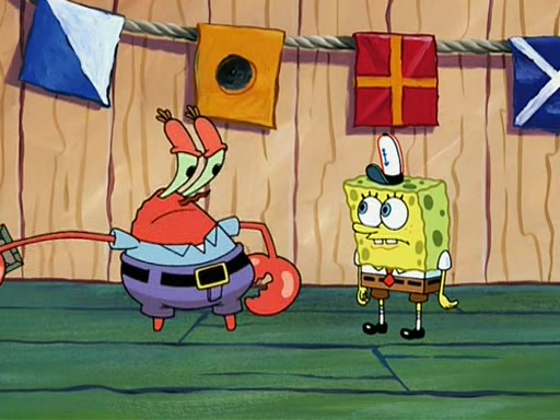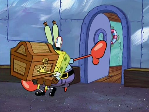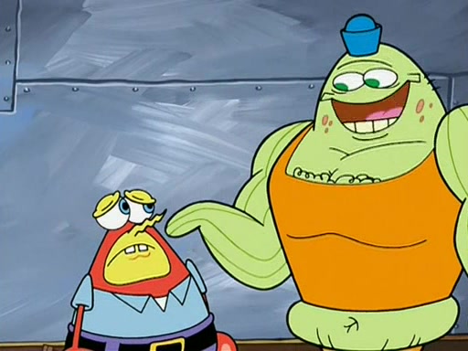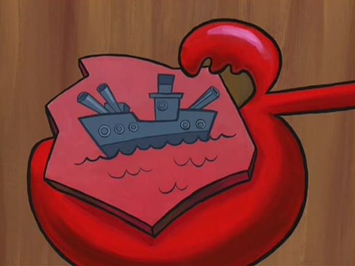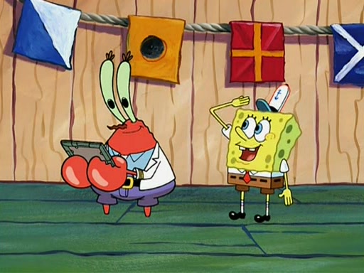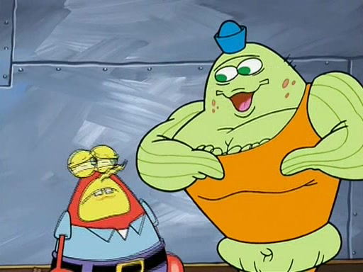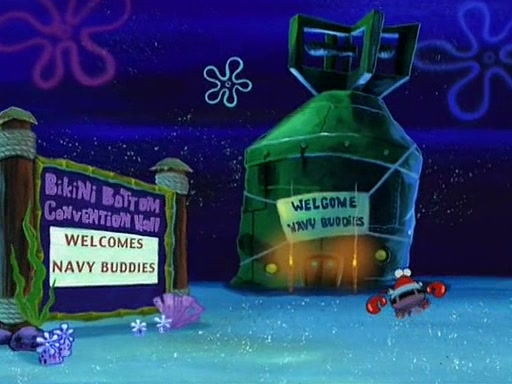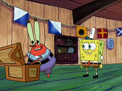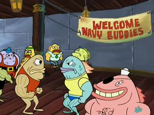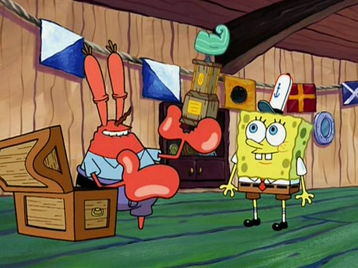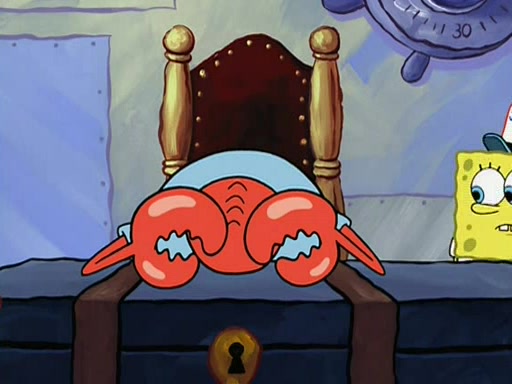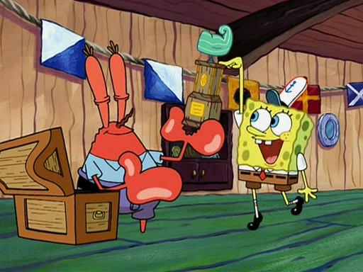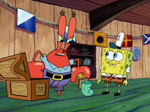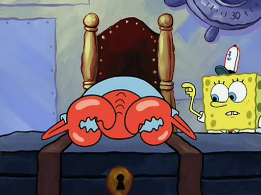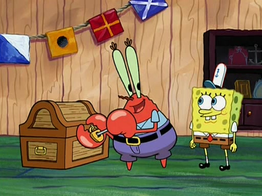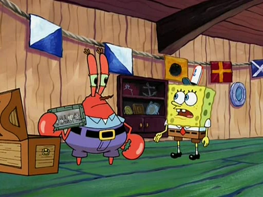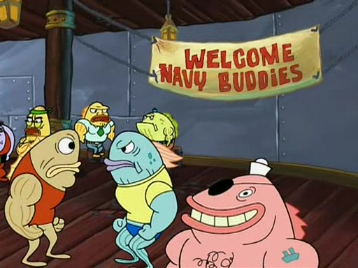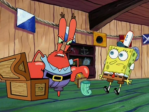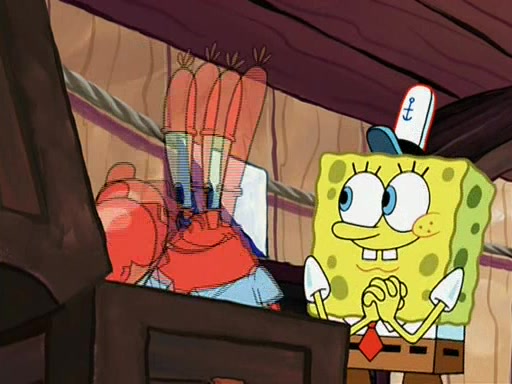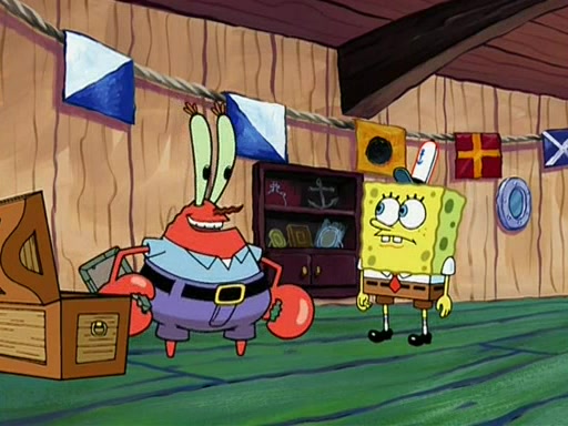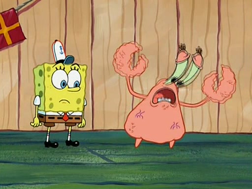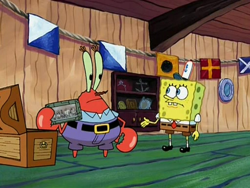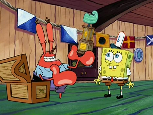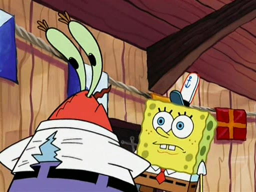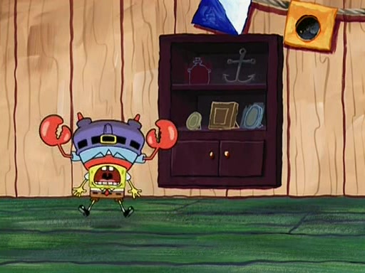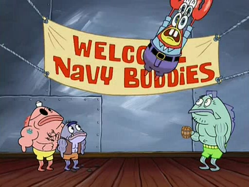 At the Krusty Krab, SpongeBob is making a Krabby Patty, and when he is finished, he cries as he gives it to Squidward so that he can give it to customer number 5. The customer is revealed to be SpongeBob, who grabs the order, and eats it. Meanwhile, outside the Krusty Krab, Mr. Krabs calls SpongeBob into his "Hidey Hole" under the dumpster, where he keeps his belongings from when he was in the Navy in a treasure chest. They take it into Mr. Krabs's office, and Mr. Krabs tells SpongeBob about his old Navy buddies and his nickname "Armor Abs Krabs," and that his Navy Reunion is tonight. Krabs then tells SpongeBob to leave him to revel in his memories and get his work station in "shipshape," which he does with great enthusiasm. SpongeBob soon hears Mr. Krabs scream, and goes into his office, where he finds that Mr. Krabs has molted his shell, leaving him a flabby mess. He kicks his shell in frustration, causing it to fly into SpongeBob, who becomes stuck inside it. Mr. Krabs then tells SpongeBob to assume his identity at the reunion so that his Navy friends will not see him in this state.