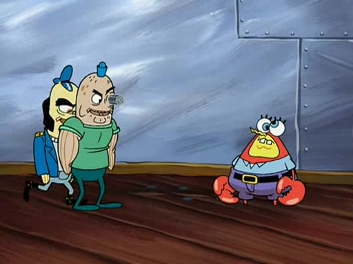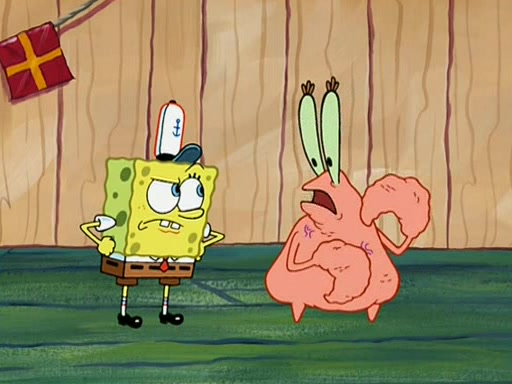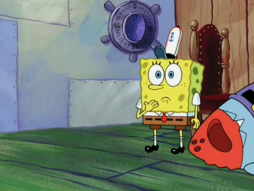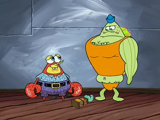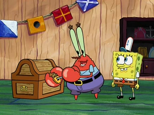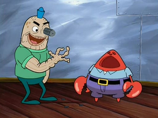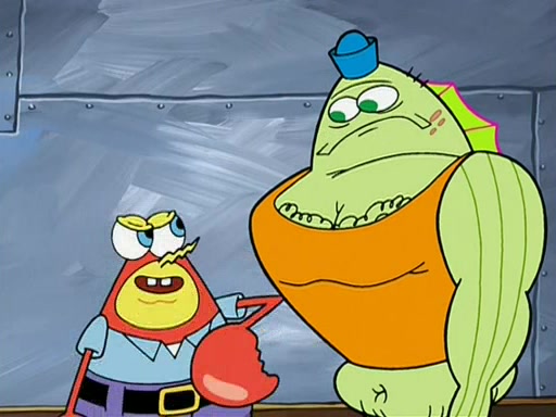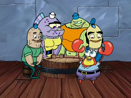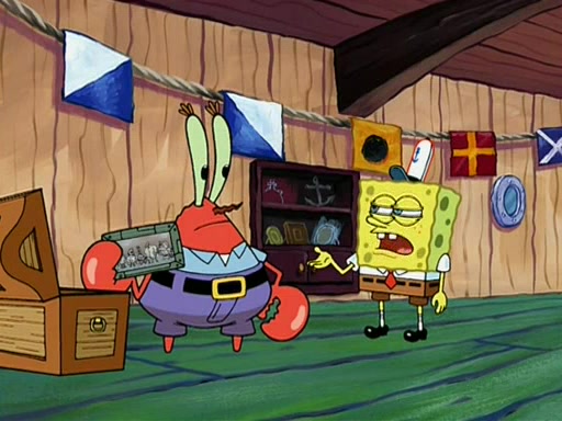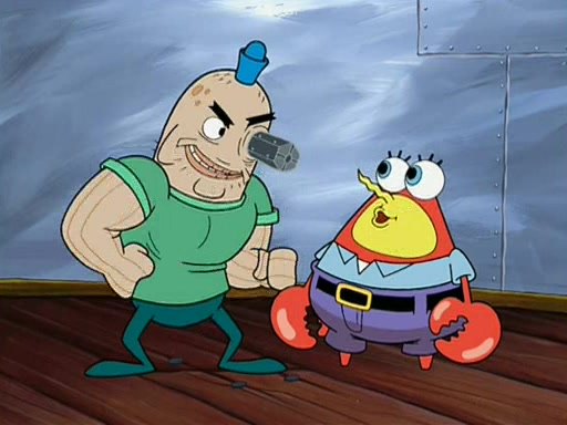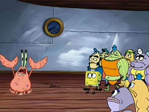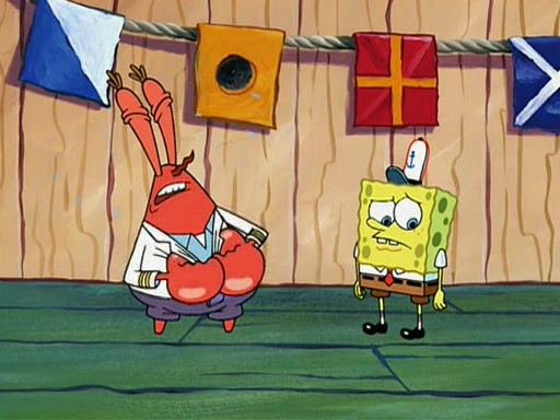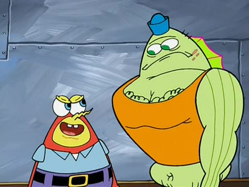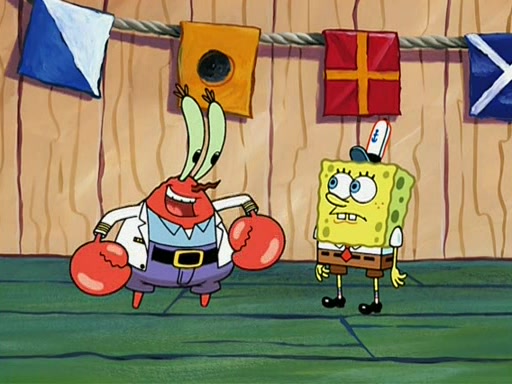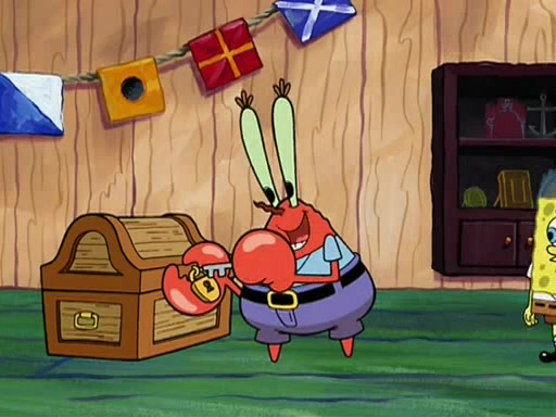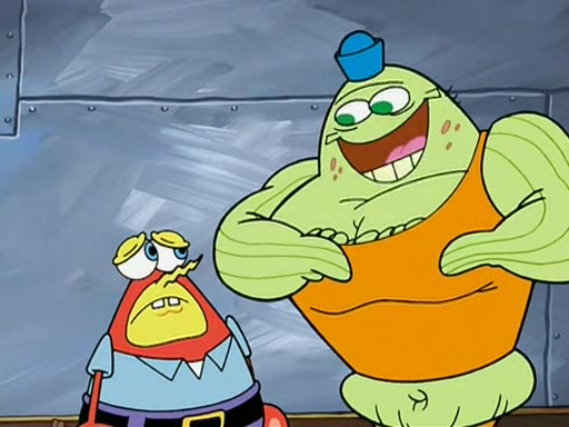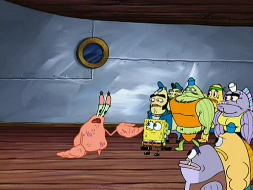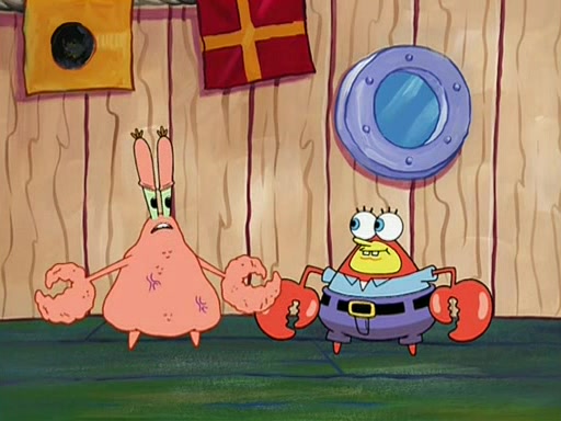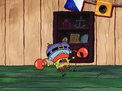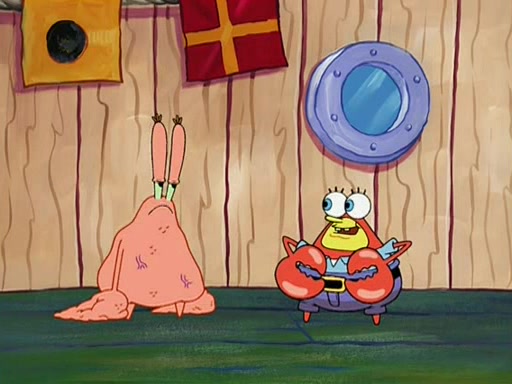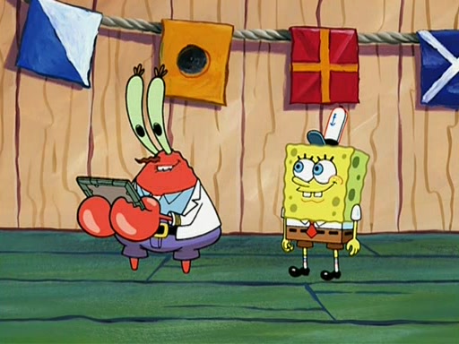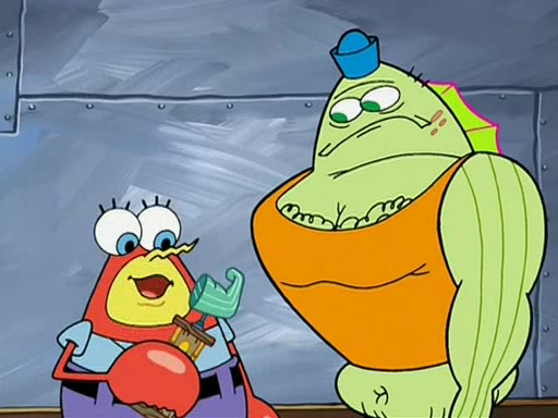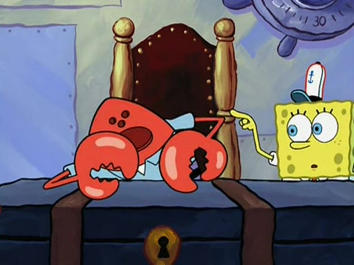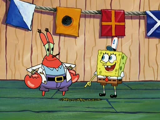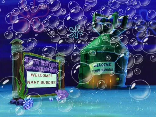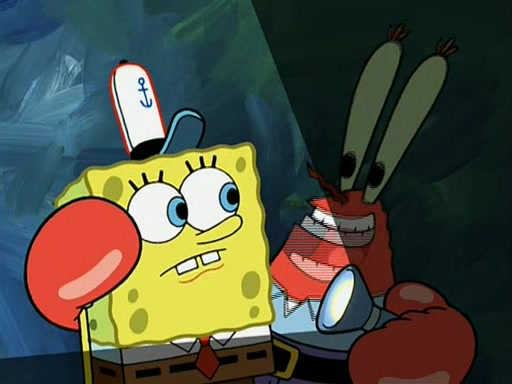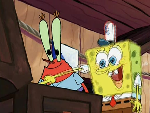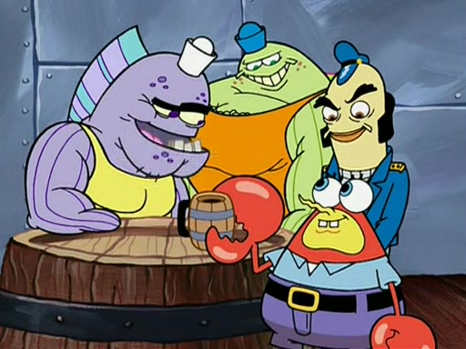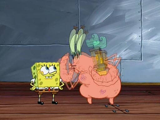 At the Krusty Krab, SpongeBob is making a Krabby Patty, and when he is finished, he cries as he gives it to Squidward so that he can give it to customer number 5. The customer is revealed to be SpongeBob, who grabs the order, and eats it. Meanwhile, outside the Krusty Krab, Mr. Krabs calls SpongeBob into his "Hidey Hole" under the dumpster, where he keeps his belongings from when he was in the Navy in a treasure chest. They take it into Mr. Krabs's office, and Mr. Krabs tells SpongeBob about his old Navy buddies and his nickname "Armor Abs Krabs," and that his Navy Reunion is tonight. Krabs then tells SpongeBob to leave him to revel in his memories and get his work station in "shipshape," which he does with great enthusiasm. SpongeBob soon hears Mr. Krabs scream, and goes into his office, where he finds that Mr. Krabs has molted his shell, leaving him a flabby mess. He kicks his shell in frustration, causing it to fly into SpongeBob, who becomes stuck inside it. Mr. Krabs then tells SpongeBob to assume his identity at the reunion so that his Navy friends will not see him in this state.