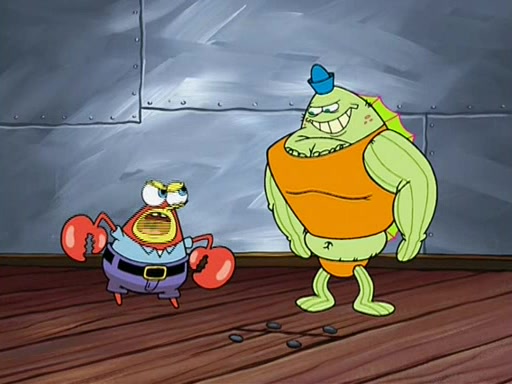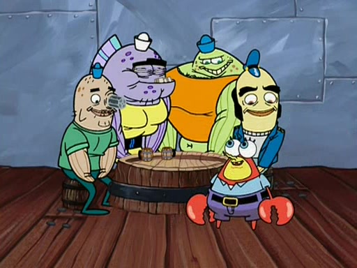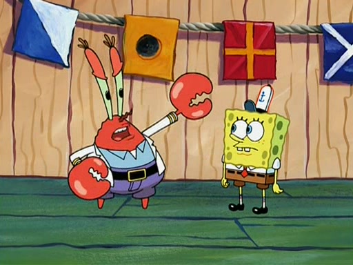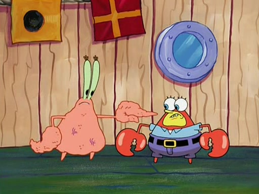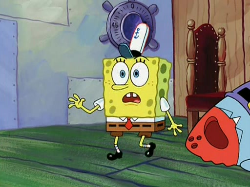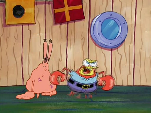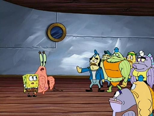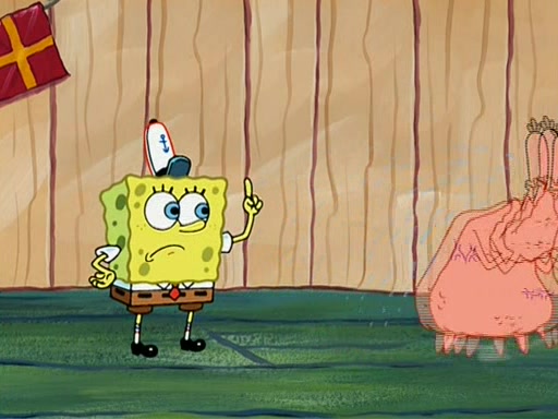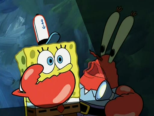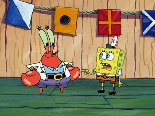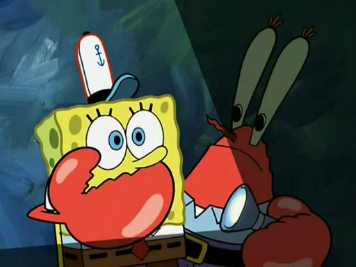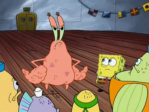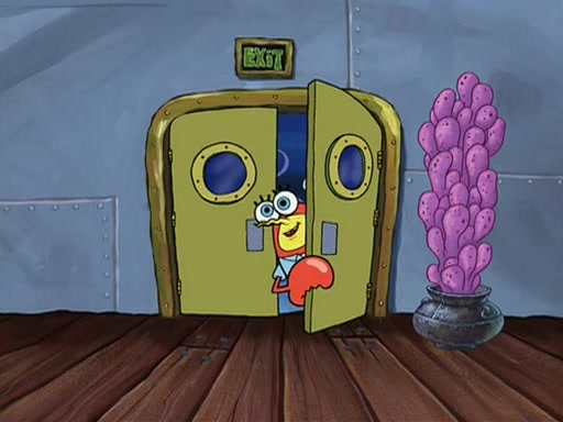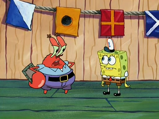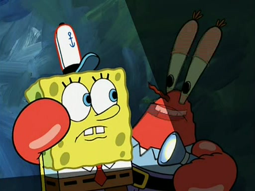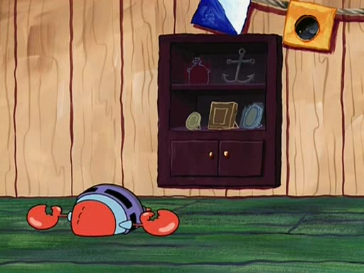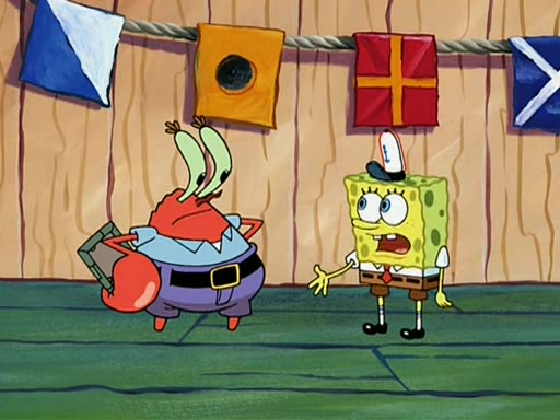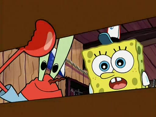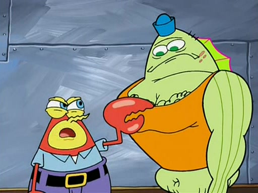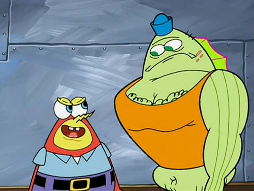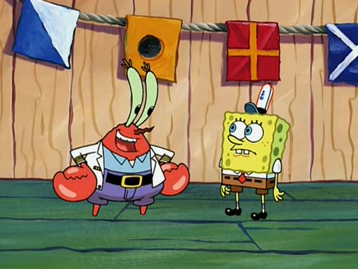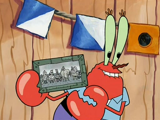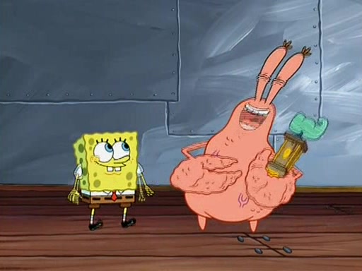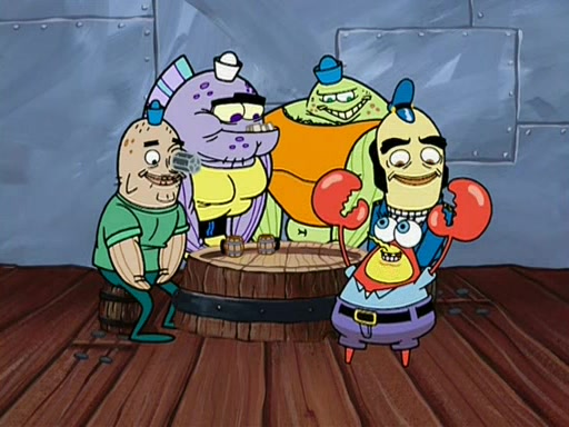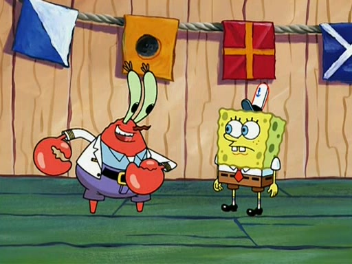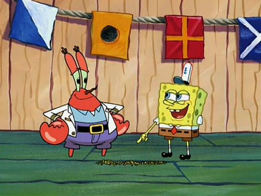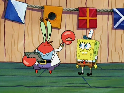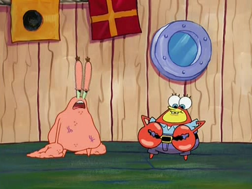 At the Krusty Krab, SpongeBob is making a Krabby Patty, and when he is finished, he cries as he gives it to Squidward so that he can give it to customer number 5. The customer is revealed to be SpongeBob, who grabs the order, and eats it. Meanwhile, outside the Krusty Krab, Mr. Krabs calls SpongeBob into his "Hidey Hole" under the dumpster, where he keeps his belongings from when he was in the Navy in a treasure chest. They take it into Mr. Krabs's office, and Mr. Krabs tells SpongeBob about his old Navy buddies and his nickname "Armor Abs Krabs," and that his Navy Reunion is tonight. Krabs then tells SpongeBob to leave him to revel in his memories and get his work station in "shipshape," which he does with great enthusiasm. SpongeBob soon hears Mr. Krabs scream, and goes into his office, where he finds that Mr. Krabs has molted his shell, leaving him a flabby mess. He kicks his shell in frustration, causing it to fly into SpongeBob, who becomes stuck inside it. Mr. Krabs then tells SpongeBob to assume his identity at the reunion so that his Navy friends will not see him in this state.