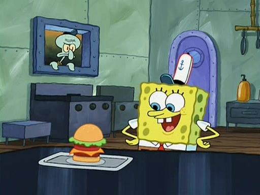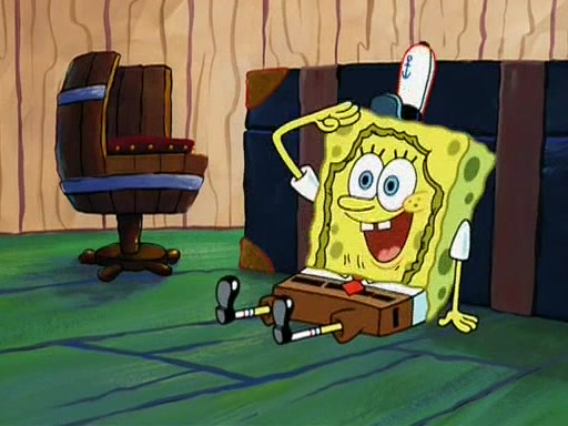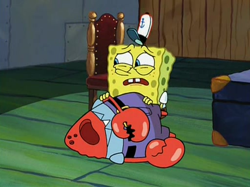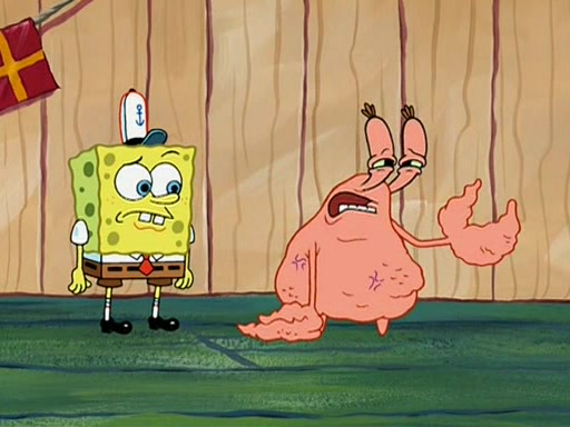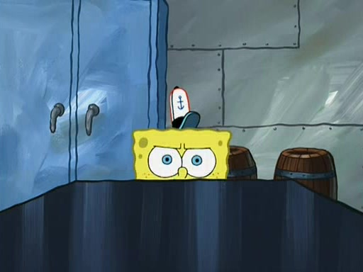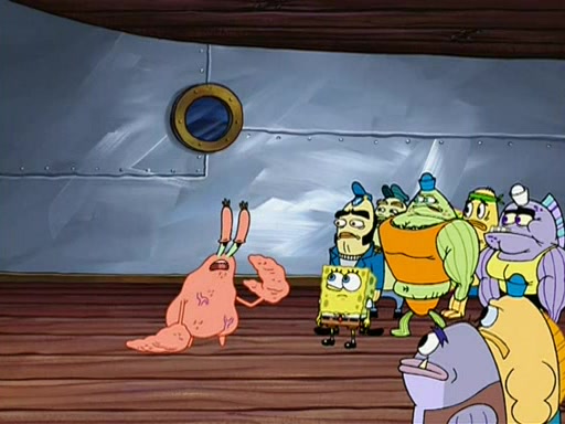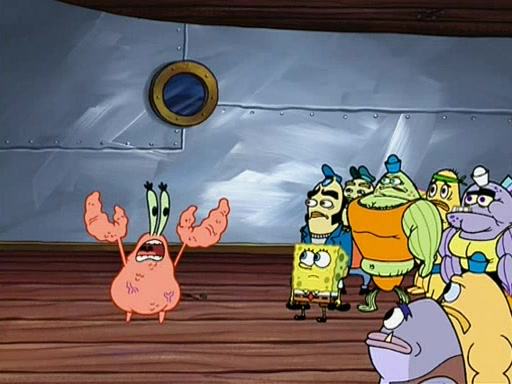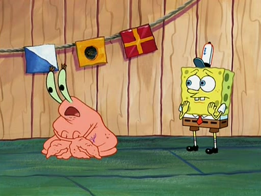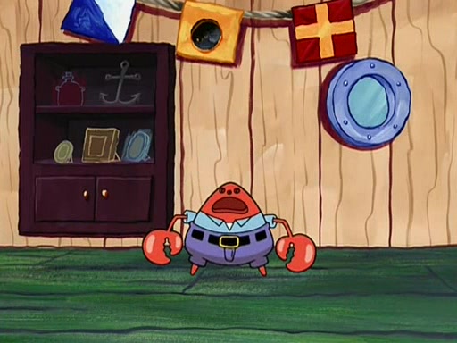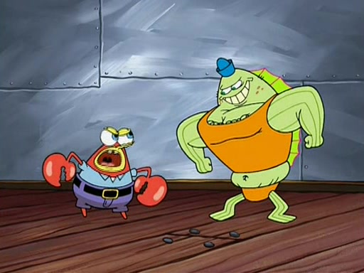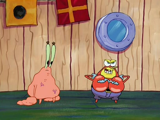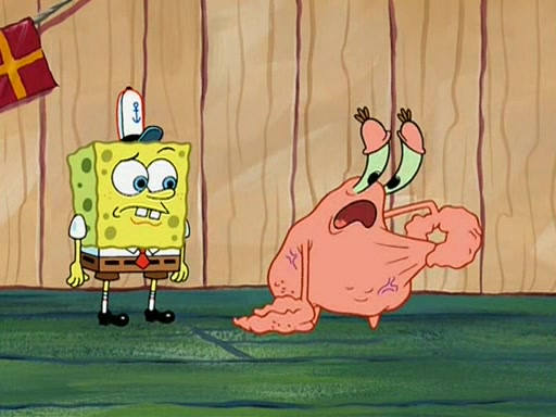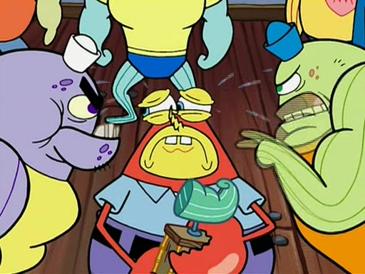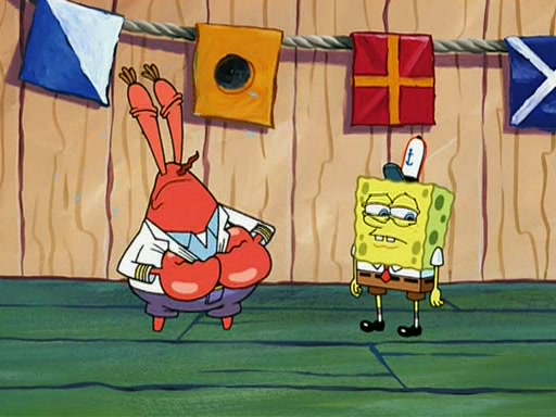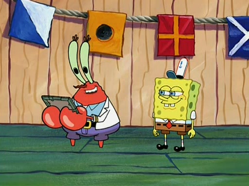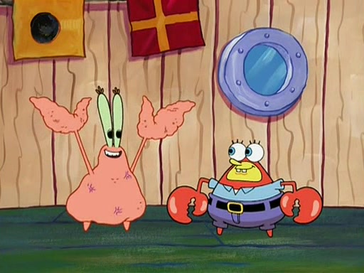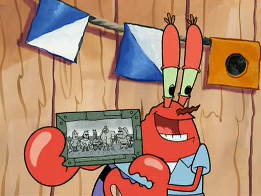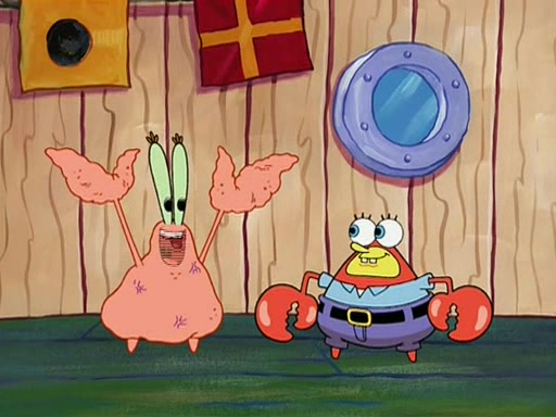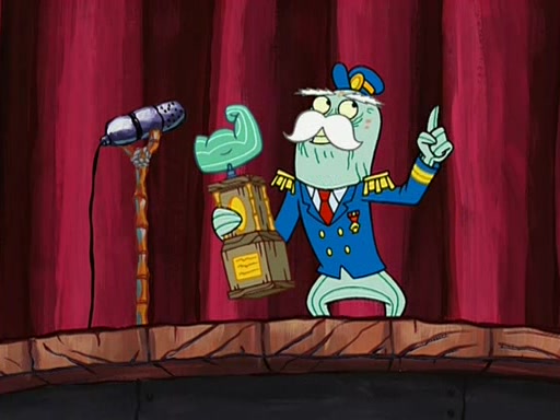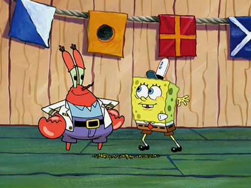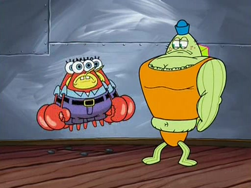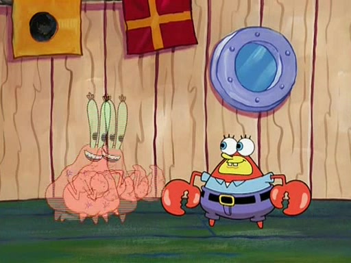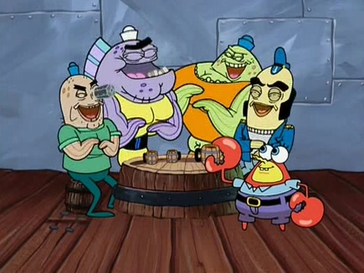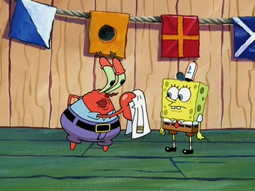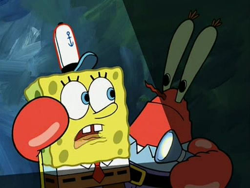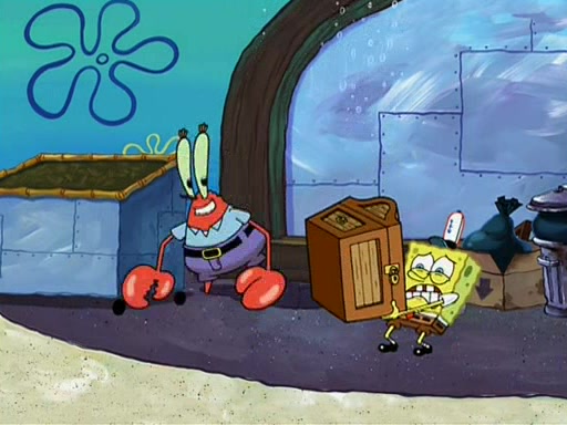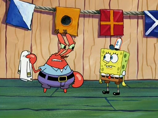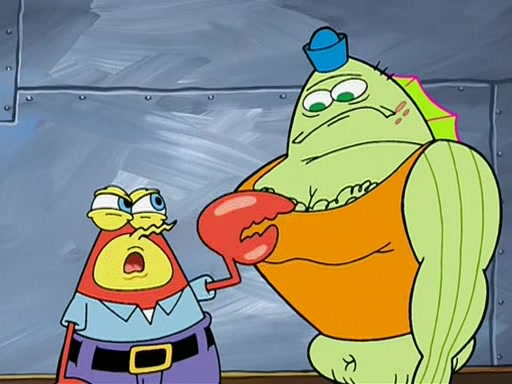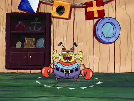 At the Krusty Krab, SpongeBob is making a Krabby Patty, and when he is finished, he cries as he gives it to Squidward so that he can give it to customer number 5. The customer is revealed to be SpongeBob, who grabs the order, and eats it. Meanwhile, outside the Krusty Krab, Mr. Krabs calls SpongeBob into his "Hidey Hole" under the dumpster, where he keeps his belongings from when he was in the Navy in a treasure chest. They take it into Mr. Krabs's office, and Mr. Krabs tells SpongeBob about his old Navy buddies and his nickname "Armor Abs Krabs," and that his Navy Reunion is tonight. Krabs then tells SpongeBob to leave him to revel in his memories and get his work station in "shipshape," which he does with great enthusiasm. SpongeBob soon hears Mr. Krabs scream, and goes into his office, where he finds that Mr. Krabs has molted his shell, leaving him a flabby mess. He kicks his shell in frustration, causing it to fly into SpongeBob, who becomes stuck inside it. Mr. Krabs then tells SpongeBob to assume his identity at the reunion so that his Navy friends will not see him in this state.