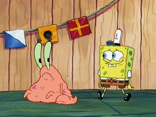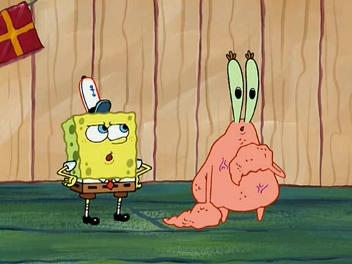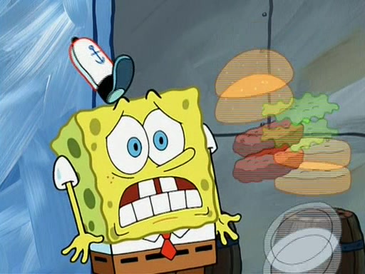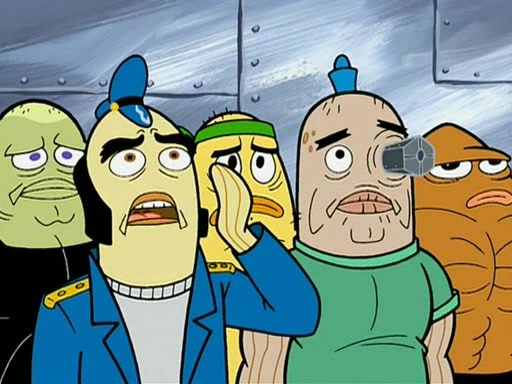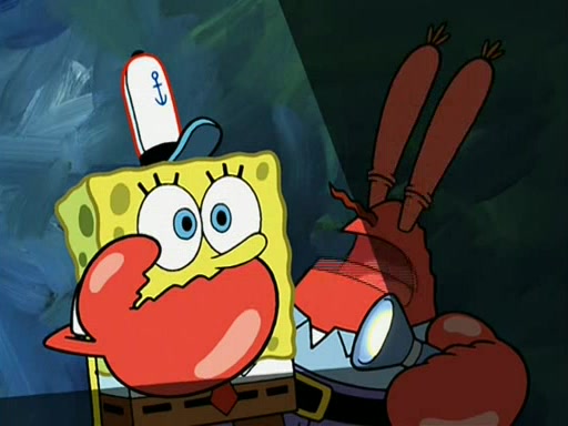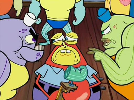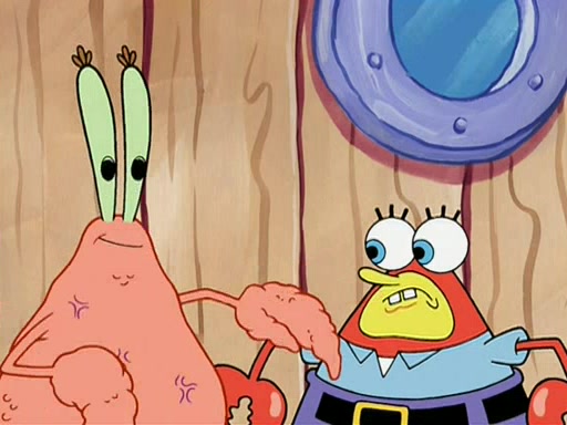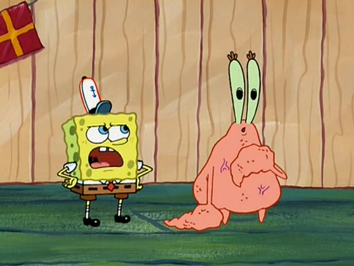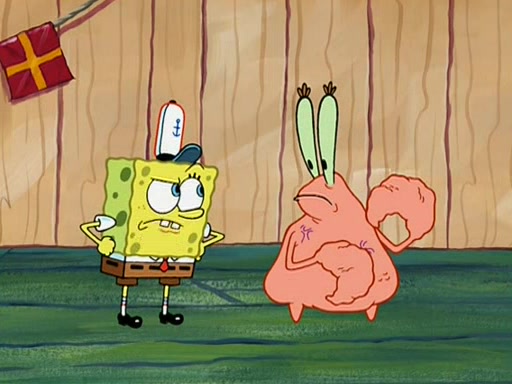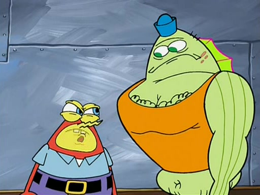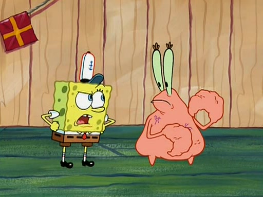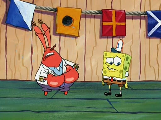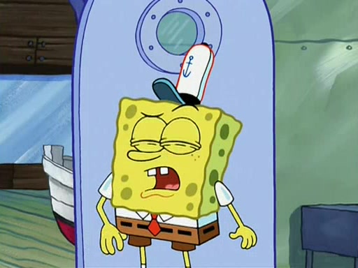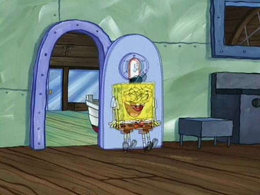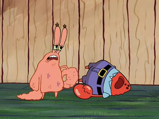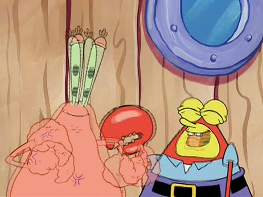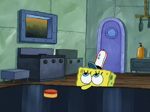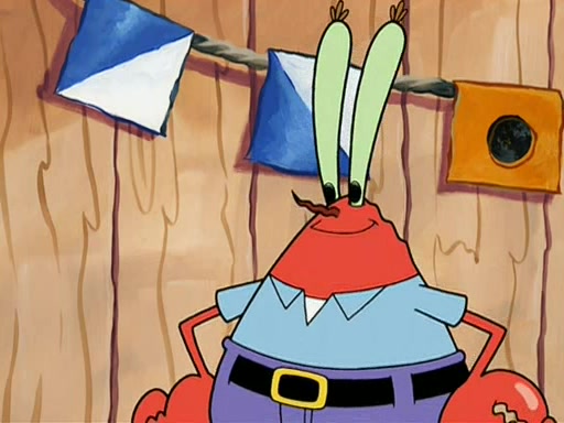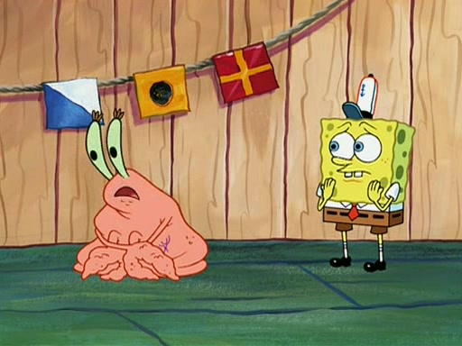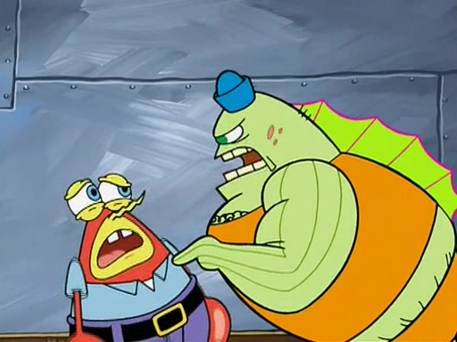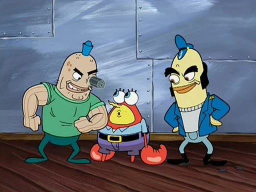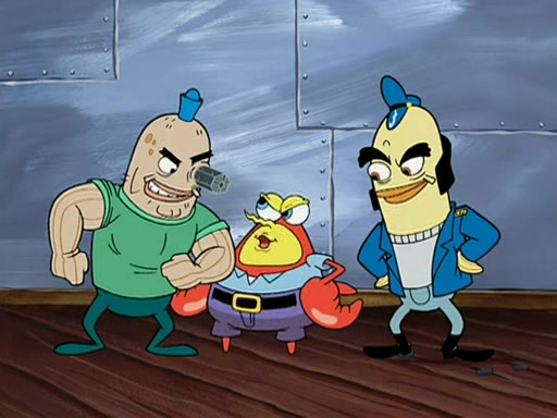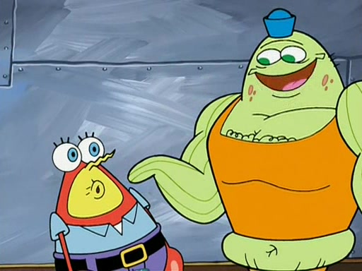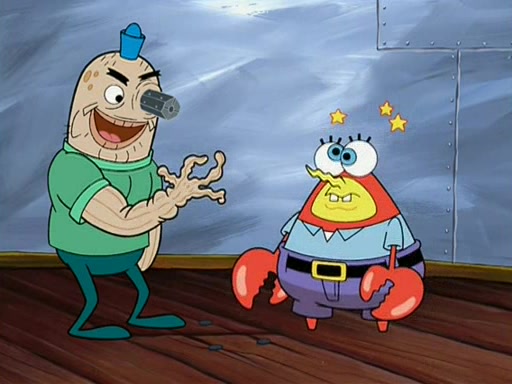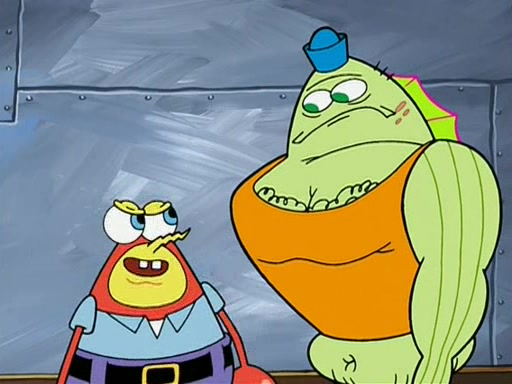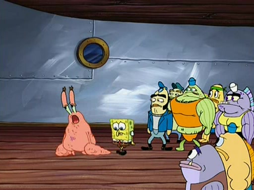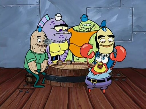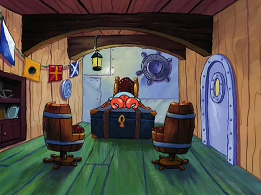 At the Krusty Krab, SpongeBob is making a Krabby Patty, and when he is finished, he cries as he gives it to Squidward so that he can give it to customer number 5. The customer is revealed to be SpongeBob, who grabs the order, and eats it. Meanwhile, outside the Krusty Krab, Mr. Krabs calls SpongeBob into his "Hidey Hole" under the dumpster, where he keeps his belongings from when he was in the Navy in a treasure chest. They take it into Mr. Krabs's office, and Mr. Krabs tells SpongeBob about his old Navy buddies and his nickname "Armor Abs Krabs," and that his Navy Reunion is tonight. Krabs then tells SpongeBob to leave him to revel in his memories and get his work station in "shipshape," which he does with great enthusiasm. SpongeBob soon hears Mr. Krabs scream, and goes into his office, where he finds that Mr. Krabs has molted his shell, leaving him a flabby mess. He kicks his shell in frustration, causing it to fly into SpongeBob, who becomes stuck inside it. Mr. Krabs then tells SpongeBob to assume his identity at the reunion so that his Navy friends will not see him in this state.