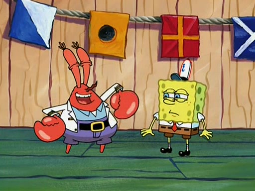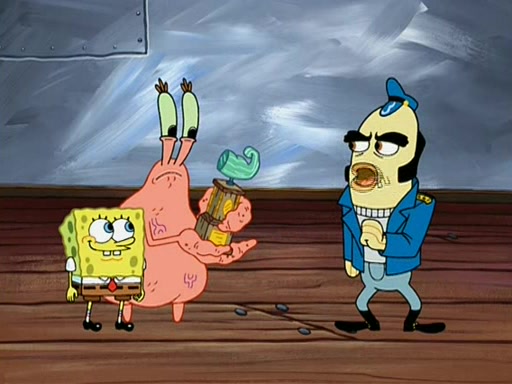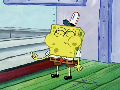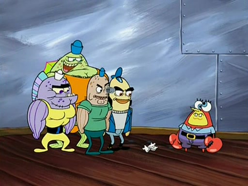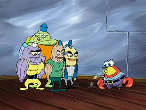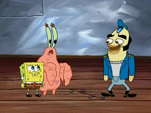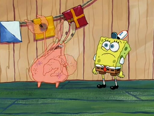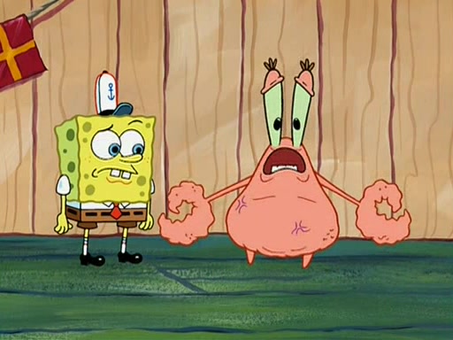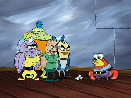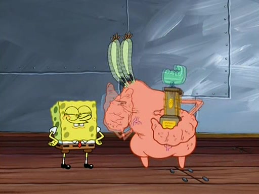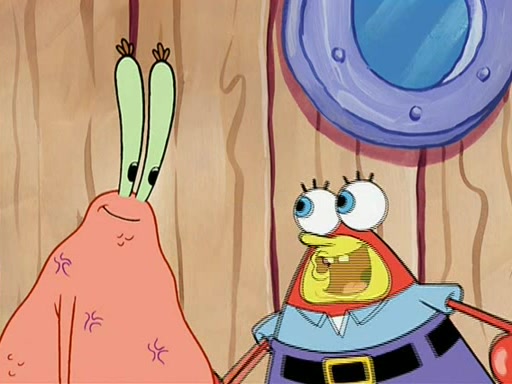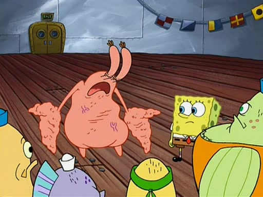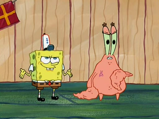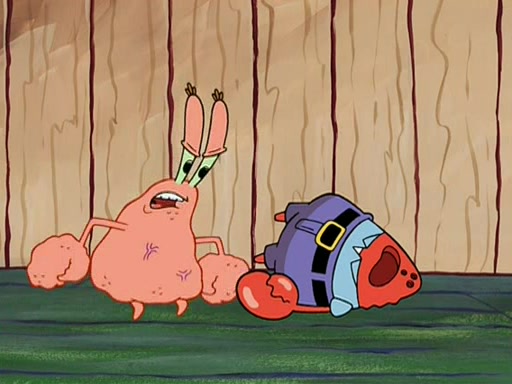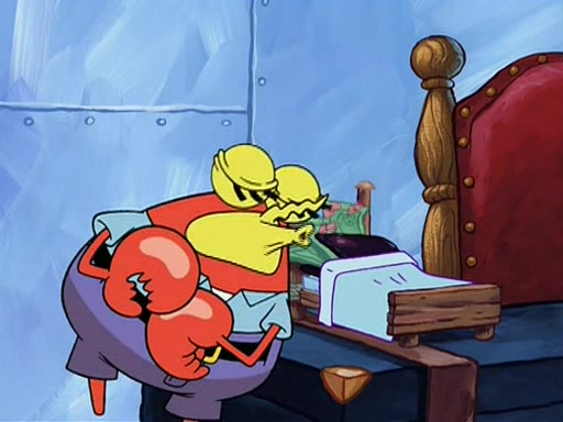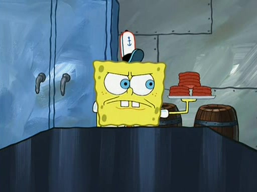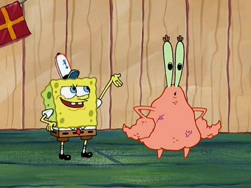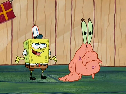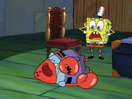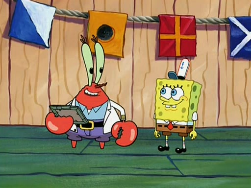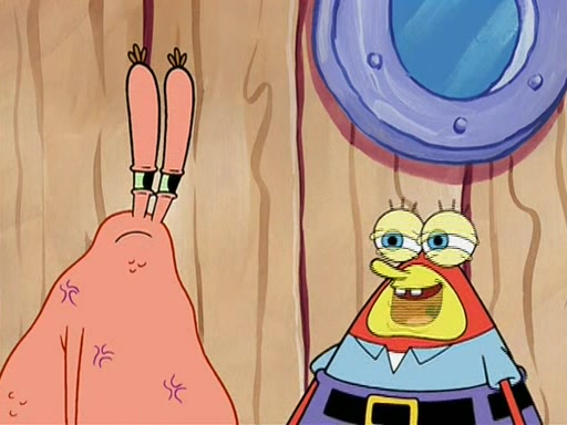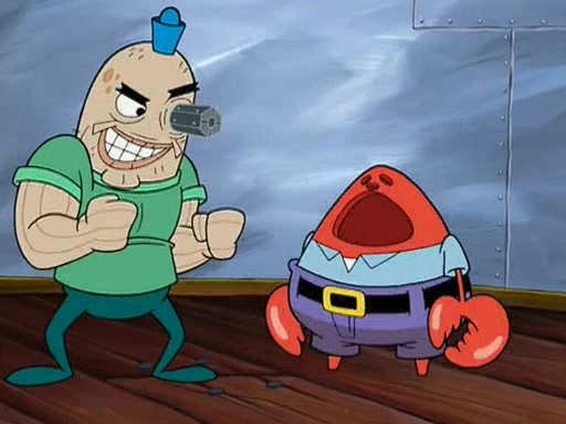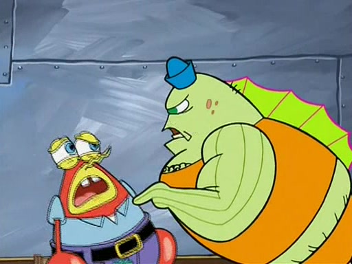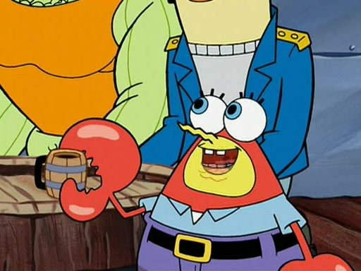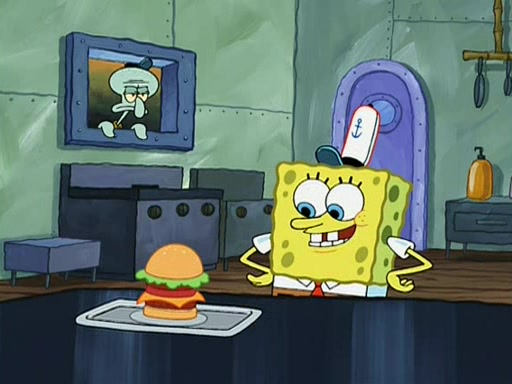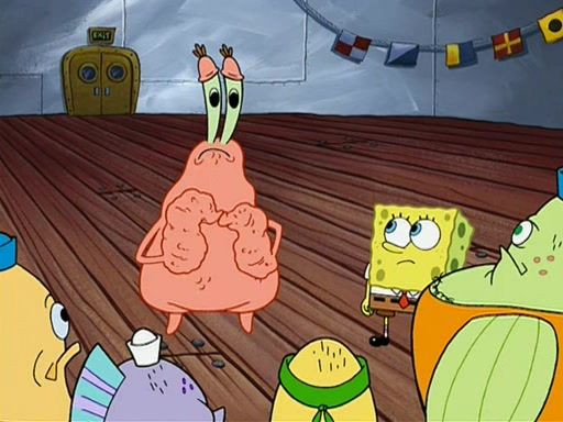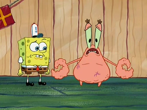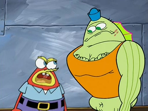 At the Krusty Krab, SpongeBob is making a Krabby Patty, and when he is finished, he cries as he gives it to Squidward so that he can give it to customer number 5. The customer is revealed to be SpongeBob, who grabs the order, and eats it. Meanwhile, outside the Krusty Krab, Mr. Krabs calls SpongeBob into his "Hidey Hole" under the dumpster, where he keeps his belongings from when he was in the Navy in a treasure chest. They take it into Mr. Krabs's office, and Mr. Krabs tells SpongeBob about his old Navy buddies and his nickname "Armor Abs Krabs," and that his Navy Reunion is tonight. Krabs then tells SpongeBob to leave him to revel in his memories and get his work station in "shipshape," which he does with great enthusiasm. SpongeBob soon hears Mr. Krabs scream, and goes into his office, where he finds that Mr. Krabs has molted his shell, leaving him a flabby mess. He kicks his shell in frustration, causing it to fly into SpongeBob, who becomes stuck inside it. Mr. Krabs then tells SpongeBob to assume his identity at the reunion so that his Navy friends will not see him in this state.
