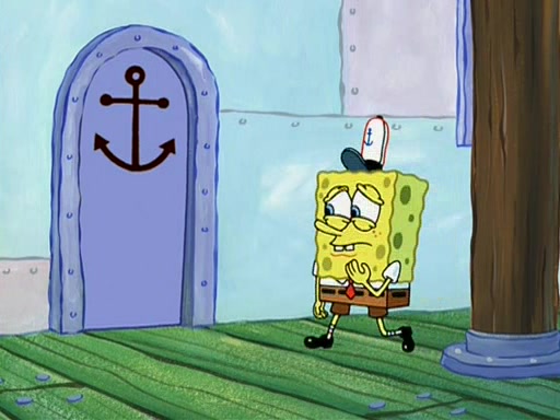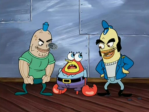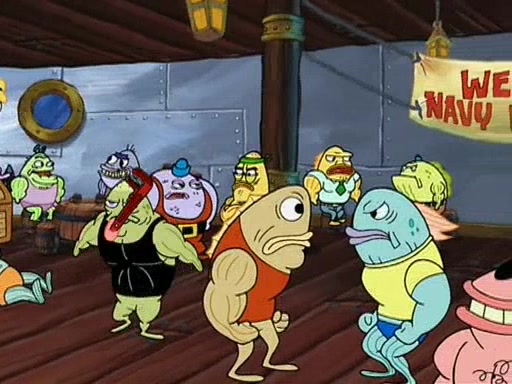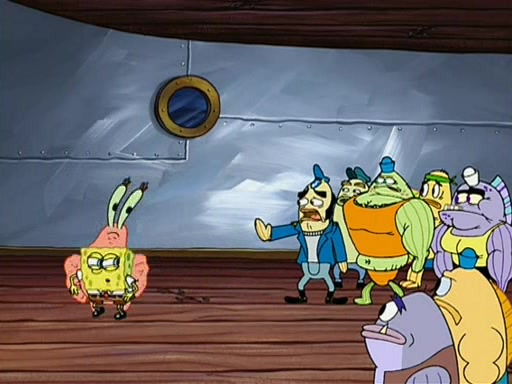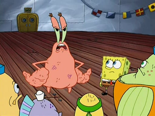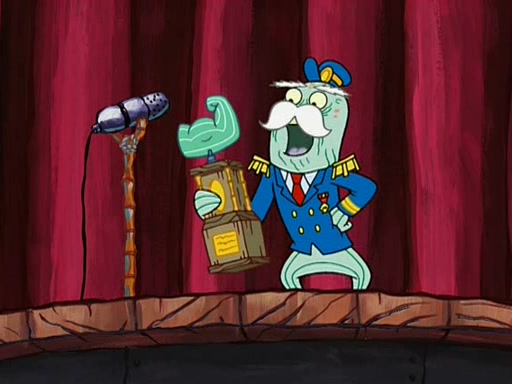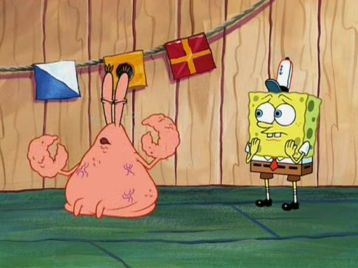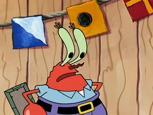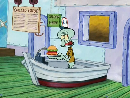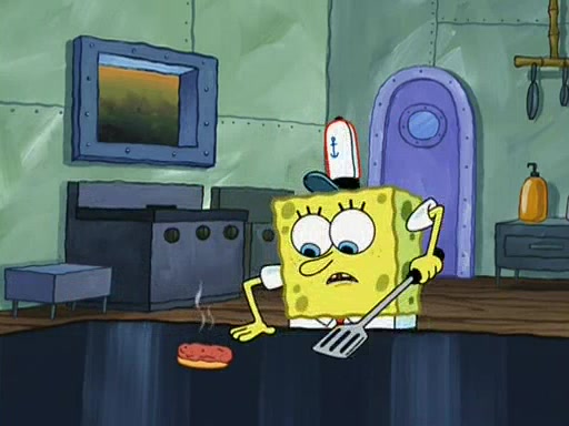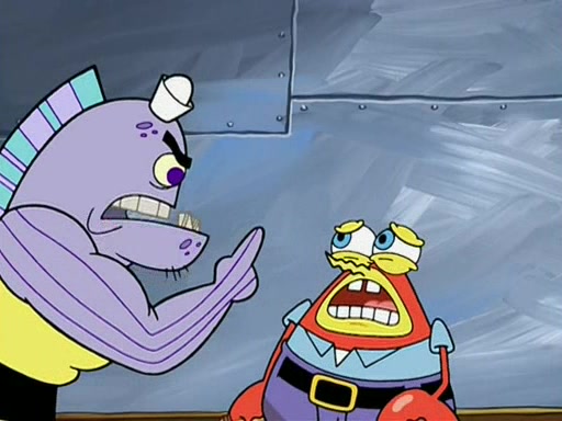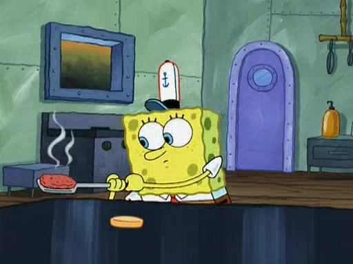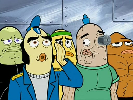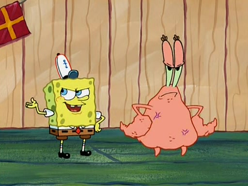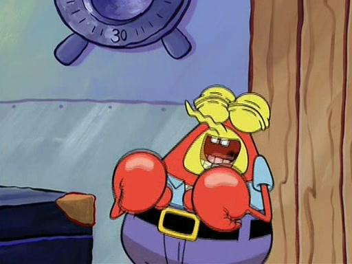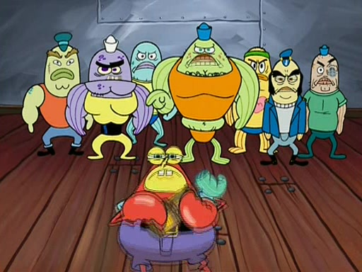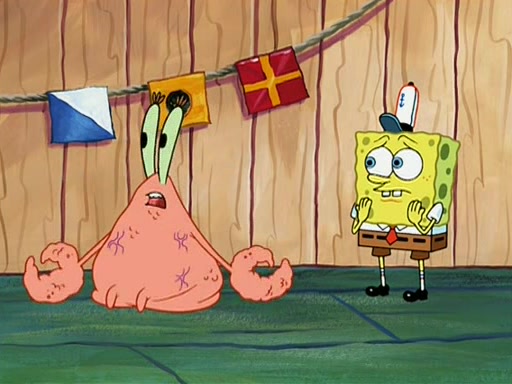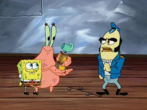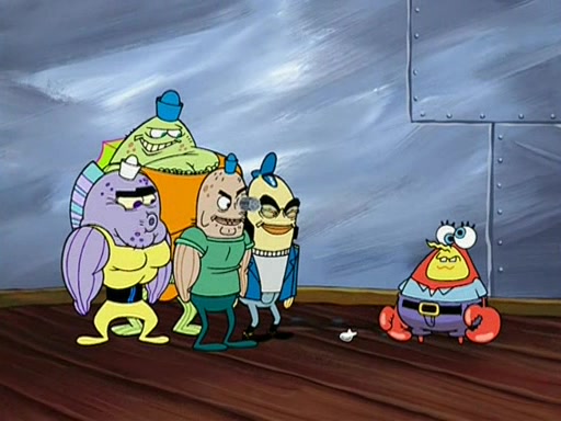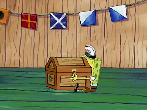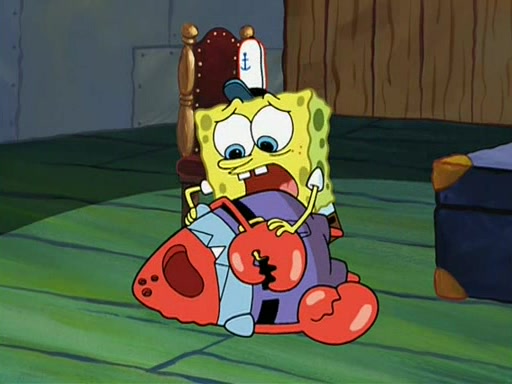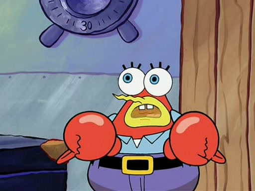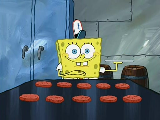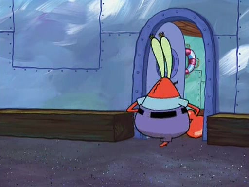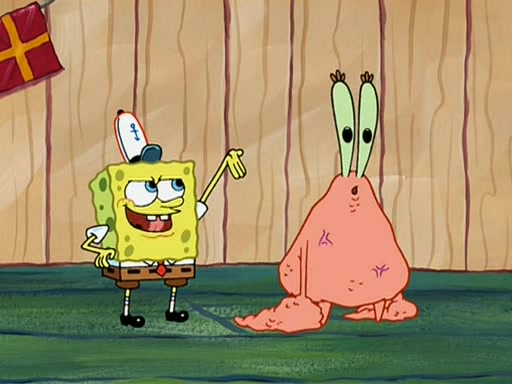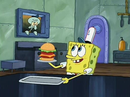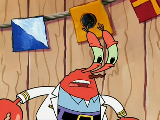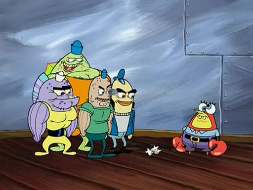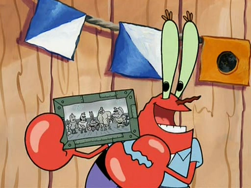 At the Krusty Krab, SpongeBob is making a Krabby Patty, and when he is finished, he cries as he gives it to Squidward so that he can give it to customer number 5. The customer is revealed to be SpongeBob, who grabs the order, and eats it. Meanwhile, outside the Krusty Krab, Mr. Krabs calls SpongeBob into his "Hidey Hole" under the dumpster, where he keeps his belongings from when he was in the Navy in a treasure chest. They take it into Mr. Krabs's office, and Mr. Krabs tells SpongeBob about his old Navy buddies and his nickname "Armor Abs Krabs," and that his Navy Reunion is tonight. Krabs then tells SpongeBob to leave him to revel in his memories and get his work station in "shipshape," which he does with great enthusiasm. SpongeBob soon hears Mr. Krabs scream, and goes into his office, where he finds that Mr. Krabs has molted his shell, leaving him a flabby mess. He kicks his shell in frustration, causing it to fly into SpongeBob, who becomes stuck inside it. Mr. Krabs then tells SpongeBob to assume his identity at the reunion so that his Navy friends will not see him in this state.
