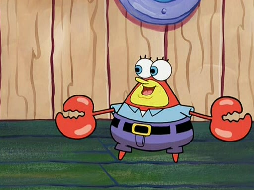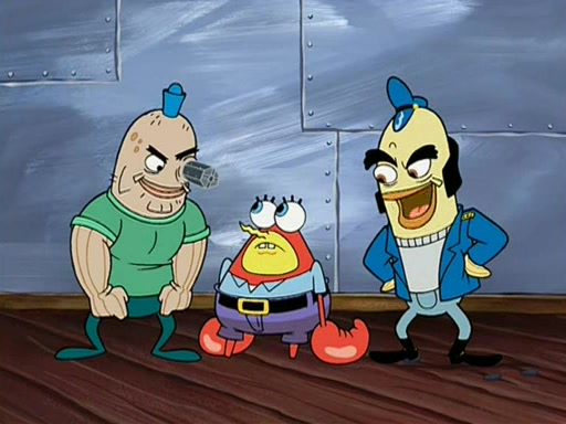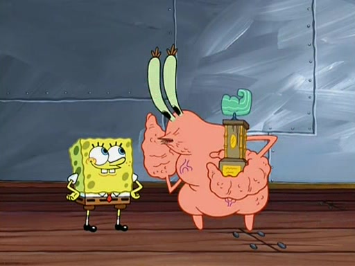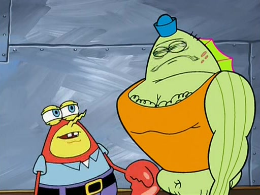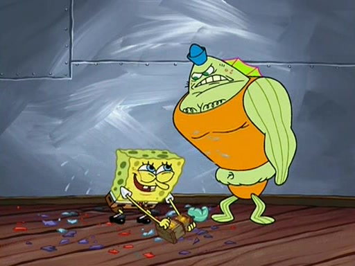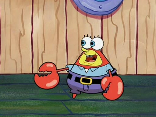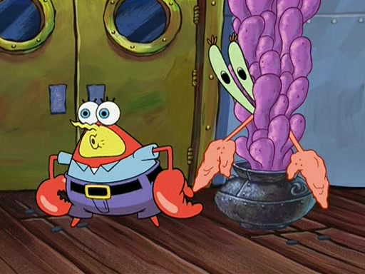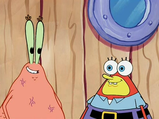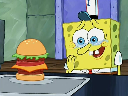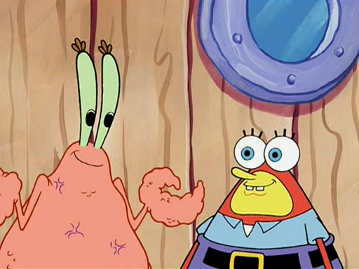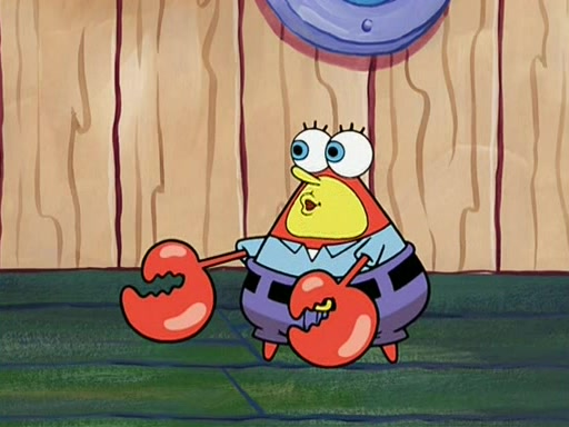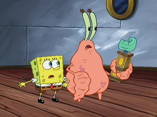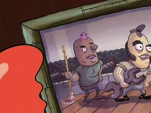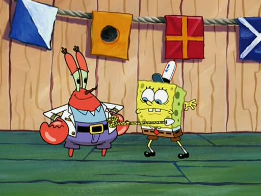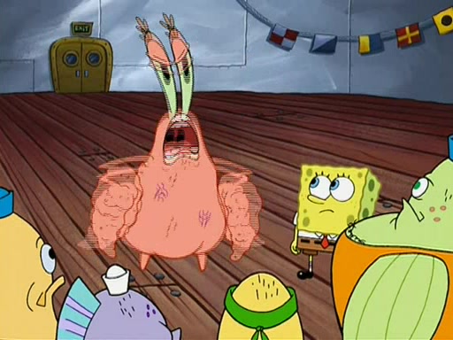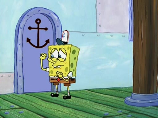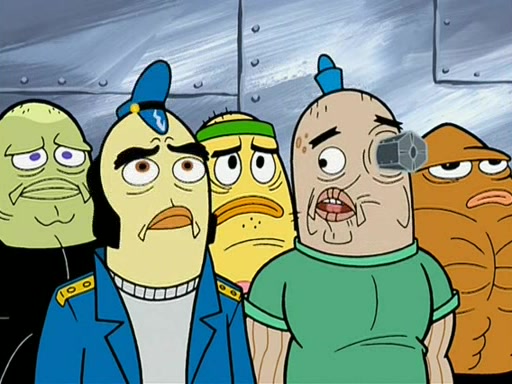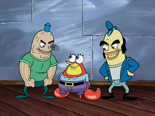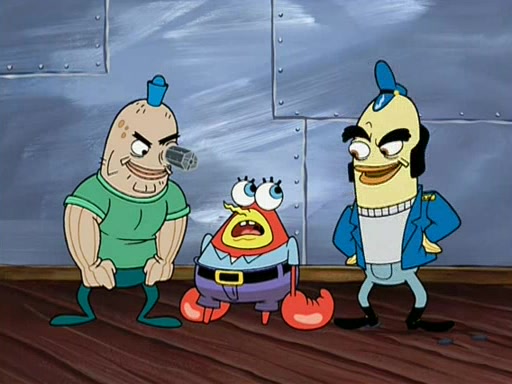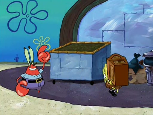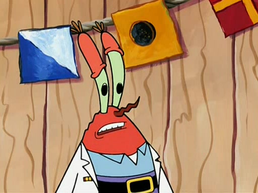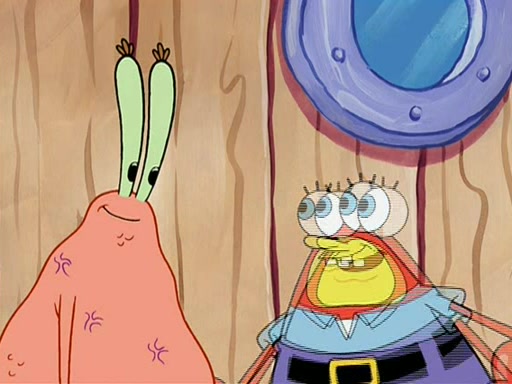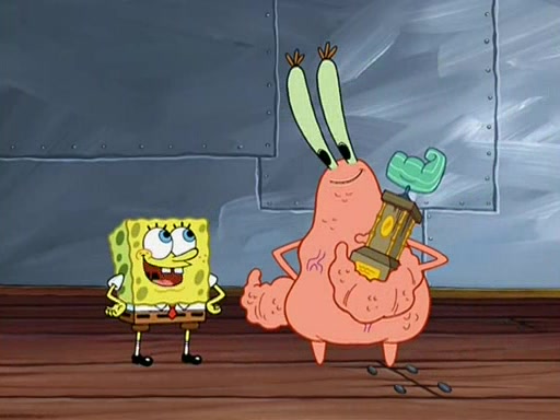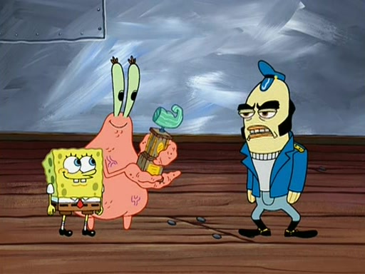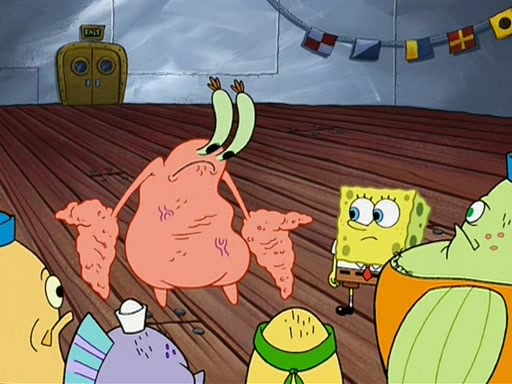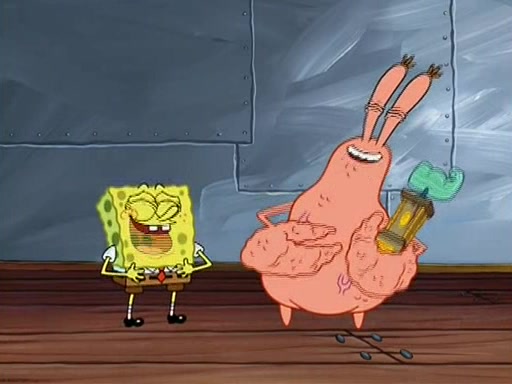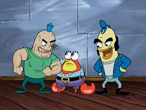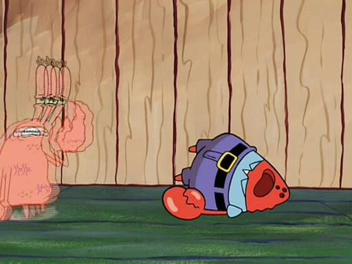 At the Krusty Krab, SpongeBob is making a Krabby Patty, and when he is finished, he cries as he gives it to Squidward so that he can give it to customer number 5. The customer is revealed to be SpongeBob, who grabs the order, and eats it. Meanwhile, outside the Krusty Krab, Mr. Krabs calls SpongeBob into his "Hidey Hole" under the dumpster, where he keeps his belongings from when he was in the Navy in a treasure chest. They take it into Mr. Krabs's office, and Mr. Krabs tells SpongeBob about his old Navy buddies and his nickname "Armor Abs Krabs," and that his Navy Reunion is tonight. Krabs then tells SpongeBob to leave him to revel in his memories and get his work station in "shipshape," which he does with great enthusiasm. SpongeBob soon hears Mr. Krabs scream, and goes into his office, where he finds that Mr. Krabs has molted his shell, leaving him a flabby mess. He kicks his shell in frustration, causing it to fly into SpongeBob, who becomes stuck inside it. Mr. Krabs then tells SpongeBob to assume his identity at the reunion so that his Navy friends will not see him in this state.
