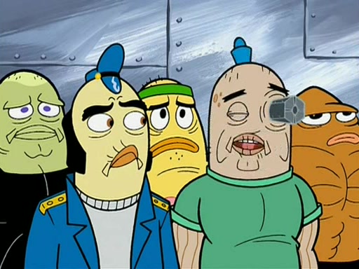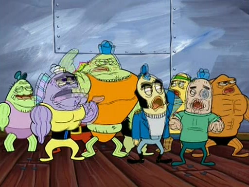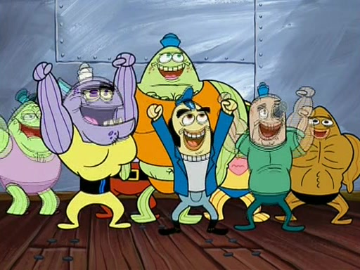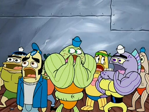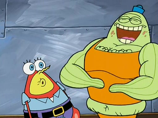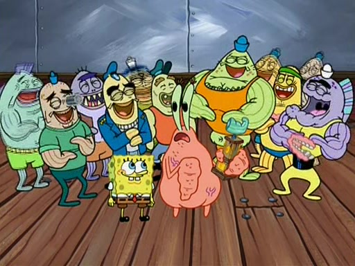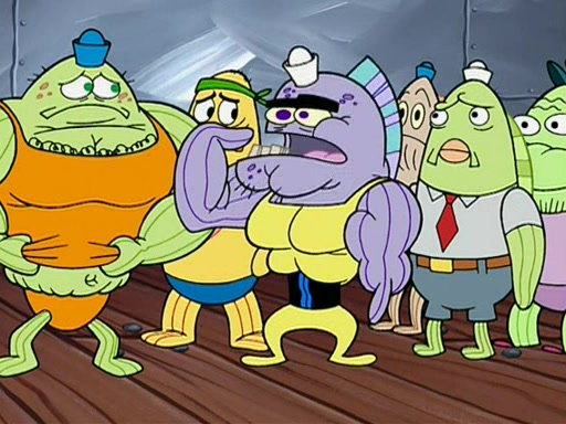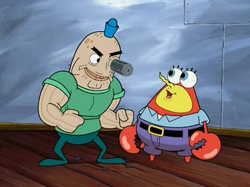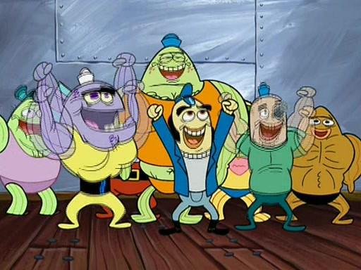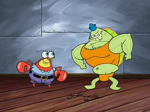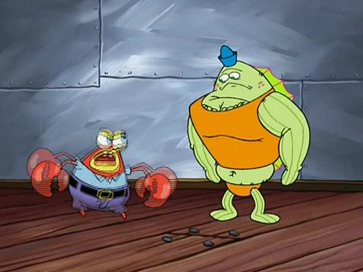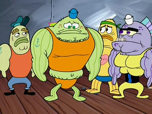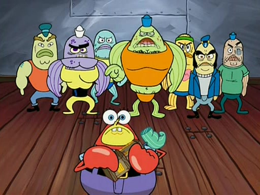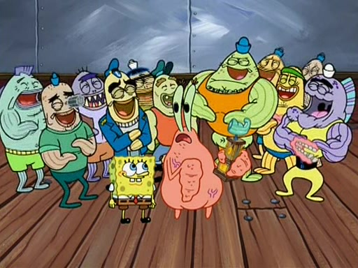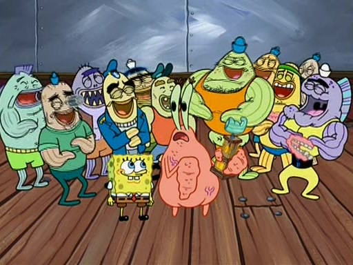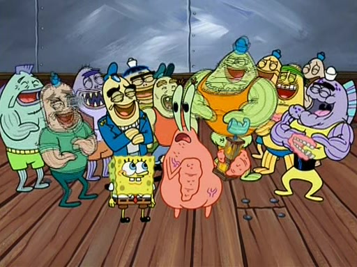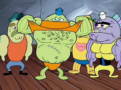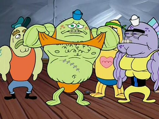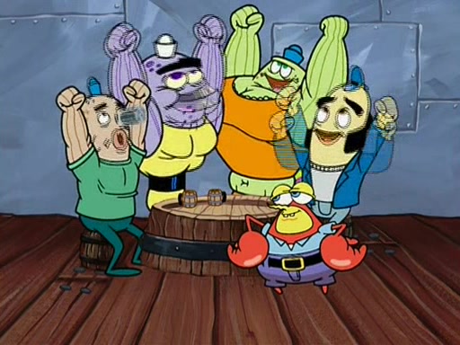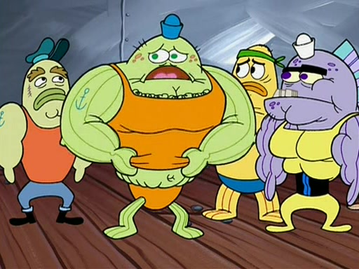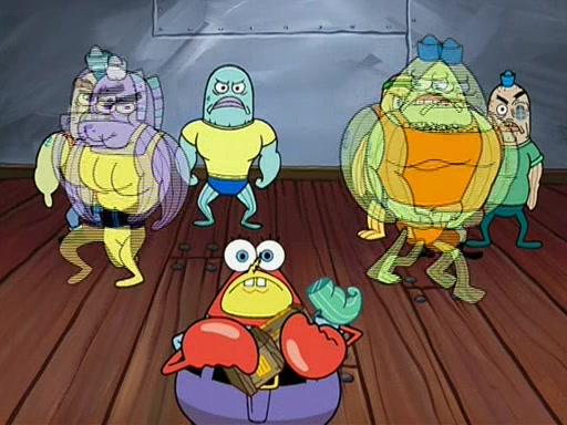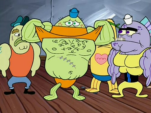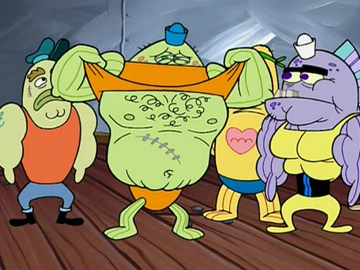At the reunion, SpongeBob initially puts on a convincing performance, but goes onstage to accept his "Trophy of Manly Toughness," he tells a story of him jellyfishing in Jellyfish Fields, and nearly reveals his true identity before Mr. Krabs tells him to get offstage. He attempts to leave, but Torpedo-belly insists that he body-slam him to test if he still has "armor abs." When he punches SpongeBob, he flies around the room, cracking the shell and revealing SpongeBob. They get angry, but the real Mr. Krabs emerges from the bush that he had been watching from and reveals himself. He begins to walk away in shame, until Muttonchop gives him back his trophy, saying that revealing his condition was the manliest thing anyone could ever do, and revealing that they have all been hiding something as well (Torpedo-Belly, for instance, had his torpedo removed). As Mr. Krabs walks away with SpongeBob, he says "Yeah, poor suckers. At least my shell will grow back!" and they both start laughing as the episode ends.