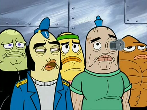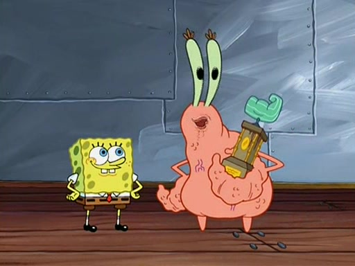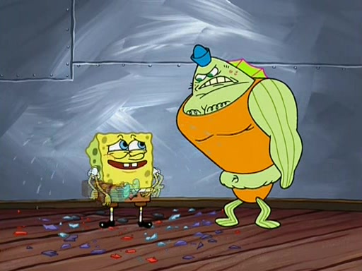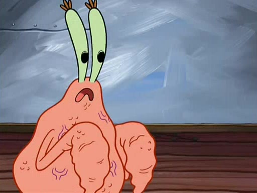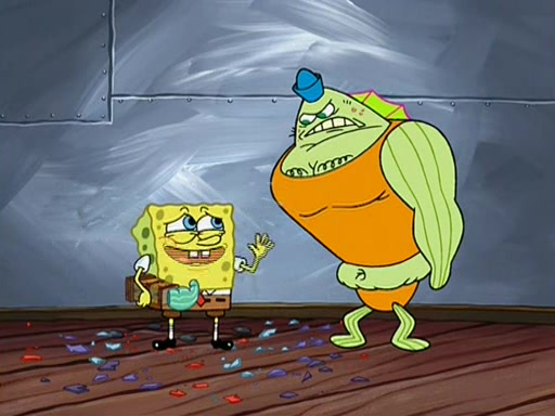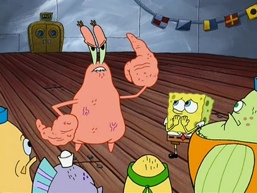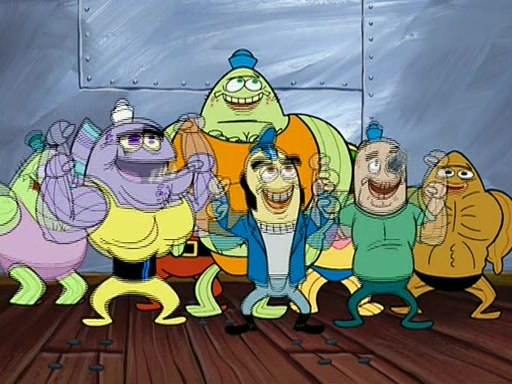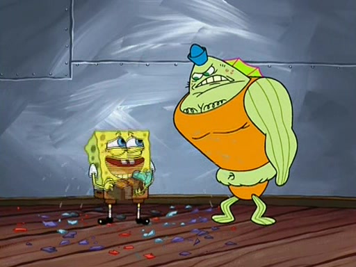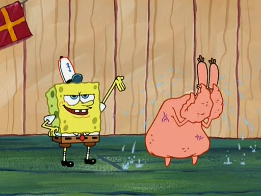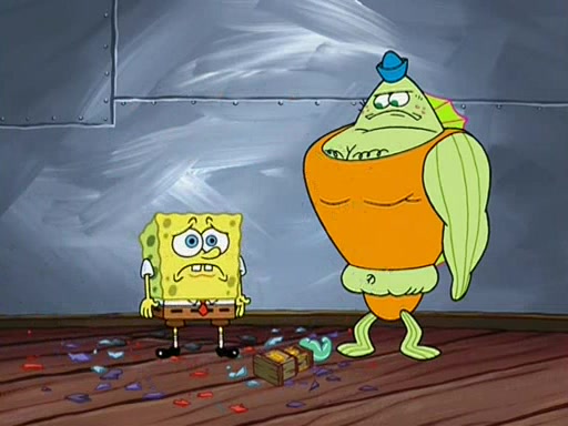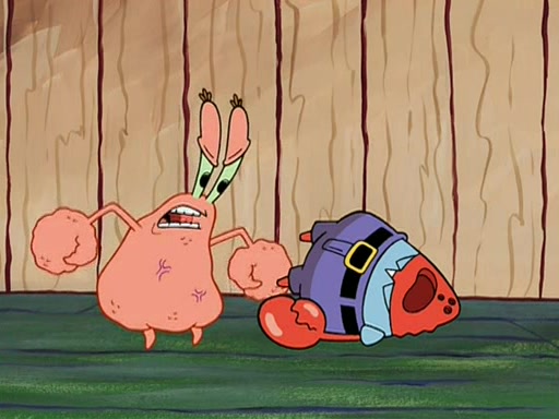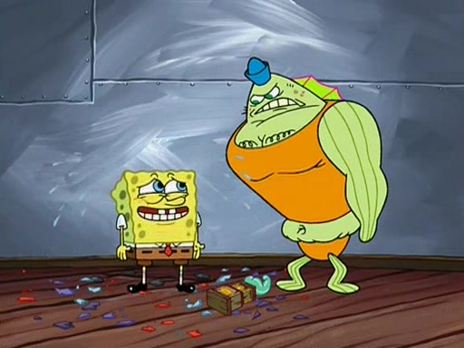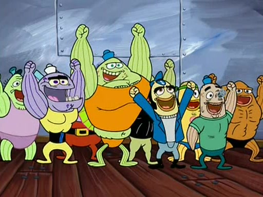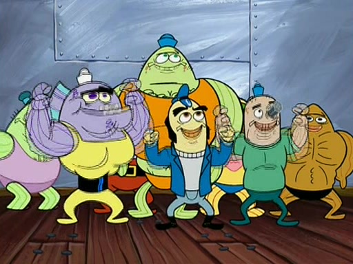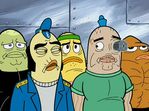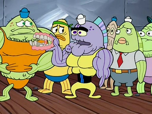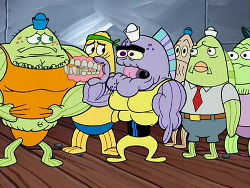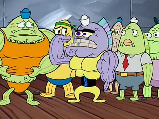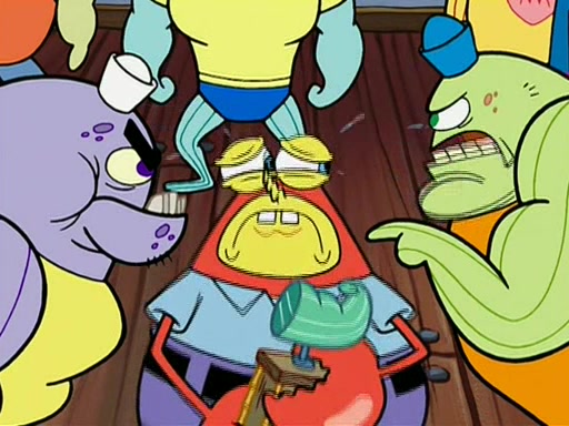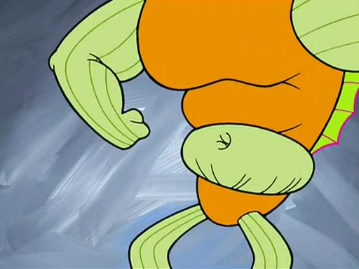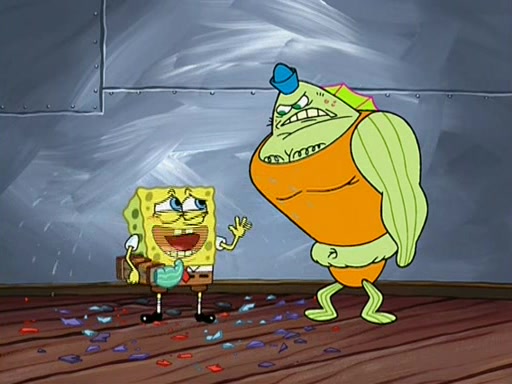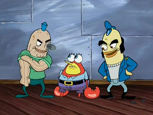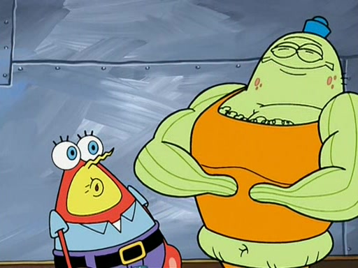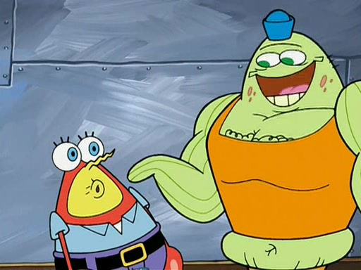 At the reunion, SpongeBob initially puts on a convincing performance, but goes onstage to accept his "Trophy of Manly Toughness," he tells a story of him jellyfishing in Jellyfish Fields, and nearly reveals his true identity before Mr. Krabs tells him to get offstage. He attempts to leave, but Torpedo-belly insists that he body-slam him to test if he still has "armor abs." When he punches SpongeBob, he flies around the room, cracking the shell and revealing SpongeBob. They get angry, but the real Mr. Krabs emerges from the bush that he had been watching from and reveals himself. He begins to walk away in shame, until Muttonchop gives him back his trophy, saying that revealing his condition was the manliest thing anyone could ever do, and revealing that they have all been hiding something as well (Torpedo-Belly, for instance, had his torpedo removed). As Mr. Krabs walks away with SpongeBob, he says "Yeah, poor suckers. At least my shell will grow back!" and they both start laughing as the episode ends.