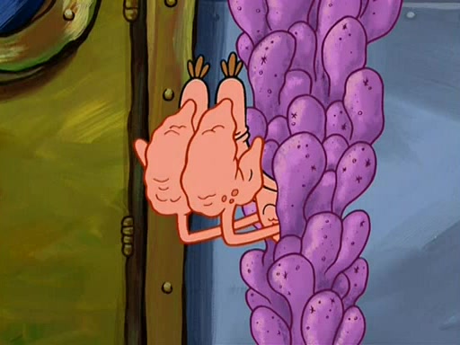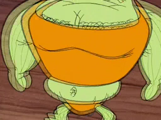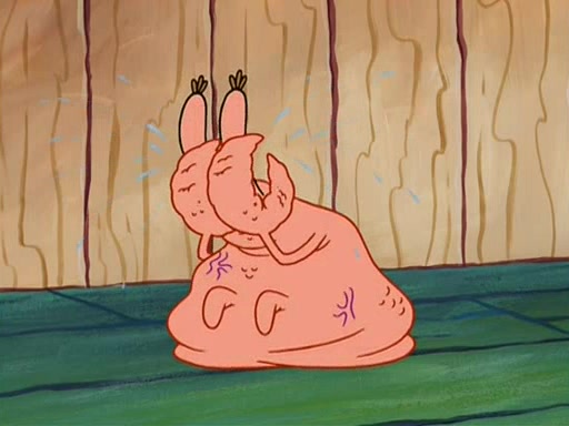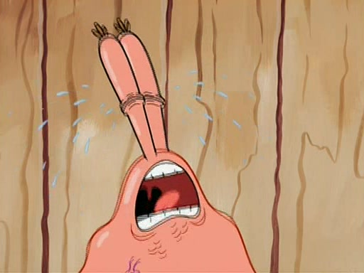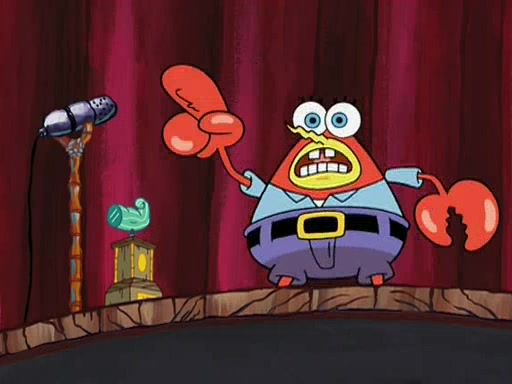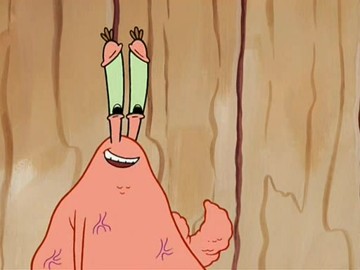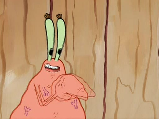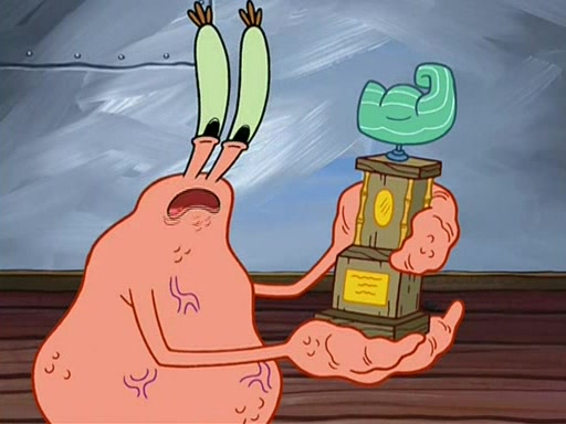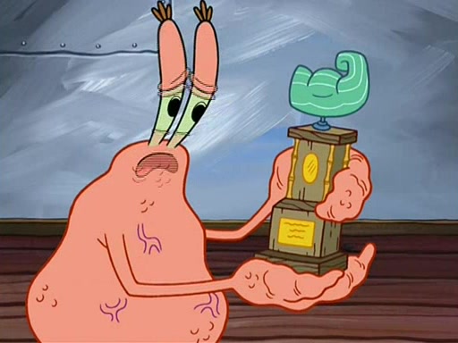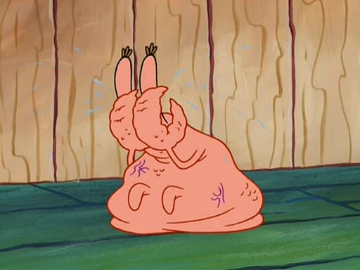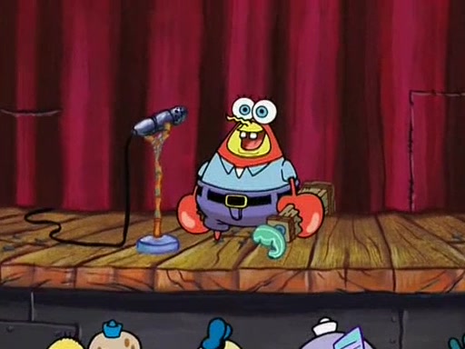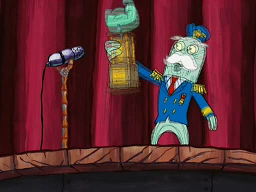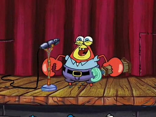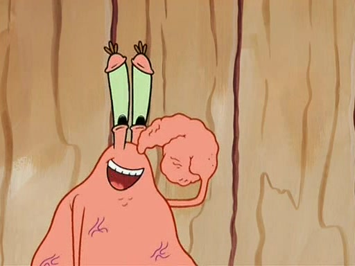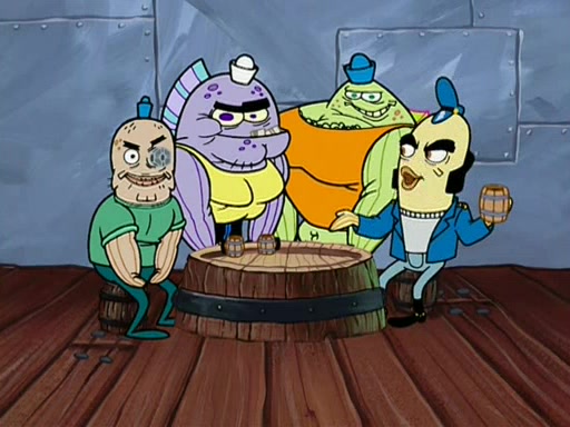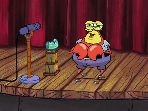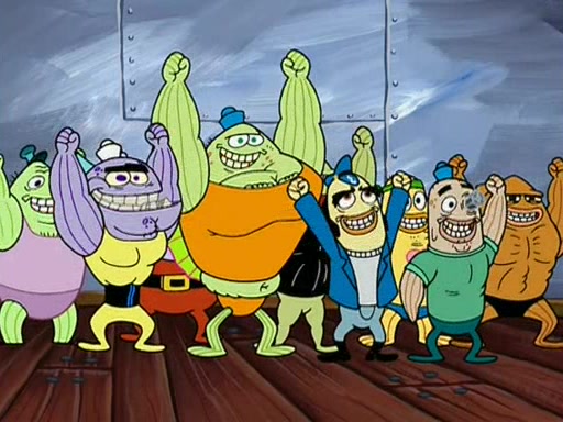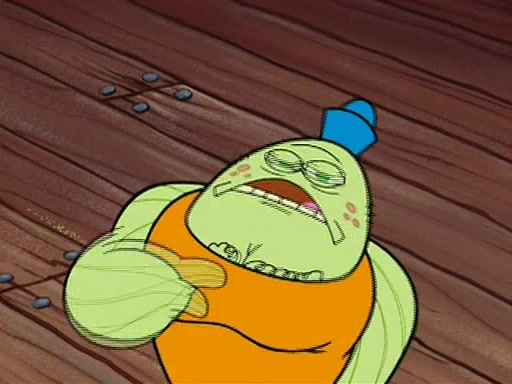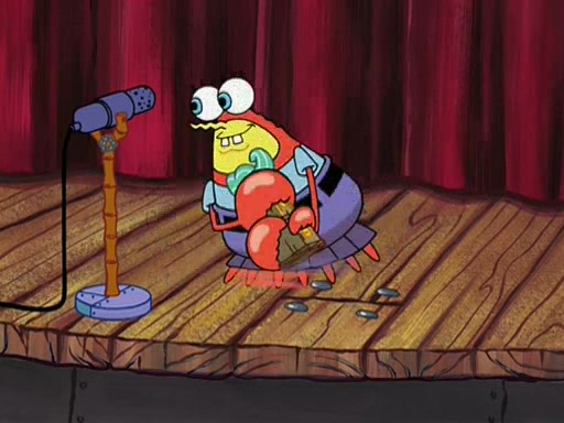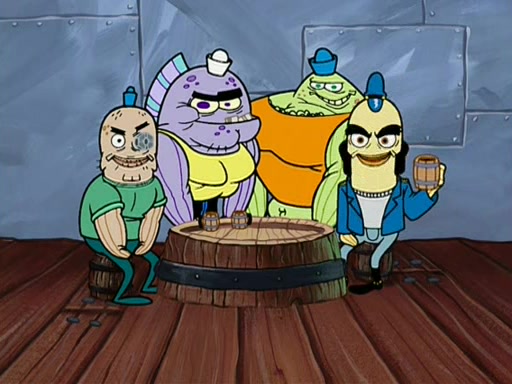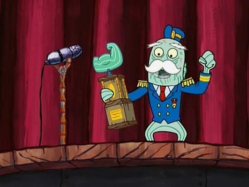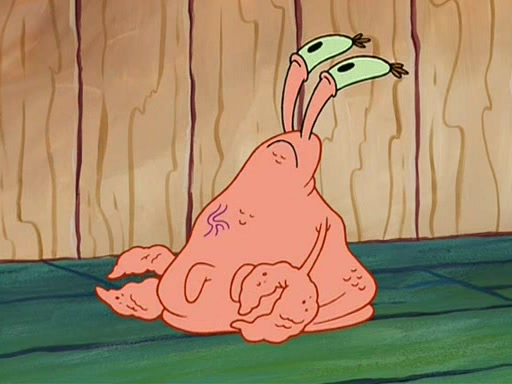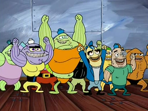 At the reunion, SpongeBob initially puts on a convincing performance, but goes onstage to accept his "Trophy of Manly Toughness," he tells a story of him jellyfishing in Jellyfish Fields, and nearly reveals his true identity before Mr. Krabs tells him to get offstage. He attempts to leave, but Torpedo-belly insists that he body-slam him to test if he still has "armor abs." When he punches SpongeBob, he flies around the room, cracking the shell and revealing SpongeBob. They get angry, but the real Mr. Krabs emerges from the bush that he had been watching from and reveals himself. He begins to walk away in shame, until Muttonchop gives him back his trophy, saying that revealing his condition was the manliest thing anyone could ever do, and revealing that they have all been hiding something as well (Torpedo-Belly, for instance, had his torpedo removed). As Mr. Krabs walks away with SpongeBob, he says "Yeah, poor suckers. At least my shell will grow back!" and they both start laughing as the episode ends.
