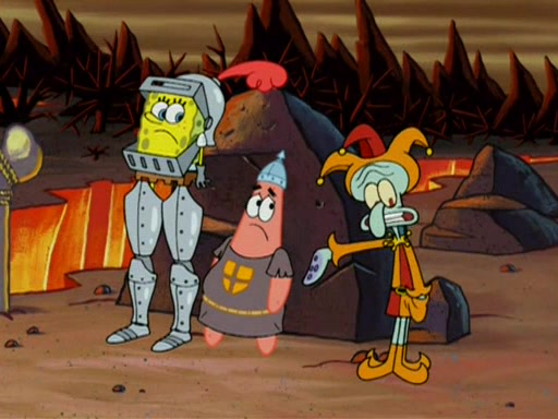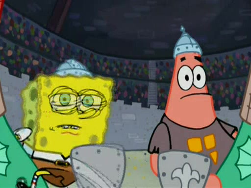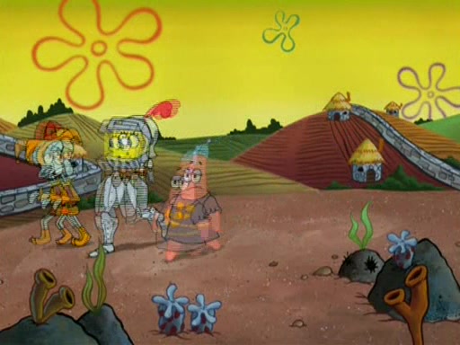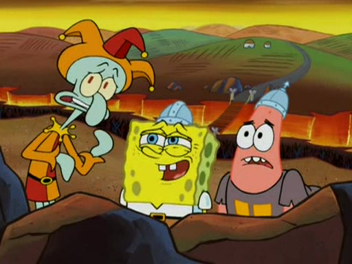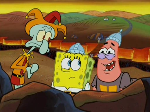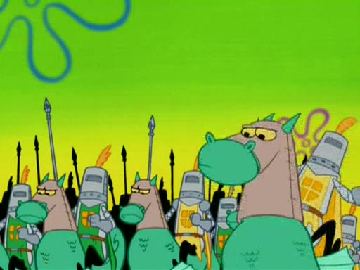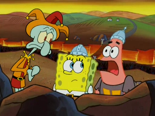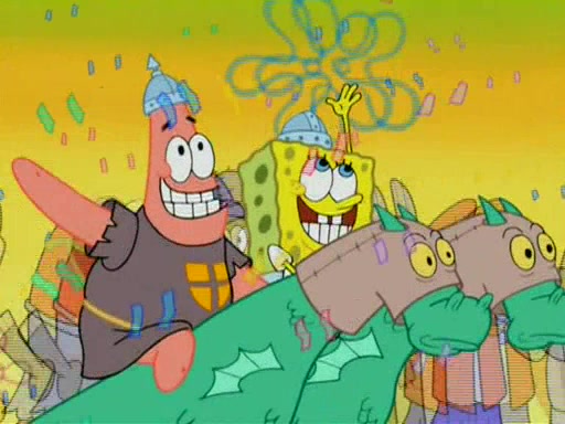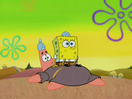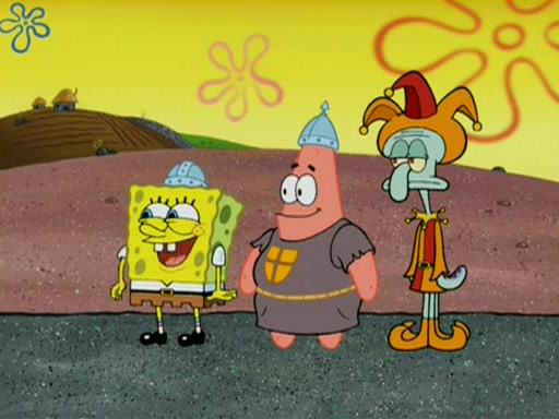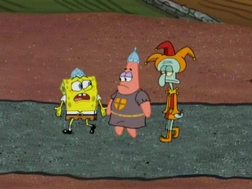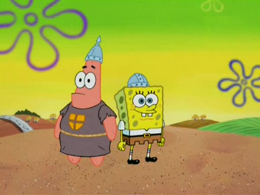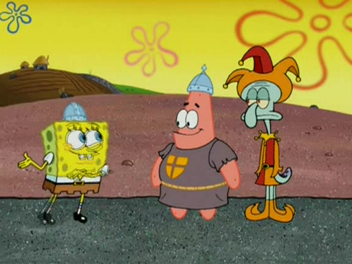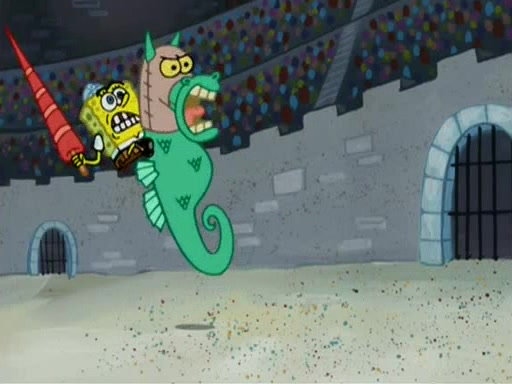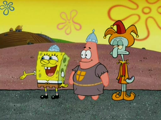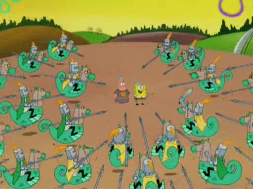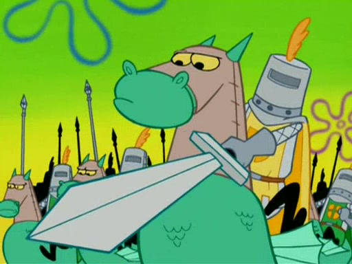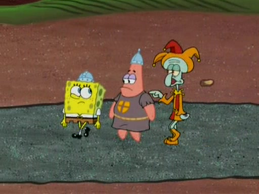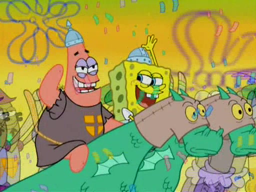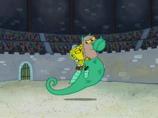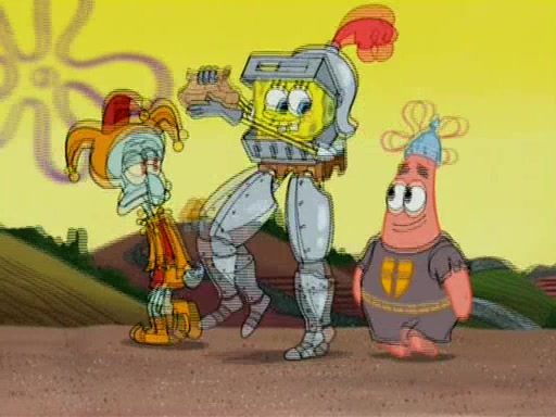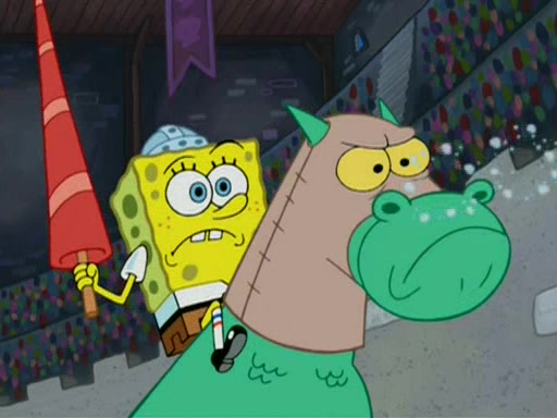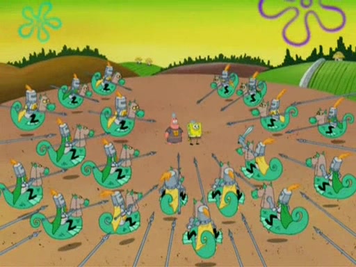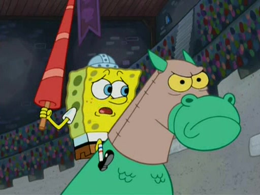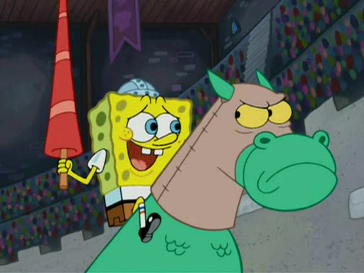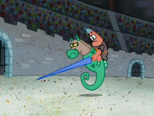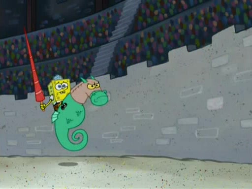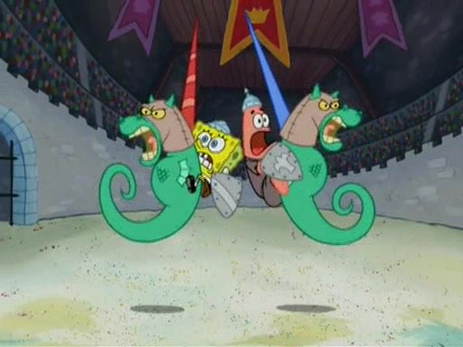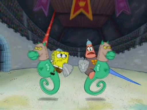 Unaware that they are actually going to be in the tournament, and not just watching upclose, they are forced to mount seahorses and start jousting against each other. They are both launched off of their seahorses into the air, and land in a small field in 8th Century Bikini Bottom.