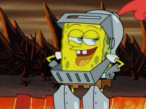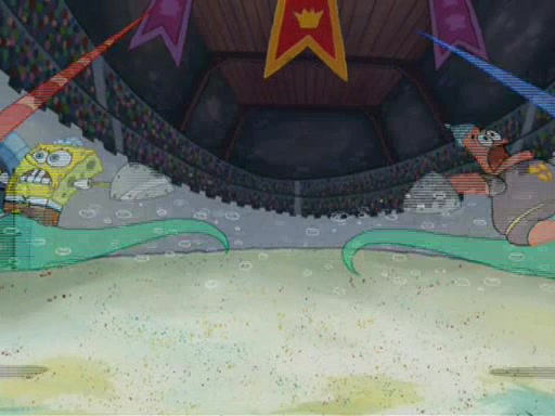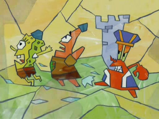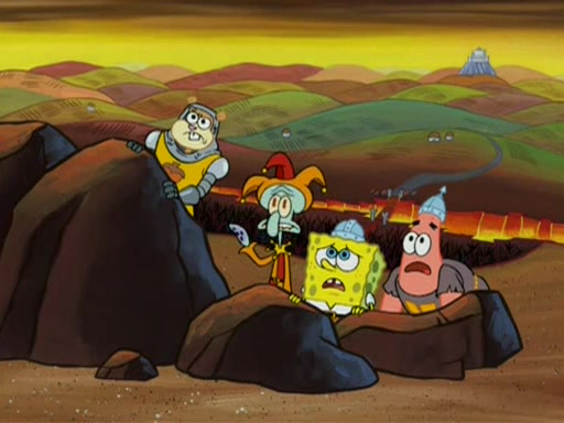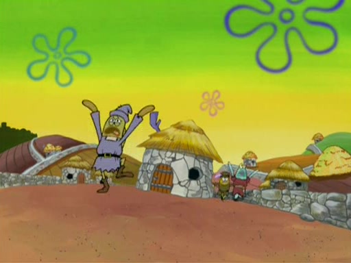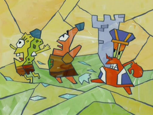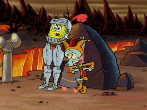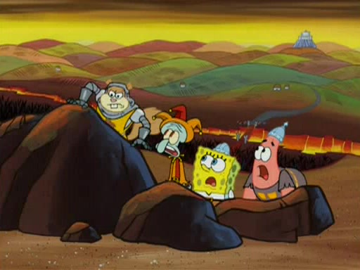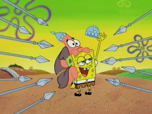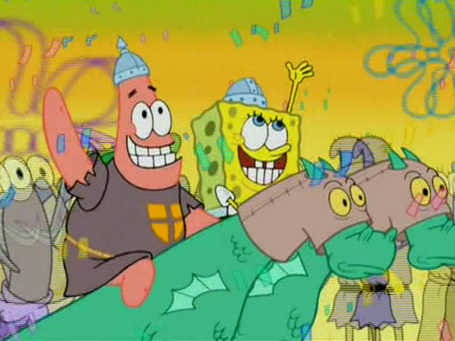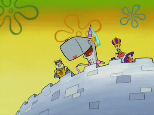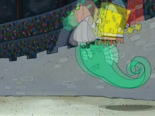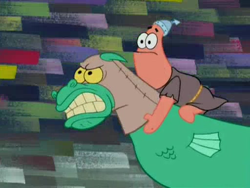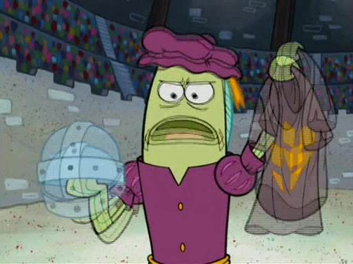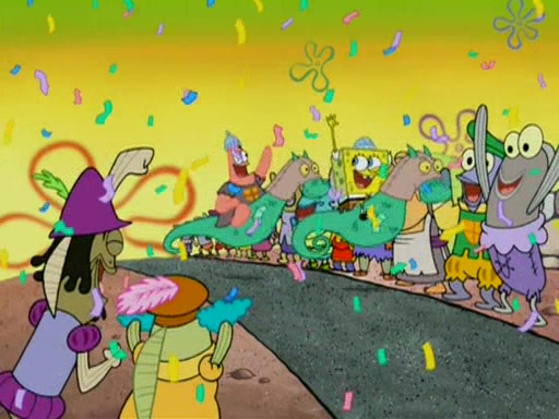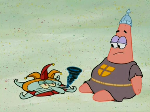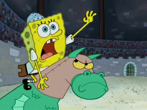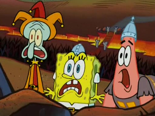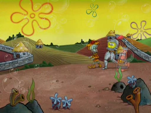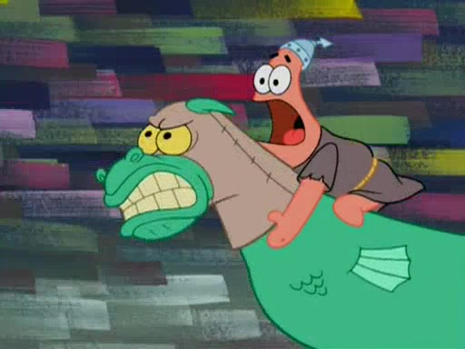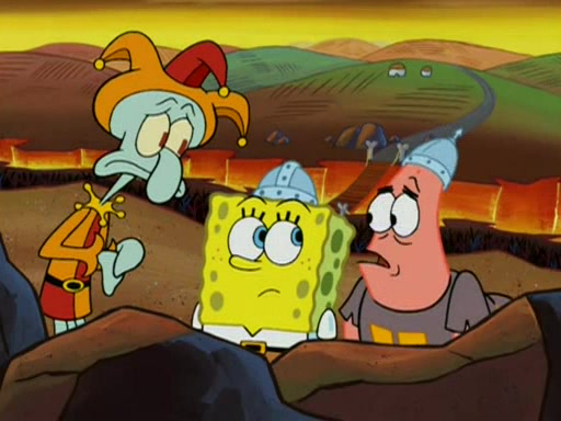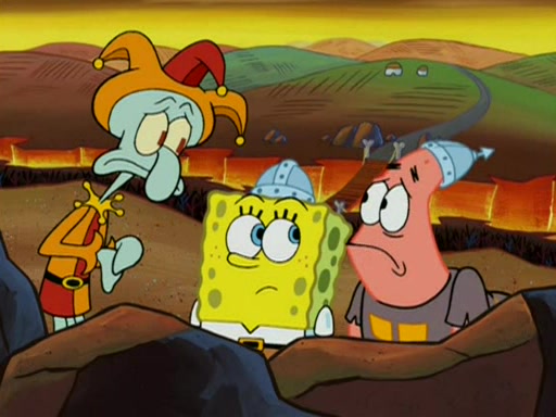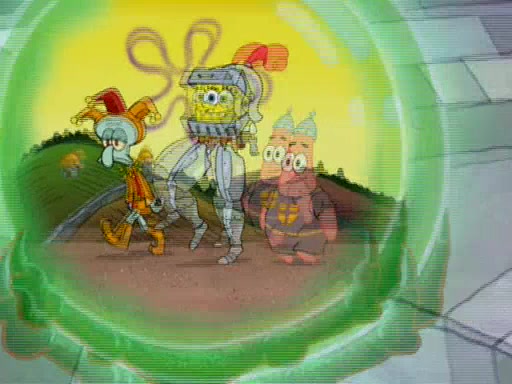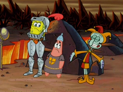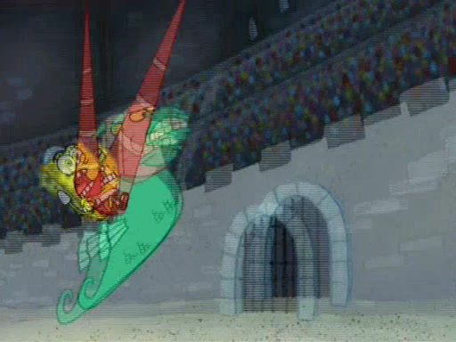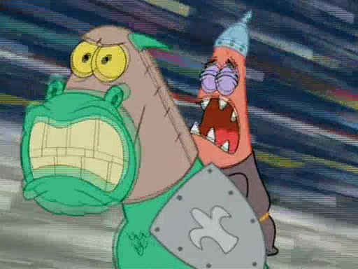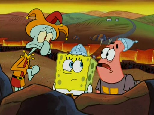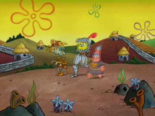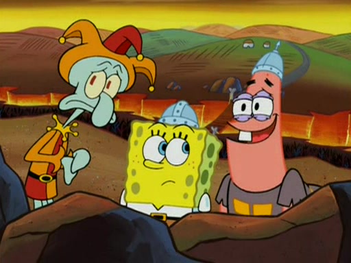 Unaware that they are actually going to be in the tournament, and not just watching upclose, they are forced to mount seahorses and start jousting against each other. They are both launched off of their seahorses into the air, and land in a small field in 8th Century Bikini Bottom.