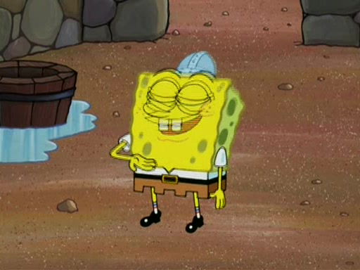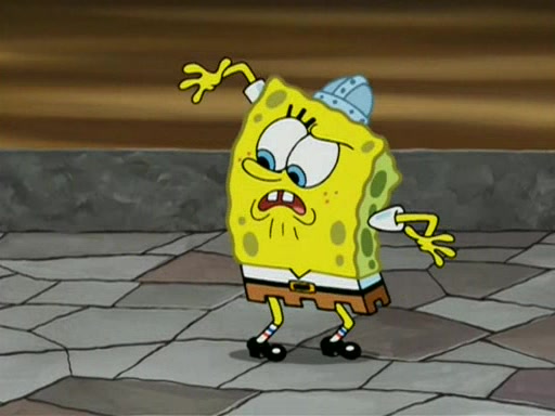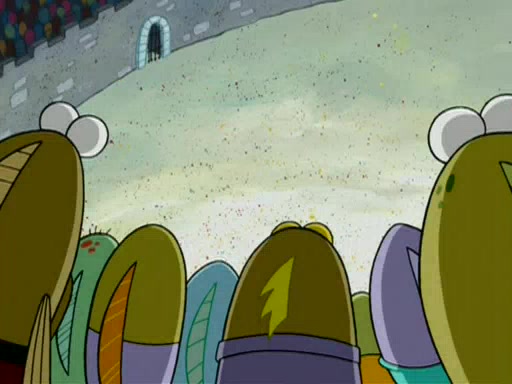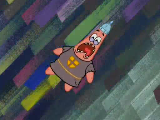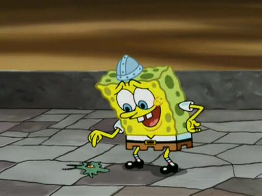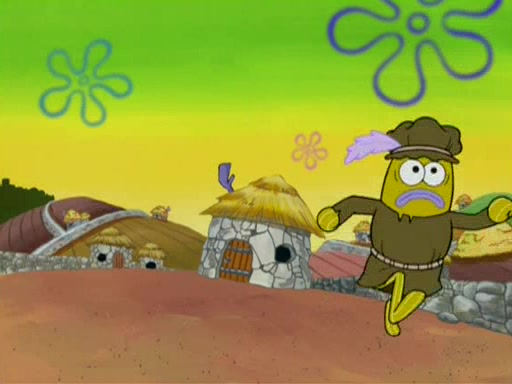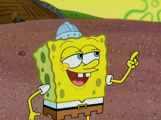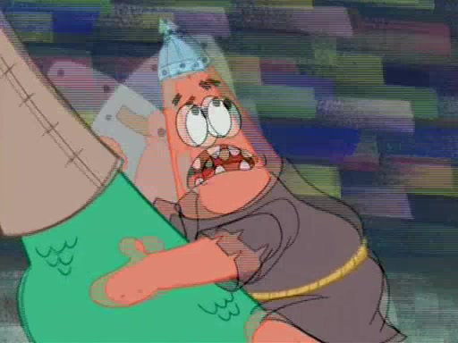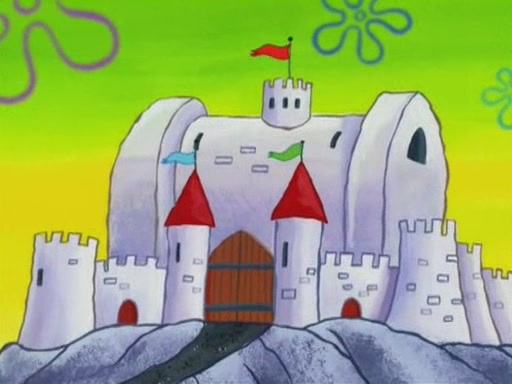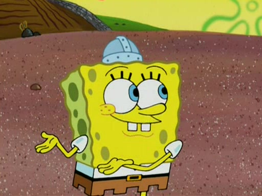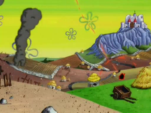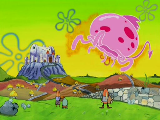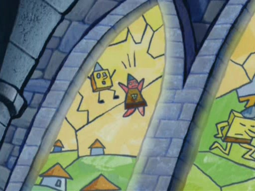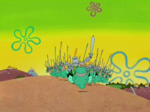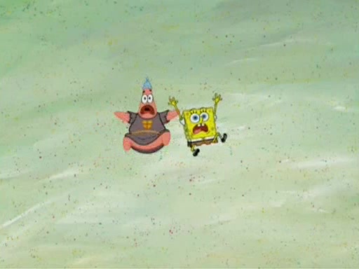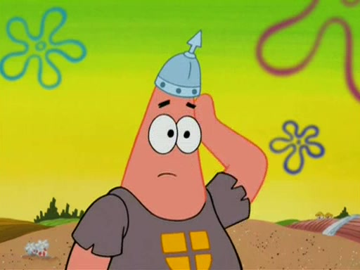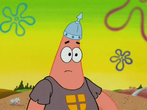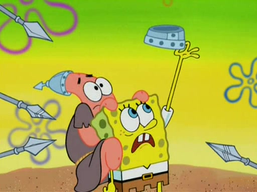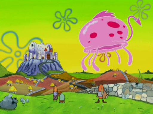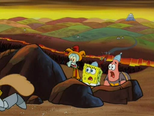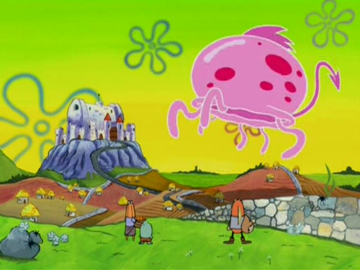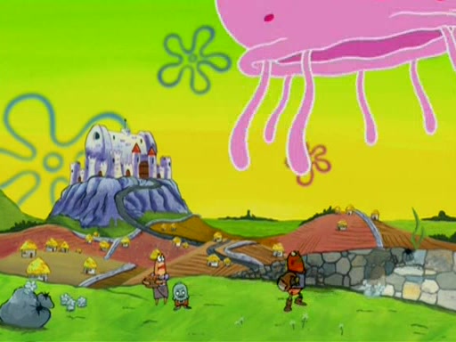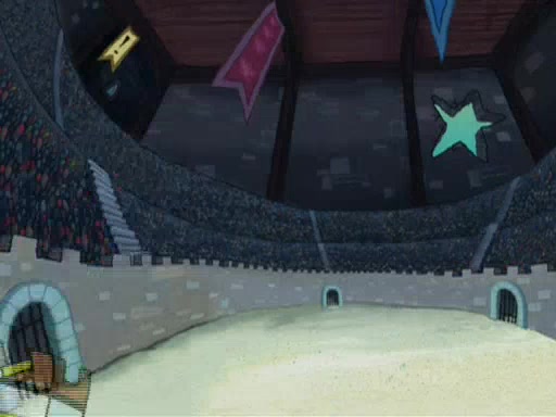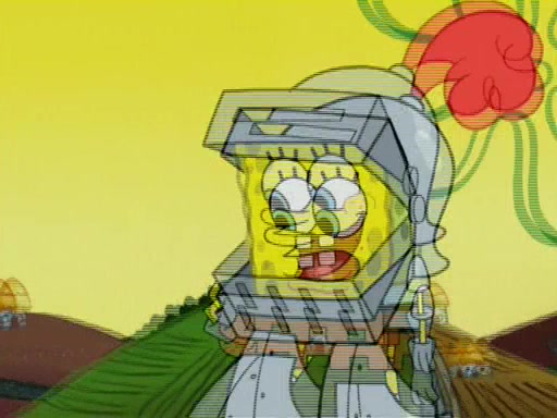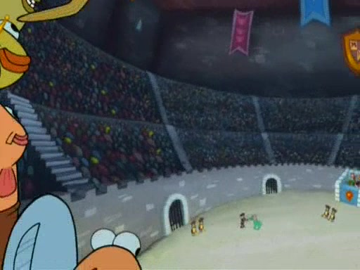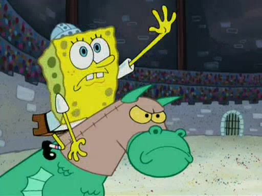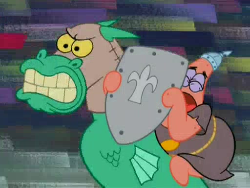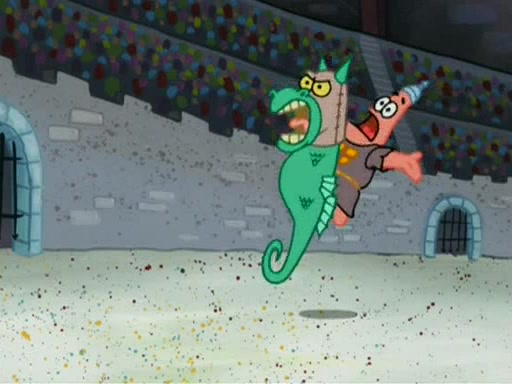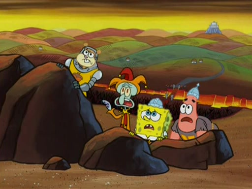 Unaware that they are actually going to be in the tournament, and not just watching upclose, they are forced to mount seahorses and start jousting against each other. They are both launched off of their seahorses into the air, and land in a small field in 8th Century Bikini Bottom.