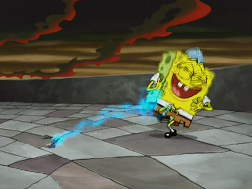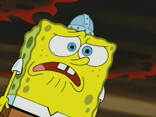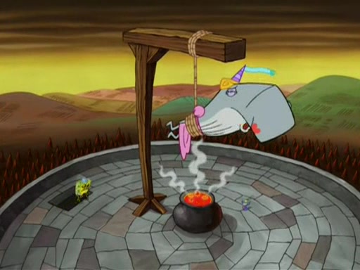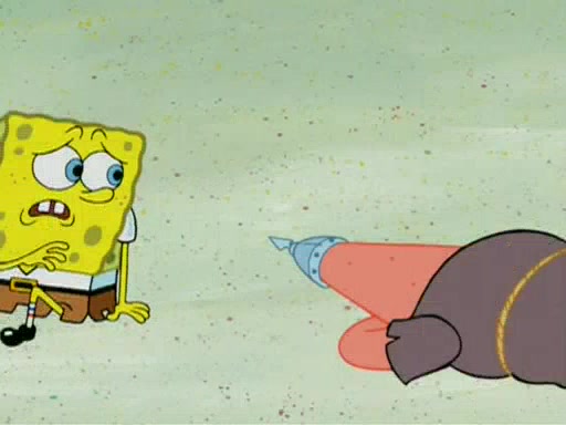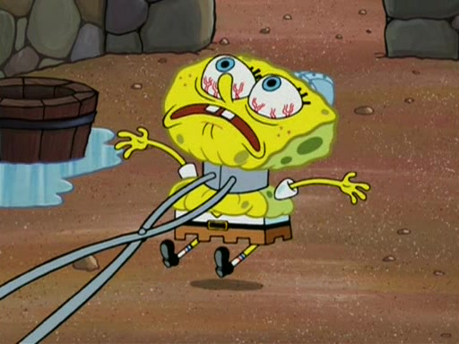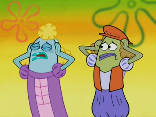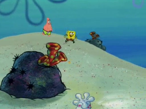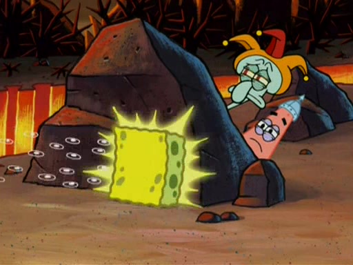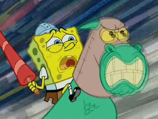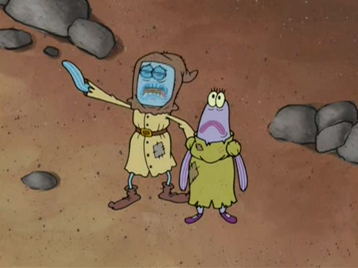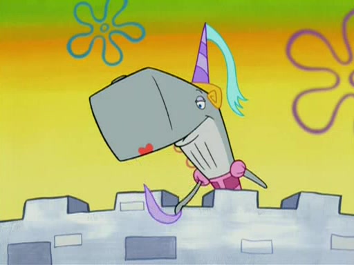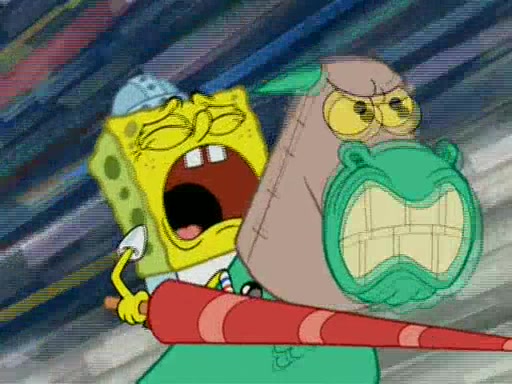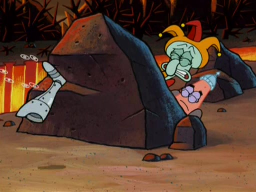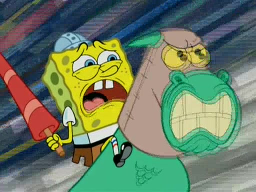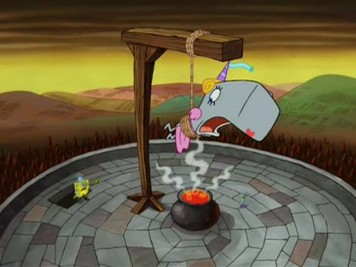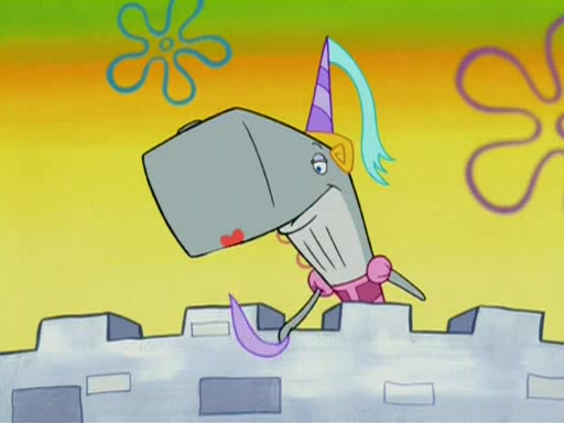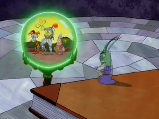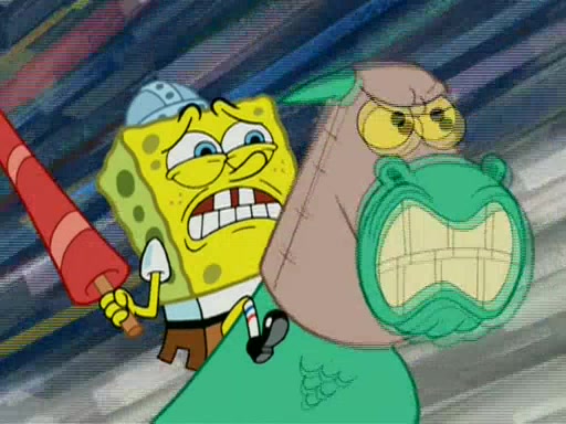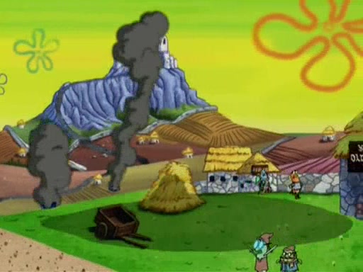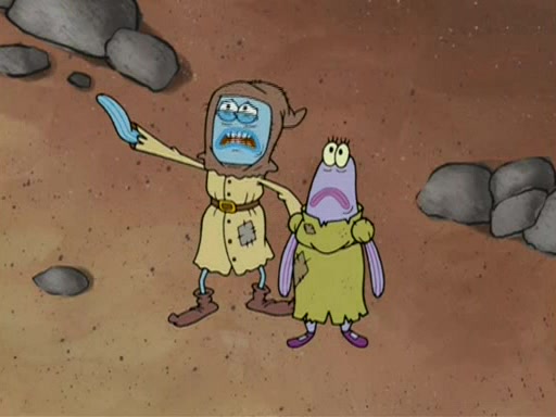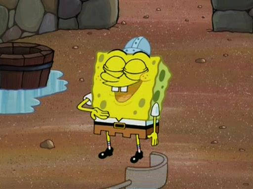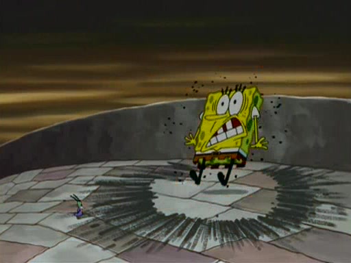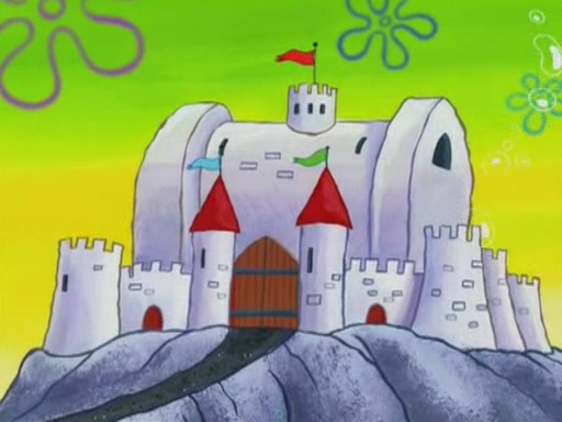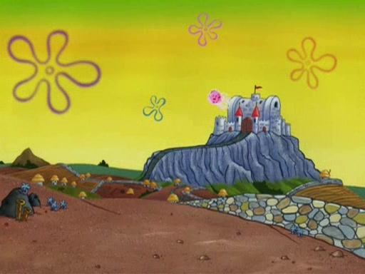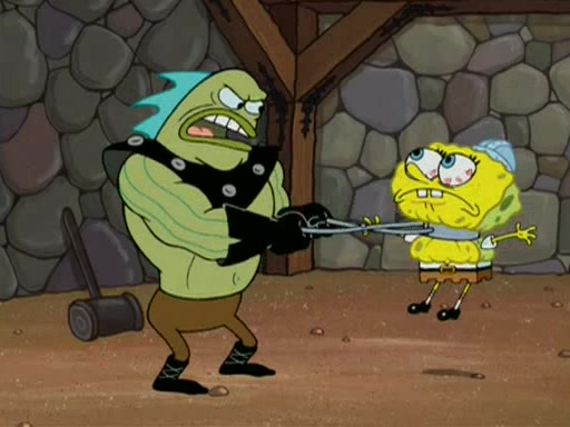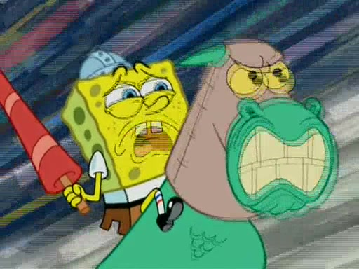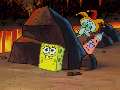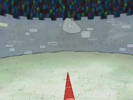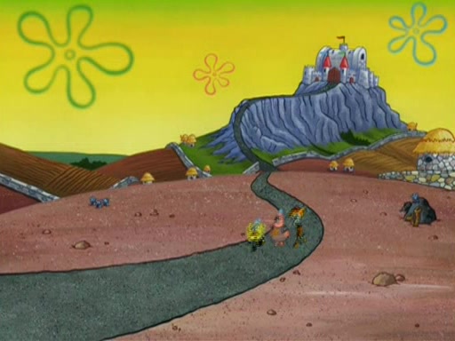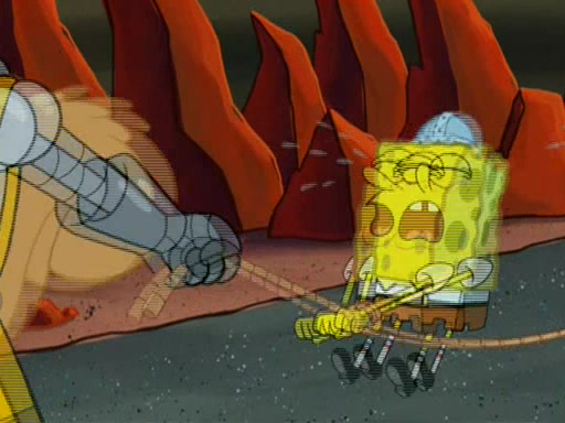 Unaware that they are actually going to be in the tournament, and not just watching upclose, they are forced to mount seahorses and start jousting against each other. They are both launched off of their seahorses into the air, and land in a small field in 8th Century Bikini Bottom.