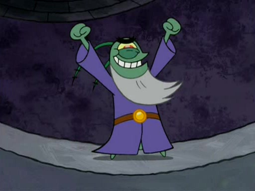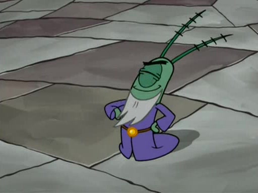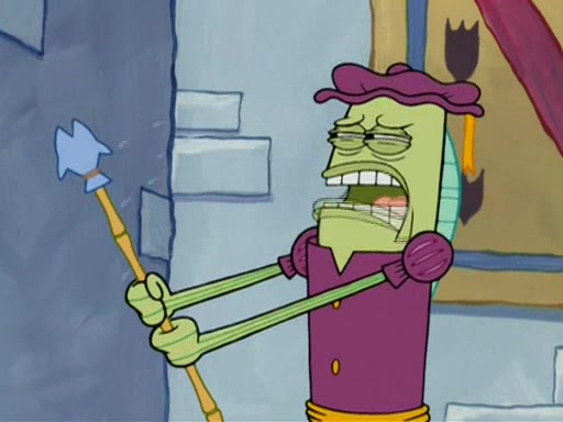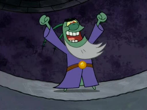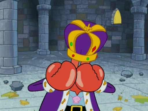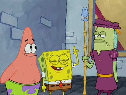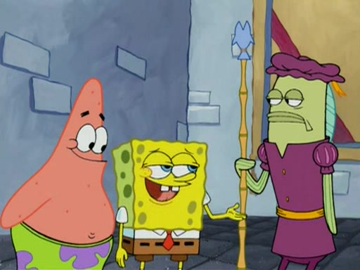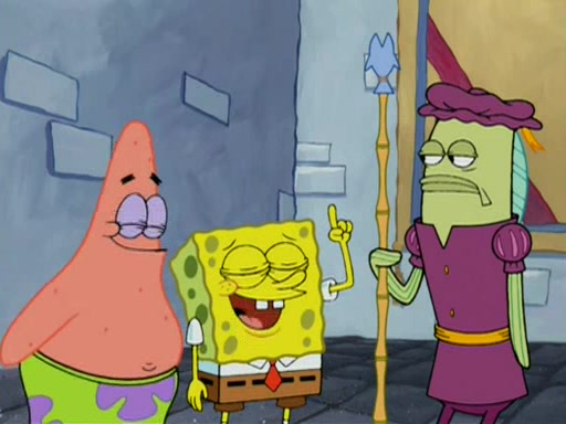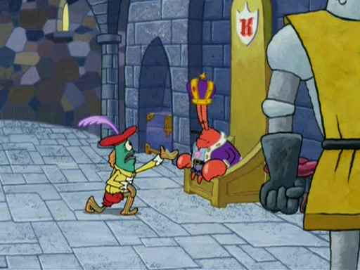 He tells them to defeat the dragon, then proceeds to kick them out. However, SpongeBob and Patrick decide to literally kick themselves out, and Squidly comes along as well after orders from King Krabs.