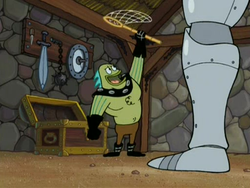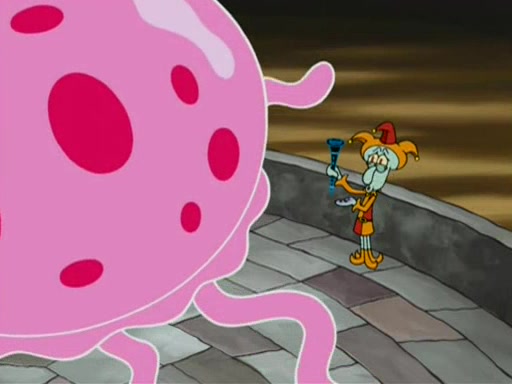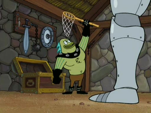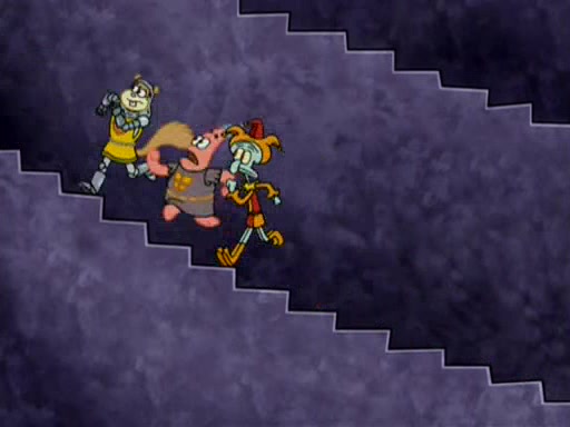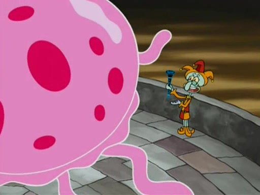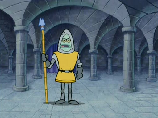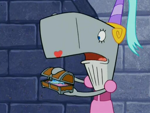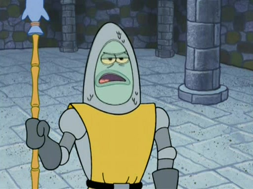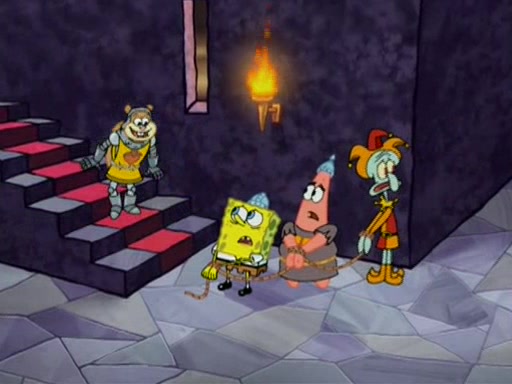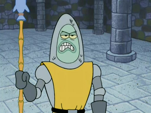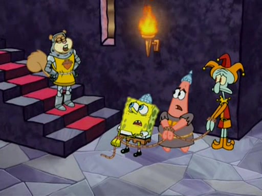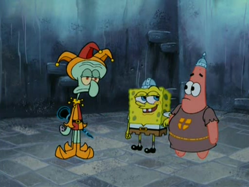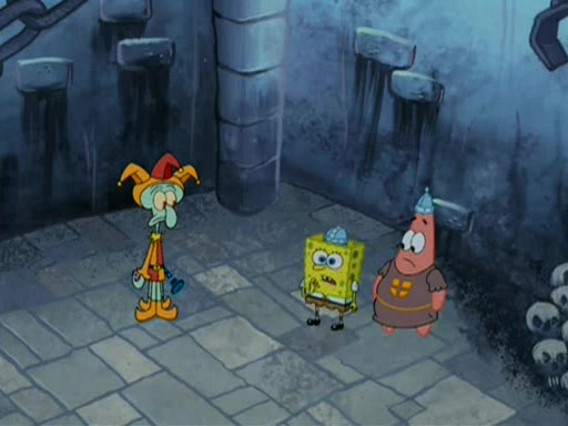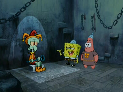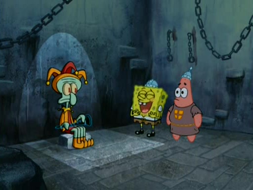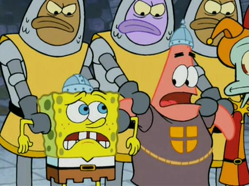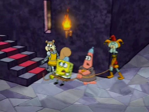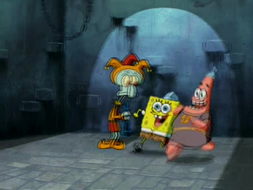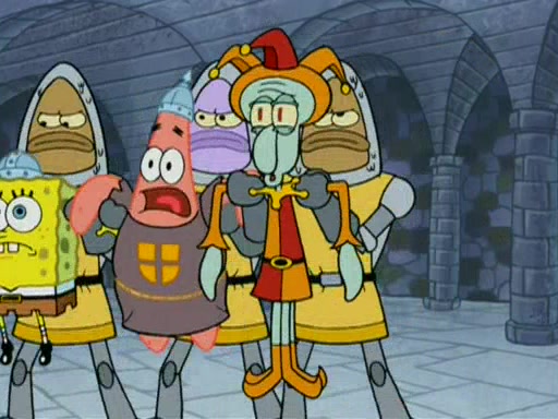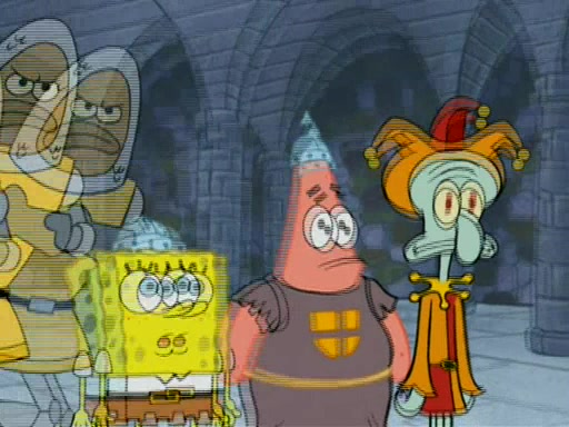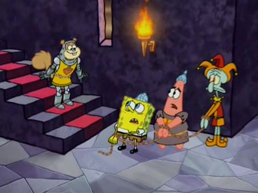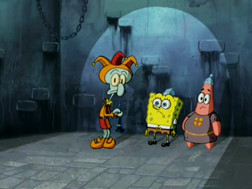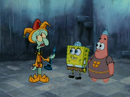 A large group of knights on seahorses surround the duo. They lock SpongeBob and Patrick in the dungeons because they think they are evil. There they see a squid playing a clarinet. They think it is Squidward, but the octopus' name is actually Squidly.