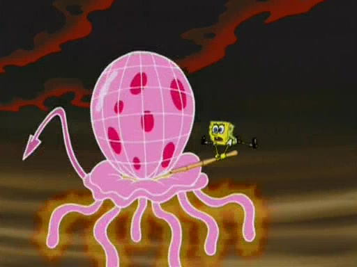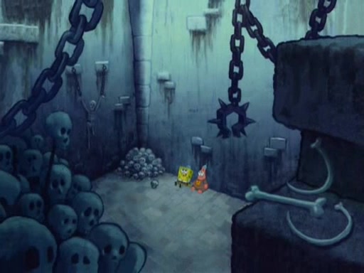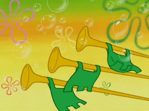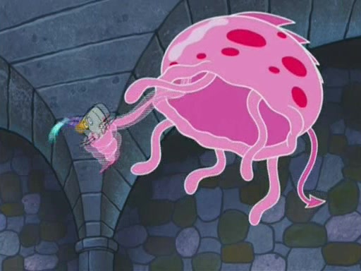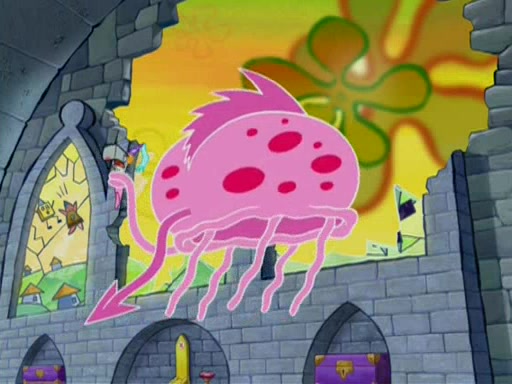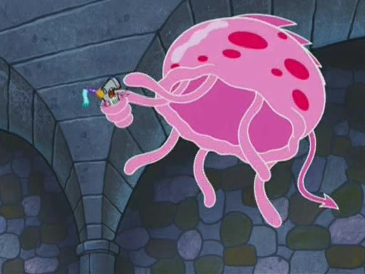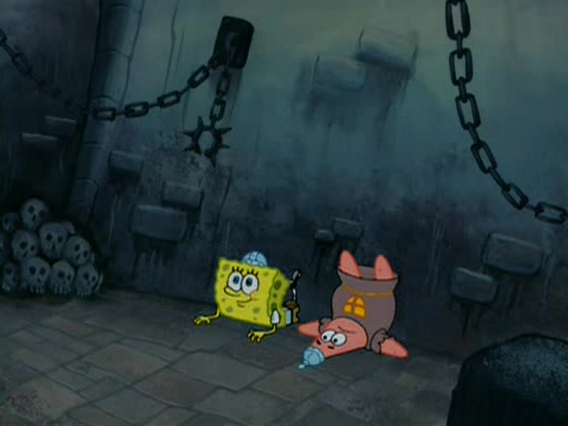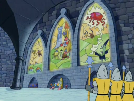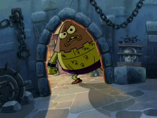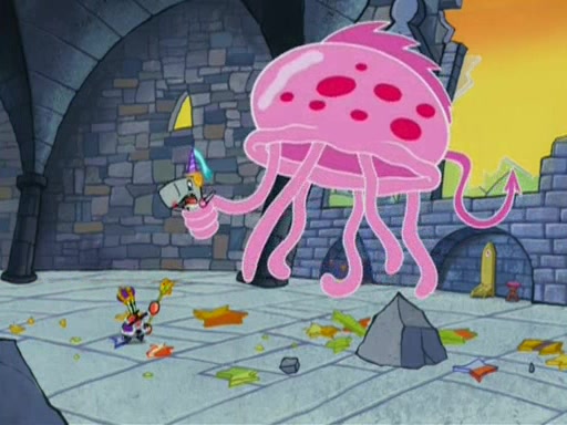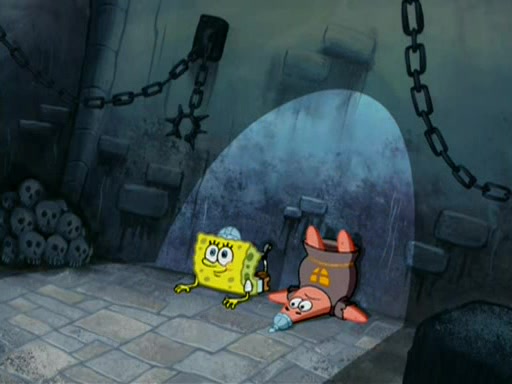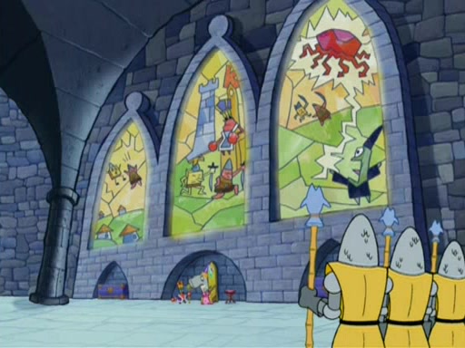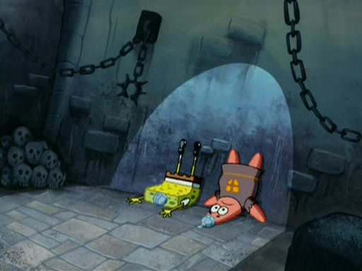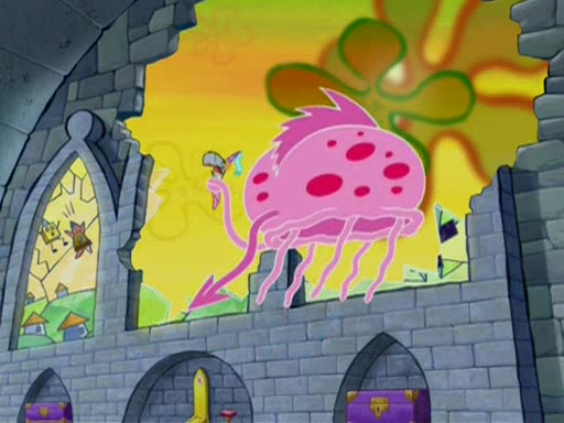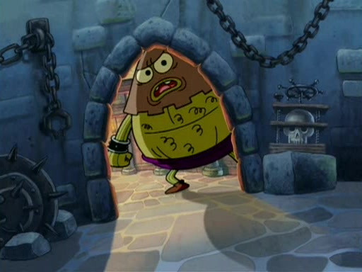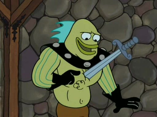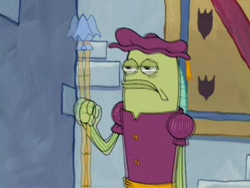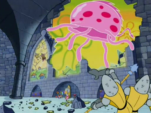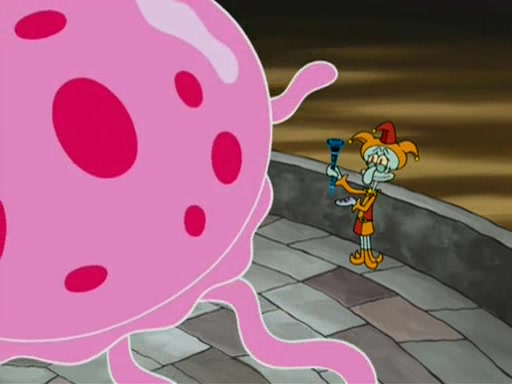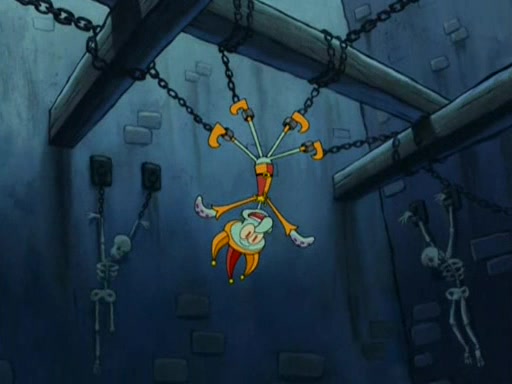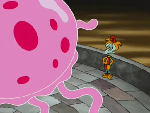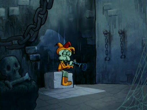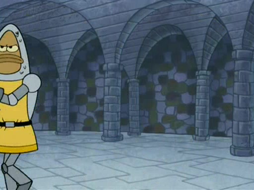A large group of knights on seahorses surround the duo. They lock SpongeBob and Patrick in the dungeons because they think they are evil. There they see a squid playing a clarinet. They think it is Squidward, but the octopus' name is actually Squidly.