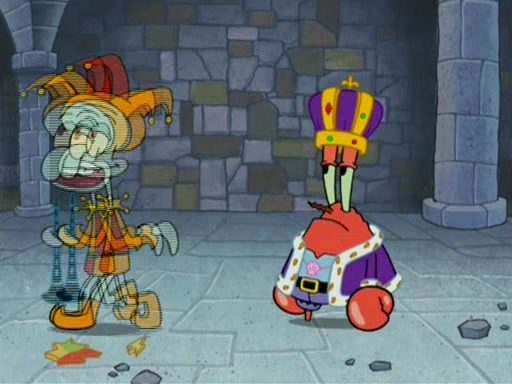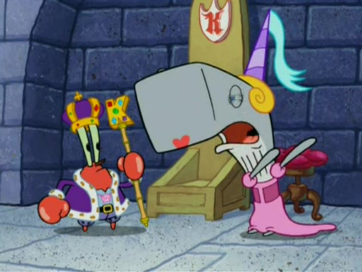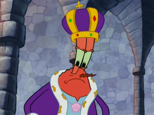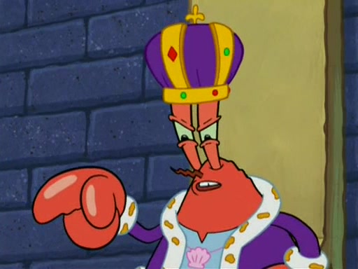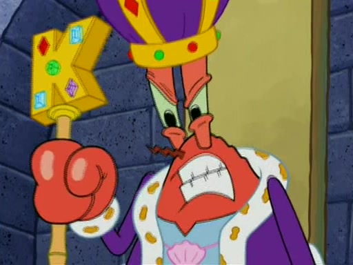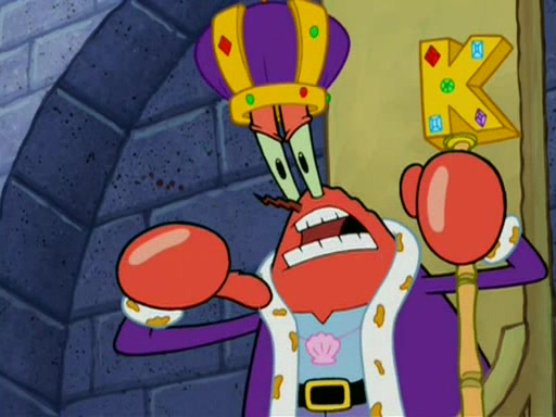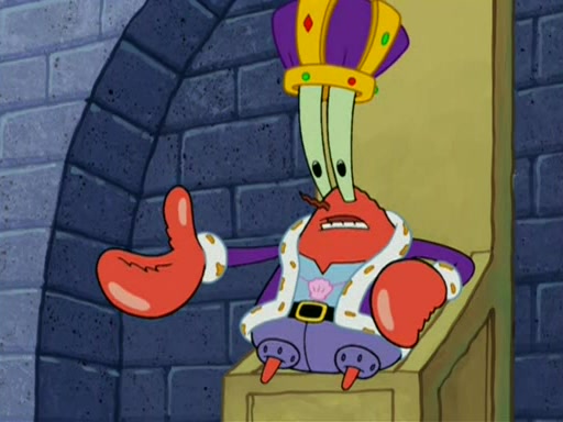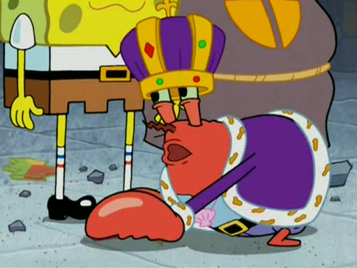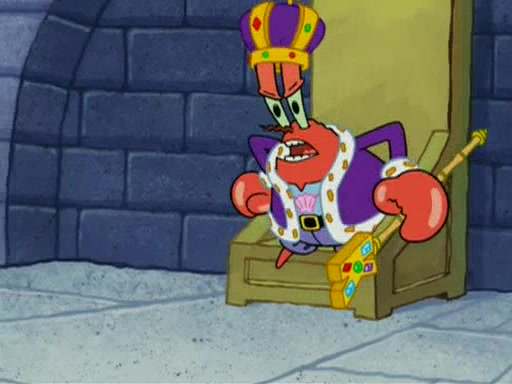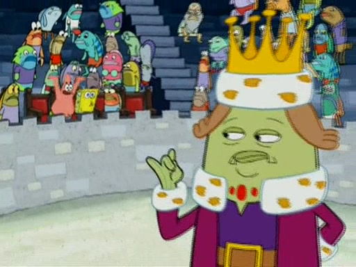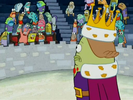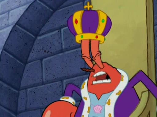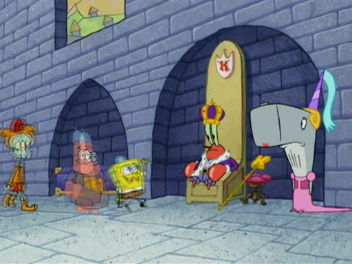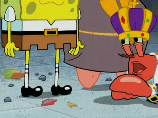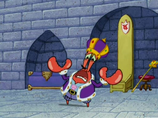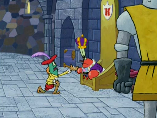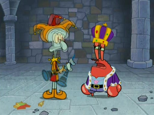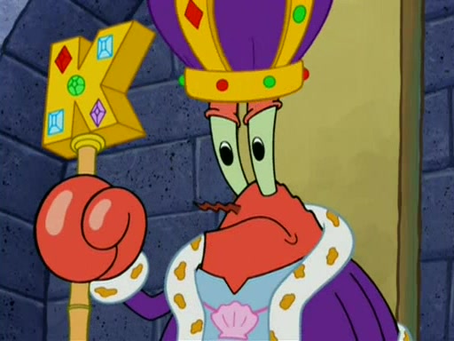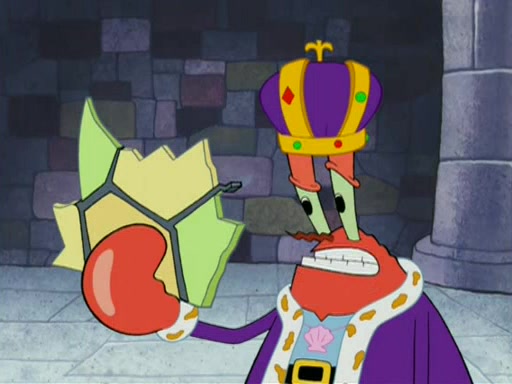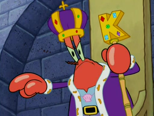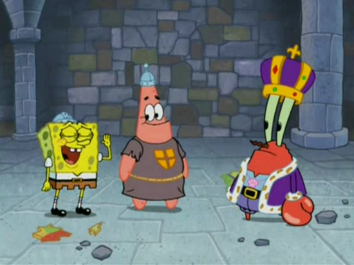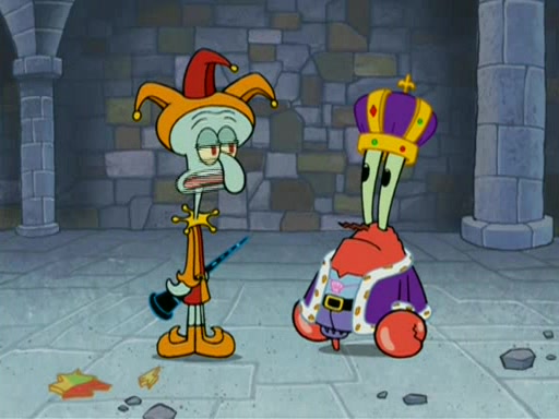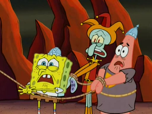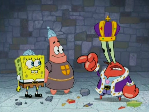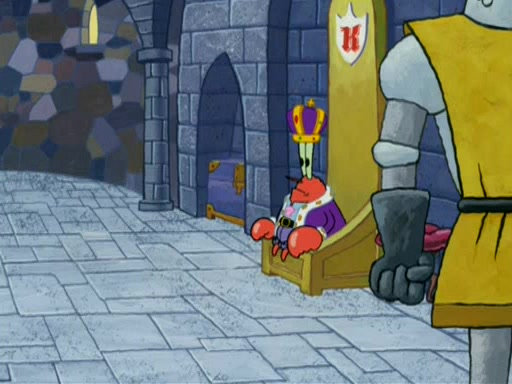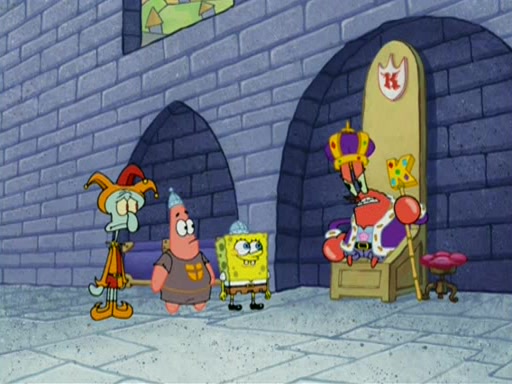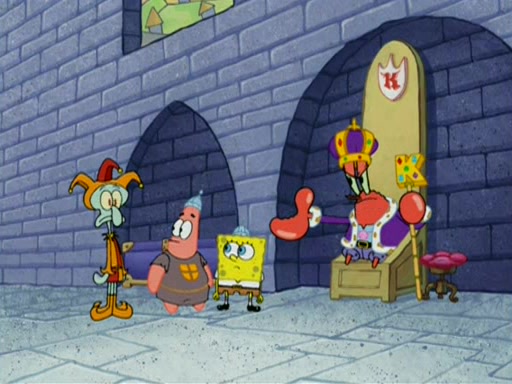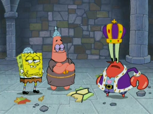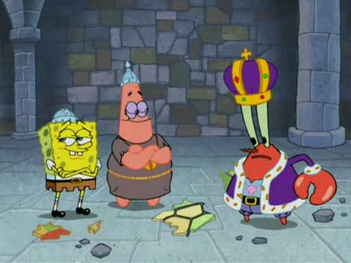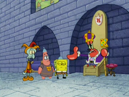 SpongeBob still thinks they are in the restaurant, and comments on how authentic the "props" are. Later, SpongeBob, Patrick, and Squidly are sent to King Krabs, who orders them to be executed because of an insulting song they sing in front of him.