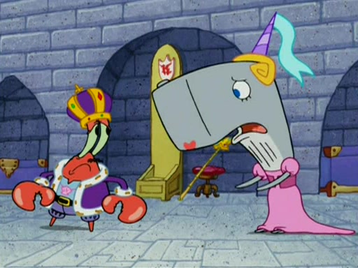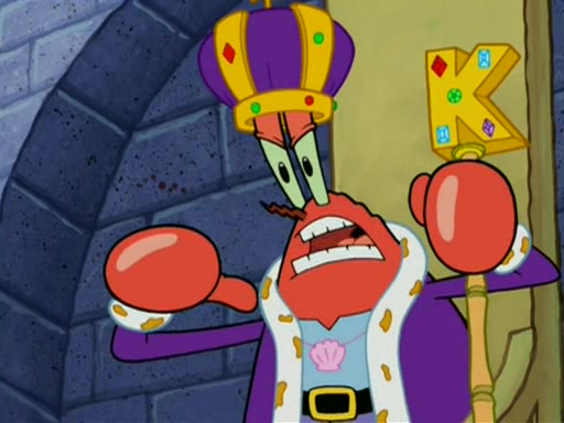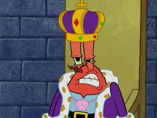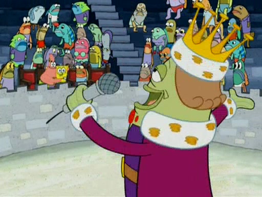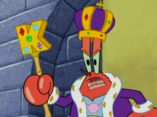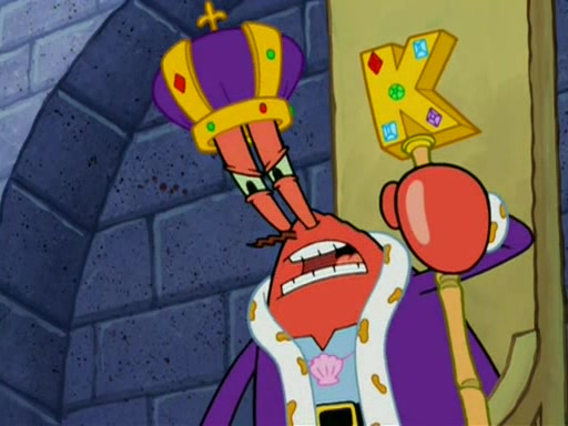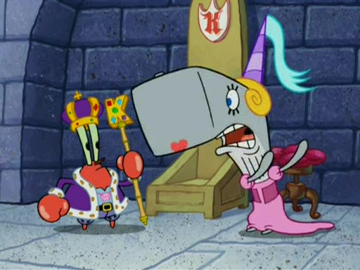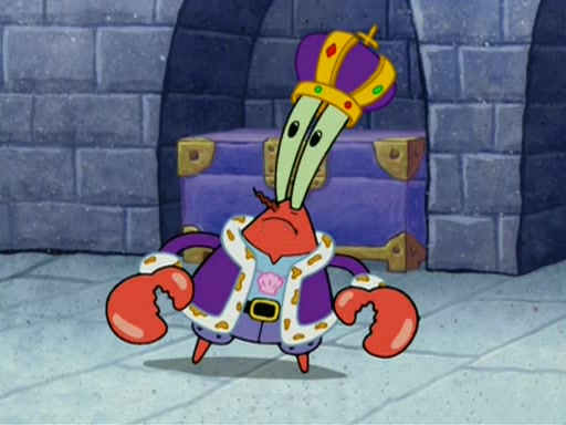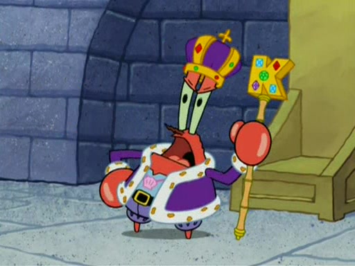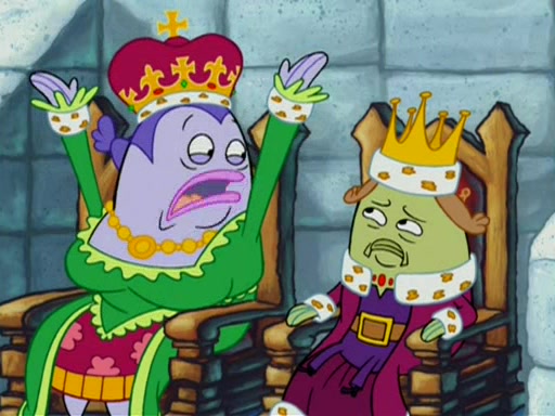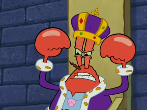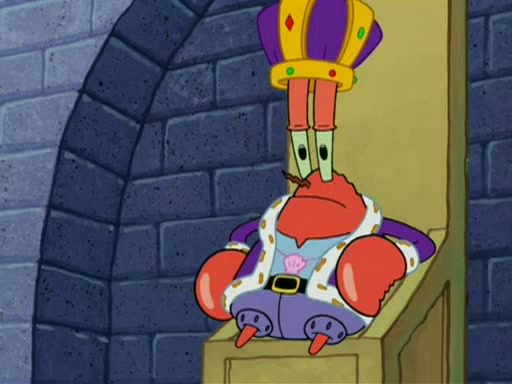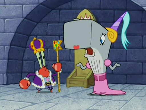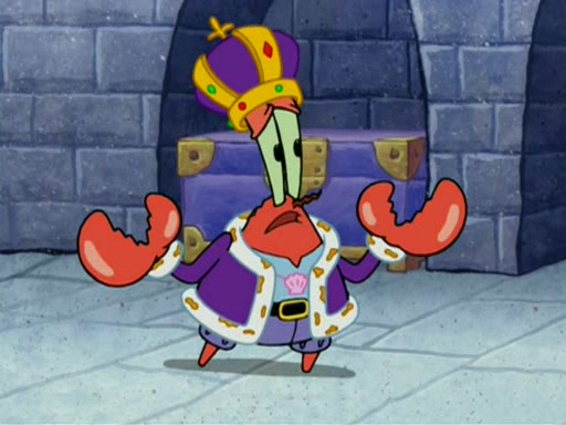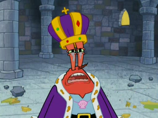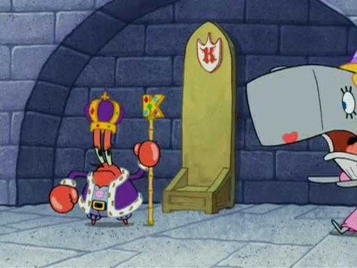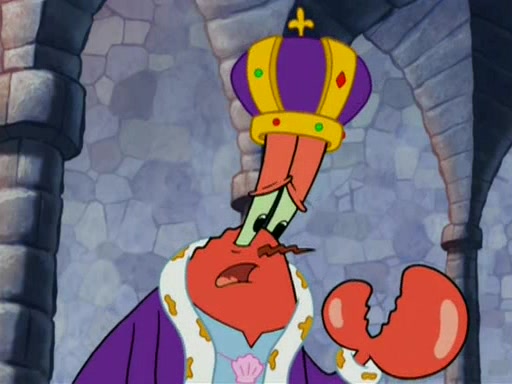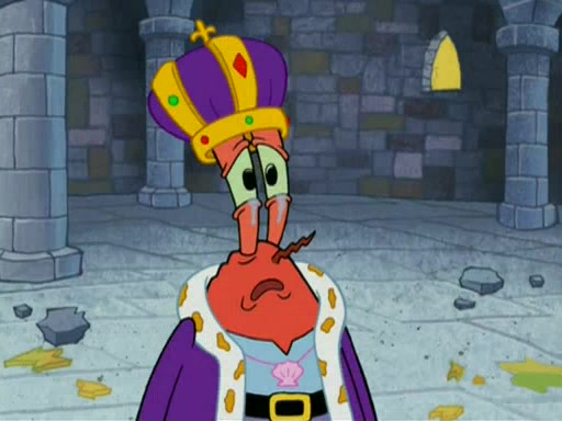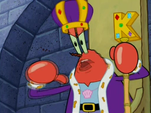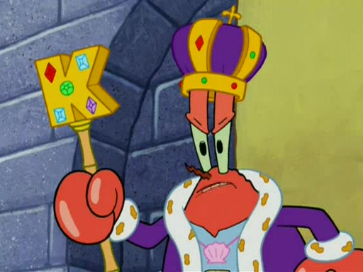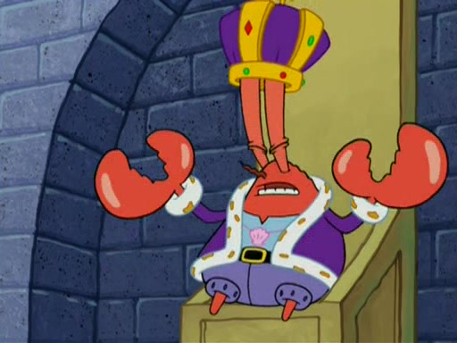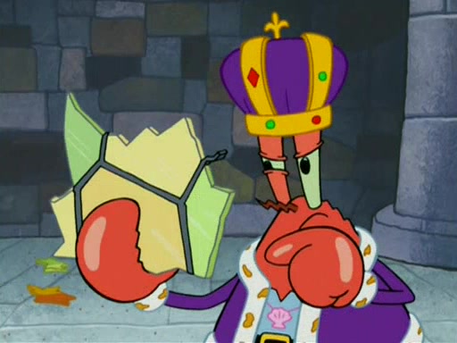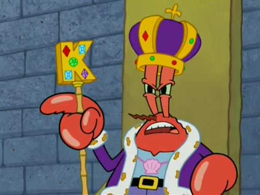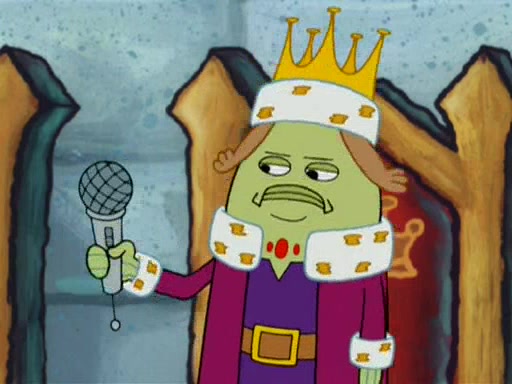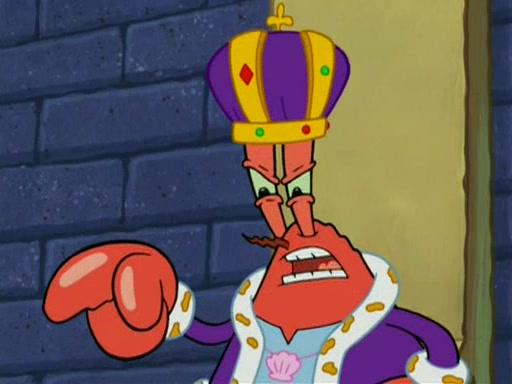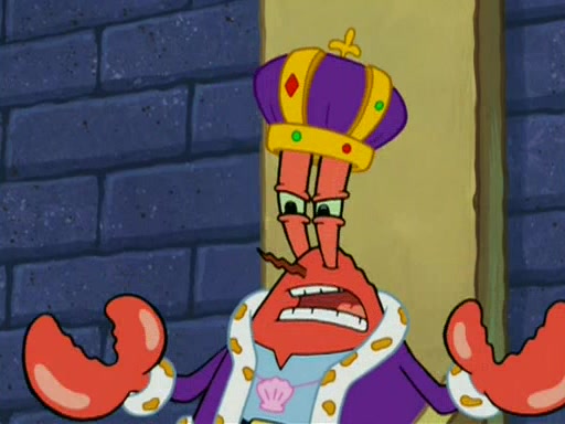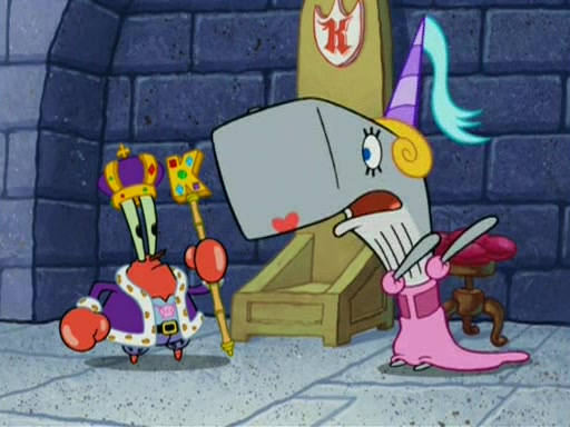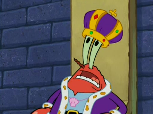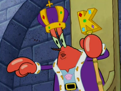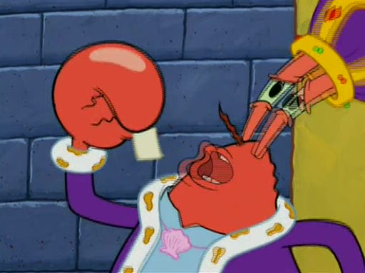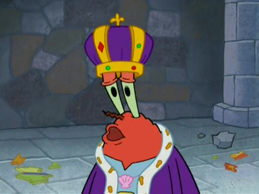 SpongeBob still thinks they are in the restaurant, and comments on how authentic the "props" are. Later, SpongeBob, Patrick, and Squidly are sent to King Krabs, who orders them to be executed because of an insulting song they sing in front of him.