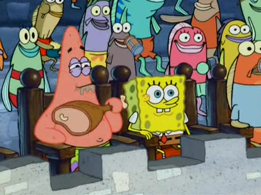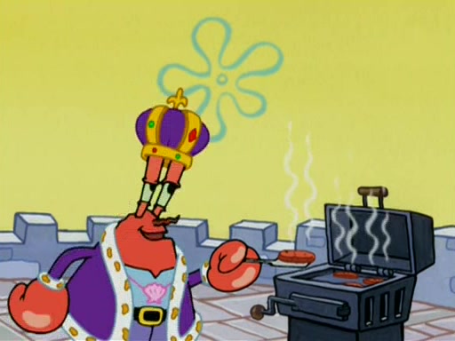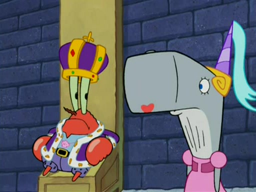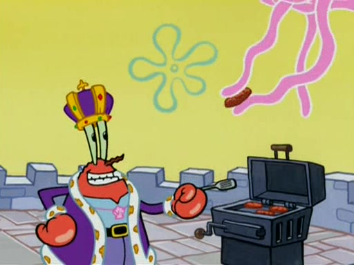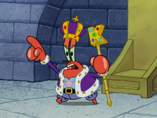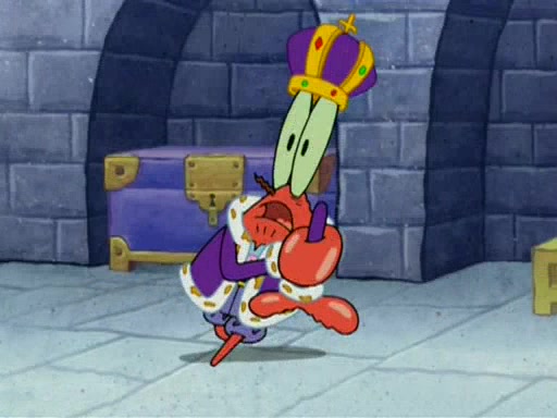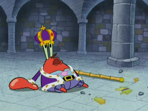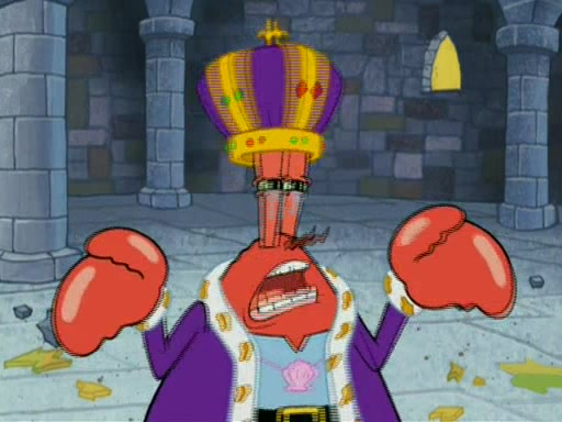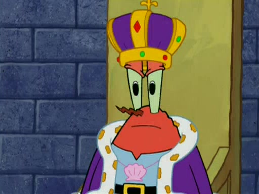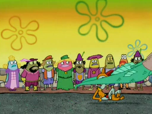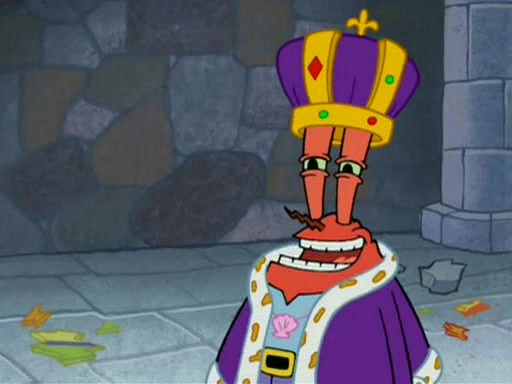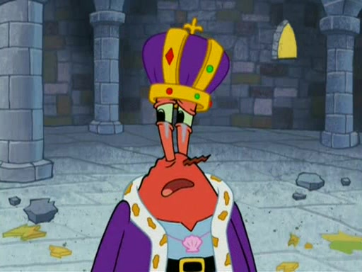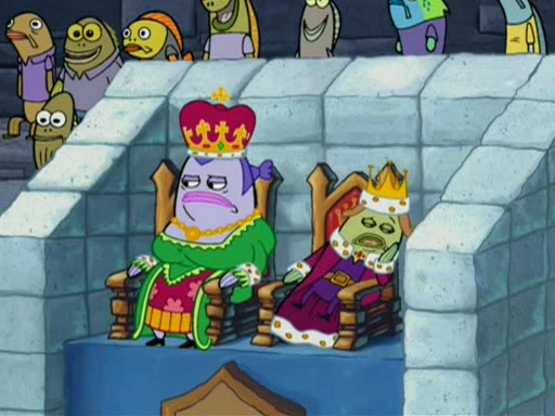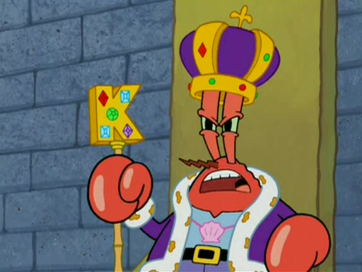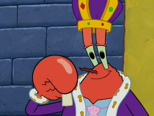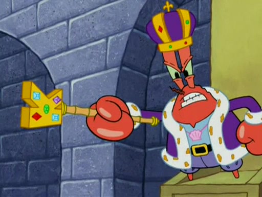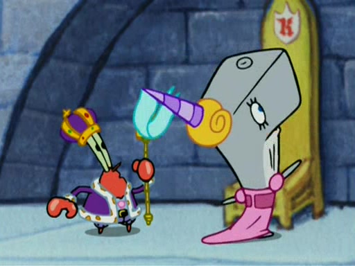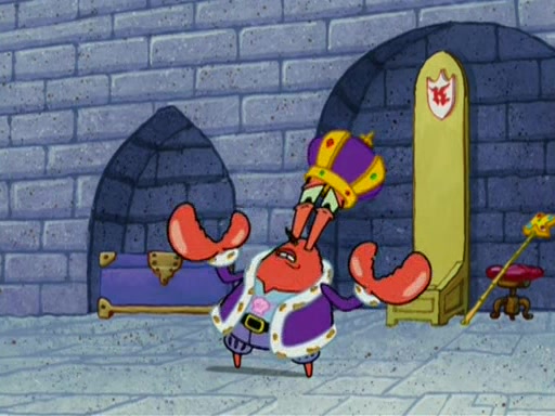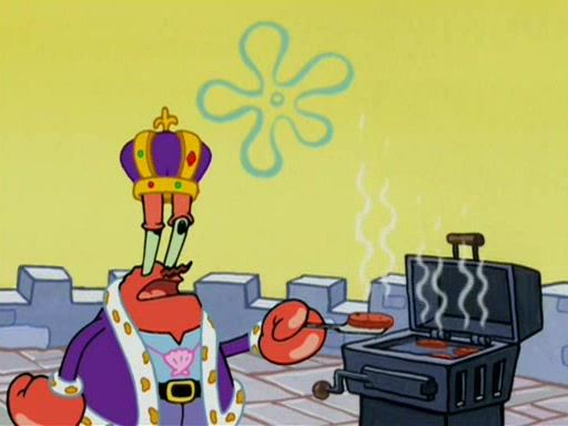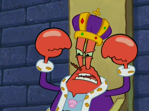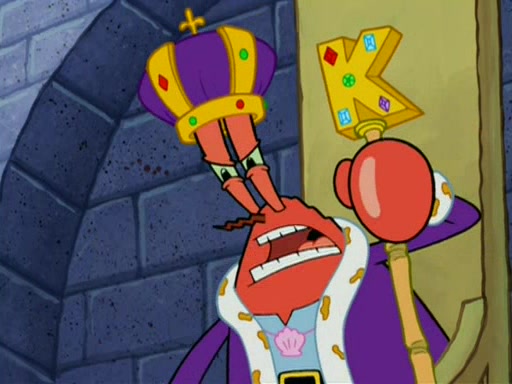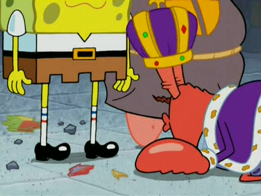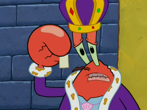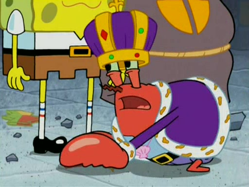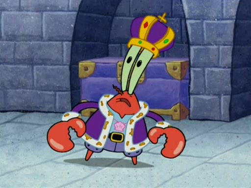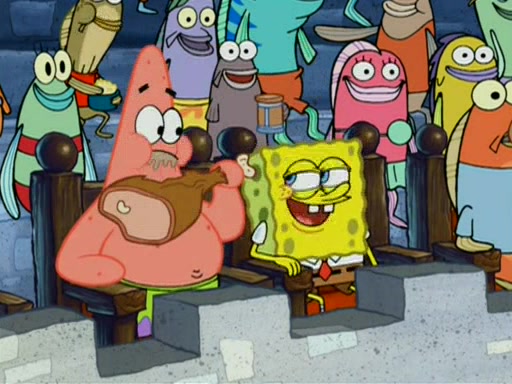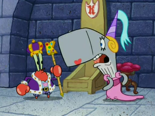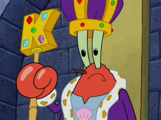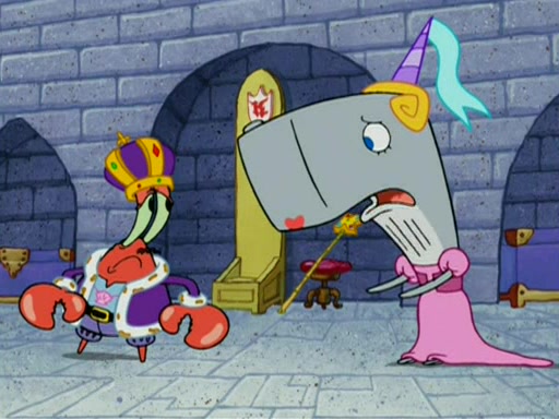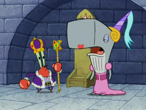 SpongeBob still thinks they are in the restaurant, and comments on how authentic the "props" are. Later, SpongeBob, Patrick, and Squidly are sent to King Krabs, who orders them to be executed because of an insulting song they sing in front of him.