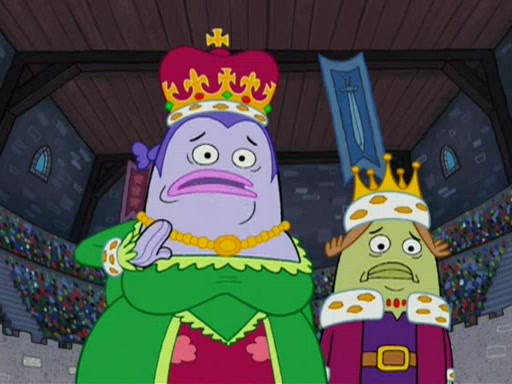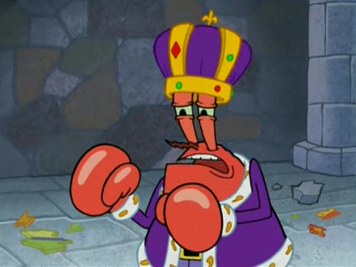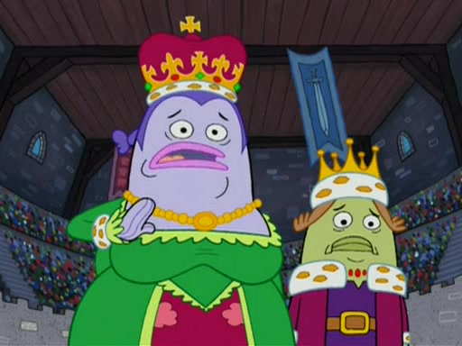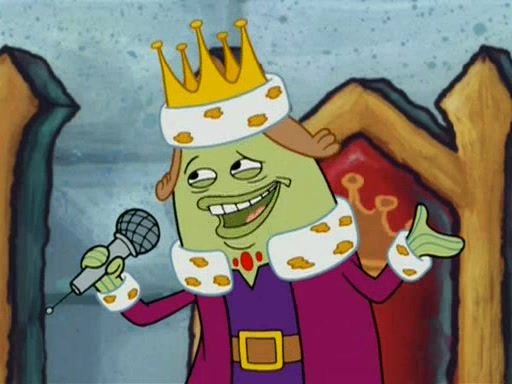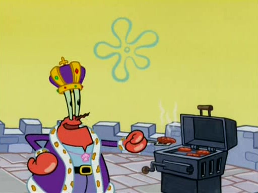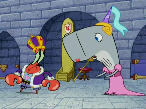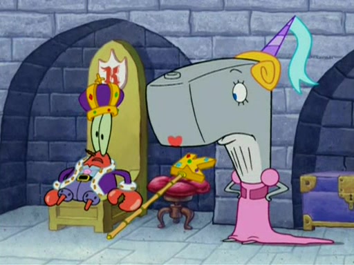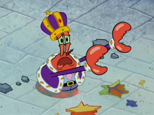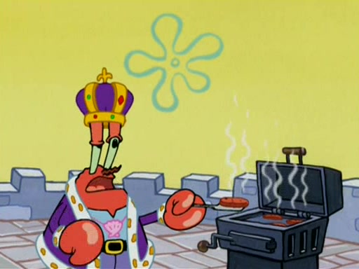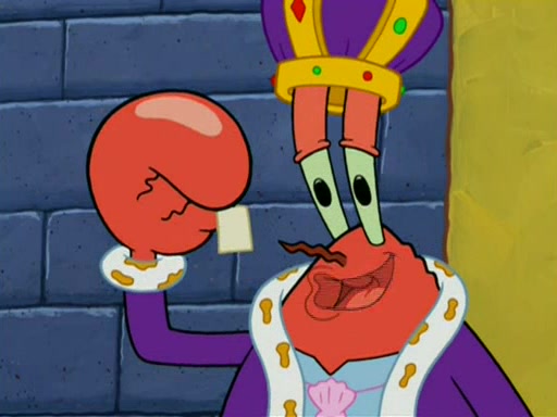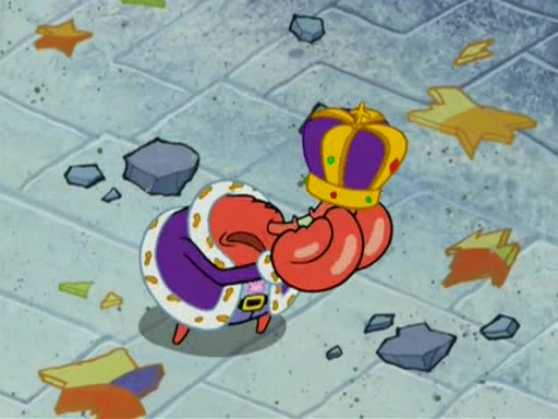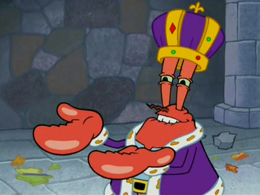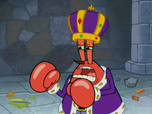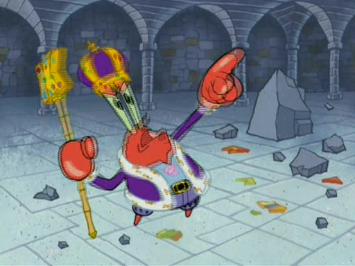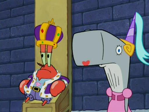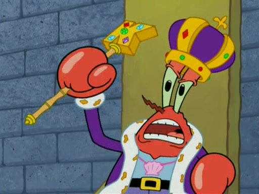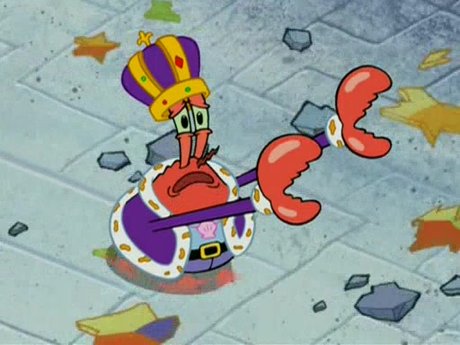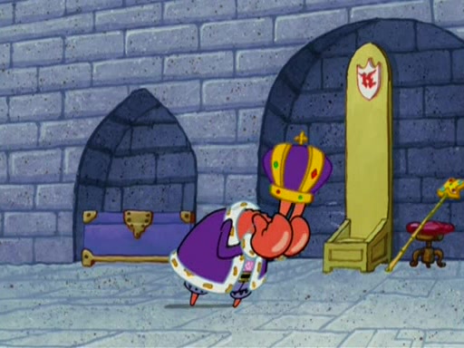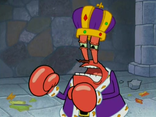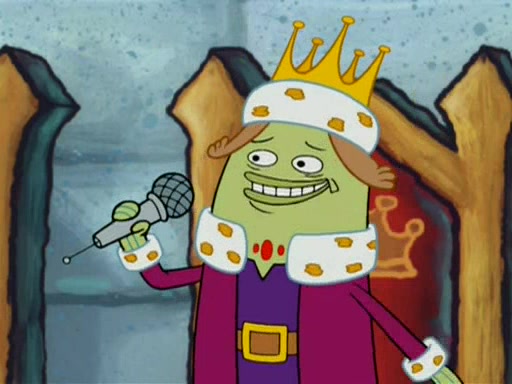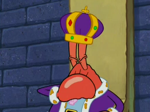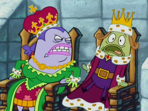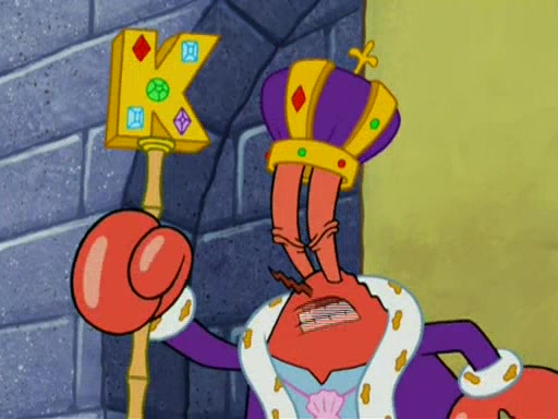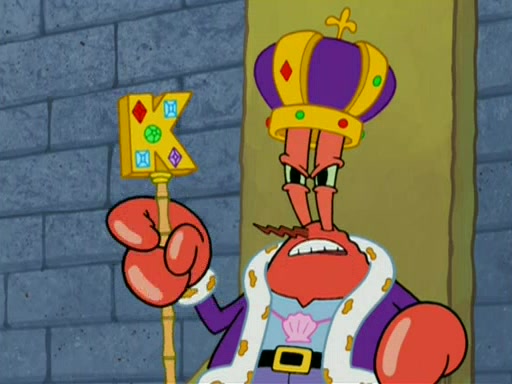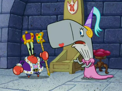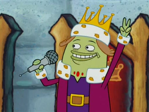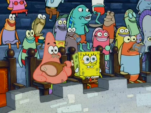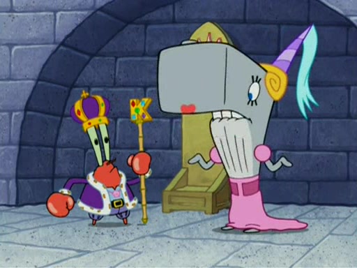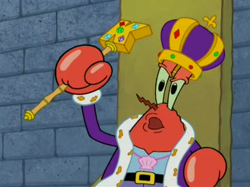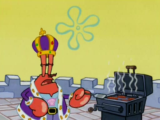 SpongeBob still thinks they are in the restaurant, and comments on how authentic the "props" are. Later, SpongeBob, Patrick, and Squidly are sent to King Krabs, who orders them to be executed because of an insulting song they sing in front of him.