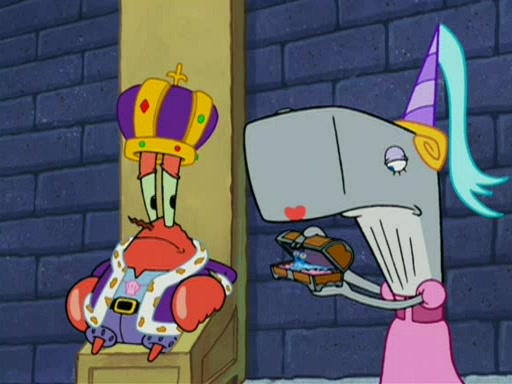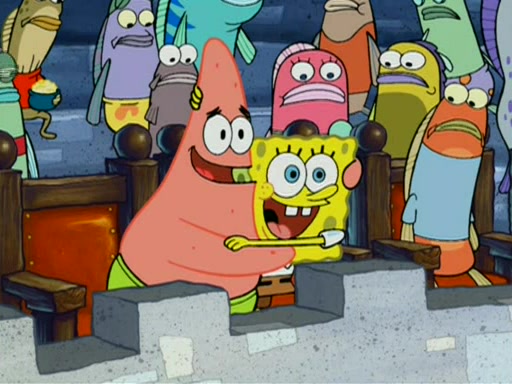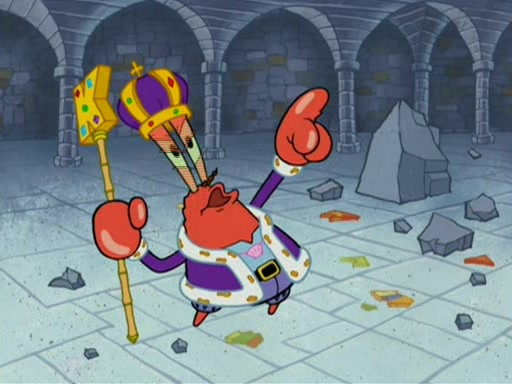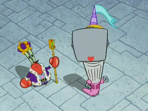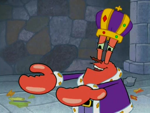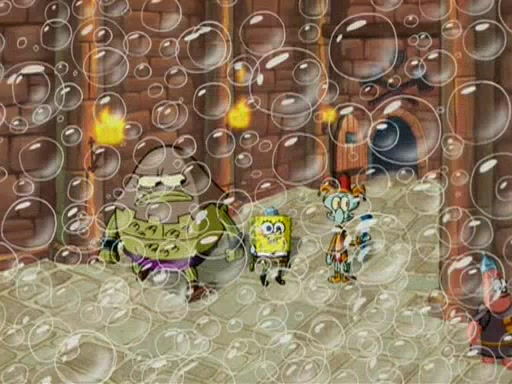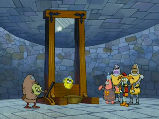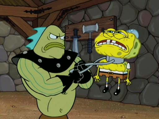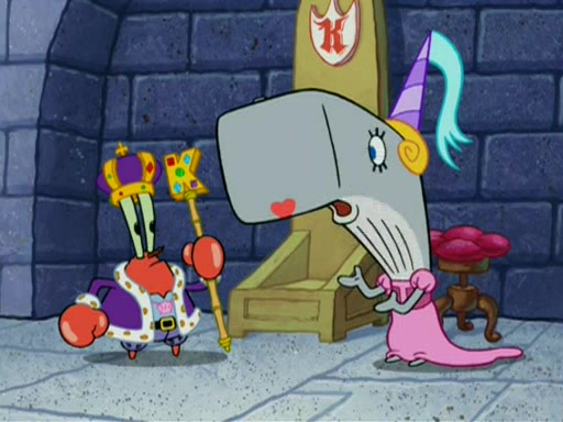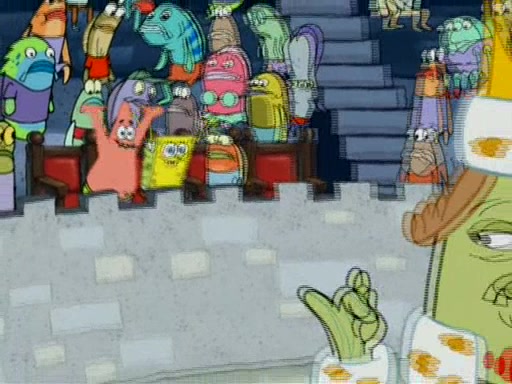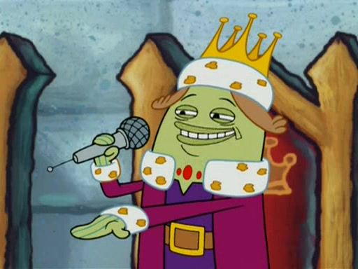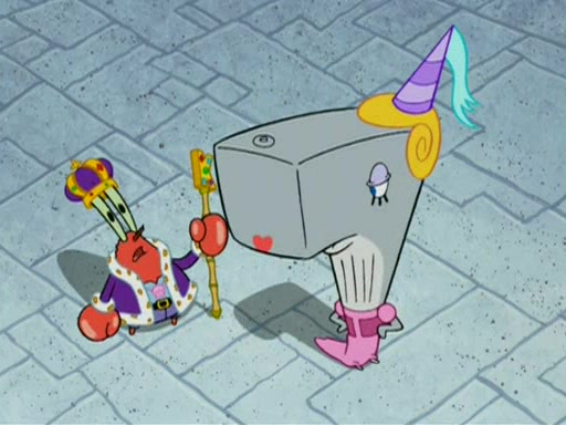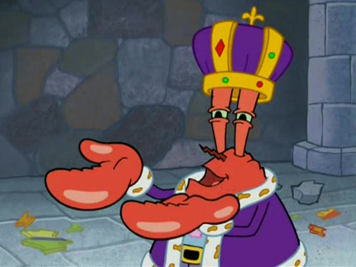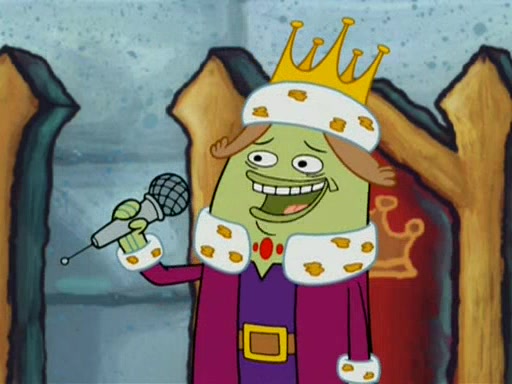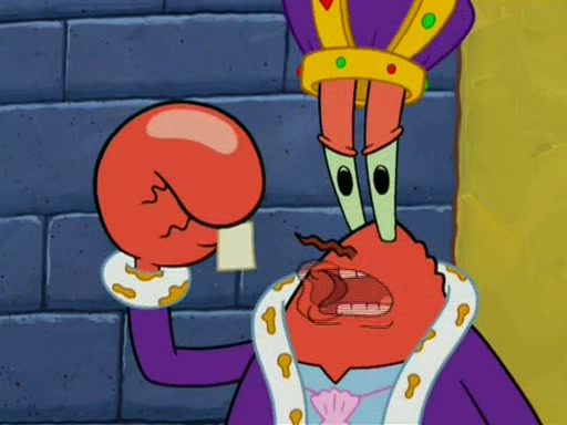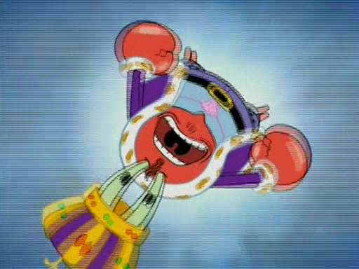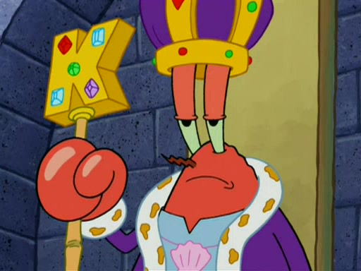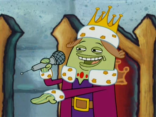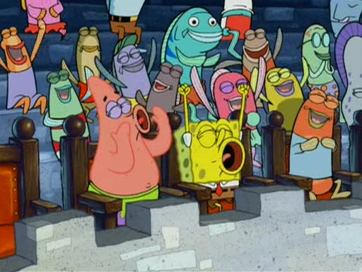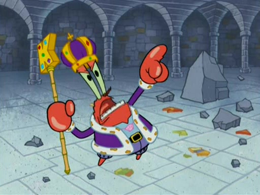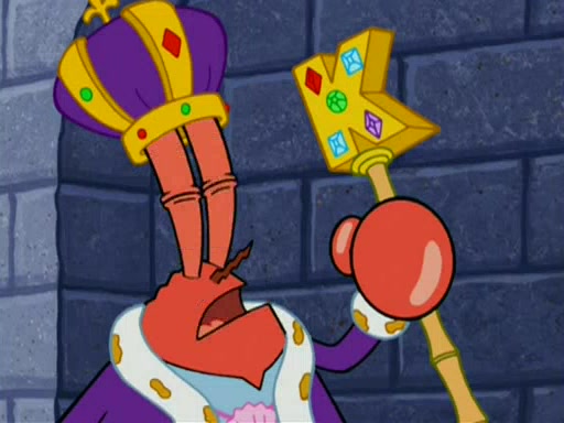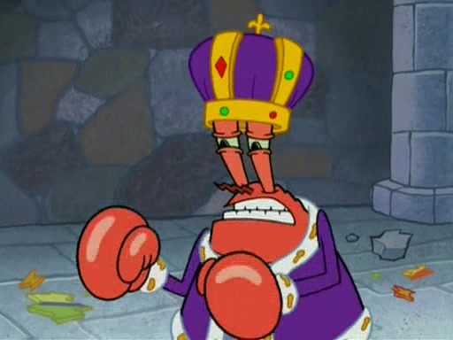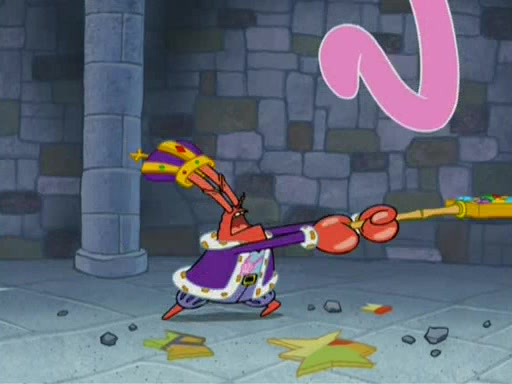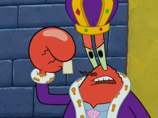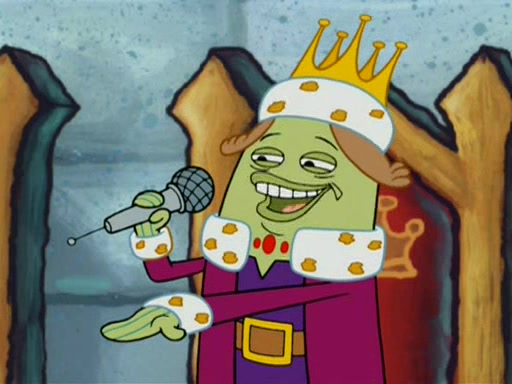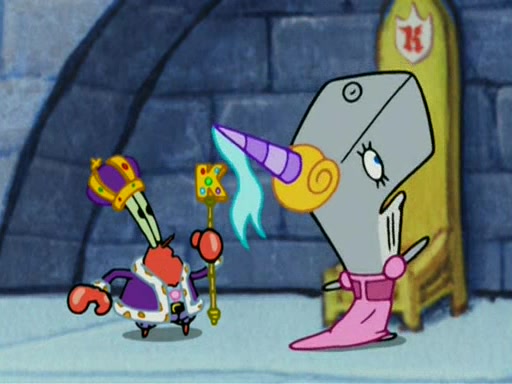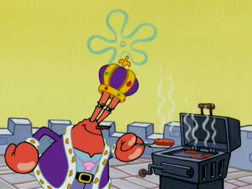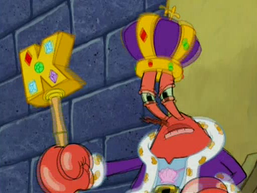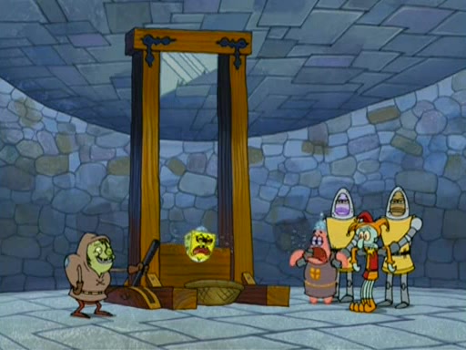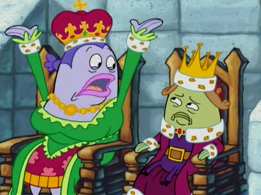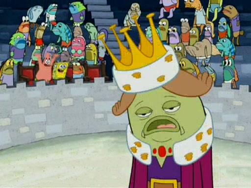 SpongeBob still thinks they are in the restaurant, and comments on how authentic the "props" are. Later, SpongeBob, Patrick, and Squidly are sent to King Krabs, who orders them to be executed because of an insulting song they sing in front of him.