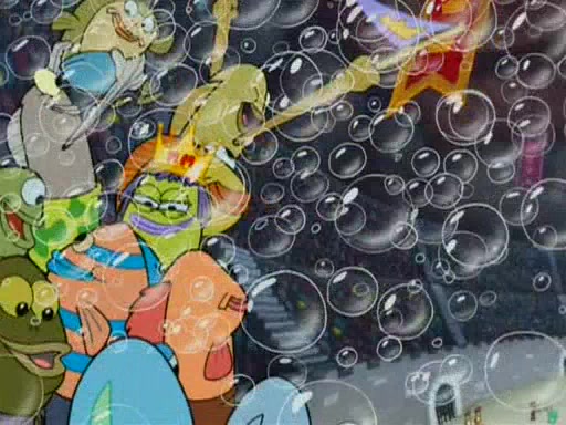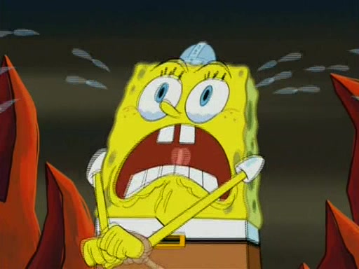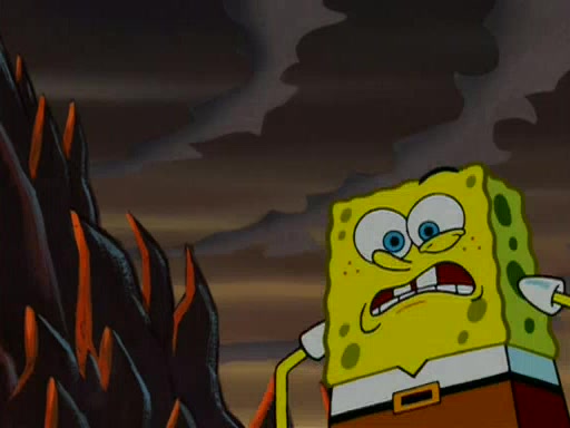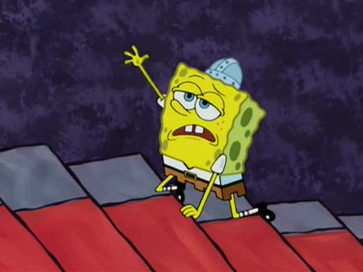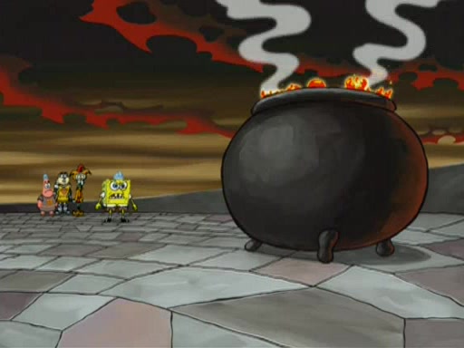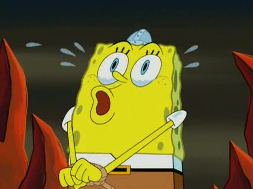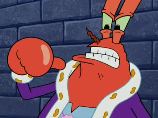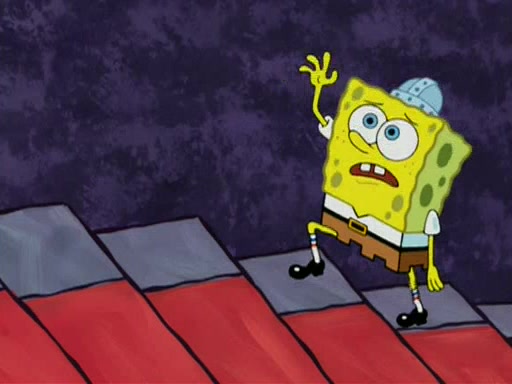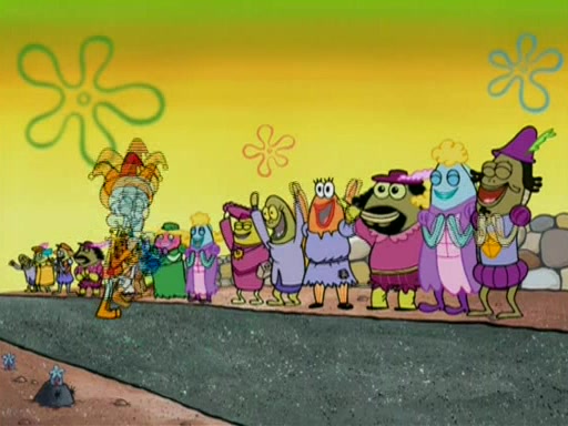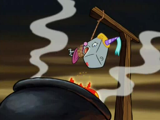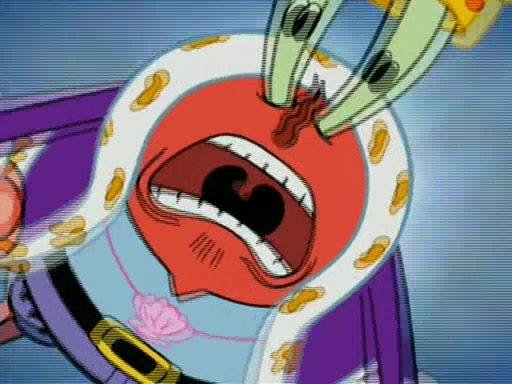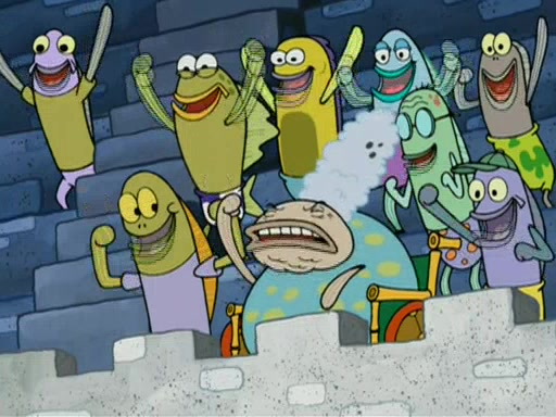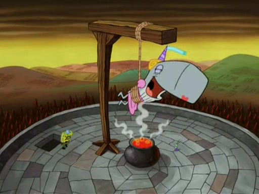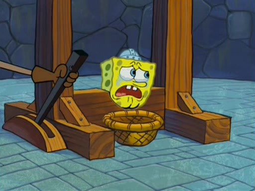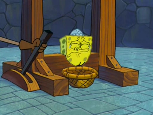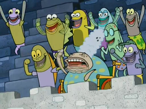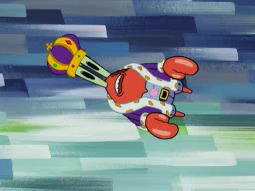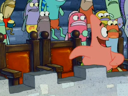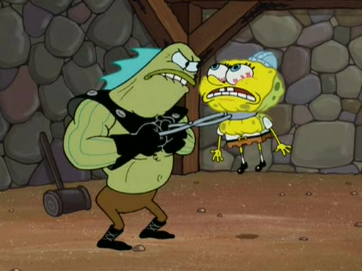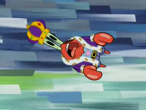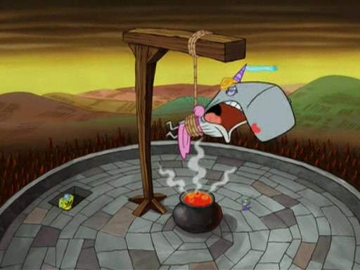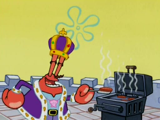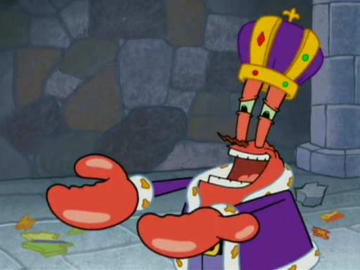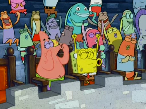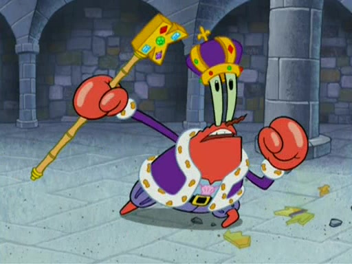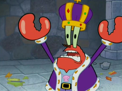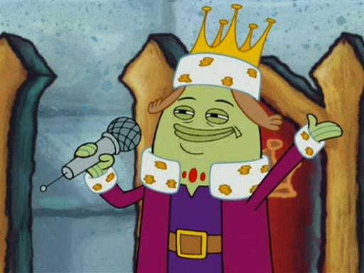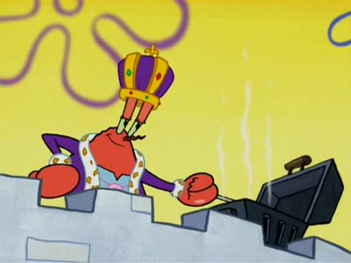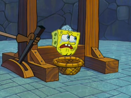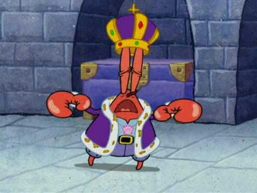 SpongeBob still thinks they are in the restaurant, and comments on how authentic the "props" are. Later, SpongeBob, Patrick, and Squidly are sent to King Krabs, who orders them to be executed because of an insulting song they sing in front of him.