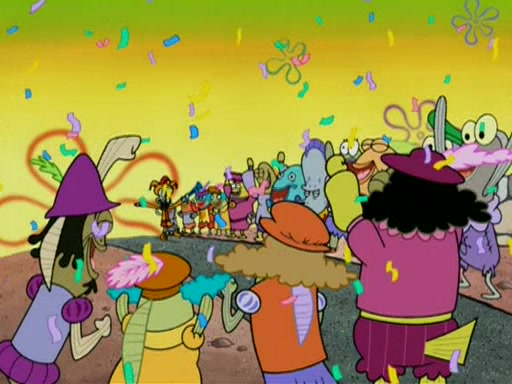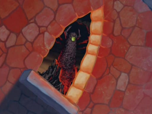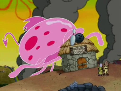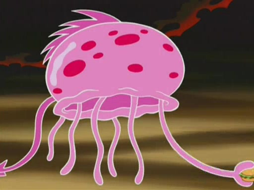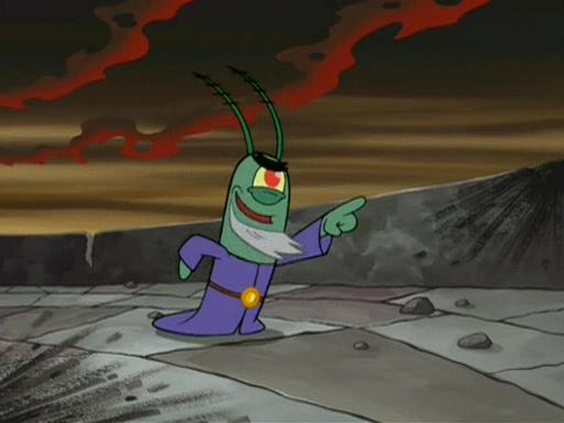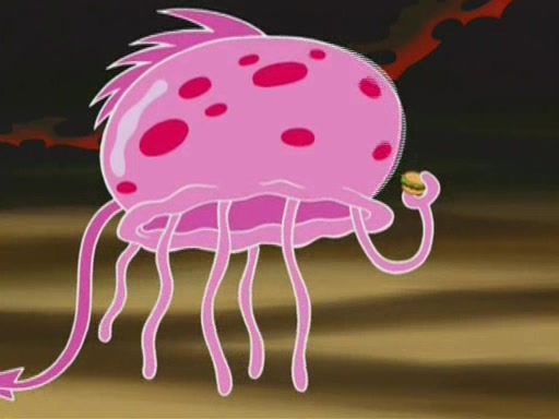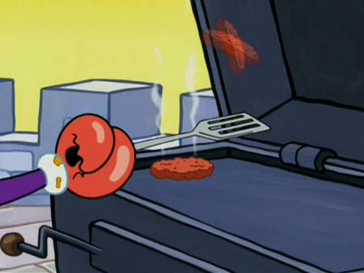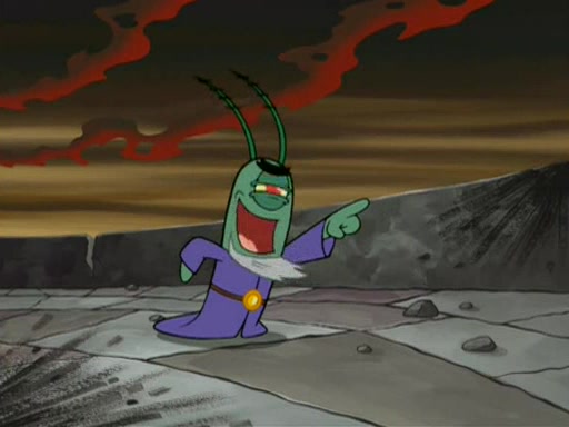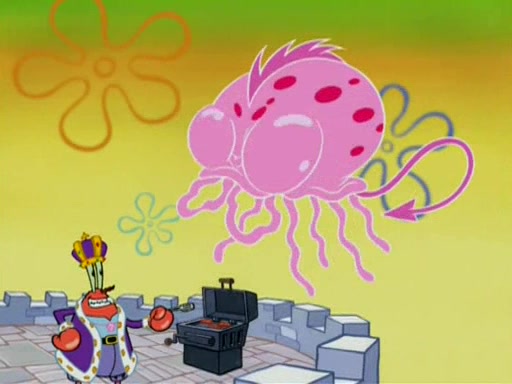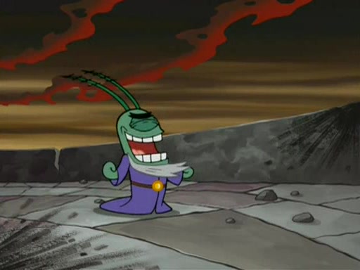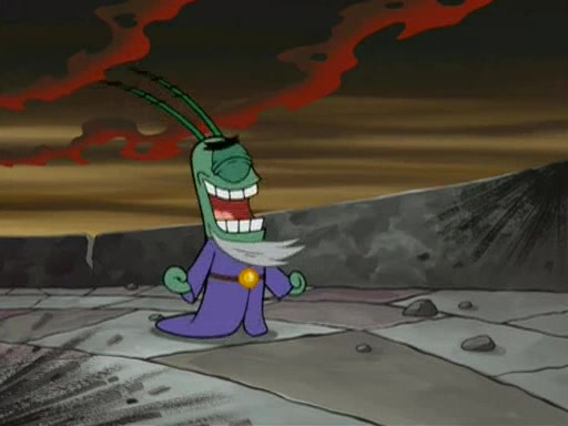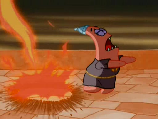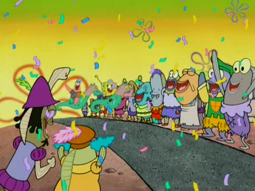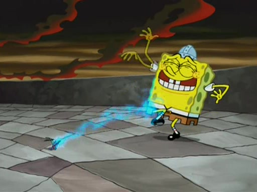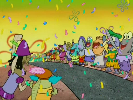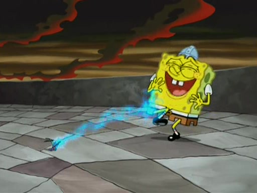However, the Dragon soon arrives and manages to zap the heroes. Just as the Dragon is about to finish off SpongeBob, he pulls out a Krabby Patty he had been saving for lunch. The Dragon eats it and likes it so much that it becomes obedient to SpongeBob, zapping Planktonamor. The heroes return to the village to have their victory celebrated, and King Krabs is seen cooking Krabby Patties (on a modern grill) for the dragon. However, as soon as Squidly starts playing his clarinet, everybody hates it, and someone throws a rock at him. The seahorses become scared and launch SpongeBob and Patrick into the air.