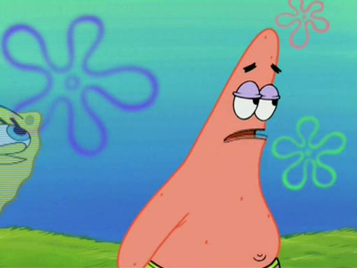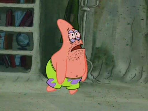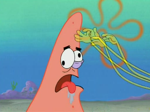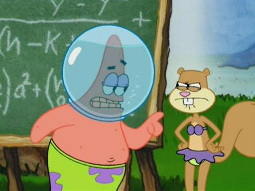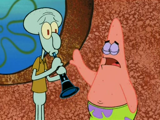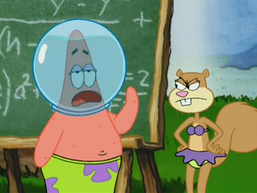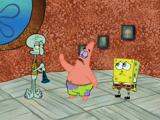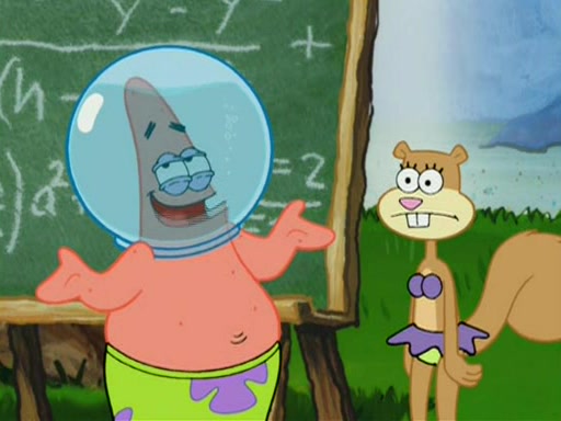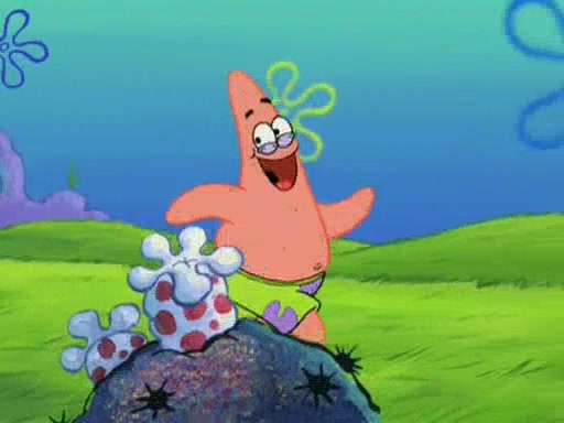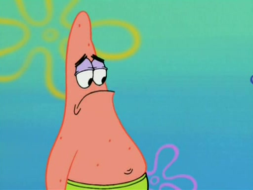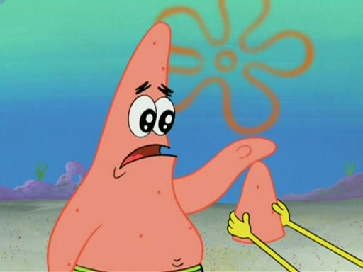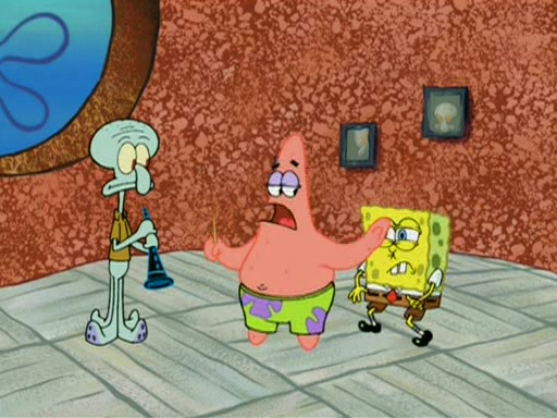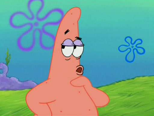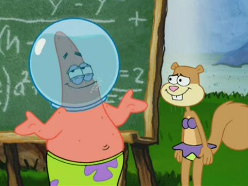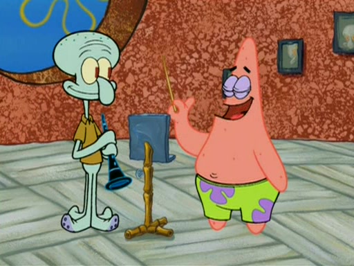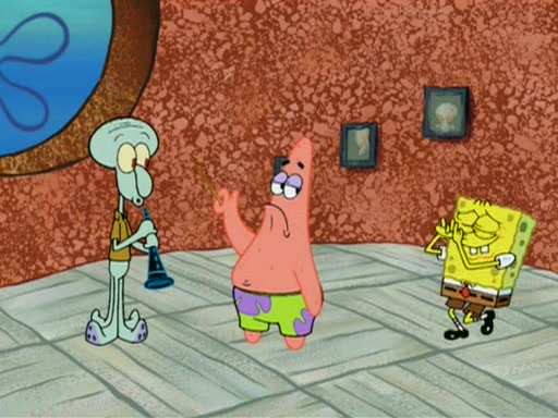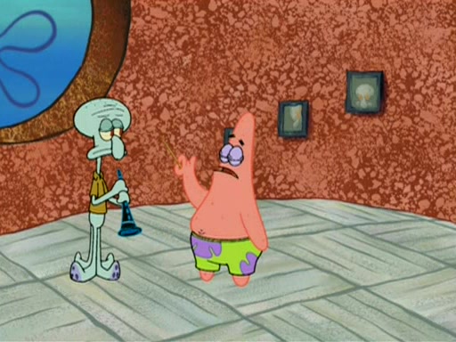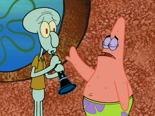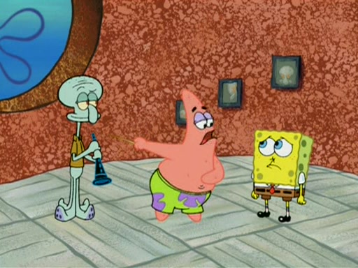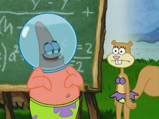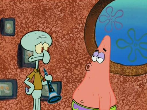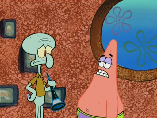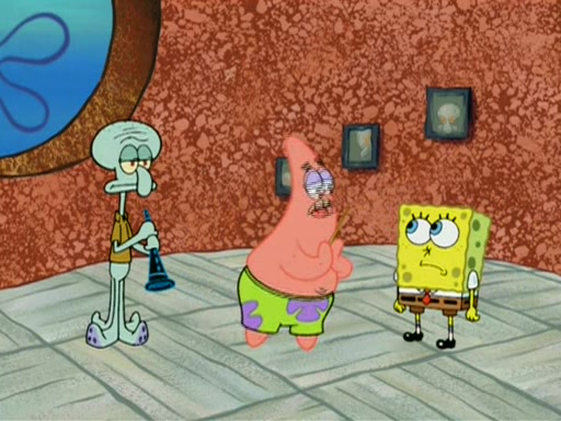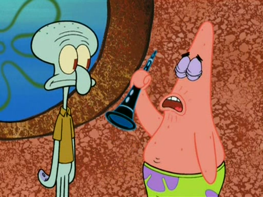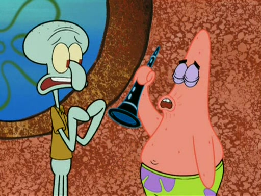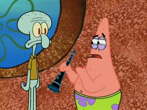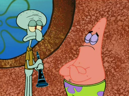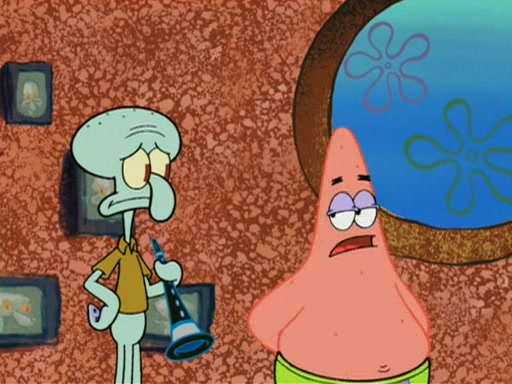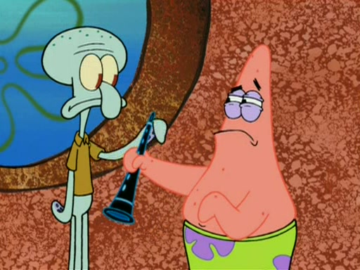 Suddenly, the piece of Brain Coral gains him intelligence. Patrick seems to be interested in nature, work and almost any music when he is intelligent. He loses interest in all the things he and SpongeBob enjoyed, and actually has fun with Squidward and Sandy, until driving them both away with his patronizing attitude (he tells Squidward to find himself a new musical mentor and tells Sandy that she does not have the ability to solve "remedial" equations, causing Sandy to shout "I liked you better when you were a barnacle head!").