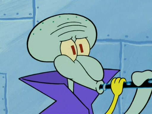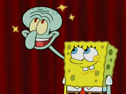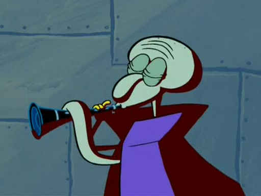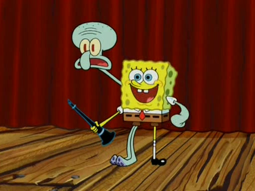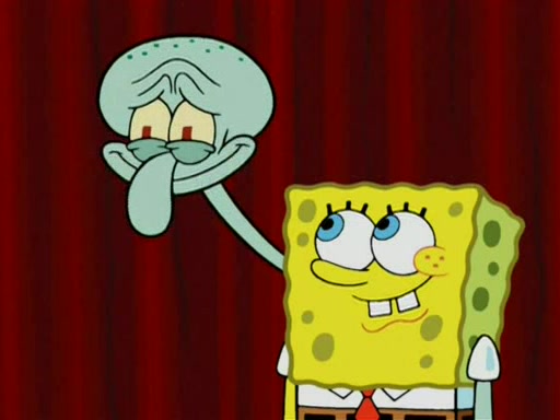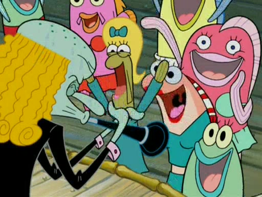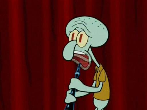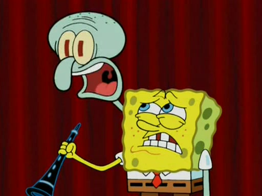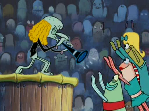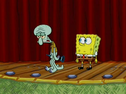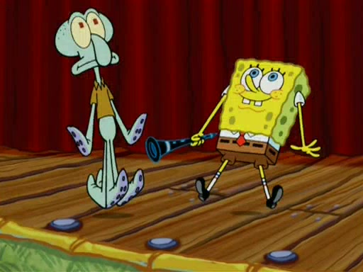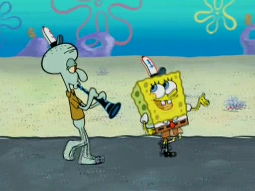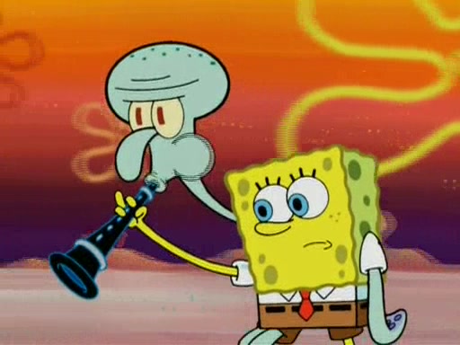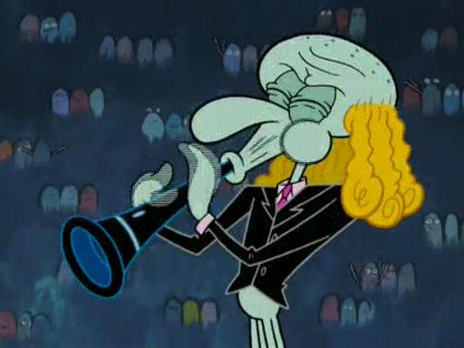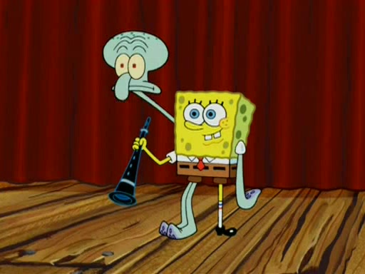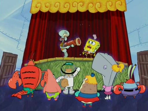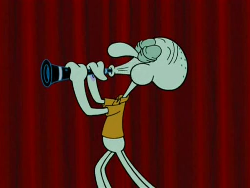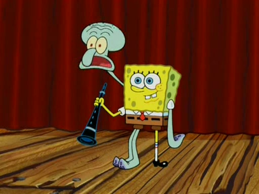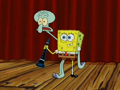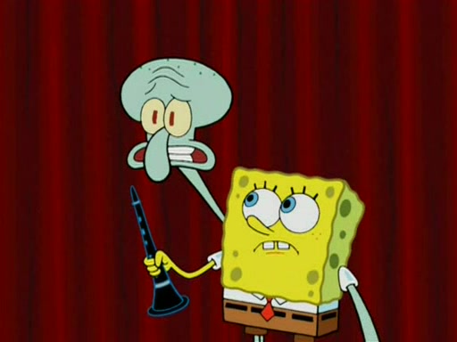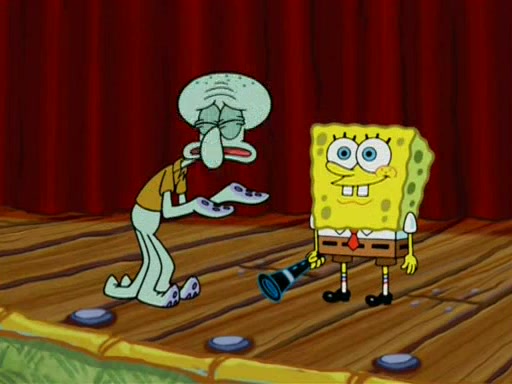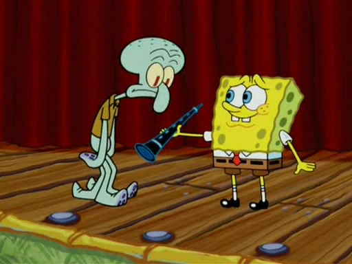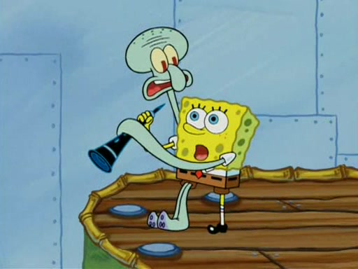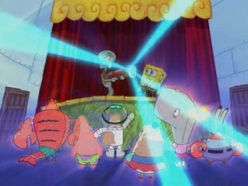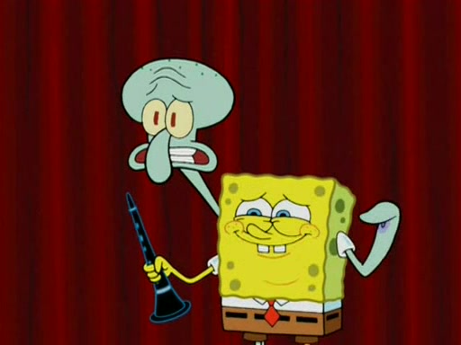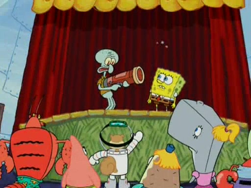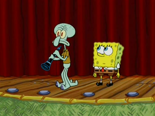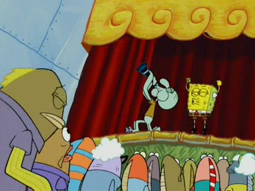Squidward tries by force, but it pushes their houses together. At the clarinet performance, Squidward is wondering where Sandy is. He thinks about giving up, but SpongeBob tells him this is his big chance to be a star. He decides to wear a cloak in order to hide SpongeBob. He starts playing his clarinet, upsetting everyone. A loose nail pulls the cloak off, revealing their secret. Amazingly, the crowd loves and starts cheering. Squidward finally knows what stardom fells like. Suddenly, Sandy shows up and tells Squidward she finished the device. Squidward tries to tell her not to, but she separates the two, displeasing the crowd. Squidward starts playing his clarinet again, but everyone hates the sound of it.