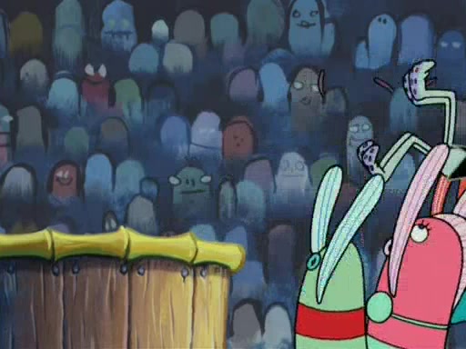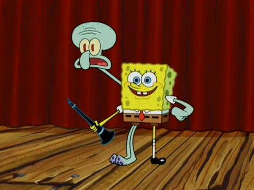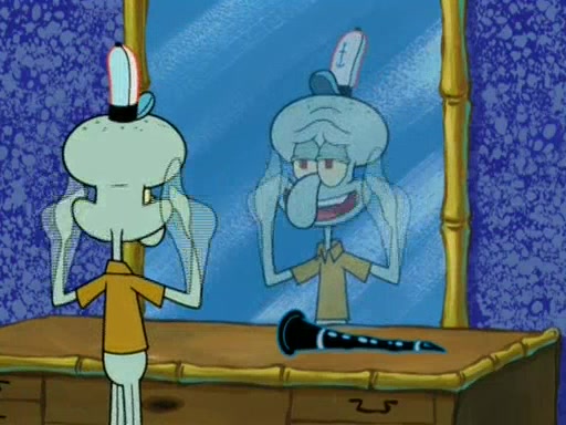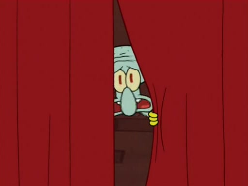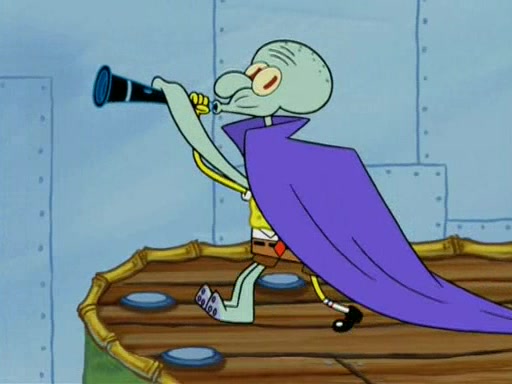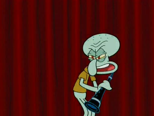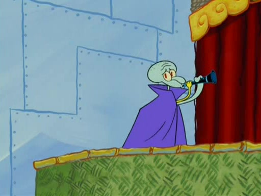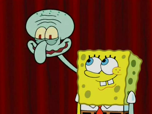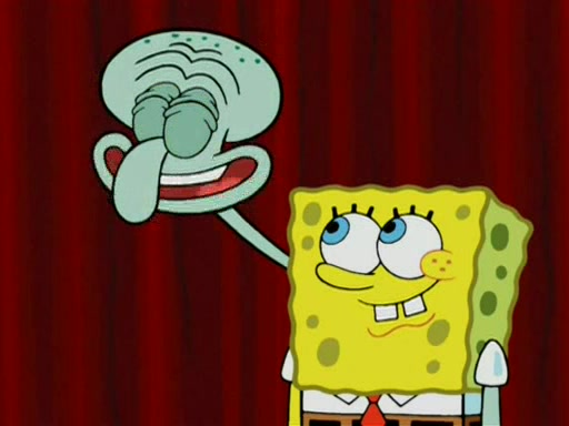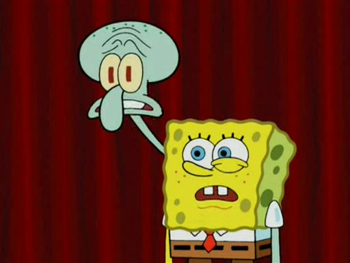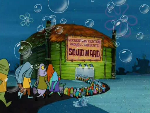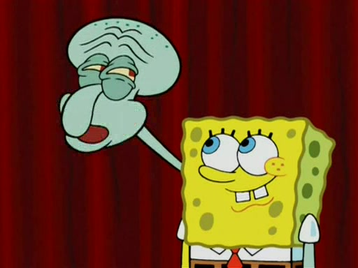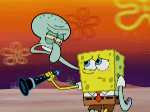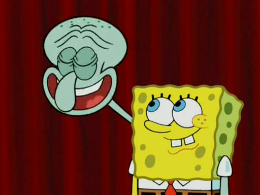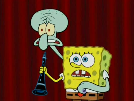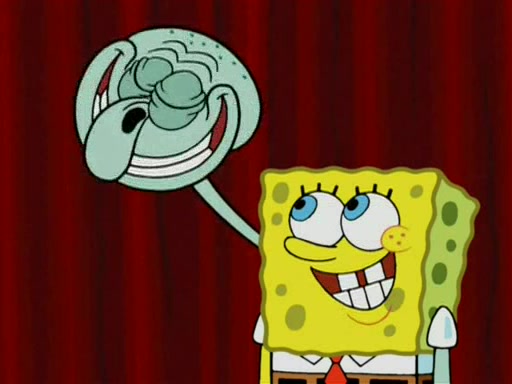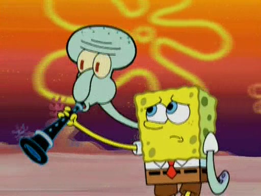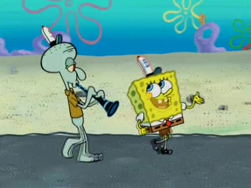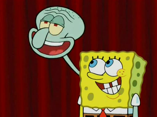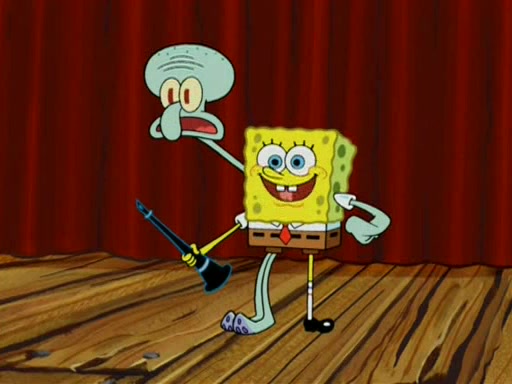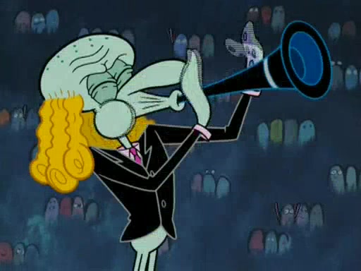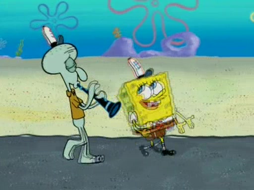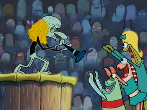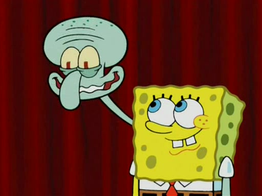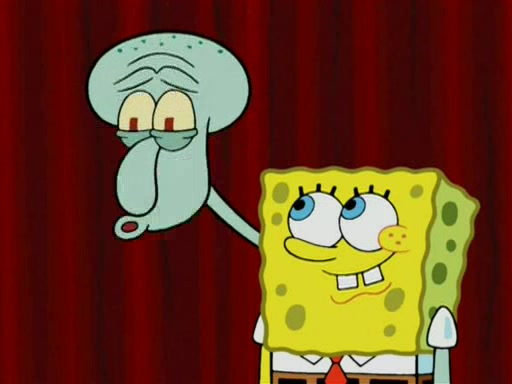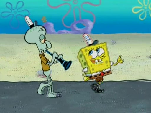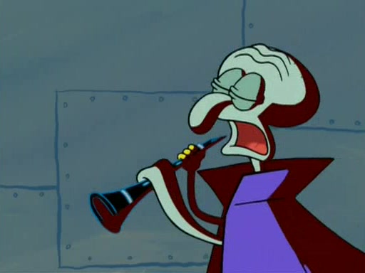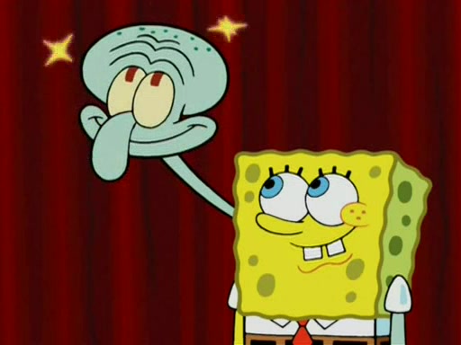 Squidward tries by force, but it pushes their houses together. At the clarinet performance, Squidward is wondering where Sandy is. He thinks about giving up, but SpongeBob tells him this is his big chance to be a star. He decides to wear a cloak in order to hide SpongeBob. He starts playing his clarinet, upsetting everyone. A loose nail pulls the cloak off, revealing their secret. Amazingly, the crowd loves and starts cheering. Squidward finally knows what stardom fells like. Suddenly, Sandy shows up and tells Squidward she finished the device. Squidward tries to tell her not to, but she separates the two, displeasing the crowd. Squidward starts playing his clarinet again, but everyone hates the sound of it.