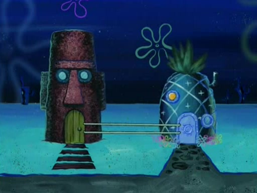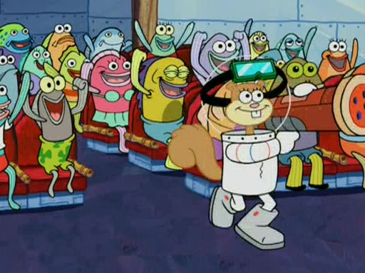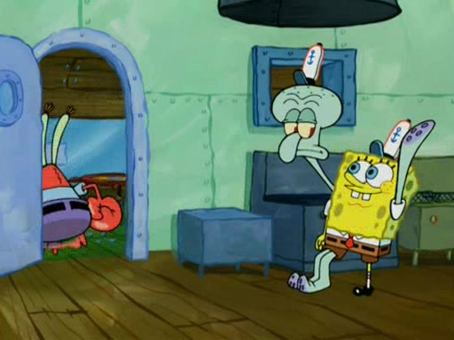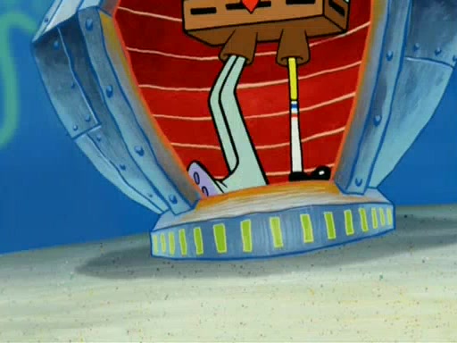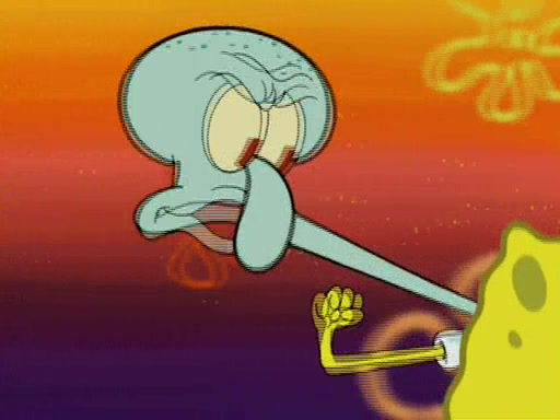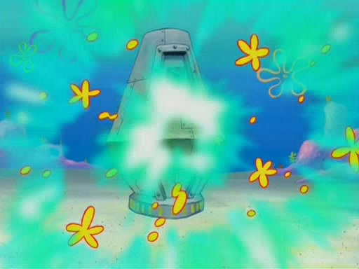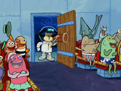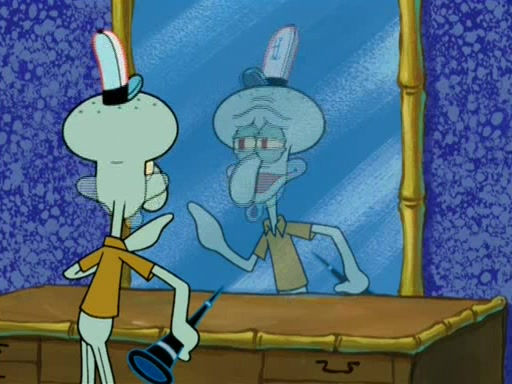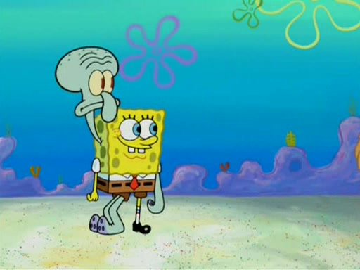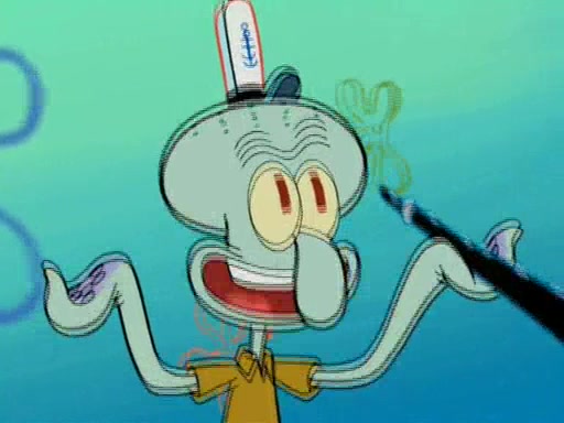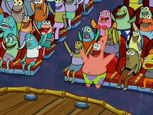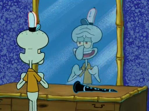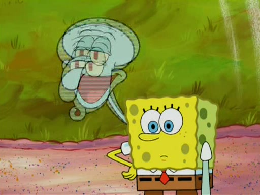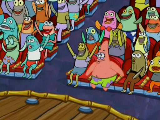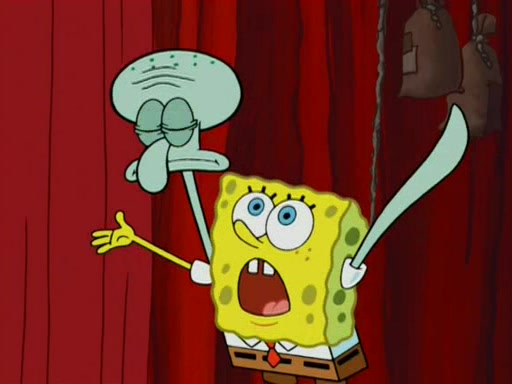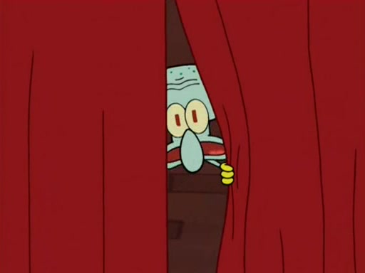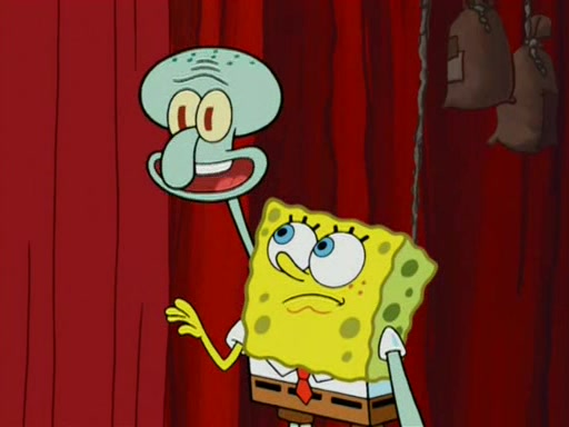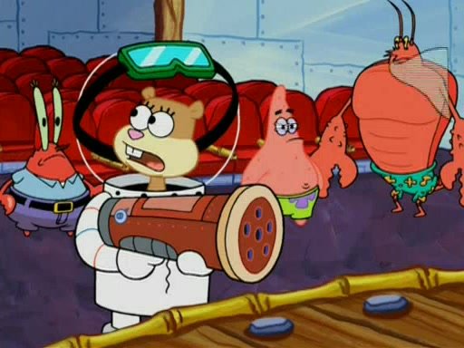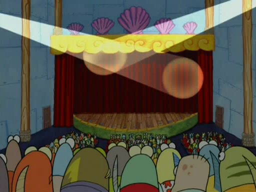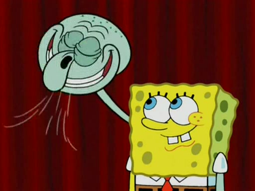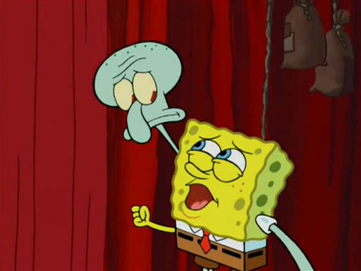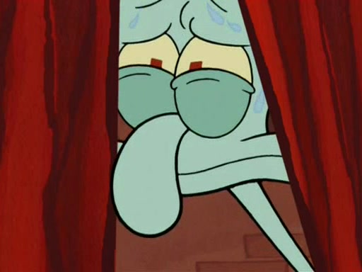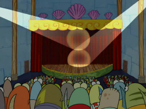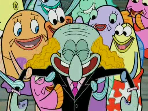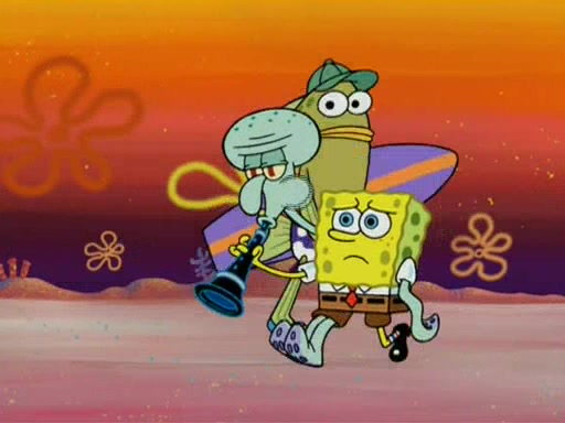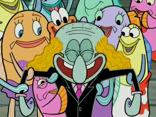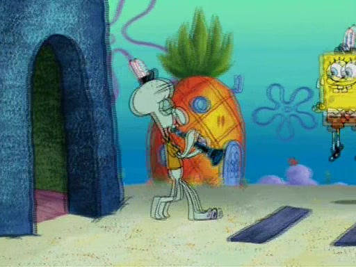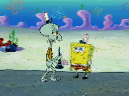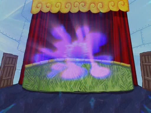 Squidward tries by force, but it pushes their houses together. At the clarinet performance, Squidward is wondering where Sandy is. He thinks about giving up, but SpongeBob tells him this is his big chance to be a star. He decides to wear a cloak in order to hide SpongeBob. He starts playing his clarinet, upsetting everyone. A loose nail pulls the cloak off, revealing their secret. Amazingly, the crowd loves and starts cheering. Squidward finally knows what stardom fells like. Suddenly, Sandy shows up and tells Squidward she finished the device. Squidward tries to tell her not to, but she separates the two, displeasing the crowd. Squidward starts playing his clarinet again, but everyone hates the sound of it.