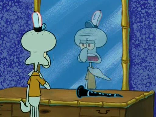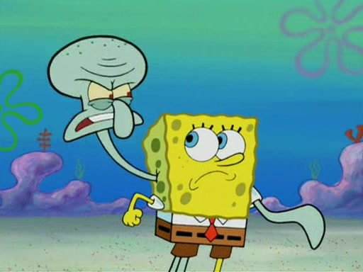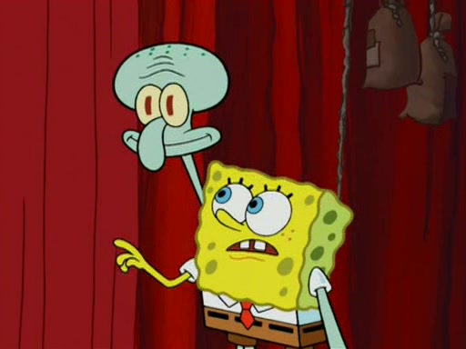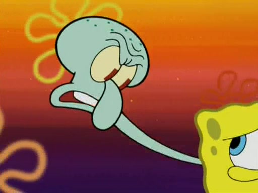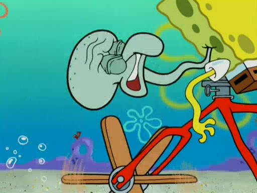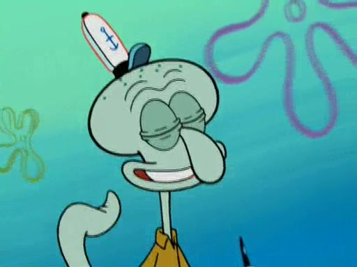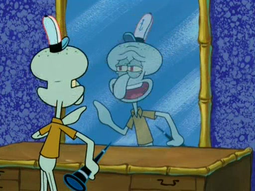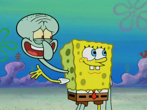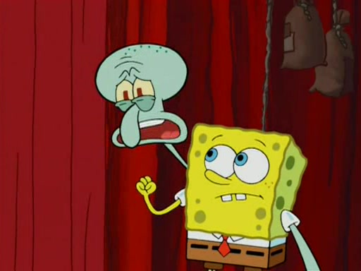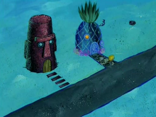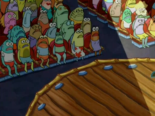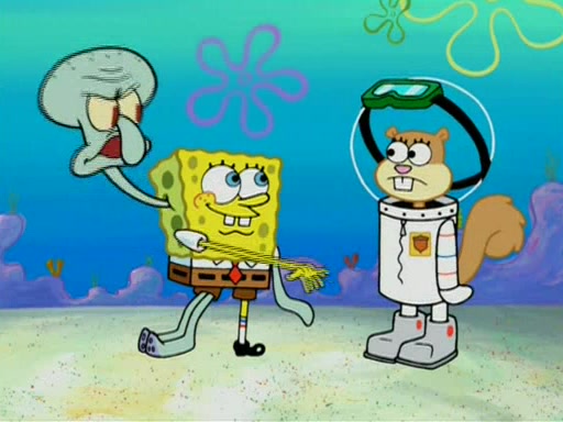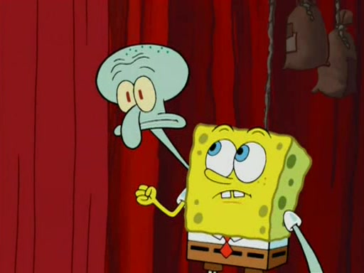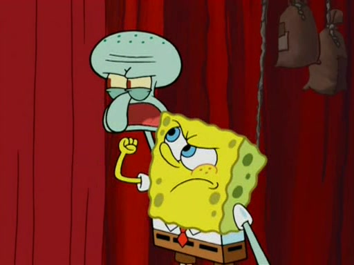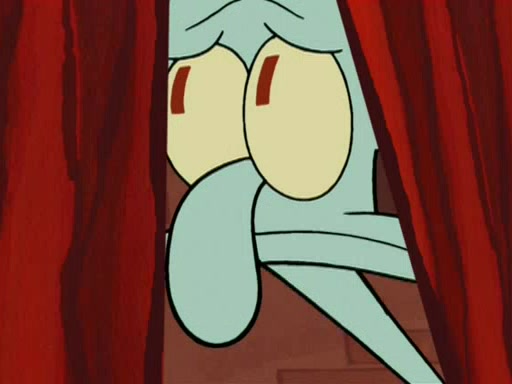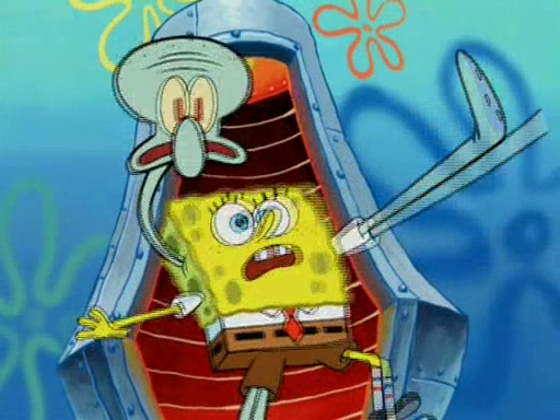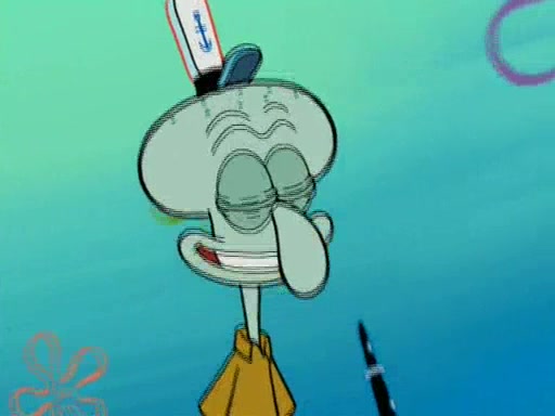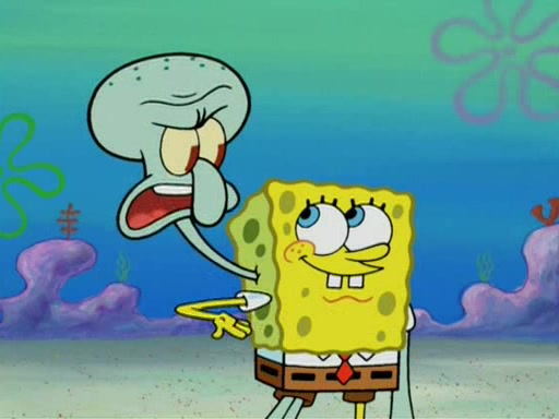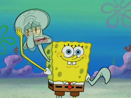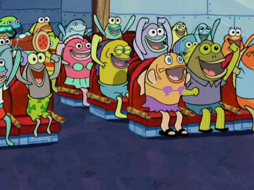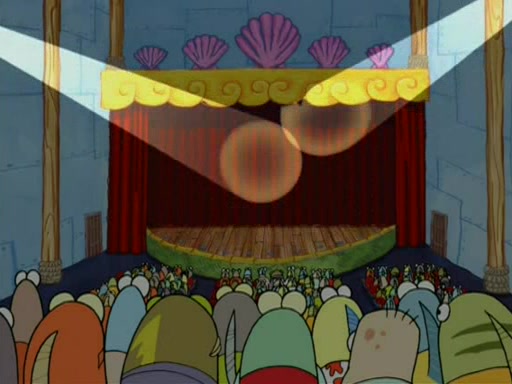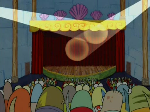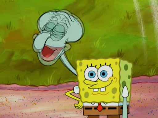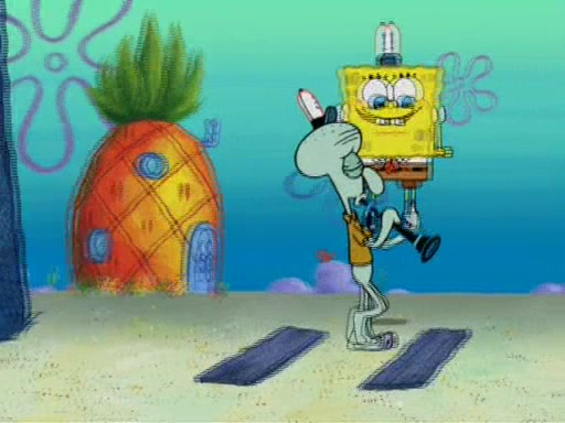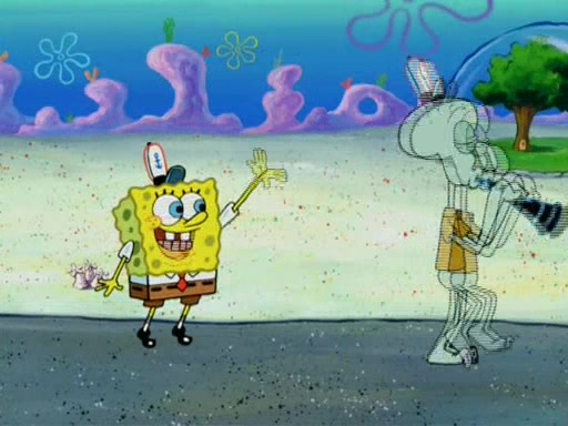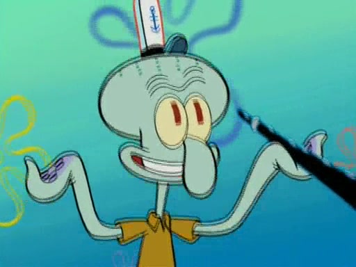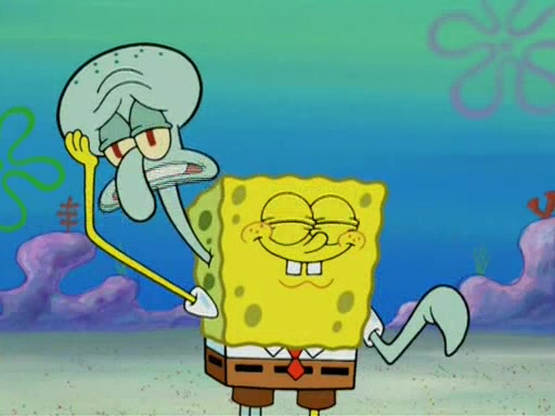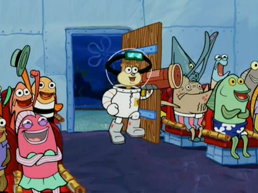 Squidward tries by force, but it pushes their houses together. At the clarinet performance, Squidward is wondering where Sandy is. He thinks about giving up, but SpongeBob tells him this is his big chance to be a star. He decides to wear a cloak in order to hide SpongeBob. He starts playing his clarinet, upsetting everyone. A loose nail pulls the cloak off, revealing their secret. Amazingly, the crowd loves and starts cheering. Squidward finally knows what stardom fells like. Suddenly, Sandy shows up and tells Squidward she finished the device. Squidward tries to tell her not to, but she separates the two, displeasing the crowd. Squidward starts playing his clarinet again, but everyone hates the sound of it.