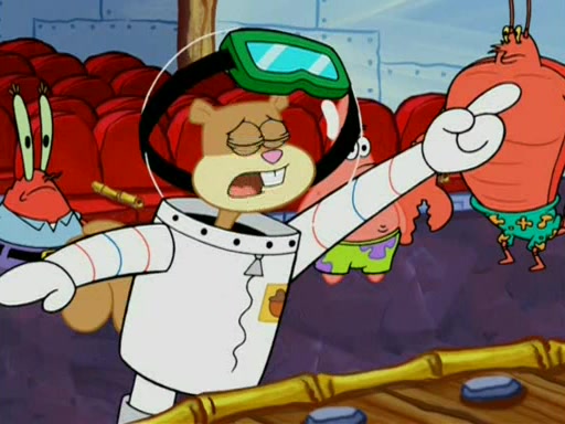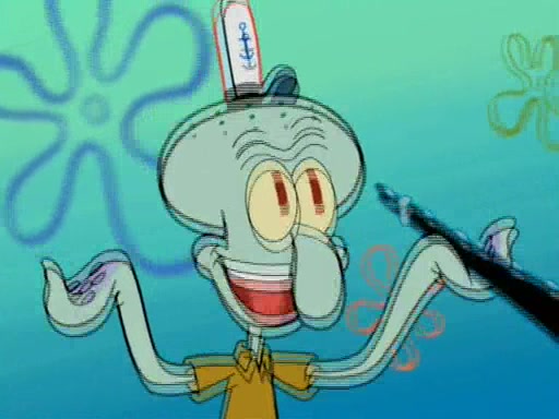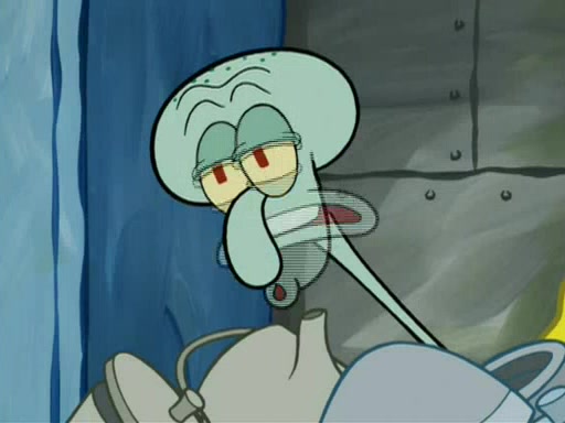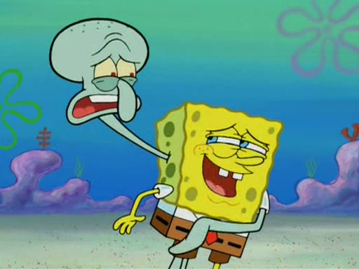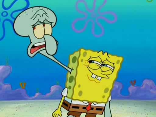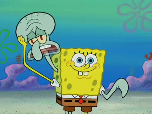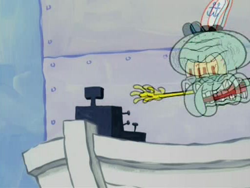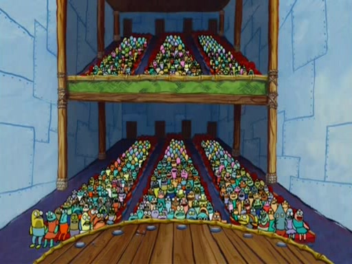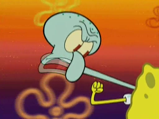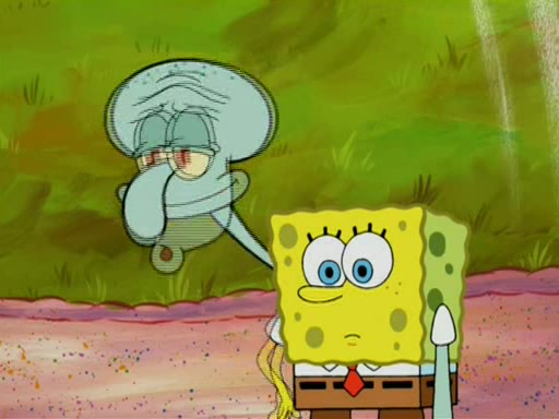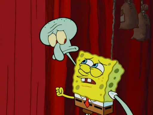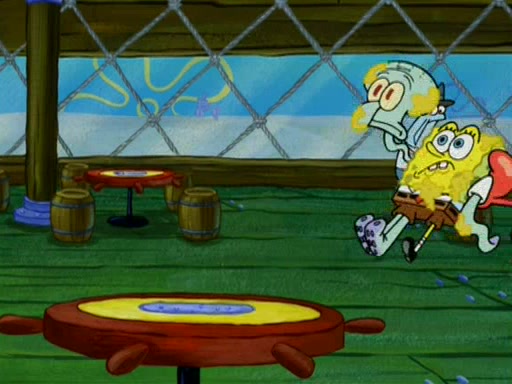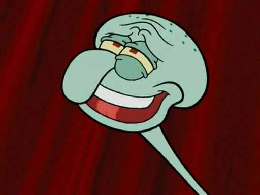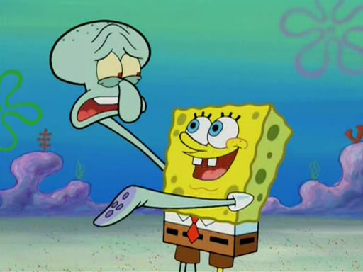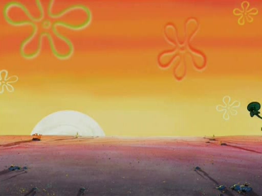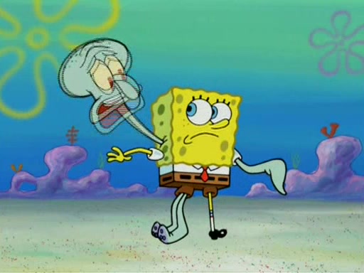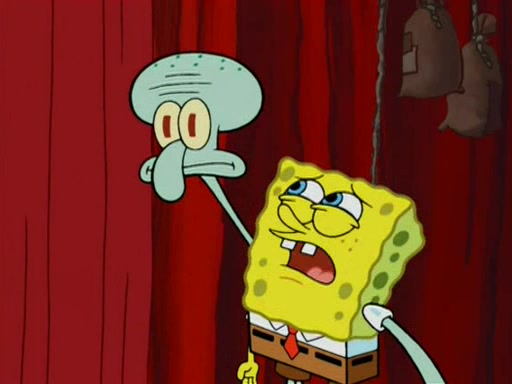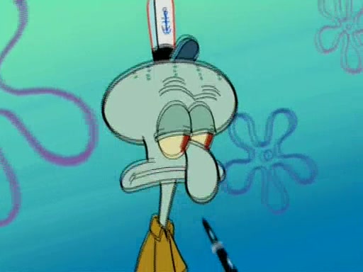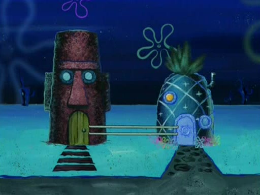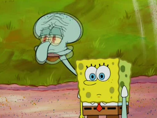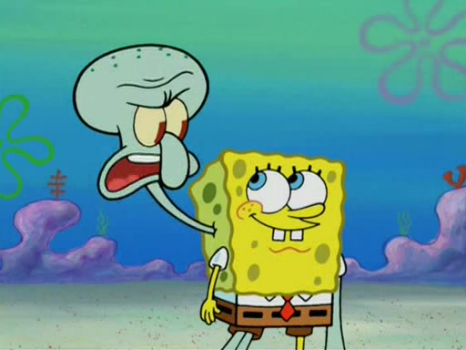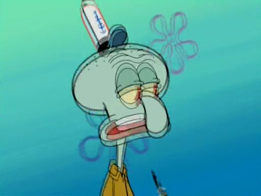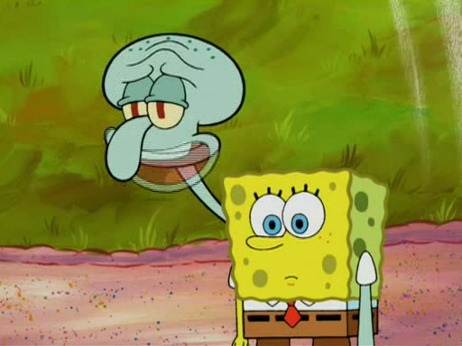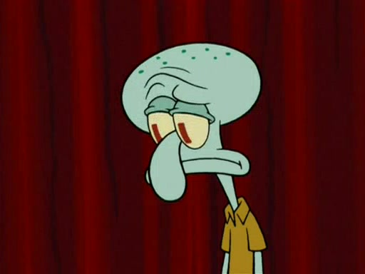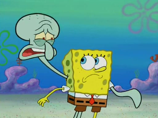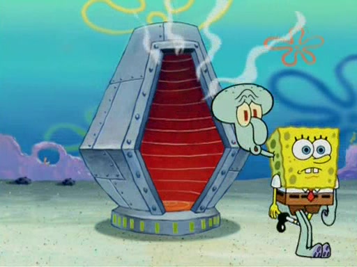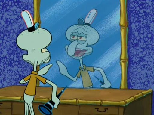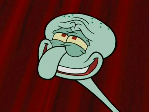 Squidward tries by force, but it pushes their houses together. At the clarinet performance, Squidward is wondering where Sandy is. He thinks about giving up, but SpongeBob tells him this is his big chance to be a star. He decides to wear a cloak in order to hide SpongeBob. He starts playing his clarinet, upsetting everyone. A loose nail pulls the cloak off, revealing their secret. Amazingly, the crowd loves and starts cheering. Squidward finally knows what stardom fells like. Suddenly, Sandy shows up and tells Squidward she finished the device. Squidward tries to tell her not to, but she separates the two, displeasing the crowd. Squidward starts playing his clarinet again, but everyone hates the sound of it.