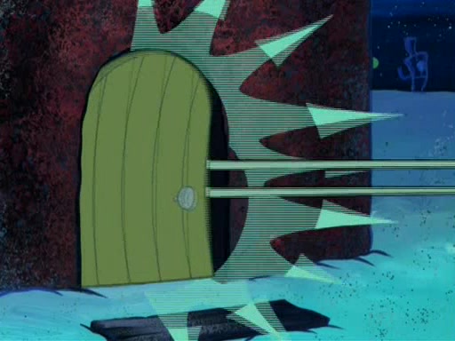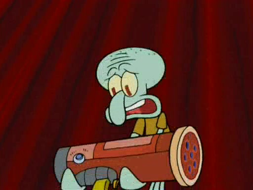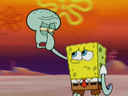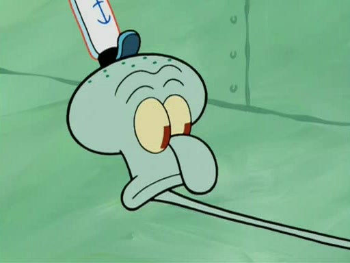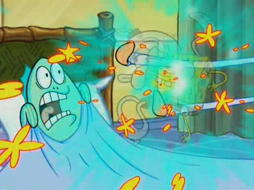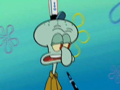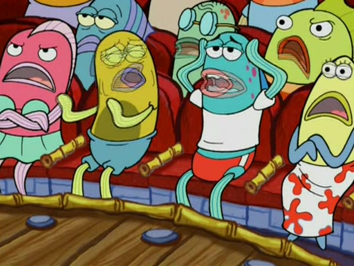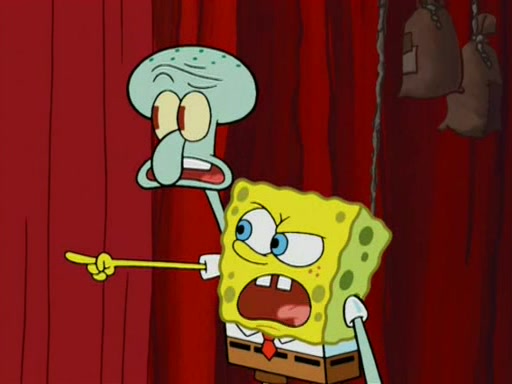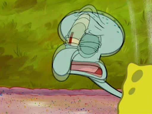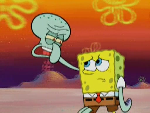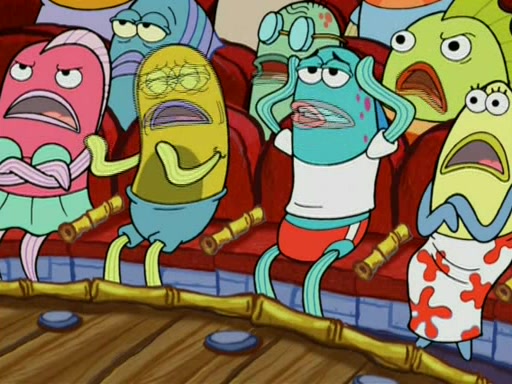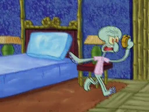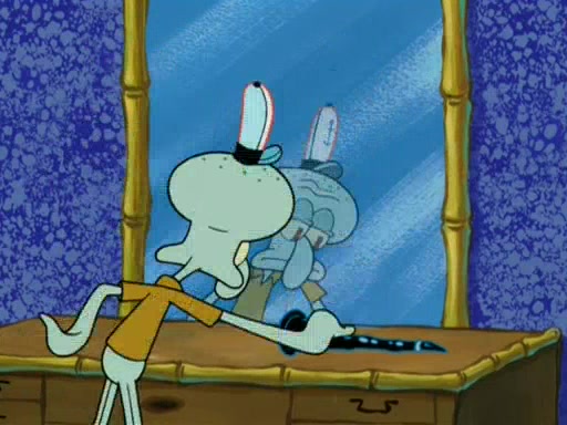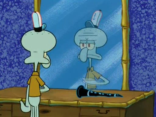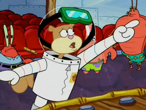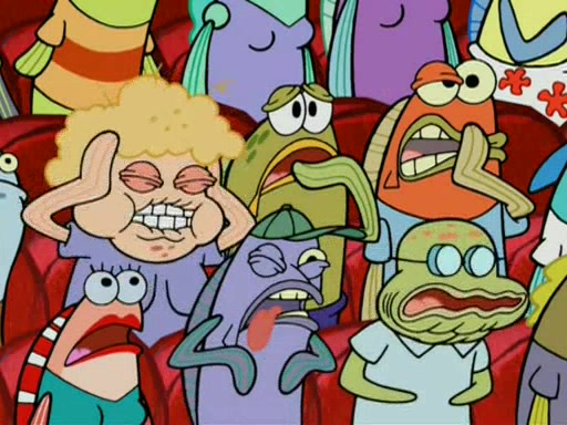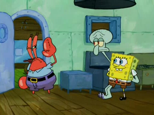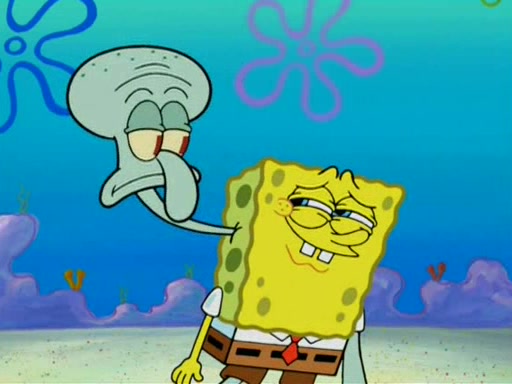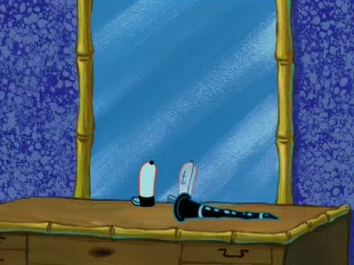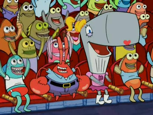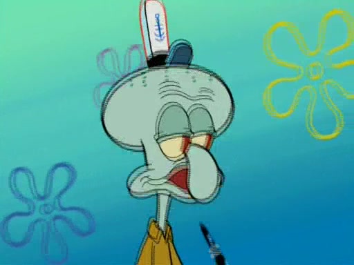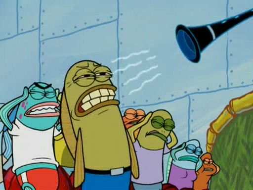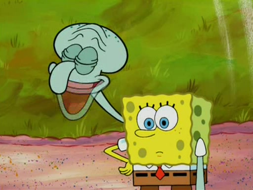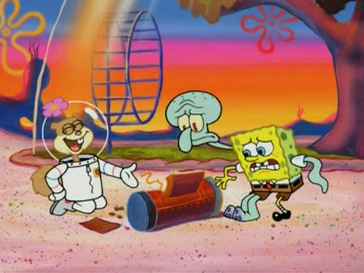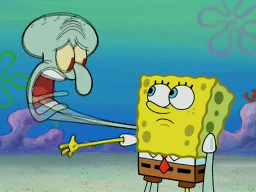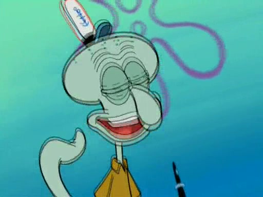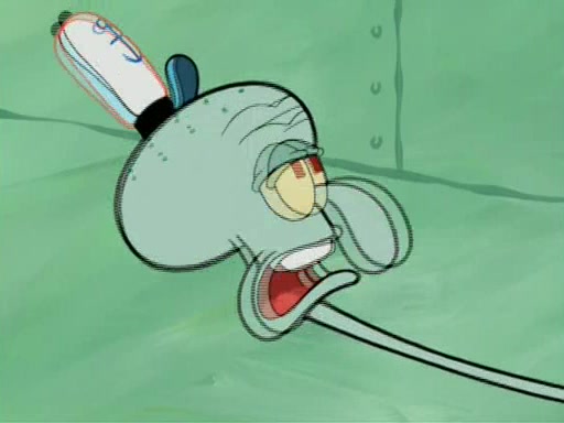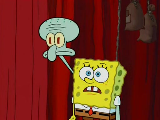 Squidward tries by force, but it pushes their houses together. At the clarinet performance, Squidward is wondering where Sandy is. He thinks about giving up, but SpongeBob tells him this is his big chance to be a star. He decides to wear a cloak in order to hide SpongeBob. He starts playing his clarinet, upsetting everyone. A loose nail pulls the cloak off, revealing their secret. Amazingly, the crowd loves and starts cheering. Squidward finally knows what stardom fells like. Suddenly, Sandy shows up and tells Squidward she finished the device. Squidward tries to tell her not to, but she separates the two, displeasing the crowd. Squidward starts playing his clarinet again, but everyone hates the sound of it.
