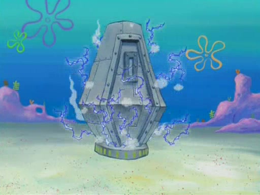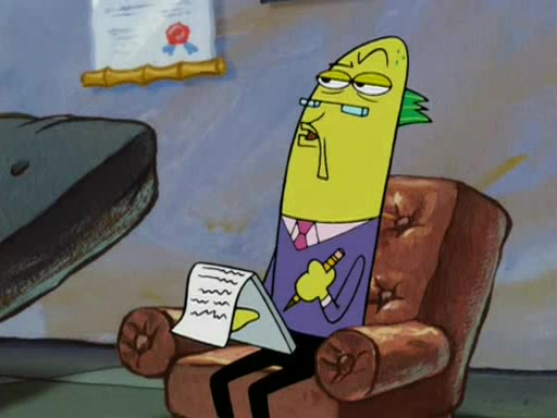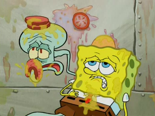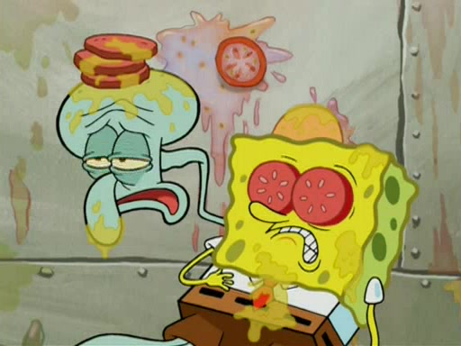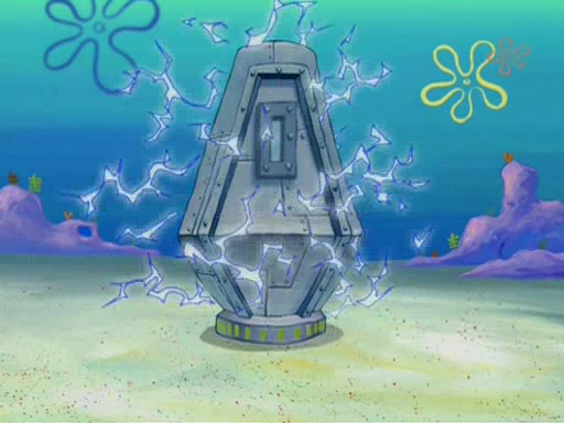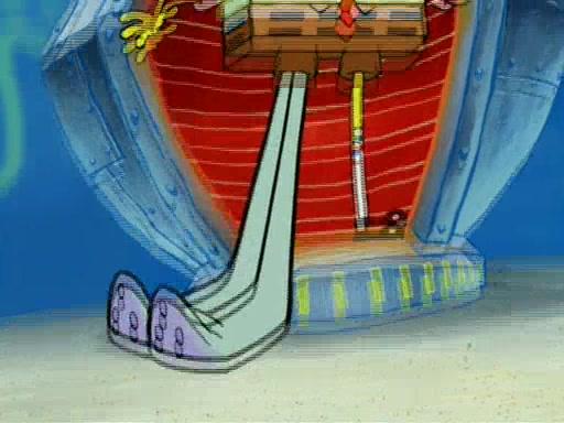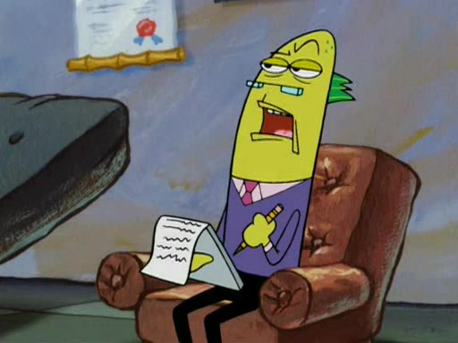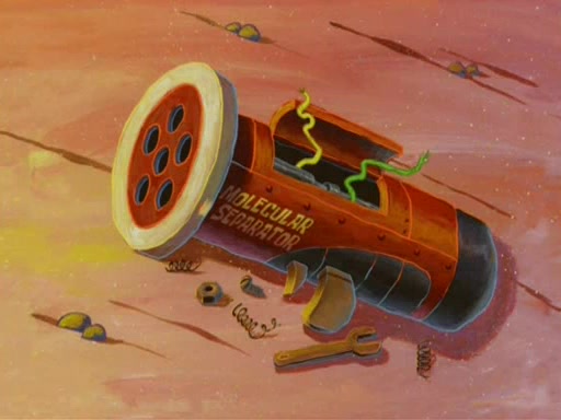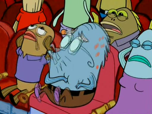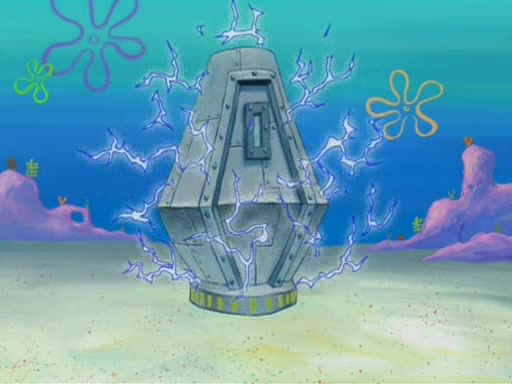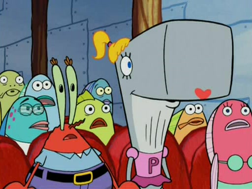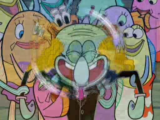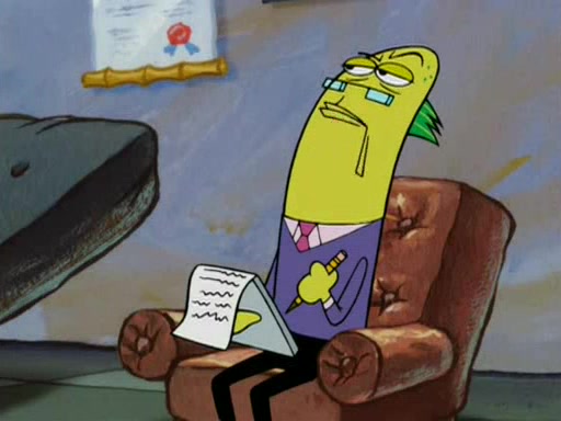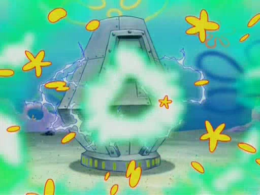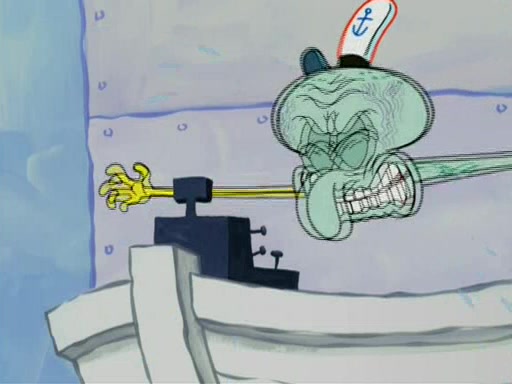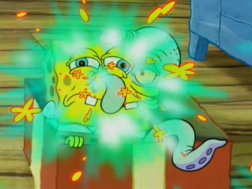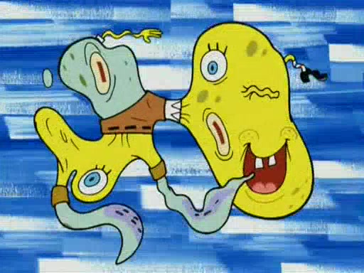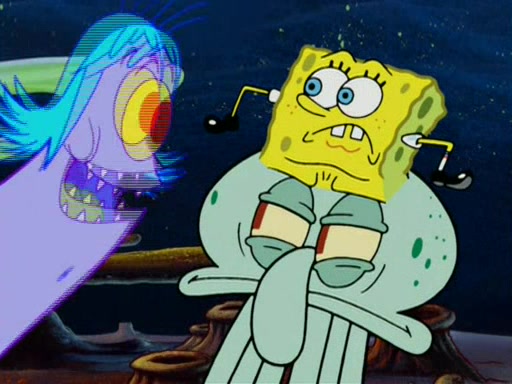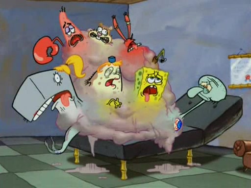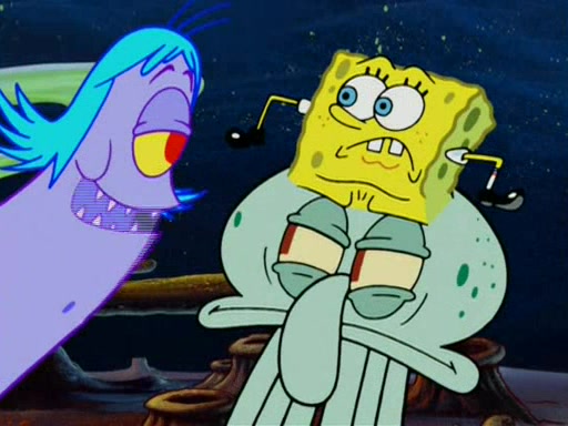 They leave in anger and disgust. Squidward says his one moment of fame is gone. He yanks the machine from Sandy and tries to reverse it. Sandy tries telling him that it's a very sensitive device. Suddenly, the machine breaks and Squidward is morphed. Squidward is seen at a psychiatrist's office. The doctor asks Squidward what the problem is. Squidward says it all started when he was born. It's revealed that Squidward morphed together with SpongeBob, Patrick, Sandy, Pearl, Mr. Krabs, and Mrs. Puff. He now looks even worse than before.