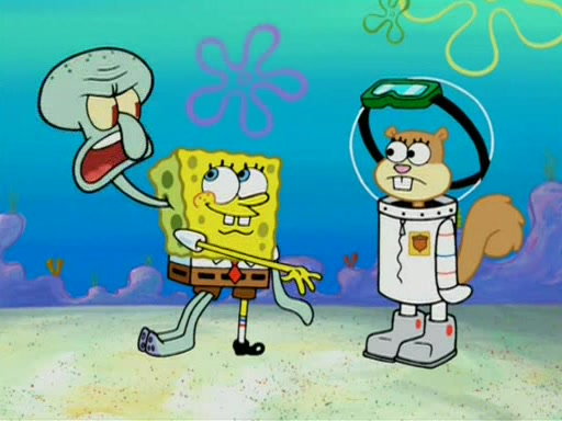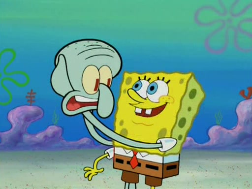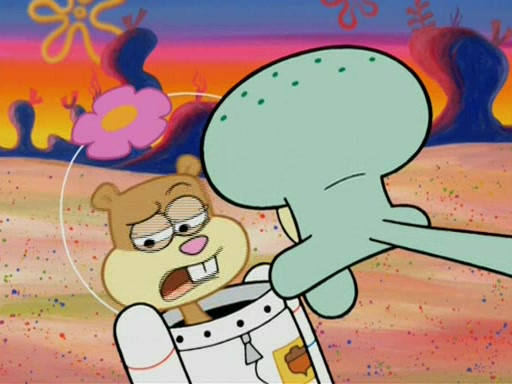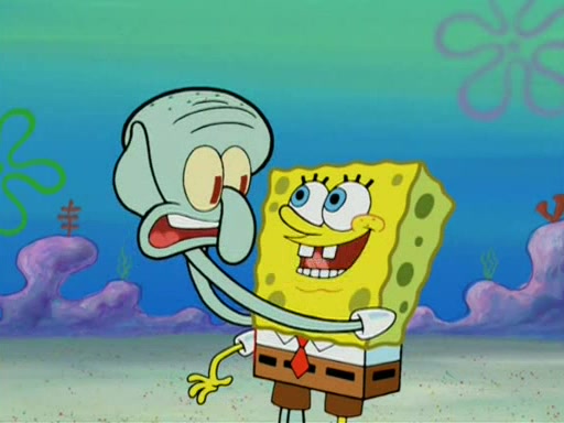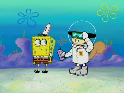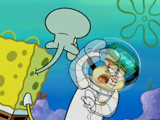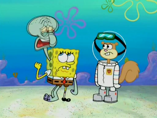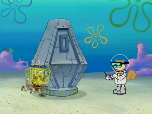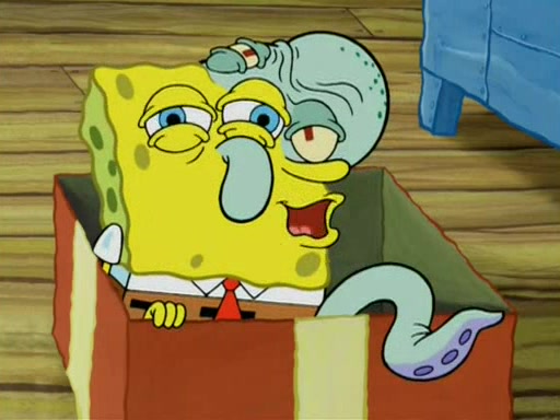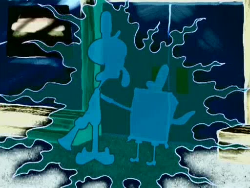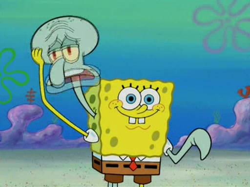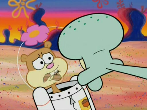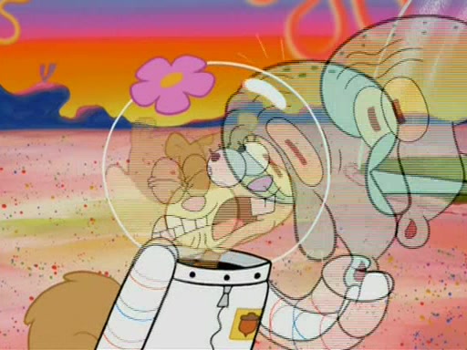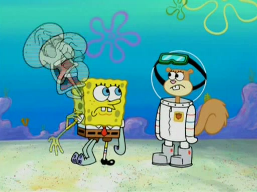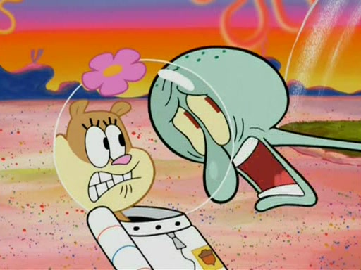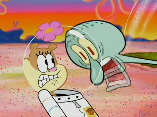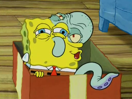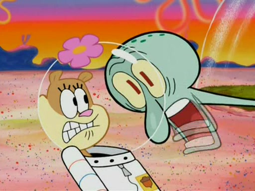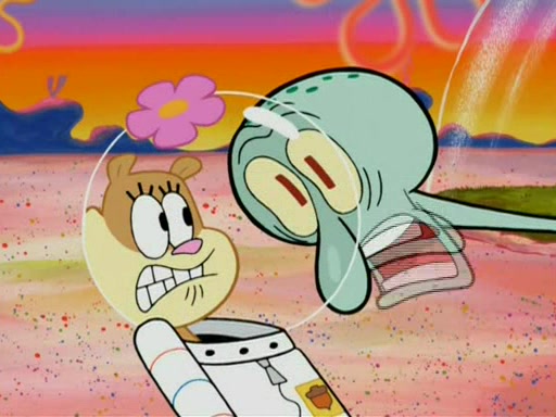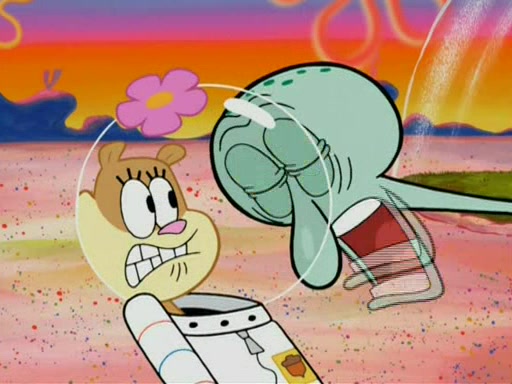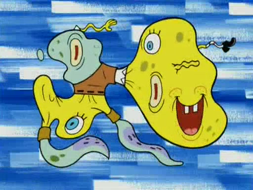 Suddenly, the machine malfunctions, and SpongeBob and Squidward are transported back morphing them together. Sandy sees what has happened and is terrified. When they walk out, SpongeBob has his normal head/body, while Squidward's head is sticking out of the upper left. SpongeBob's left arm and right leg are Squidward's. They are in control of each other's arms, as well. Squidward tries to get out, but he can't. He is scared of the fact he and SpongeBob are stuck together. SpongeBob says they can be together forever now, scaring him more. Squidward asks Sandy to do something. She decides to zap them back in the transporter. She zaps them to a school, a hospital, and Mars, but they are still stuck together. Squidward says she has to get them unstuck. Sandy tells Squidward she was working on a new invention, but it's not ready. He tells her to hurry because he can't stay stuck to SpongeBob.