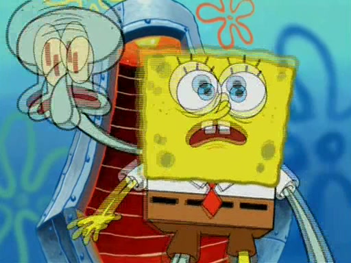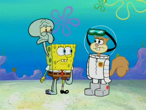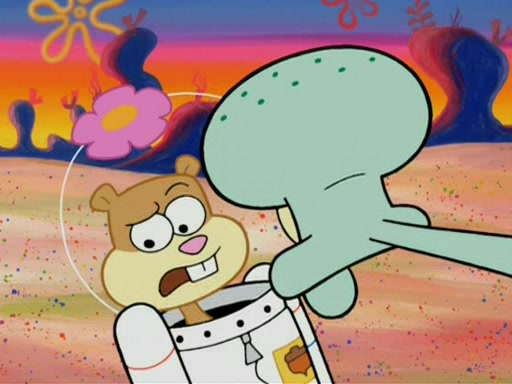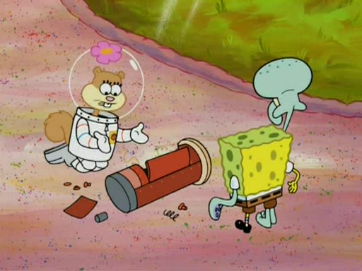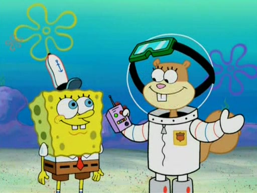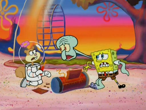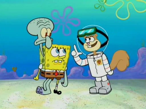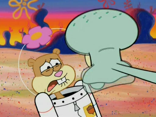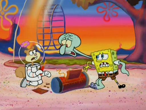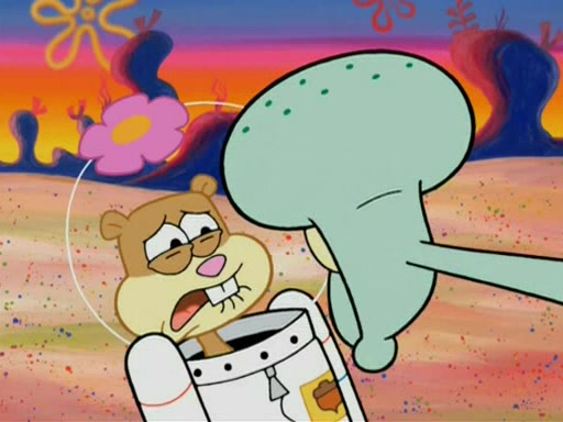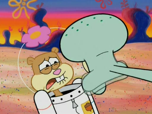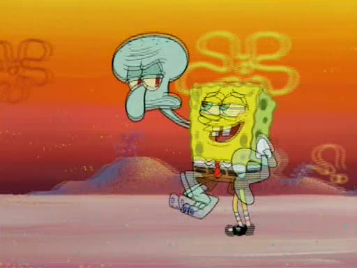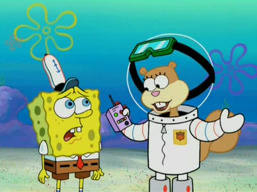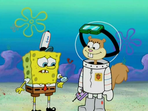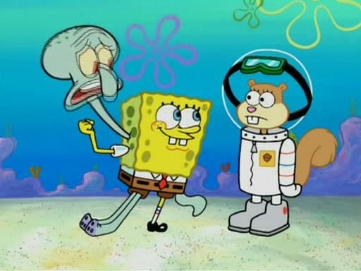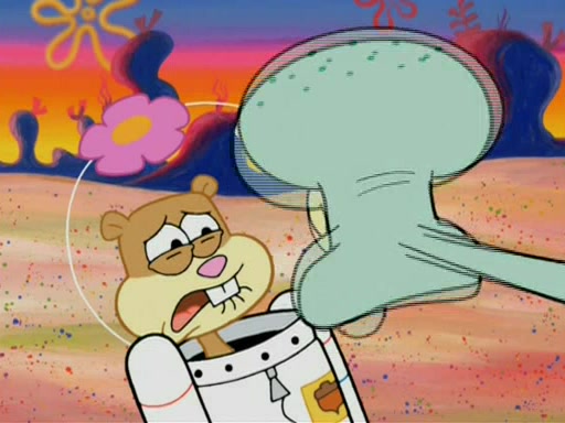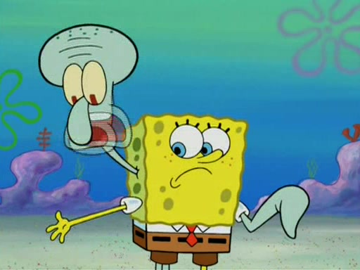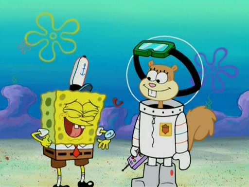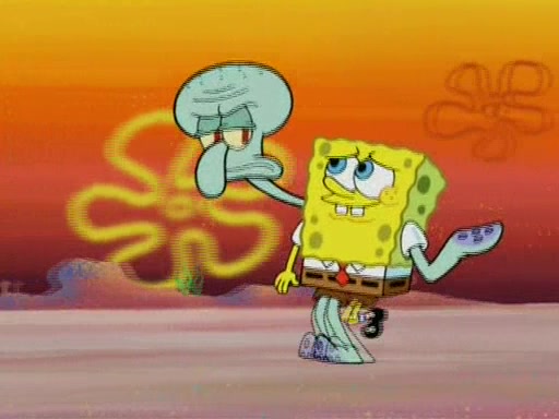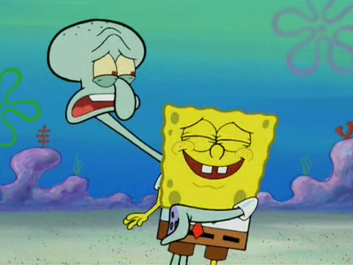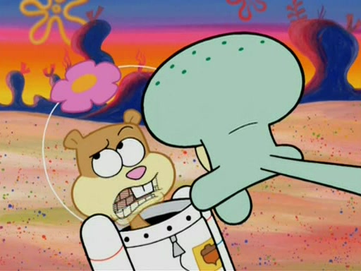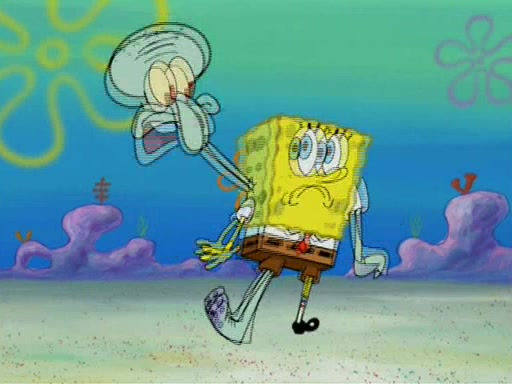 Suddenly, the machine malfunctions, and SpongeBob and Squidward are transported back morphing them together. Sandy sees what has happened and is terrified. When they walk out, SpongeBob has his normal head/body, while Squidward's head is sticking out of the upper left. SpongeBob's left arm and right leg are Squidward's. They are in control of each other's arms, as well. Squidward tries to get out, but he can't. He is scared of the fact he and SpongeBob are stuck together. SpongeBob says they can be together forever now, scaring him more. Squidward asks Sandy to do something. She decides to zap them back in the transporter. She zaps them to a school, a hospital, and Mars, but they are still stuck together. Squidward says she has to get them unstuck. Sandy tells Squidward she was working on a new invention, but it's not ready. He tells her to hurry because he can't stay stuck to SpongeBob.