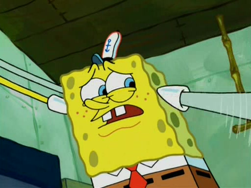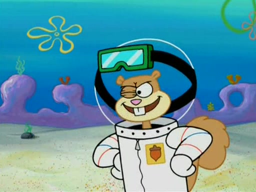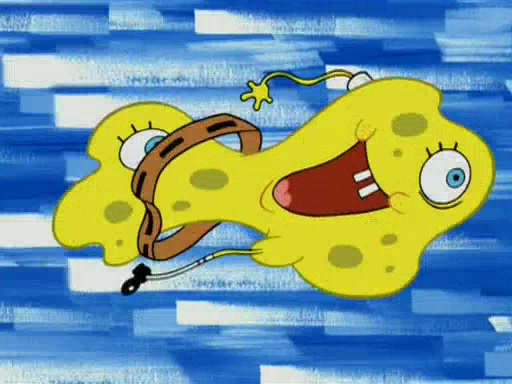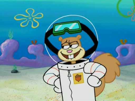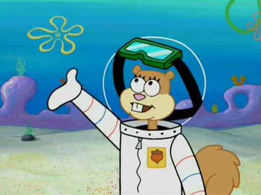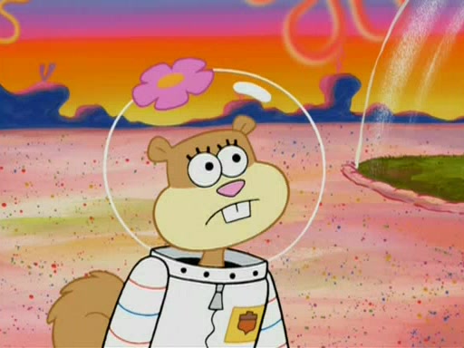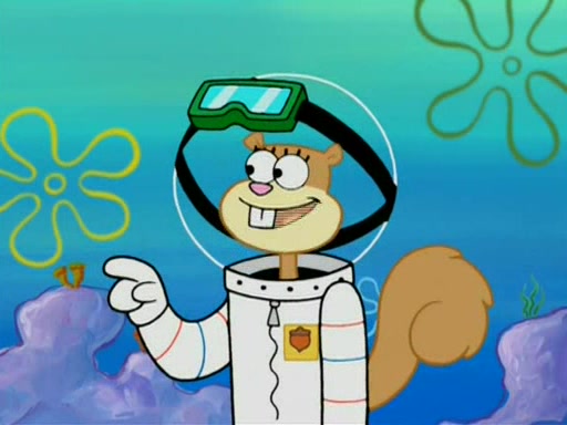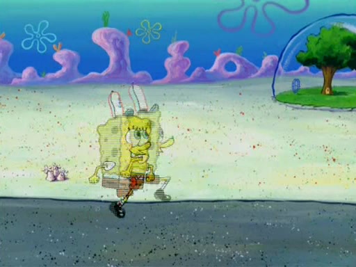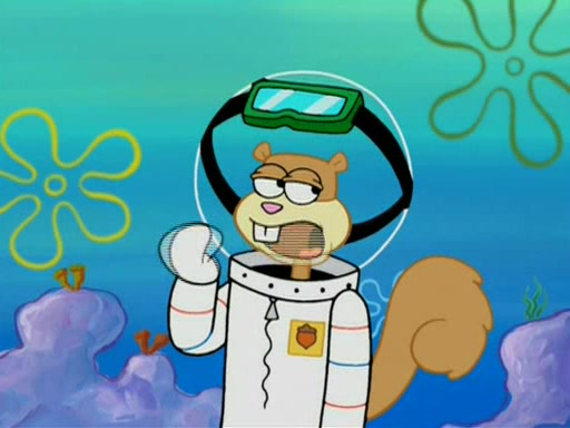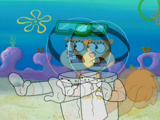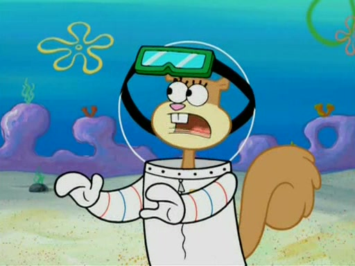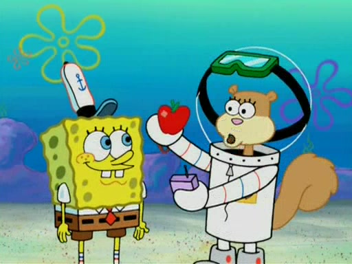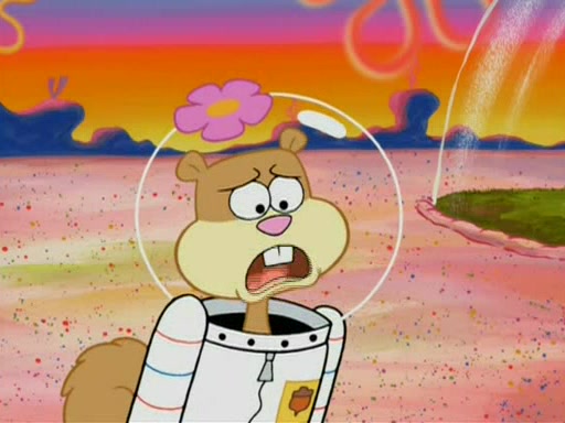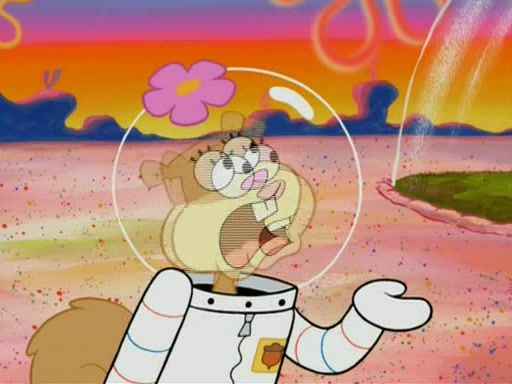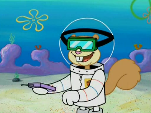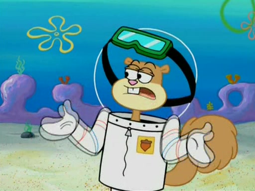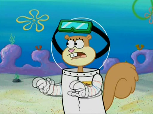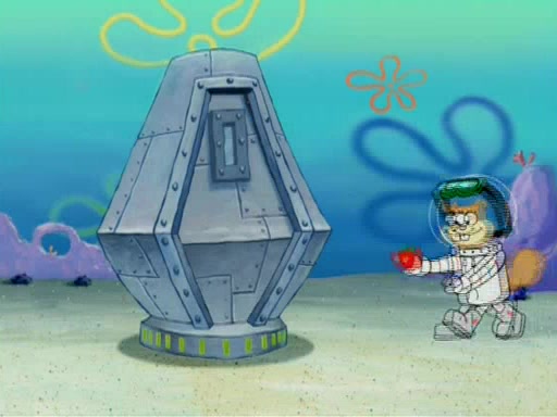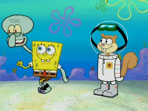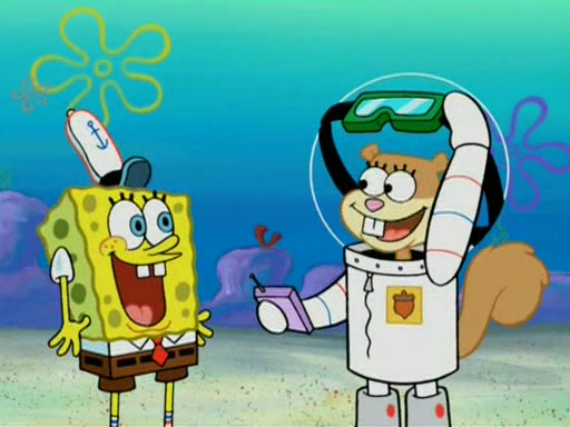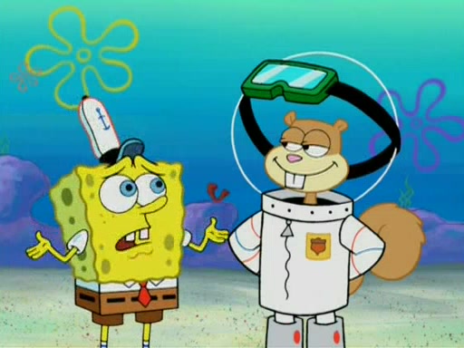 Suddenly, the machine malfunctions, and SpongeBob and Squidward are transported back morphing them together. Sandy sees what has happened and is terrified. When they walk out, SpongeBob has his normal head/body, while Squidward's head is sticking out of the upper left. SpongeBob's left arm and right leg are Squidward's. They are in control of each other's arms, as well. Squidward tries to get out, but he can't. He is scared of the fact he and SpongeBob are stuck together. SpongeBob says they can be together forever now, scaring him more. Squidward asks Sandy to do something. She decides to zap them back in the transporter. She zaps them to a school, a hospital, and Mars, but they are still stuck together. Squidward says she has to get them unstuck. Sandy tells Squidward she was working on a new invention, but it's not ready. He tells her to hurry because he can't stay stuck to SpongeBob.