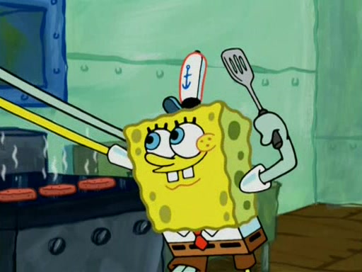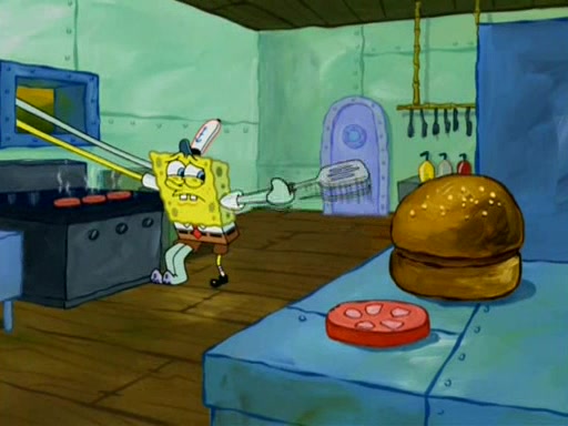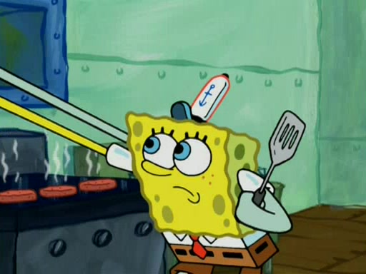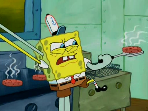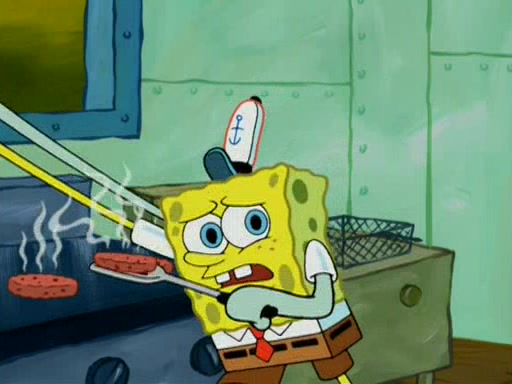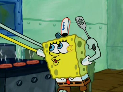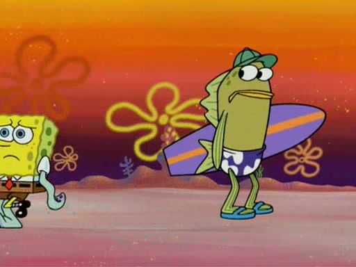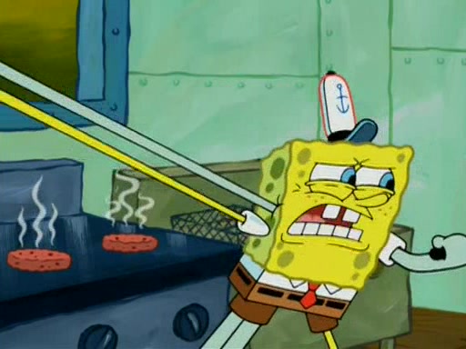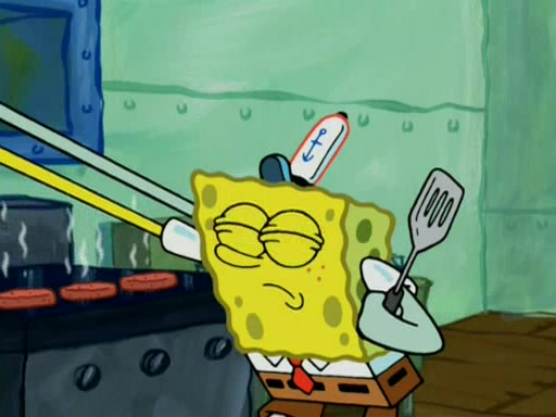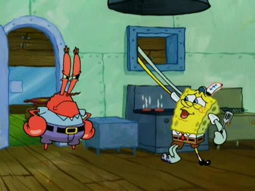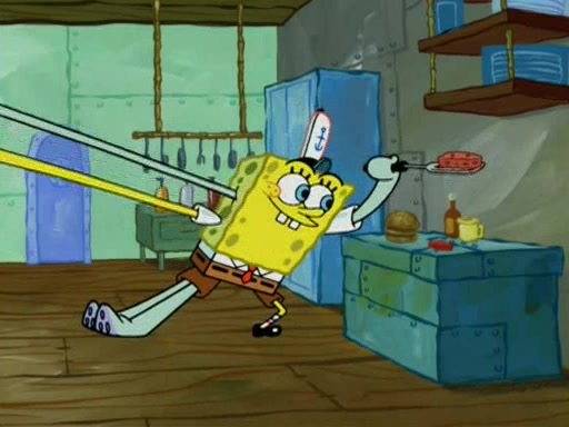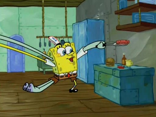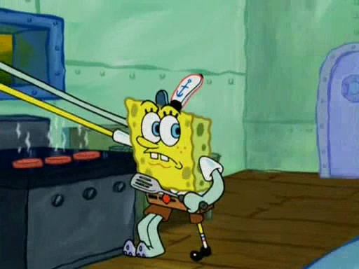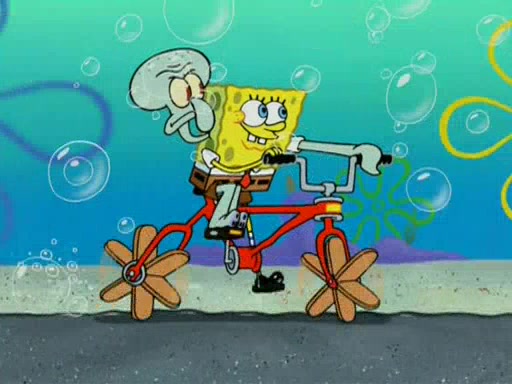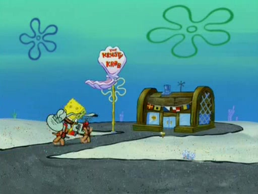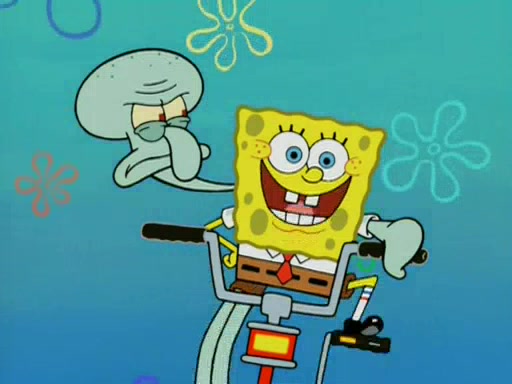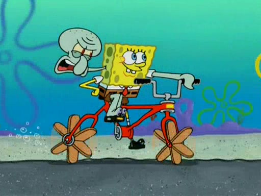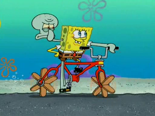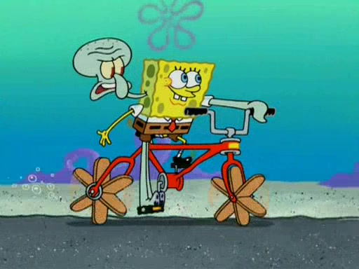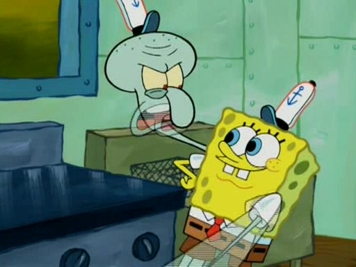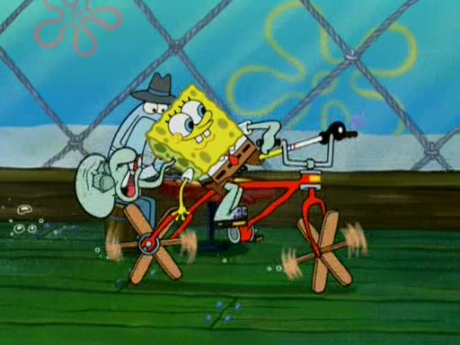 She tells him to stay calm, and she'll continue working on it. Squidward and SpongeBob are riding to work on a bike. SpongeBob says he'll drive, but Squidward keeps getting hit by the wheel. They crash into the kitchen and Mr. Krabs asks what happened. They stand up revealing their morphed body. Mr. Krabs just tells them to get to work. They try working, but they can't because they're stuck together. Mr. Krabs kicks them out and tells them to not come back, until they fix their problem. SpongeBob says they still have each other, and Squidward angrily says that's how they ended up like this in the first place. Squidward practices playing while SpongeBob is sad. A surfer guy passes and says "Rock on, Freaky Bro." They run over to Sandy's and ask her if she's found a way to fix them. Sandy says she has invented the Molecular Separator Ray. Squidward is ready to be free, but Sandy says she's not finished. She says she'll probably have it ready the day after tomorrow. Squidward frantically tells her he has a performance tomorrow. So she tells him she will have it ready before he goes on. SpongeBob and Squidward try to go to their own houses, but they can't due to being stuck.