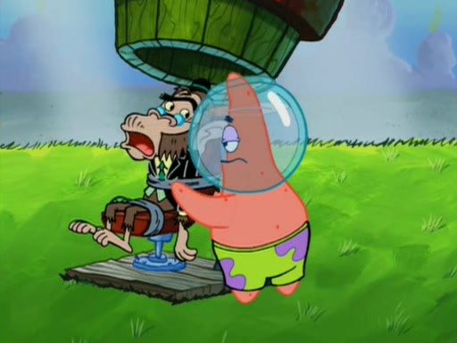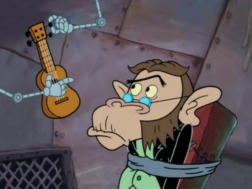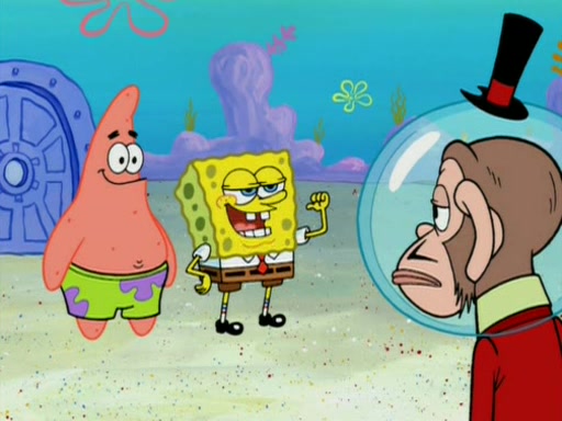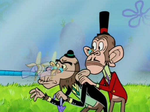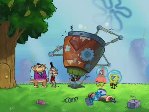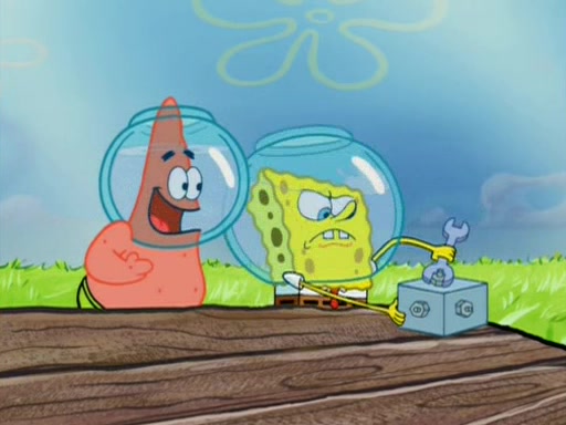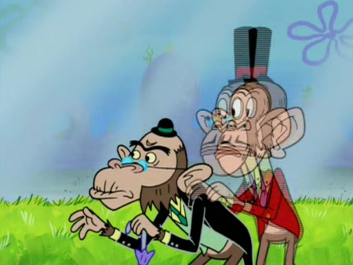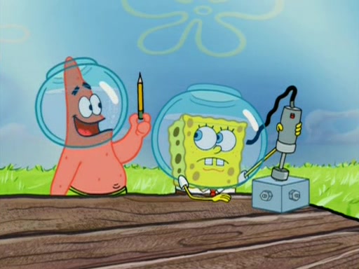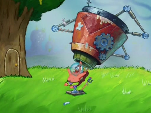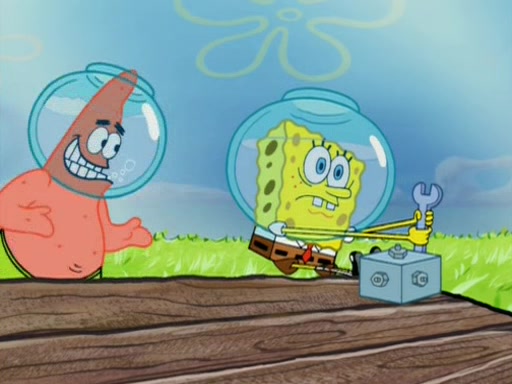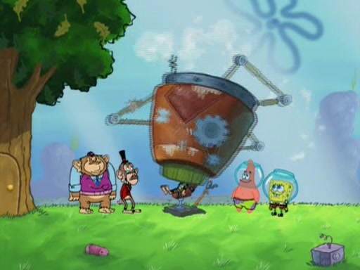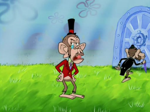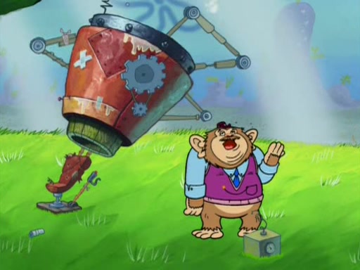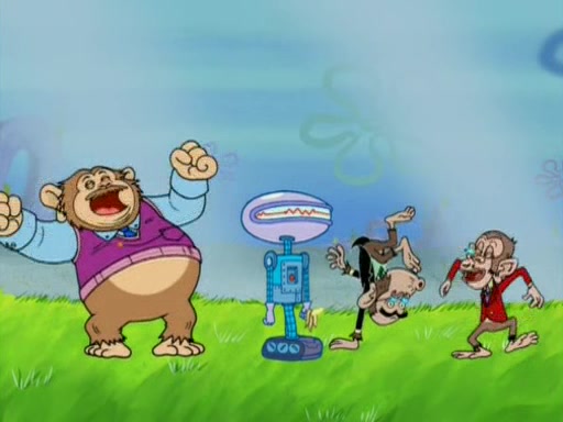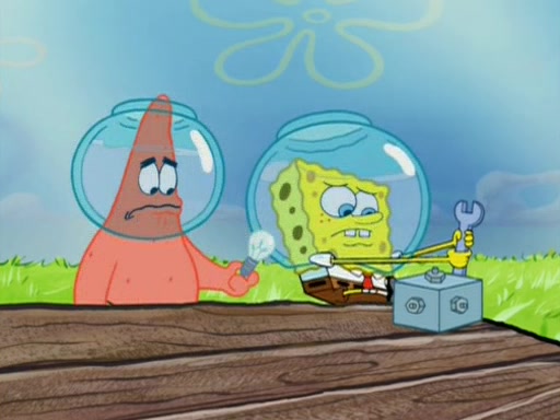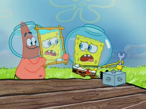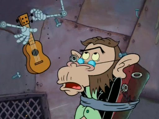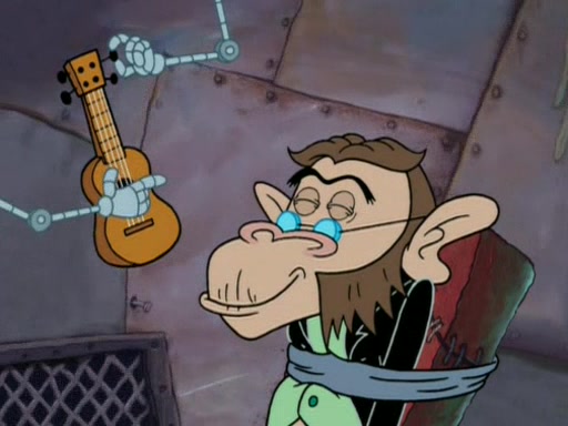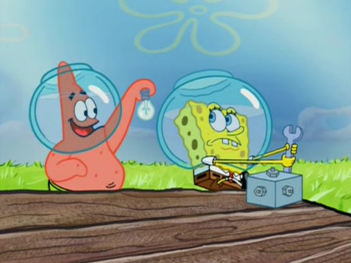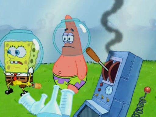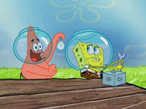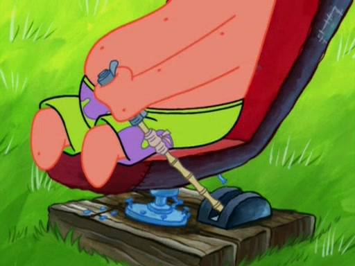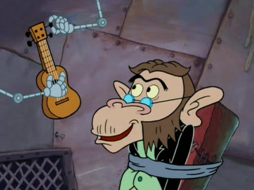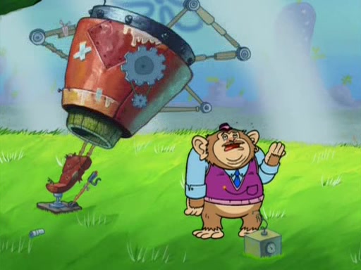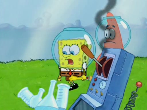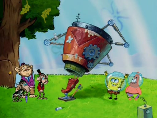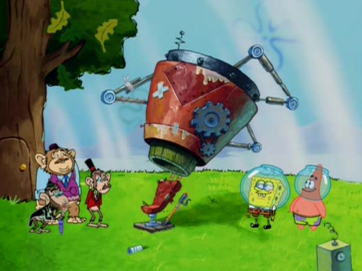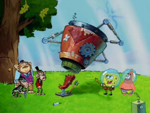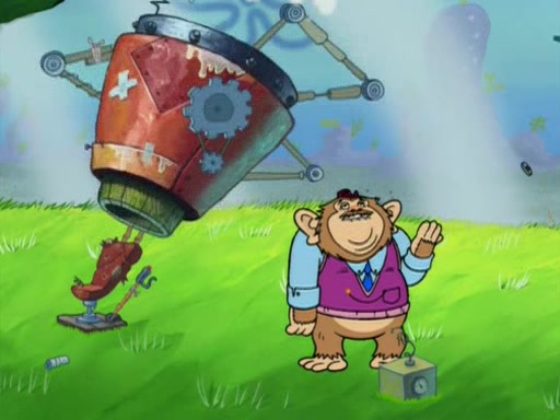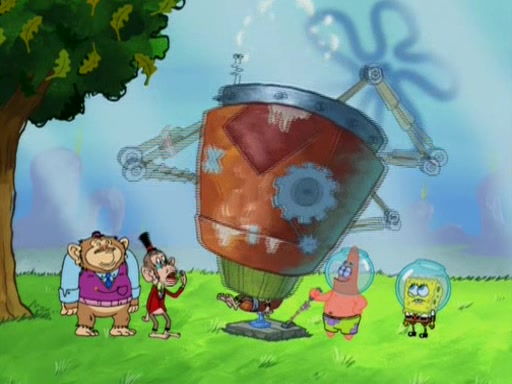 At first, Patrick has ideas of things that have already been invented, such as a pencil and a mirror (which ironically is actually a parallel universe). After hours of hard work, SpongeBob and Patrick invent a back scratching, hair-combing, nose-picking ukulele-tuner. When the Chimps arrive, Lord Reginald is the first to test it (though never wanted to, as Patrick forced him). Shockingly, the invention works, but when tuning the ukulele, the machine malfunctions, hits Reginald with the ukulele, slaps him, then starts attacking him with all sorts of weapons.
