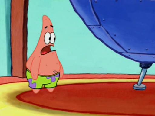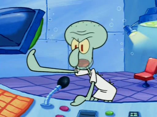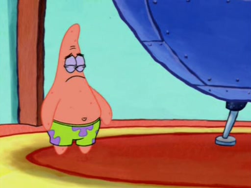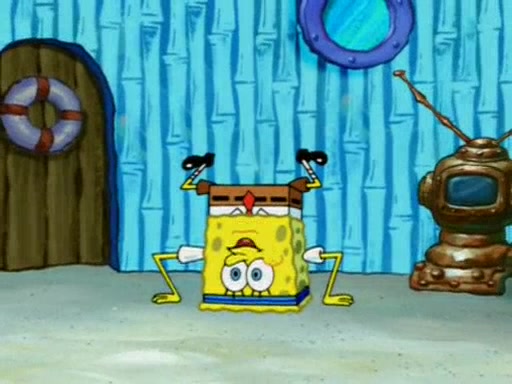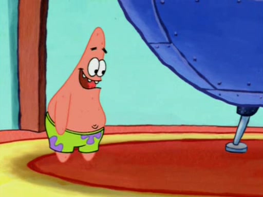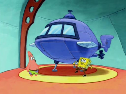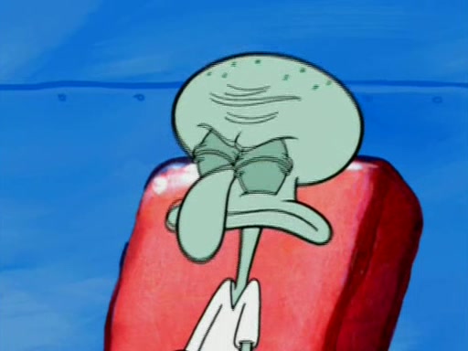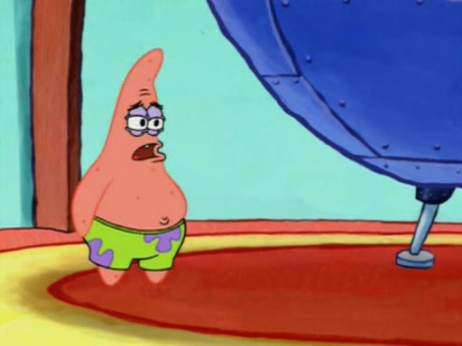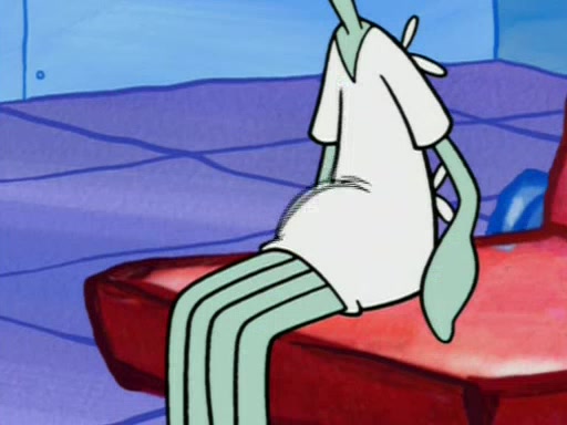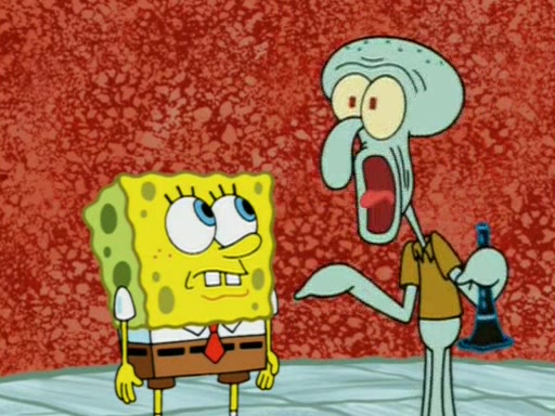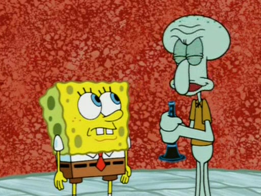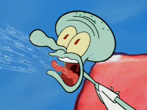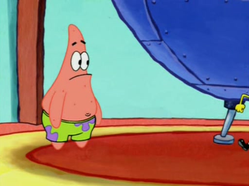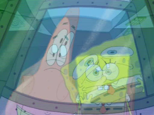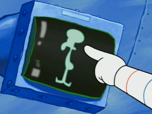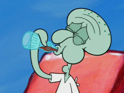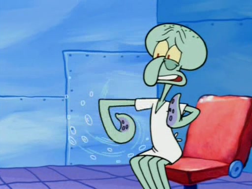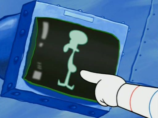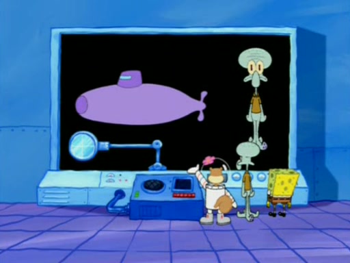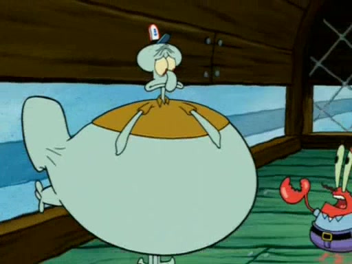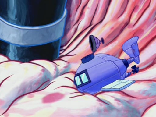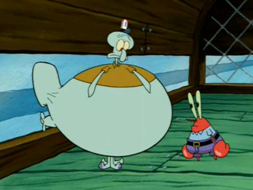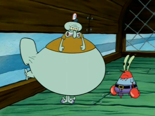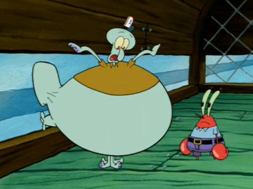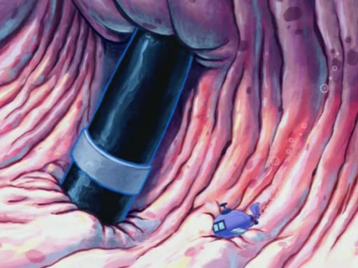 Squidward is next seen at the Krusty Krab looking bloated and his stomach in the shape of a submarine. A flush sound is then heard, followed by Patrick, still stuck in the submarine in Squidward's body, claiming the toilet is clogged (again, apparently) Squidward groans.
