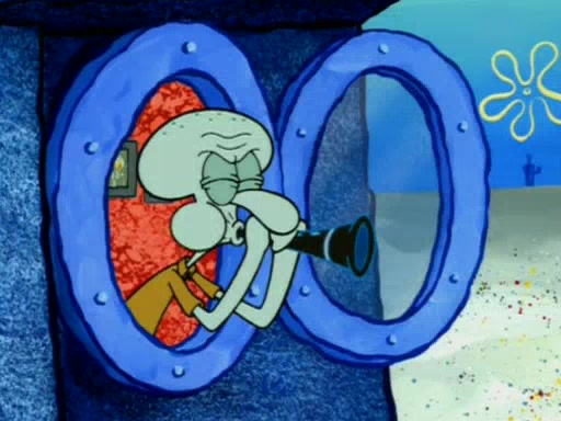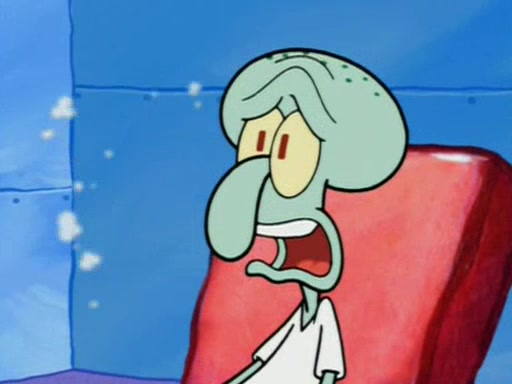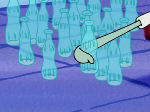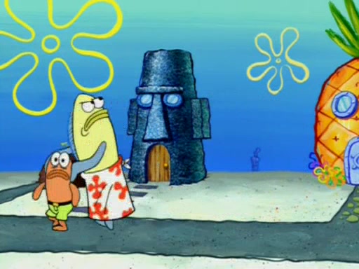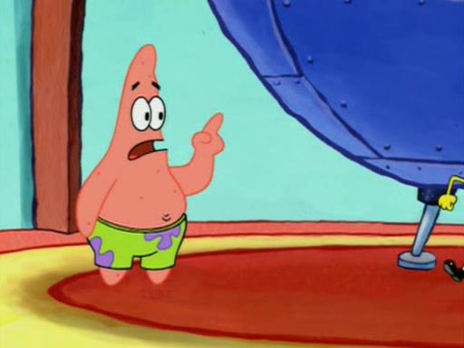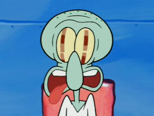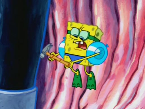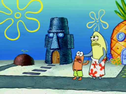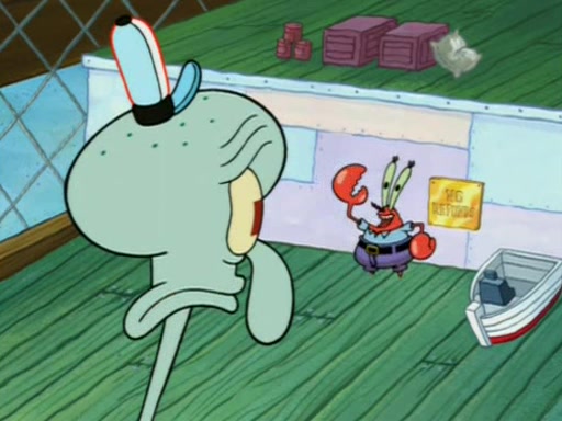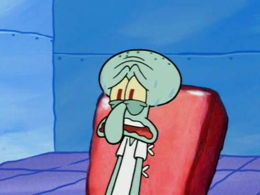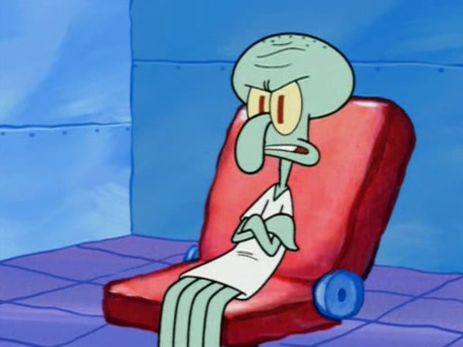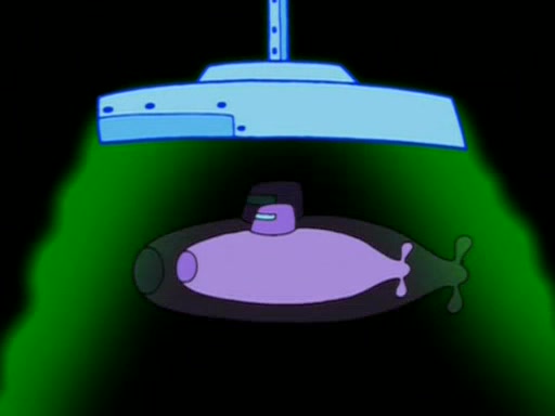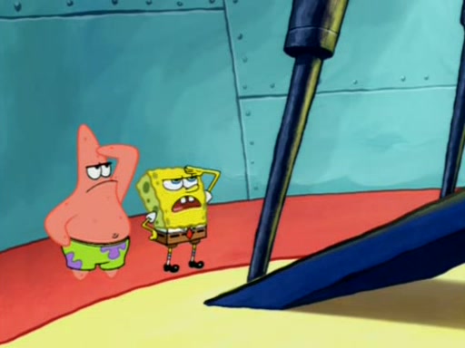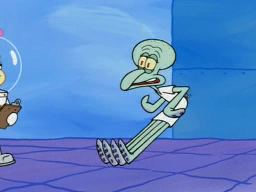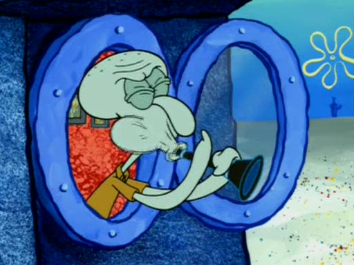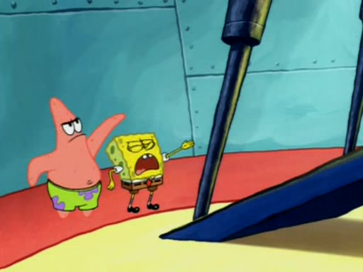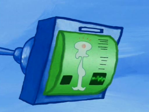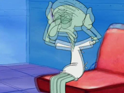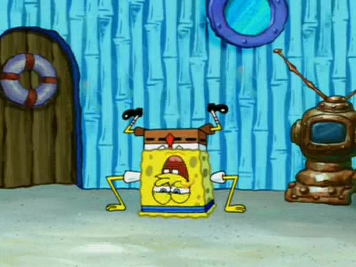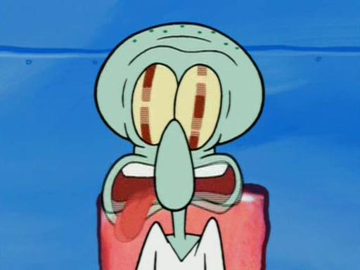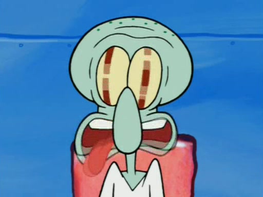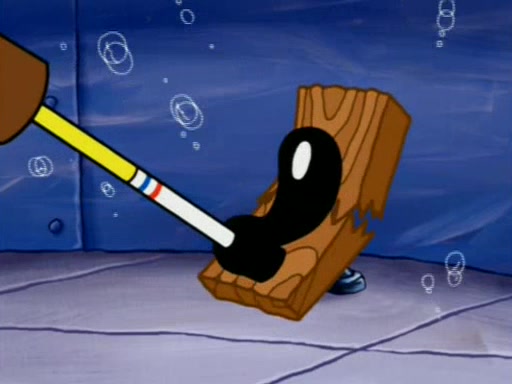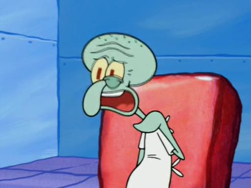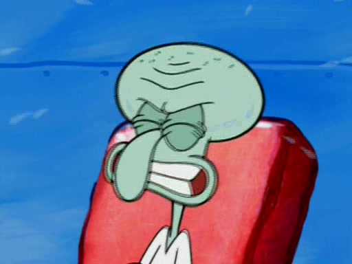 Squidward is next seen at the Krusty Krab looking bloated and his stomach in the shape of a submarine. A flush sound is then heard, followed by Patrick, still stuck in the submarine in Squidward's body, claiming the toilet is clogged (again, apparently) Squidward groans.