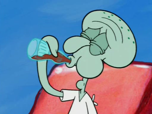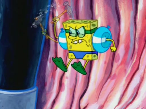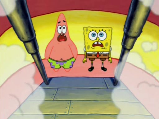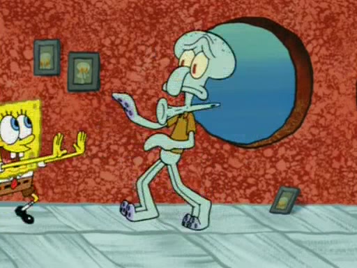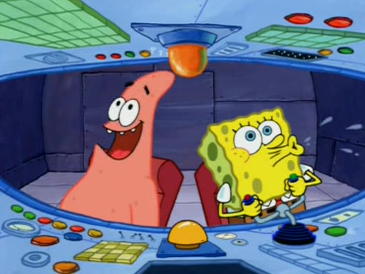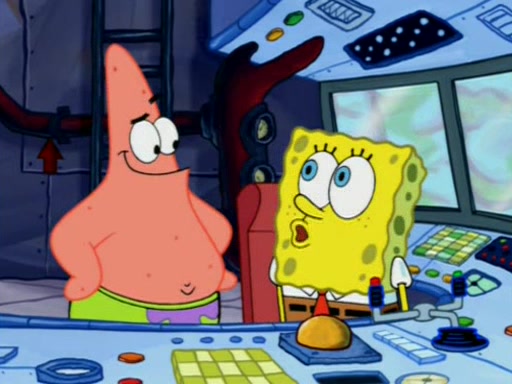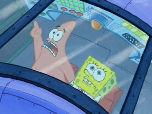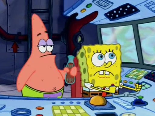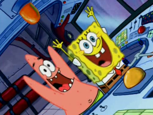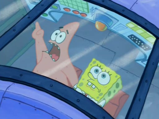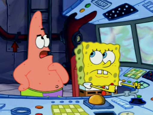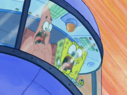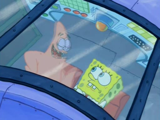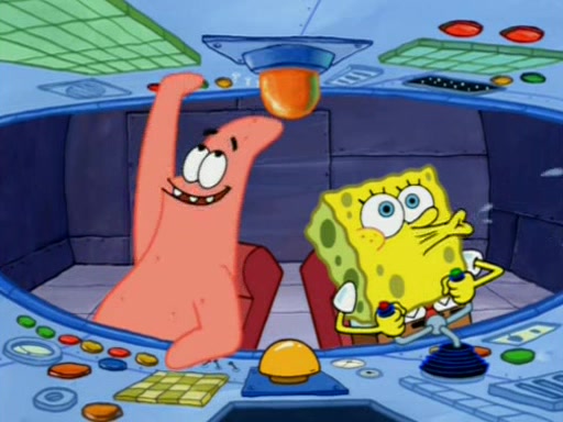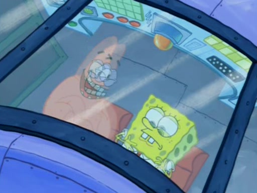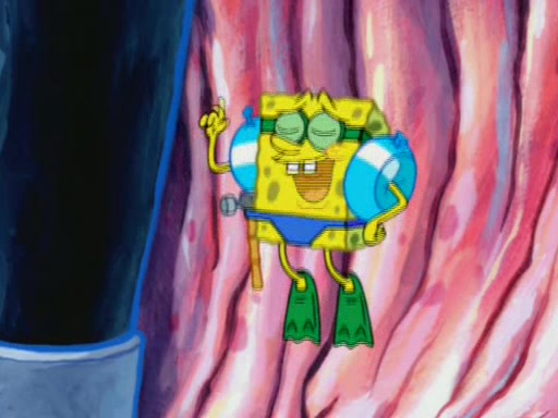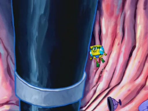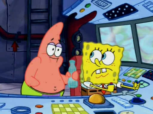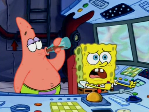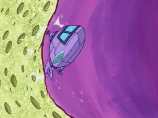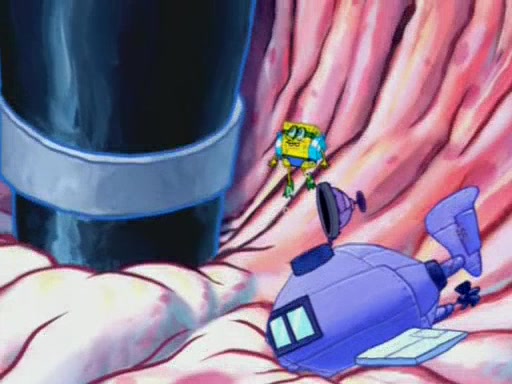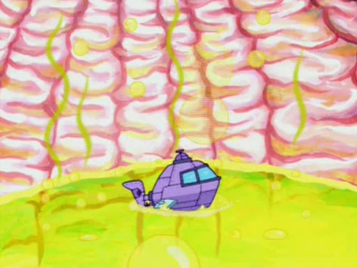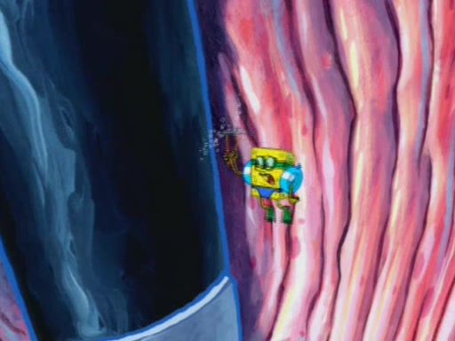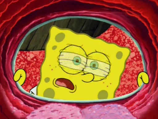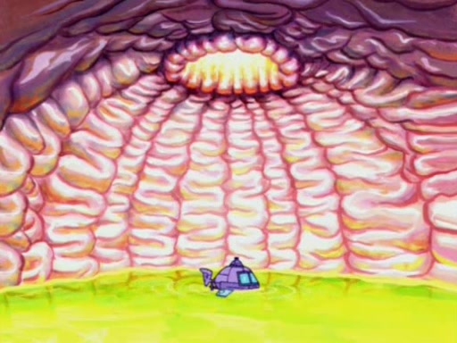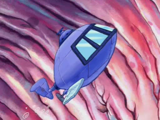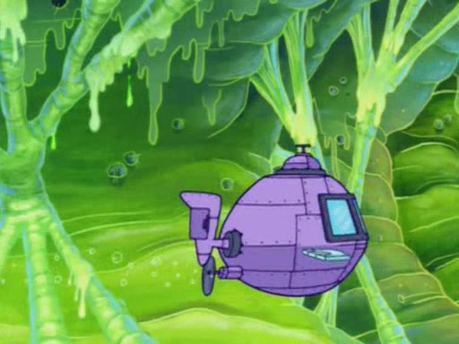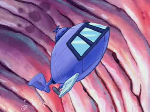 For a moment, SpongeBob and Patrick actually fight each other for control of the vehicle and land in Squidward's stomach, where the gastric acid starts to eat the submarine away. Patrick thinks of an idea: If Squidward can drink soda, then bubbles (gas) would surround them and it would refuel the submarine. Squidward drinks soda and the suddenly burps creating bubbles. They travel through the throat where SpongeBob removes the clarinet reed by doing what he was "born to do," dance. The reed is removed and the gang celebrates, but is cut short by the sound of the now angered Squidward. He demands them to leave his body and yells at them to "GO!" However, Patrick mistakes it for "grow" and hits the grow button while still being in Squidward's body.