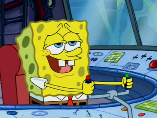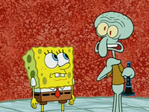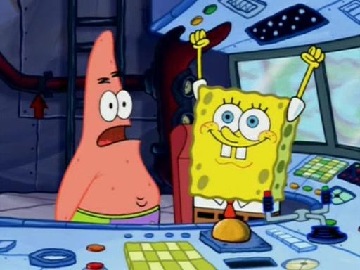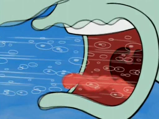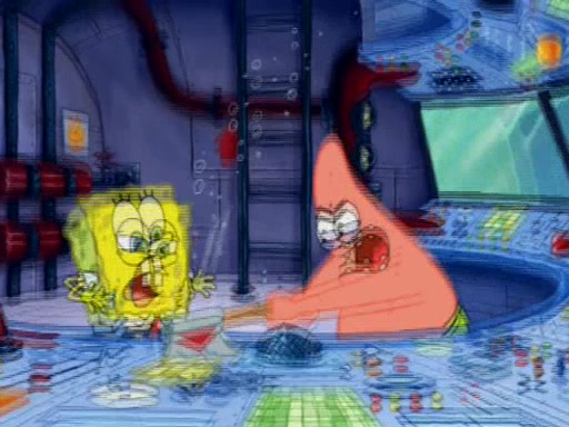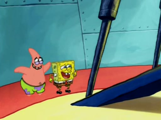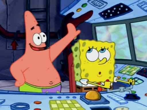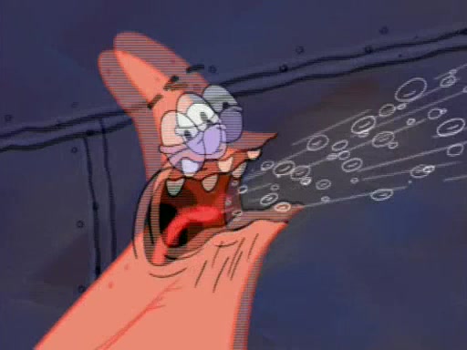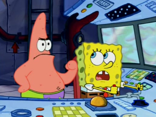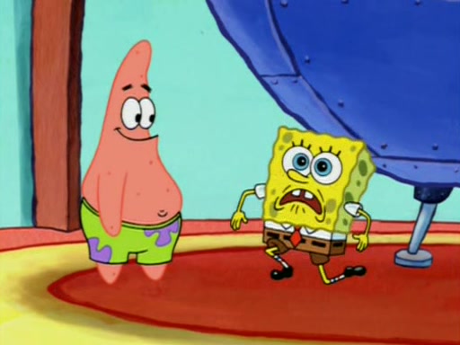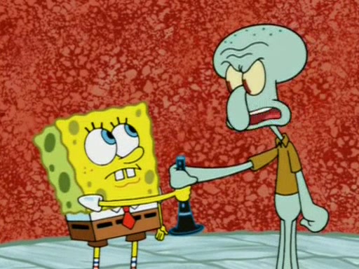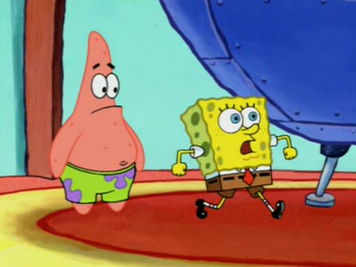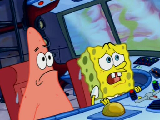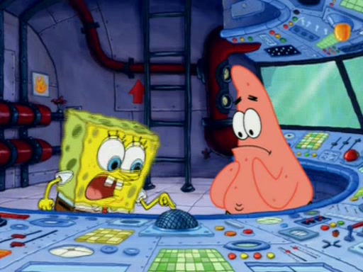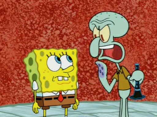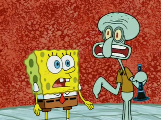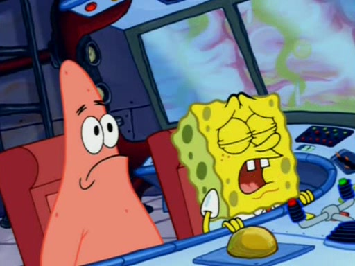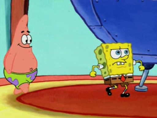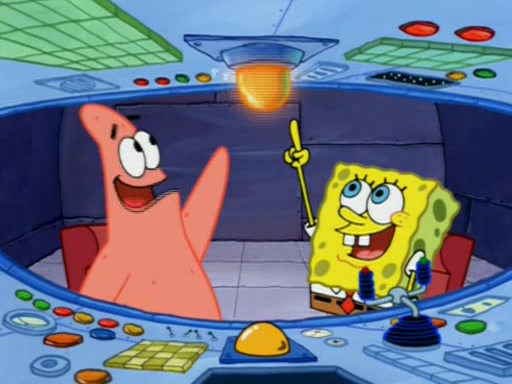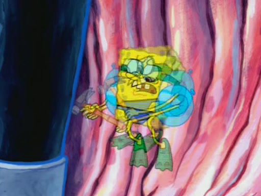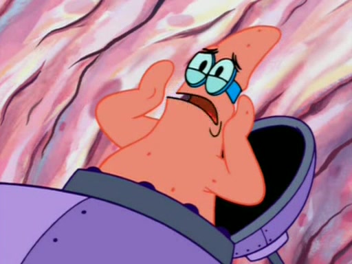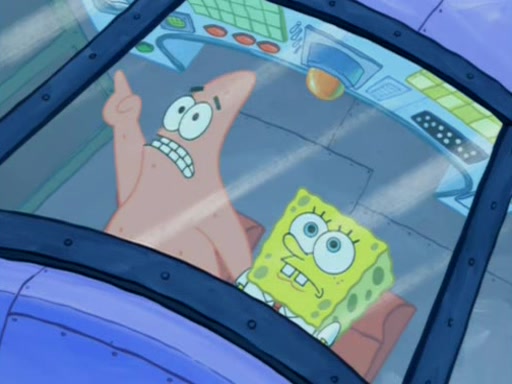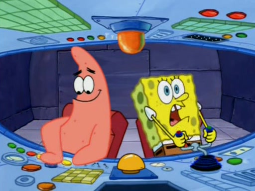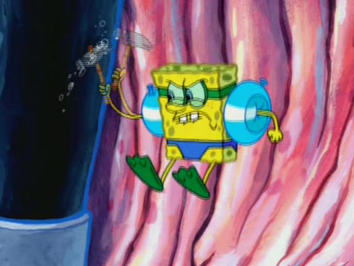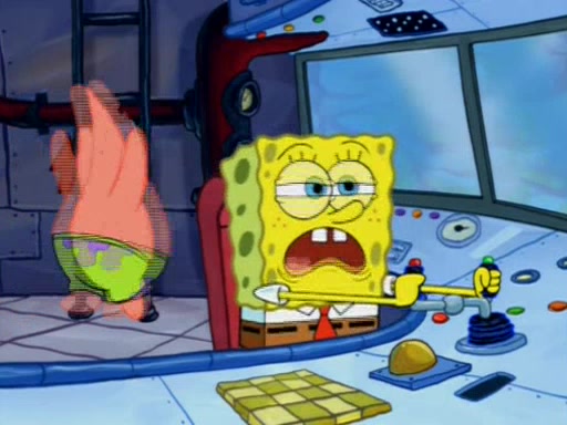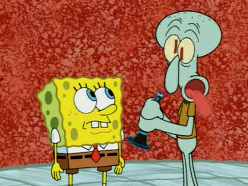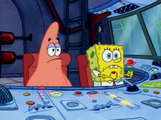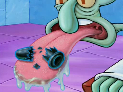 For a moment, SpongeBob and Patrick actually fight each other for control of the vehicle and land in Squidward's stomach, where the gastric acid starts to eat the submarine away. Patrick thinks of an idea: If Squidward can drink soda, then bubbles (gas) would surround them and it would refuel the submarine. Squidward drinks soda and the suddenly burps creating bubbles. They travel through the throat where SpongeBob removes the clarinet reed by doing what he was "born to do," dance. The reed is removed and the gang celebrates, but is cut short by the sound of the now angered Squidward. He demands them to leave his body and yells at them to "GO!" However, Patrick mistakes it for "grow" and hits the grow button while still being in Squidward's body.