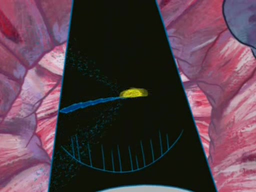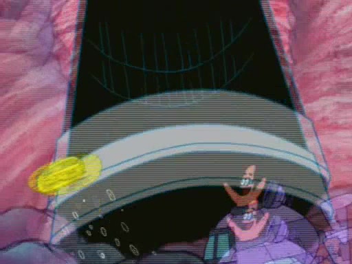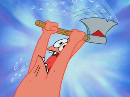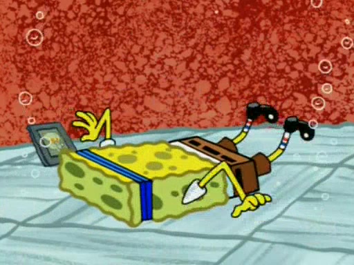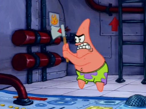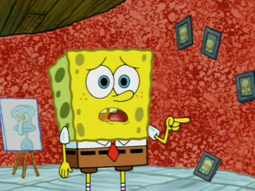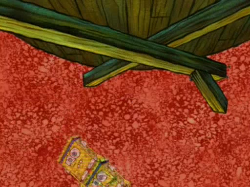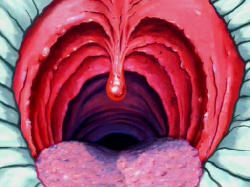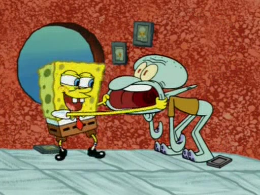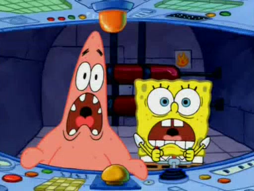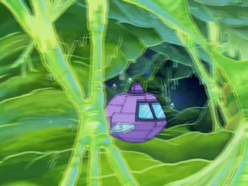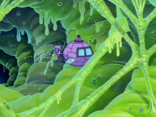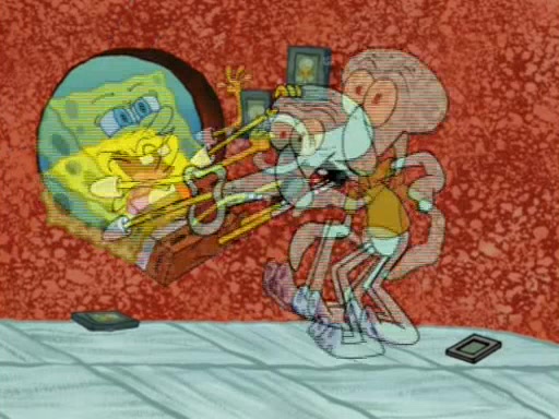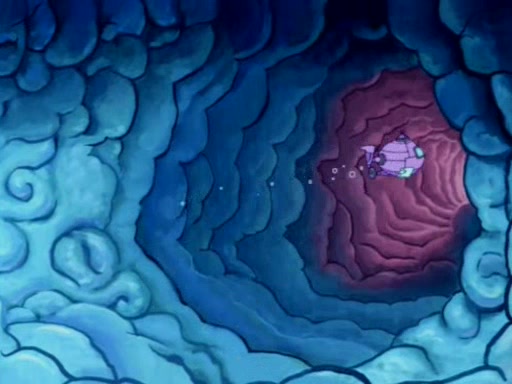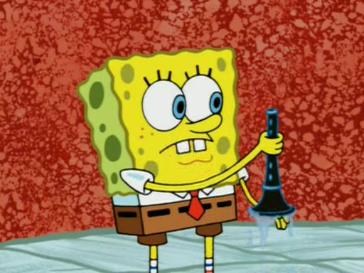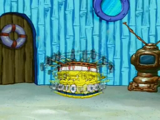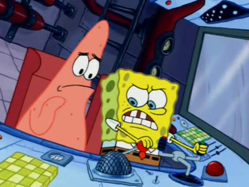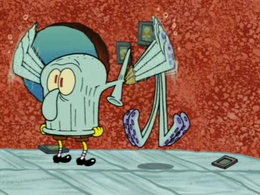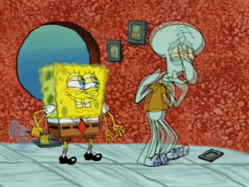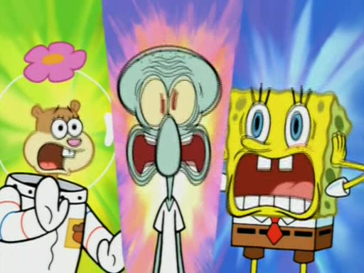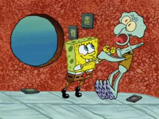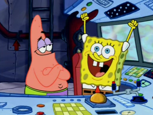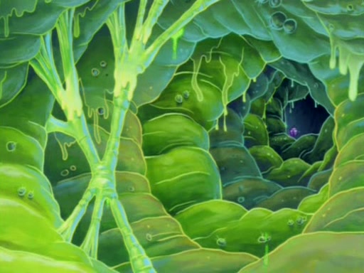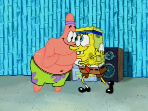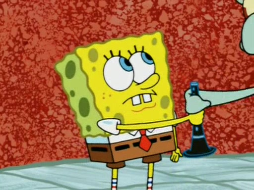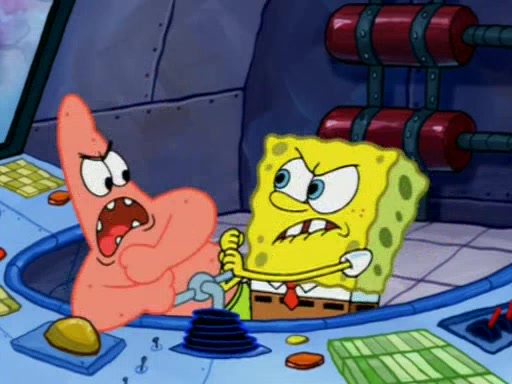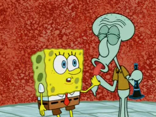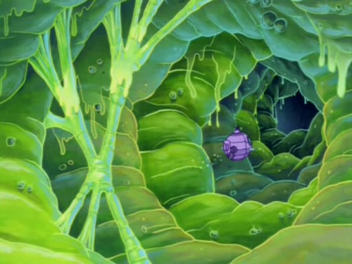 For a moment, SpongeBob and Patrick actually fight each other for control of the vehicle and land in Squidward's stomach, where the gastric acid starts to eat the submarine away. Patrick thinks of an idea: If Squidward can drink soda, then bubbles (gas) would surround them and it would refuel the submarine. Squidward drinks soda and the suddenly burps creating bubbles. They travel through the throat where SpongeBob removes the clarinet reed by doing what he was "born to do," dance. The reed is removed and the gang celebrates, but is cut short by the sound of the now angered Squidward. He demands them to leave his body and yells at them to "GO!" However, Patrick mistakes it for "grow" and hits the grow button while still being in Squidward's body.
